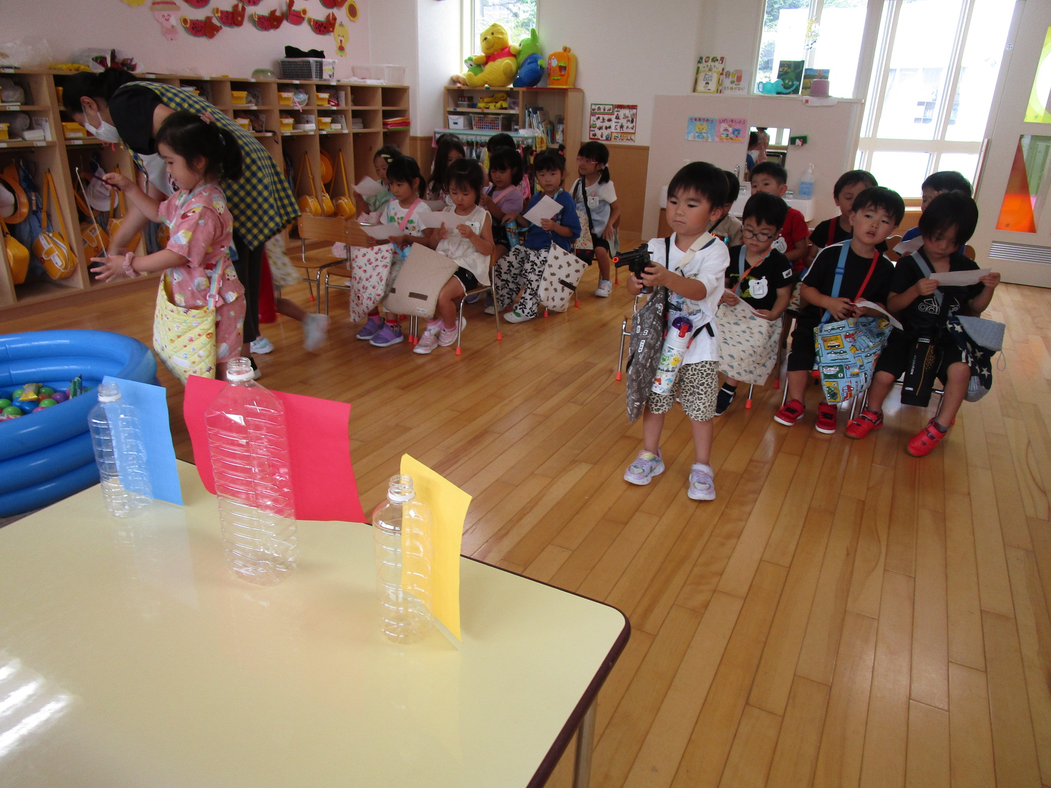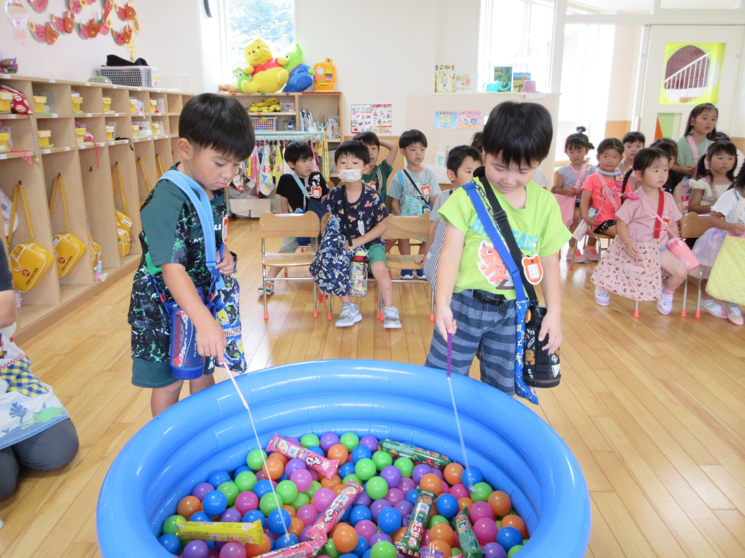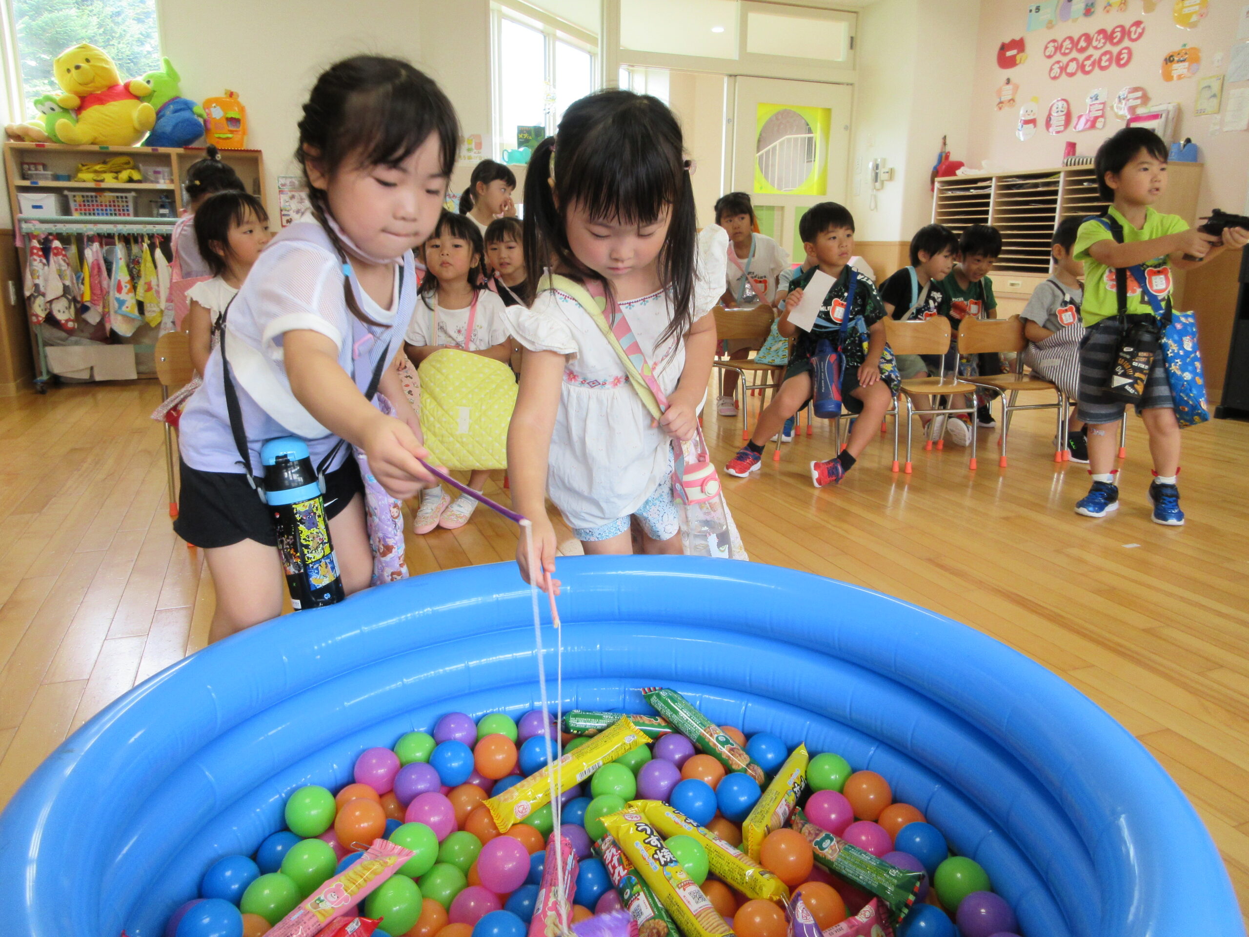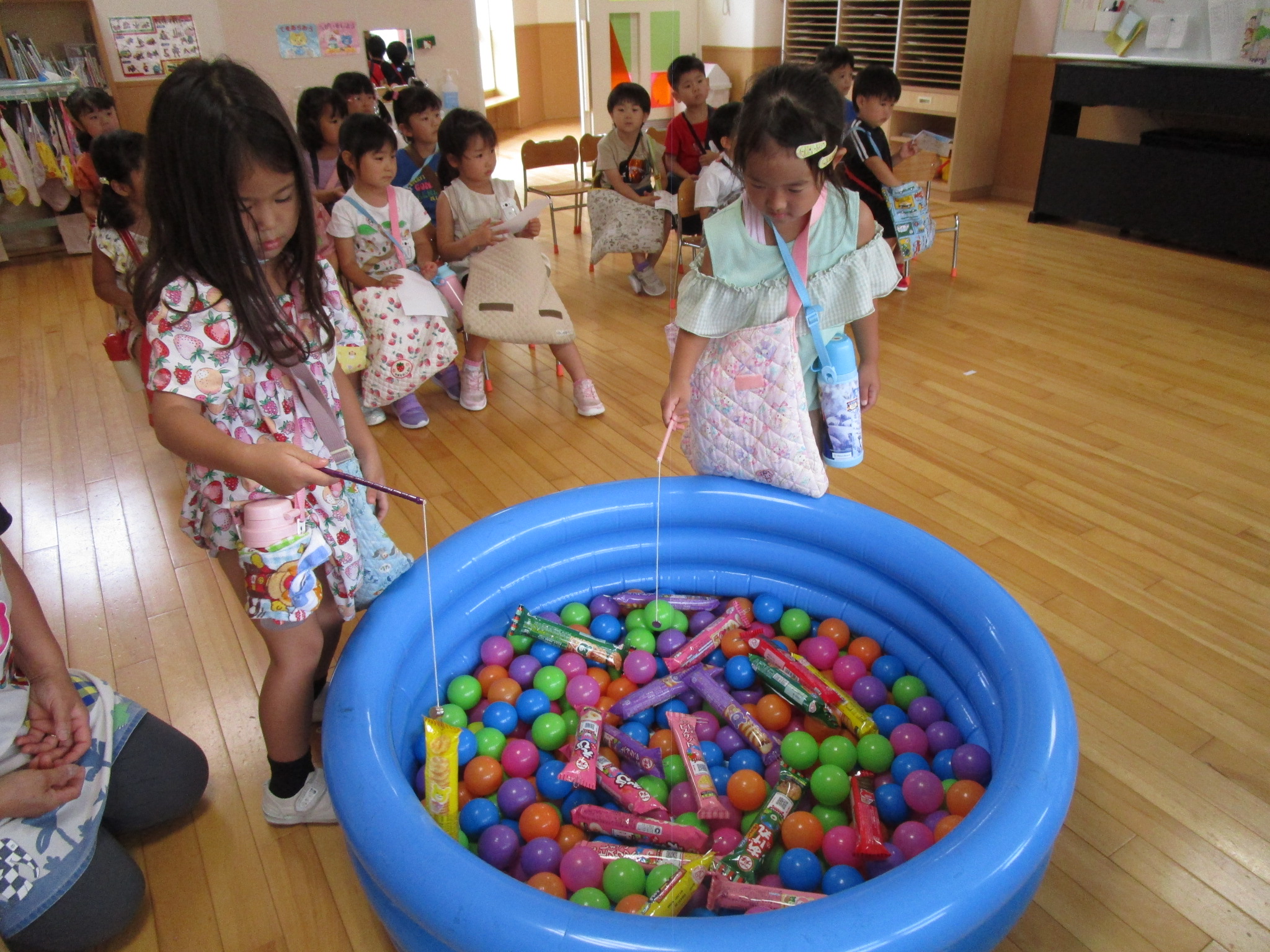 (59)令和5年度「年中学年 縁日ごっこ」 2023年9月6日 園内ブログ 昨日に引き続き本日9月6日(水)は年中学年の縁日ごっこを実施しました。スタンプラリーで各クラスの催し物へ行き、子ども達はウキウキしながら様々な思いで参加していました。心浮かれる様子が見受けられ景品を手にする子ども達は大満足でした。ルールを守り順番を守りながら楽しんで参加していましたね! 今日の病気欠席者は、発熱4名、鼻水1名、腹痛・下痢1名、体調不良1名、大事をとって6名です。 【ばら組】 【ゆり組】 【すみれ組】 🍙今日の給食🍙