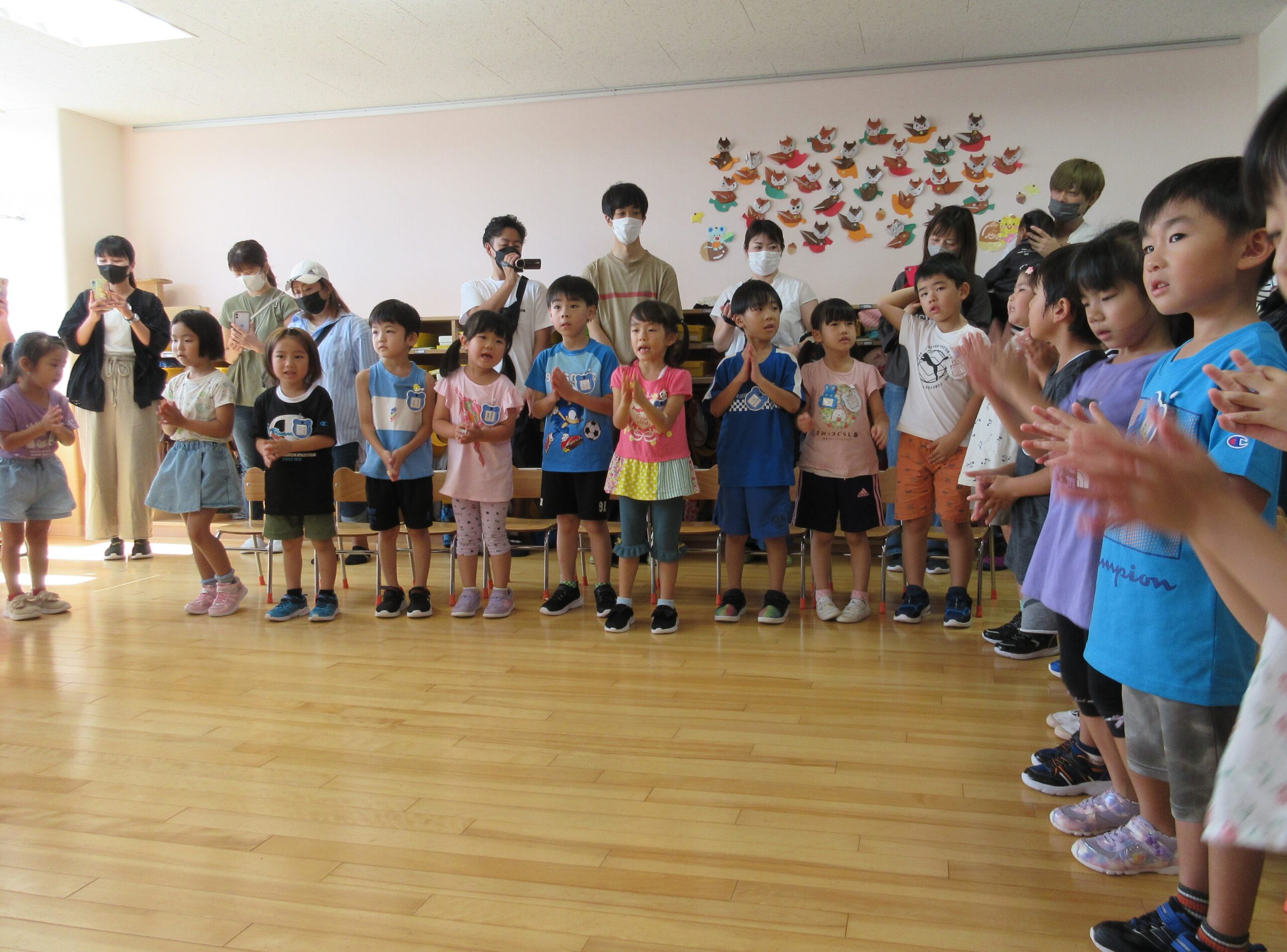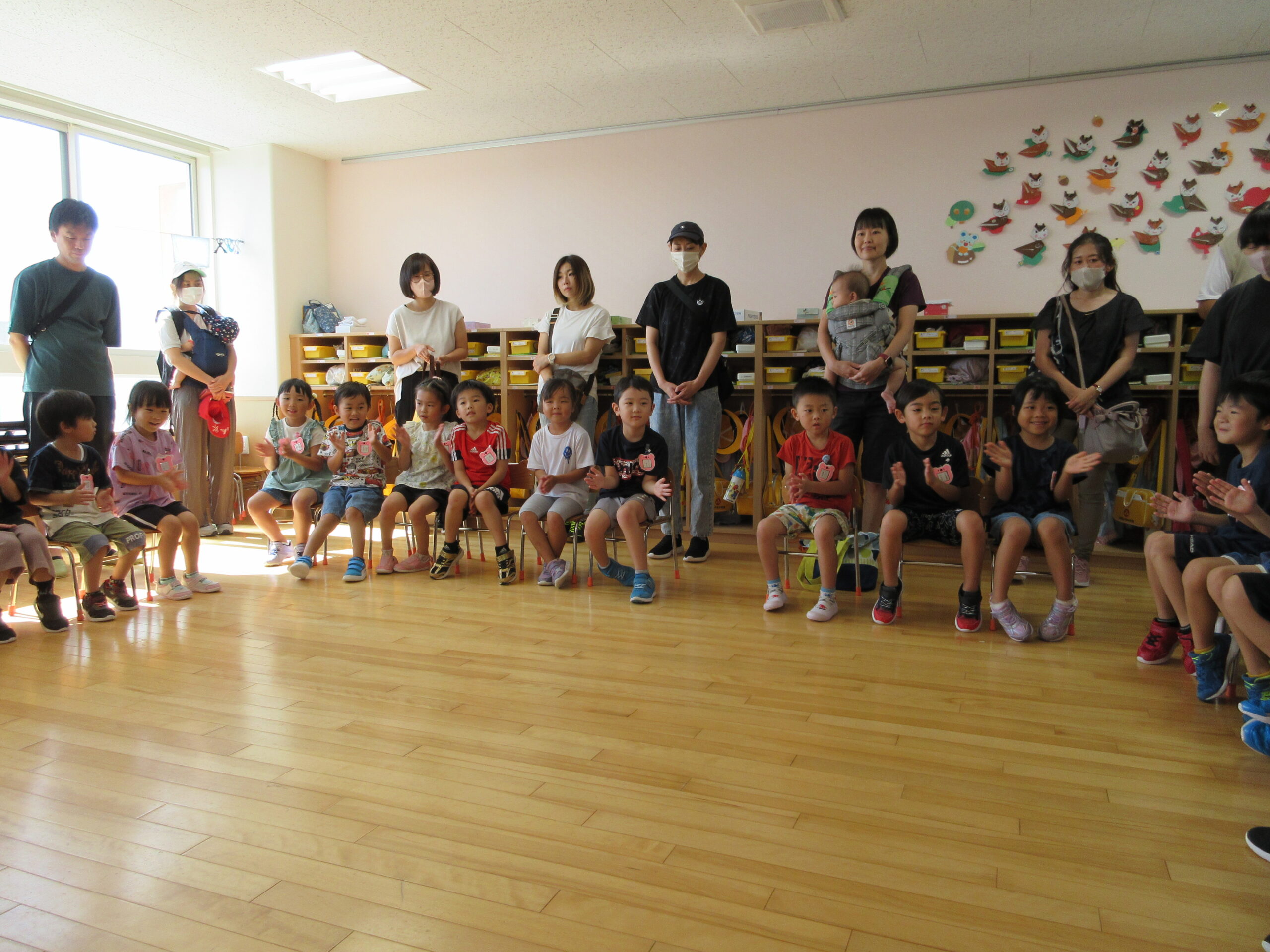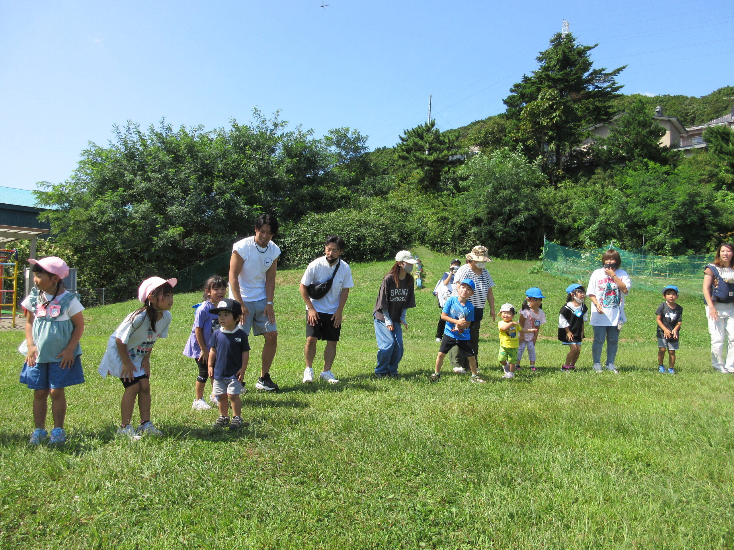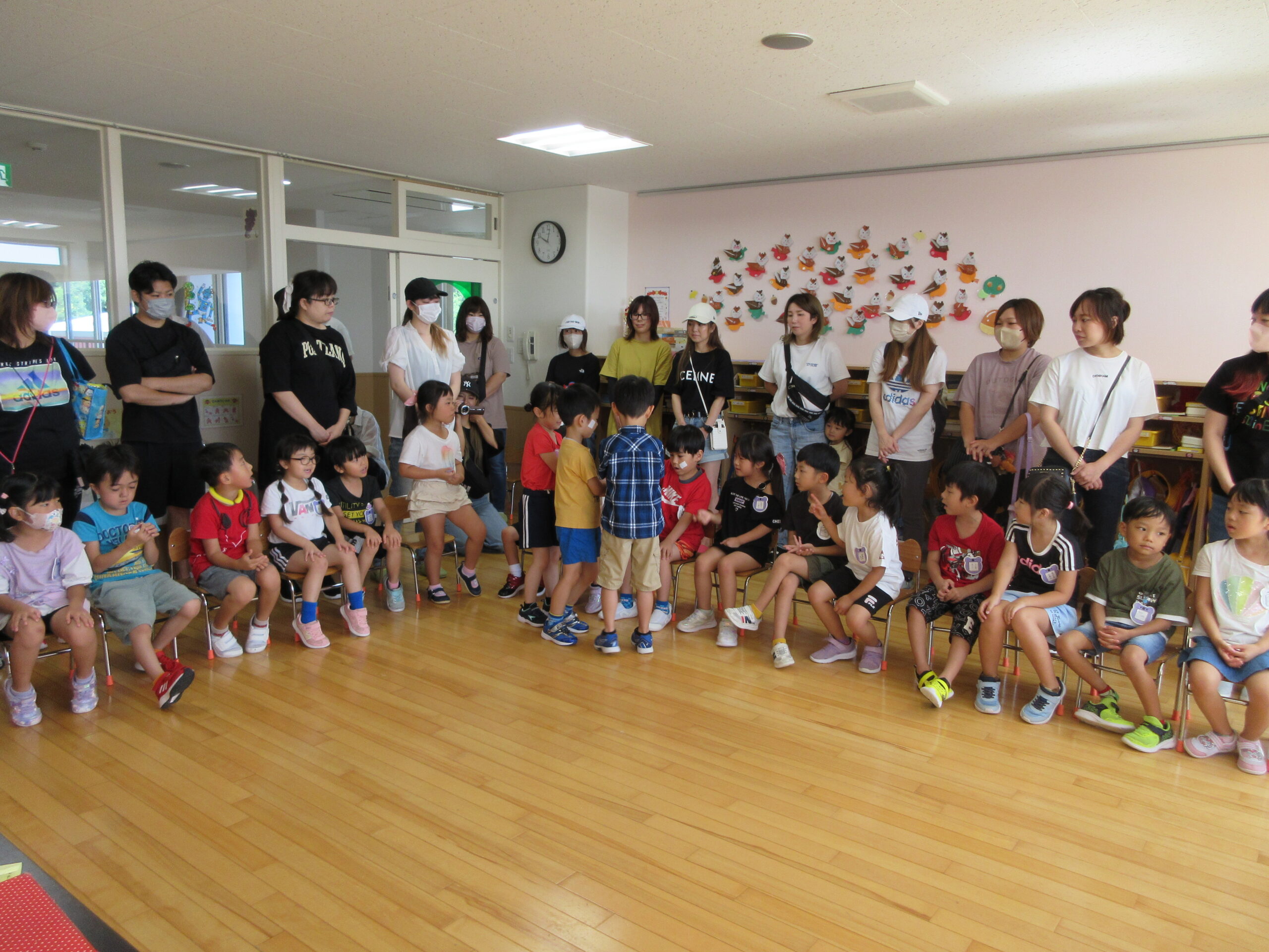 2学期に入り園生活のリズムを取り戻してきた子ども達。本日9月7日(木)は年長学年の参観日を実施しました。一学期の学びとなった運動会を振り返り園庭にてミニ運動会を楽しみました。暑さが心配でありましたが、子ども達は勿論のこと、保護者の方にも対策して頂きながら、無事終えることができました。競技では、ハリケーン・玉入れ・つなひきと親子で闘志を燃やして・・・励むことができました。最後はみんなでフォークダンスをして楽しみました。皆さん頑張りました!