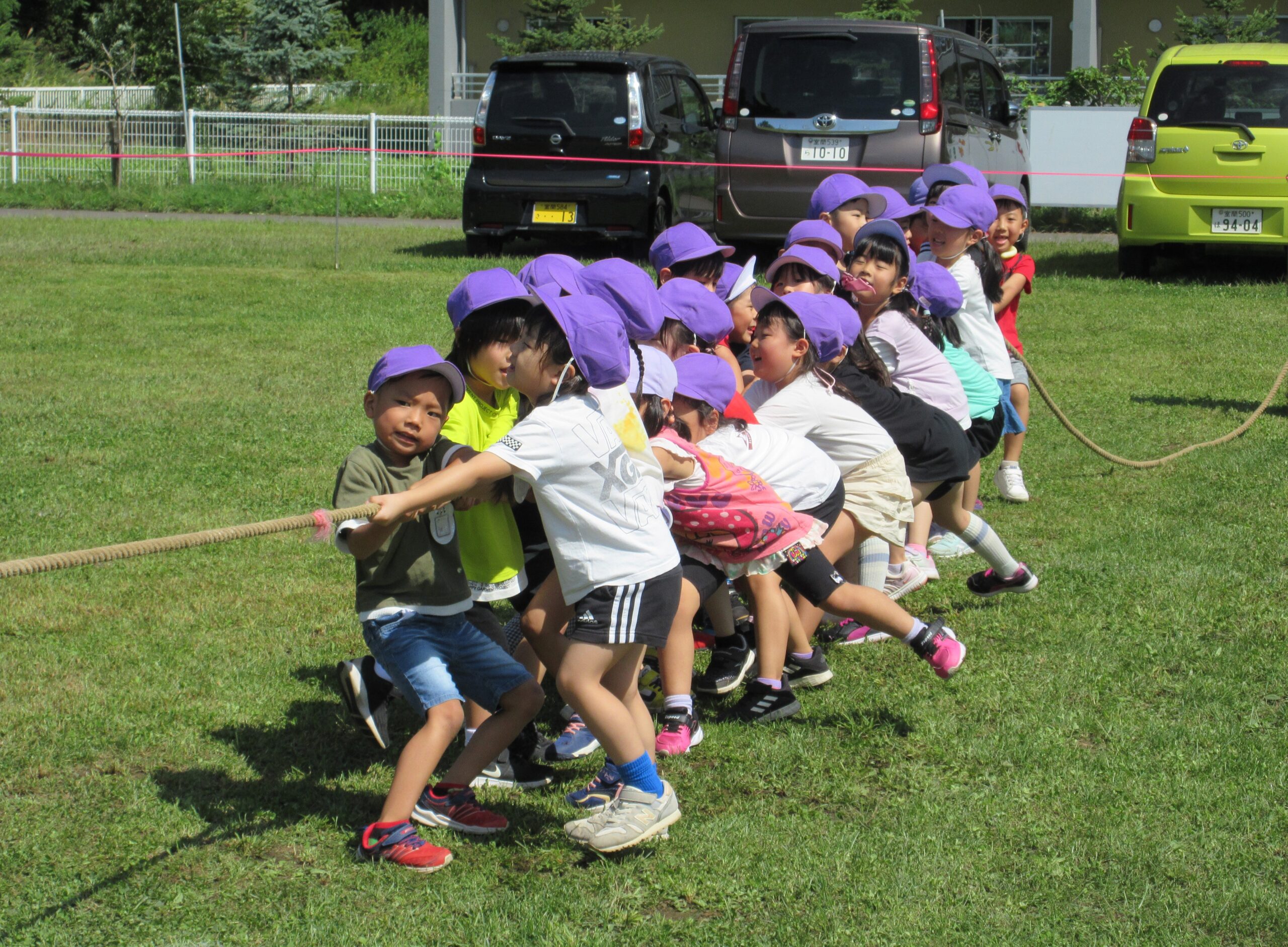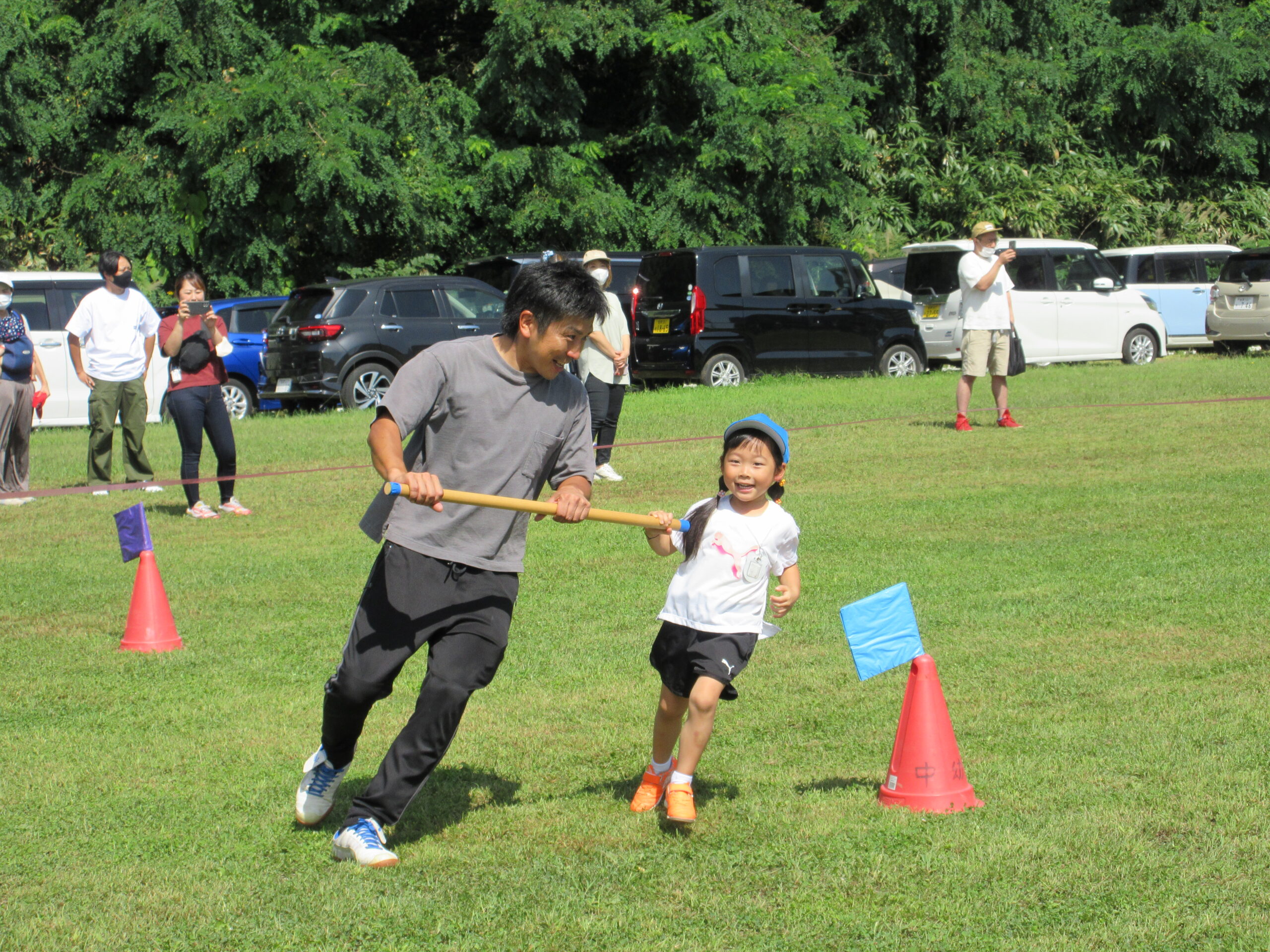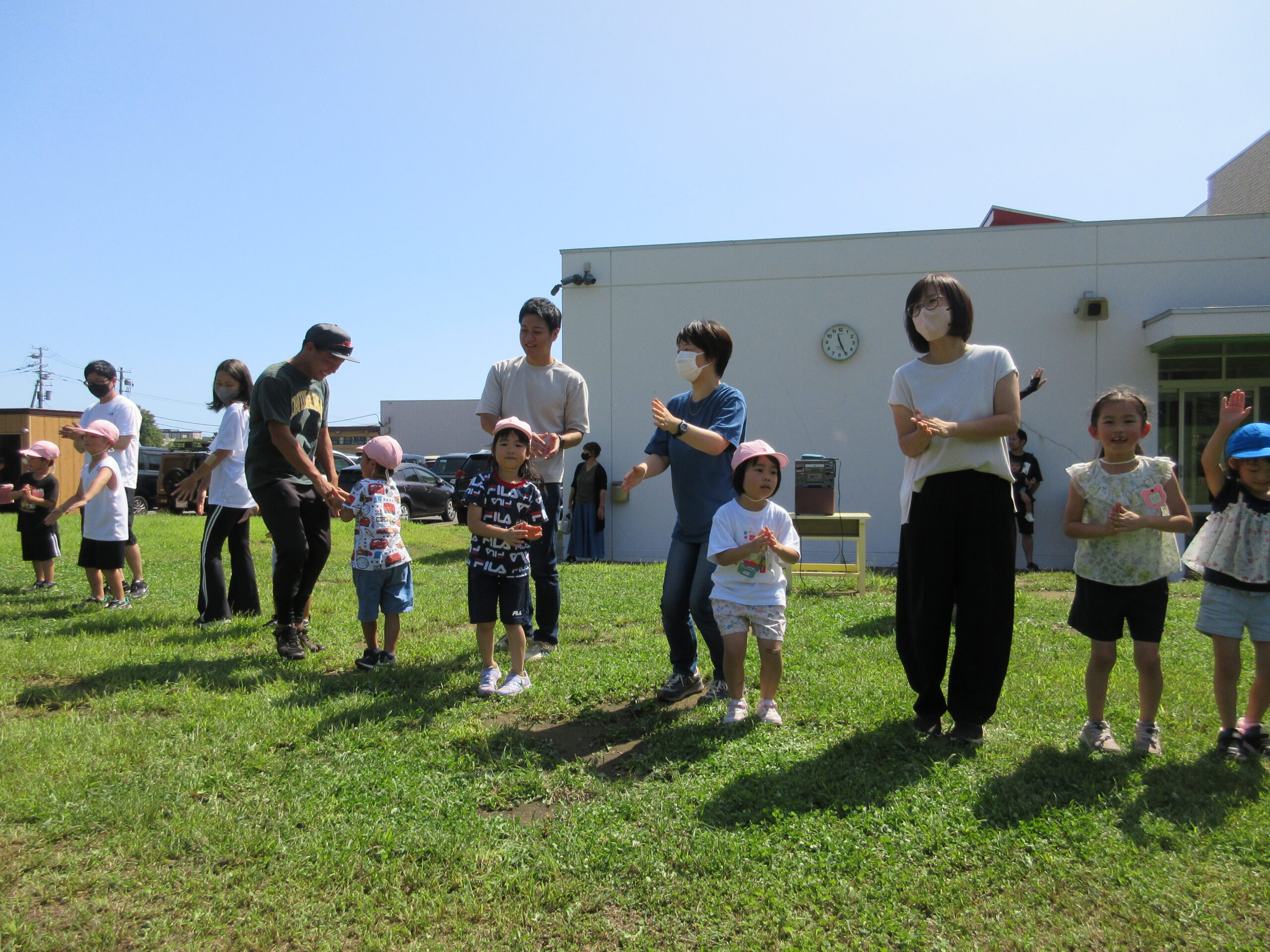 2学期に入り園生活のリズムを取り戻してきた子ども達。本日9月7日(木)は年長学年の参観日を実施しました。一学期の学びとなった運動会を振り返り園庭にてミニ運動会を楽しみました。暑さが心配でありましたが、子ども達は勿論のこと、保護者の方にも対策して頂きながら、無事終えることができました。競技では、ハリケーン・玉入れ・つなひきと親子で闘志を燃やして・・・励むことができました。最後はみんなでフォークダンスをして楽しみました。皆さん頑張りました!