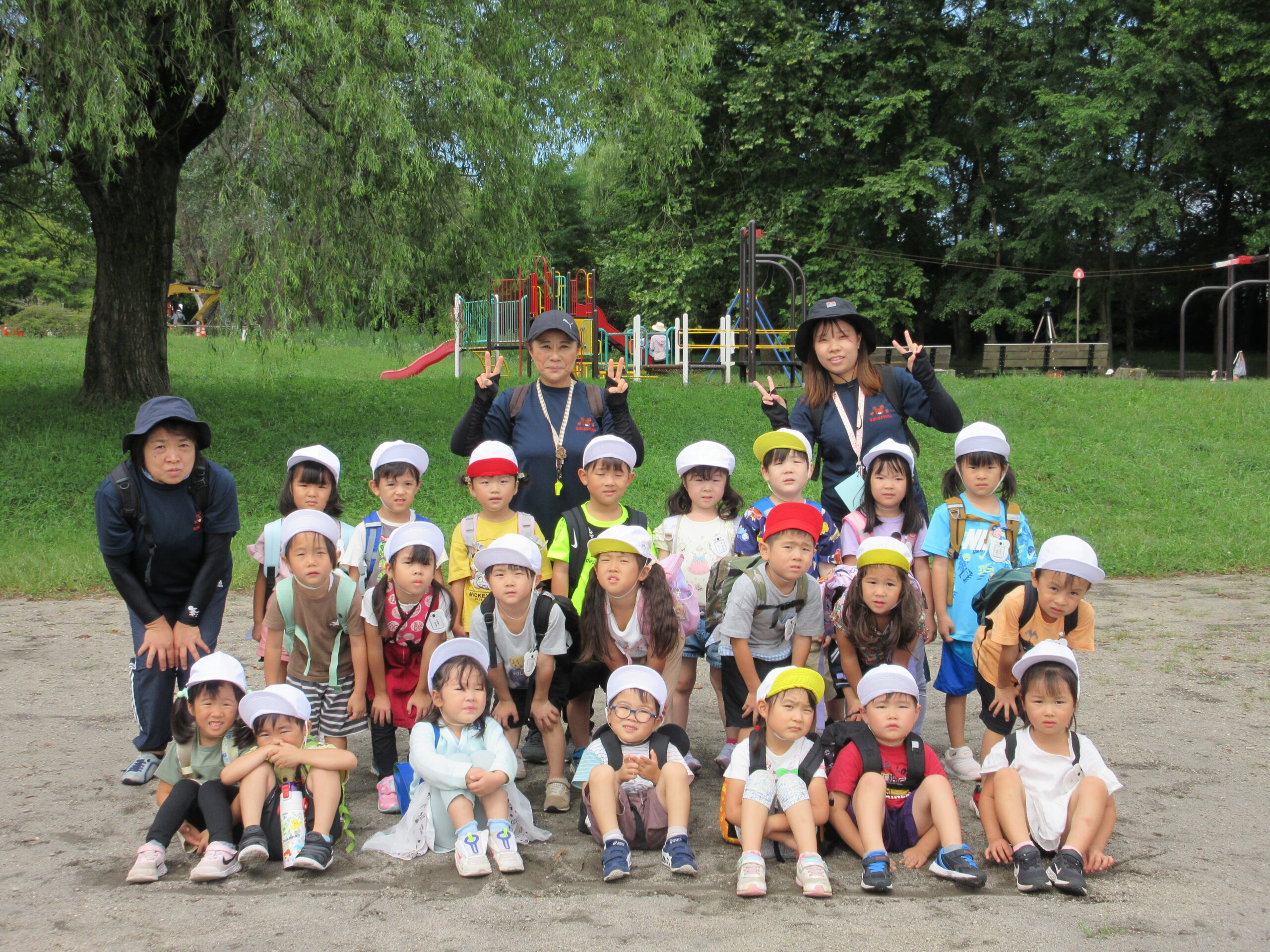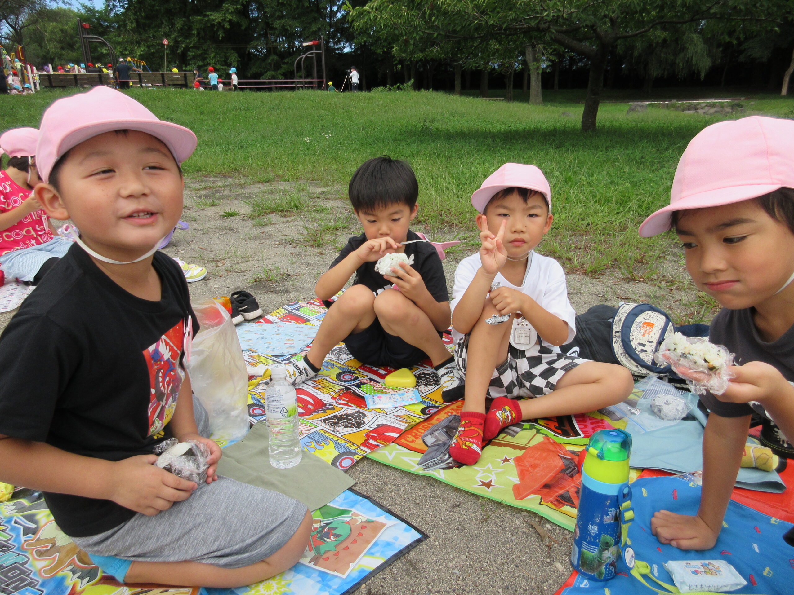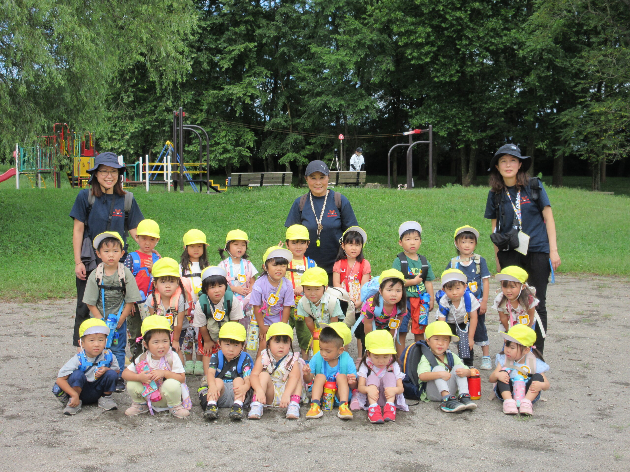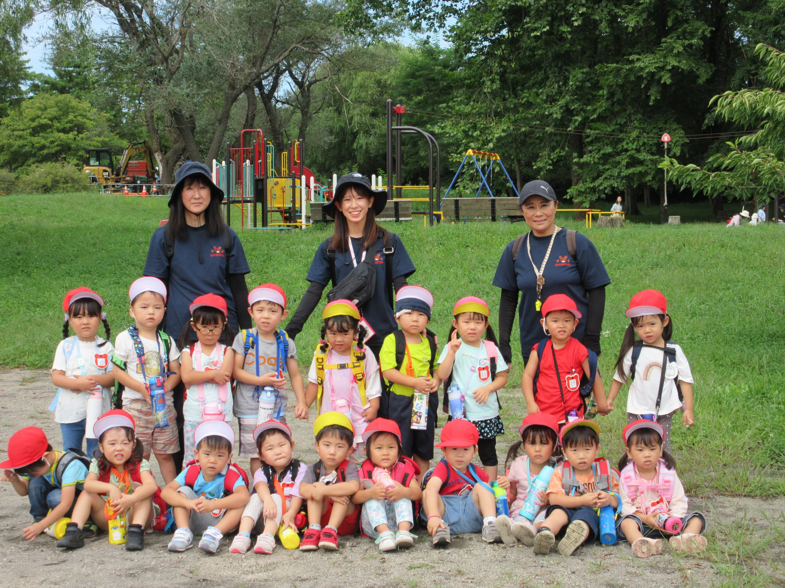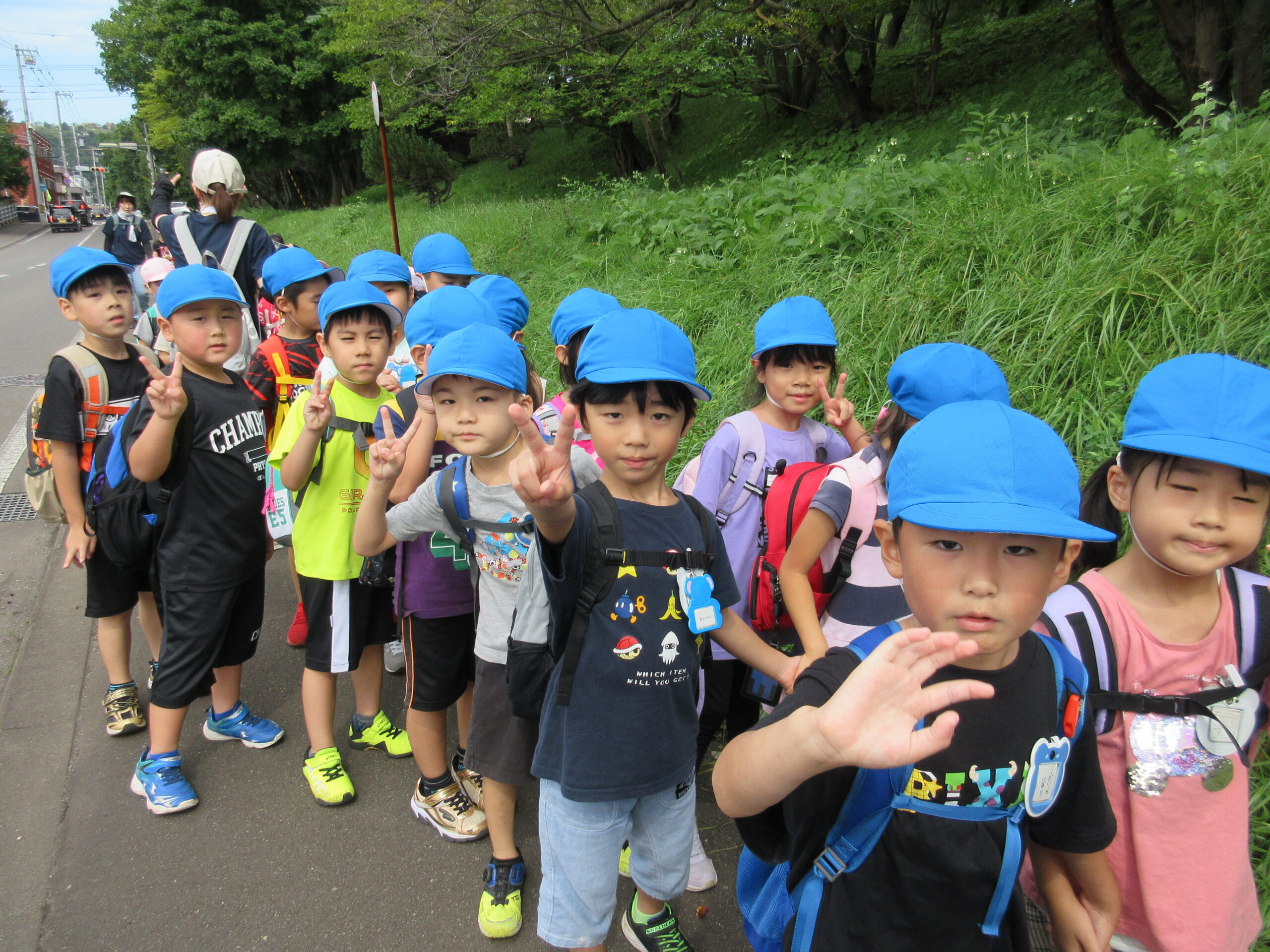 本日9月15日(金)秋の遠足を実施しました。昨日までの降水量で現地の中島公園が心配でしたが、今日はお天気に恵まれ歩きやすい気温でした。例年通り中島公園までは学年毎で2人手を繋ぎ歩きました。休憩(水分補給)をしながら順調に歩くことができていましたね。年長学年を先頭に、続いて歩く年中学年。そして少し距離をおいての年少学年。交通ルールを守りながら歩くことができました。現地ではそれぞれの敷物を敷いておにぎり🍙おやつ🍭を食べ、遊具で沢山遊び充実した時間を過ごすことができました。