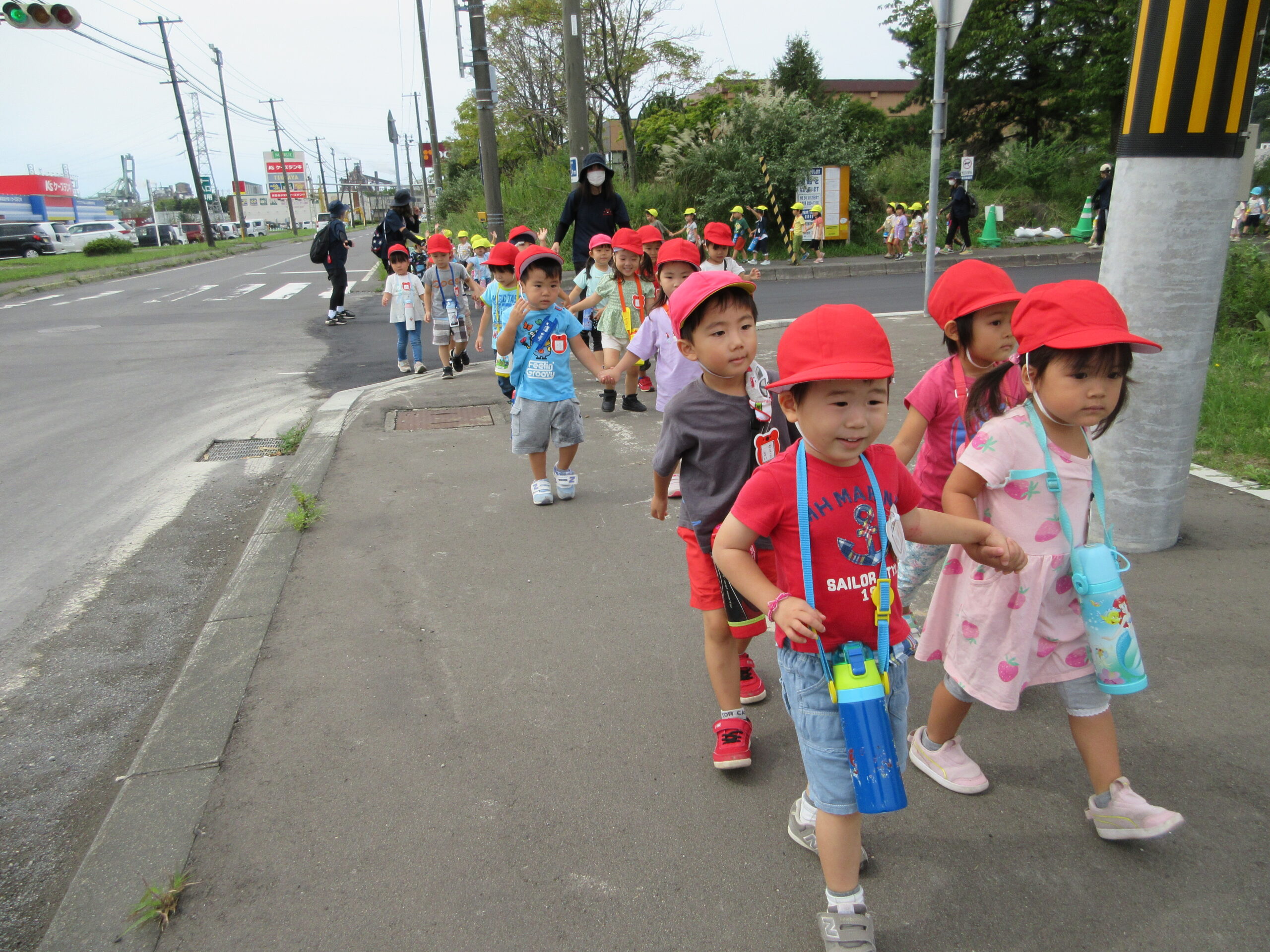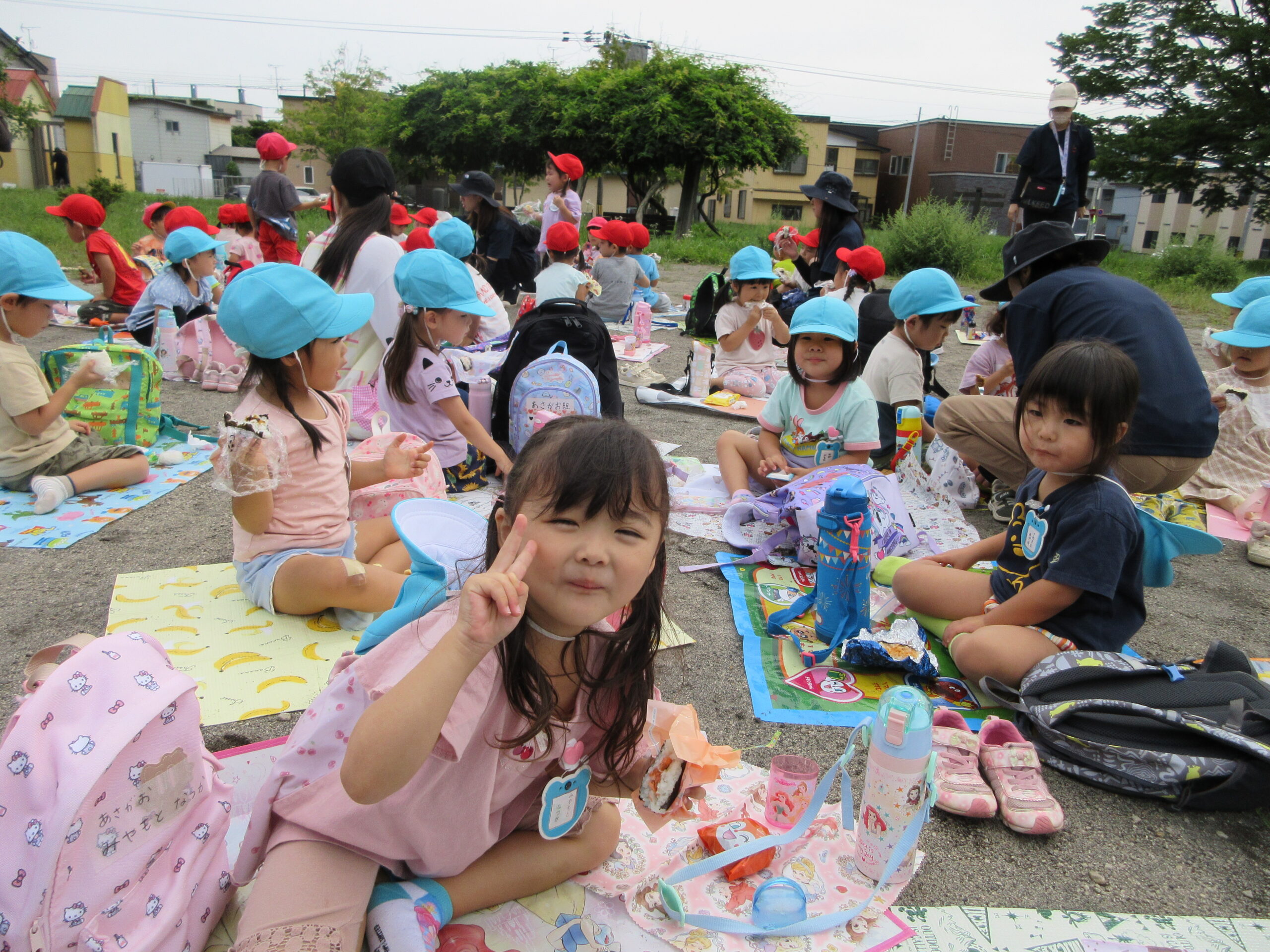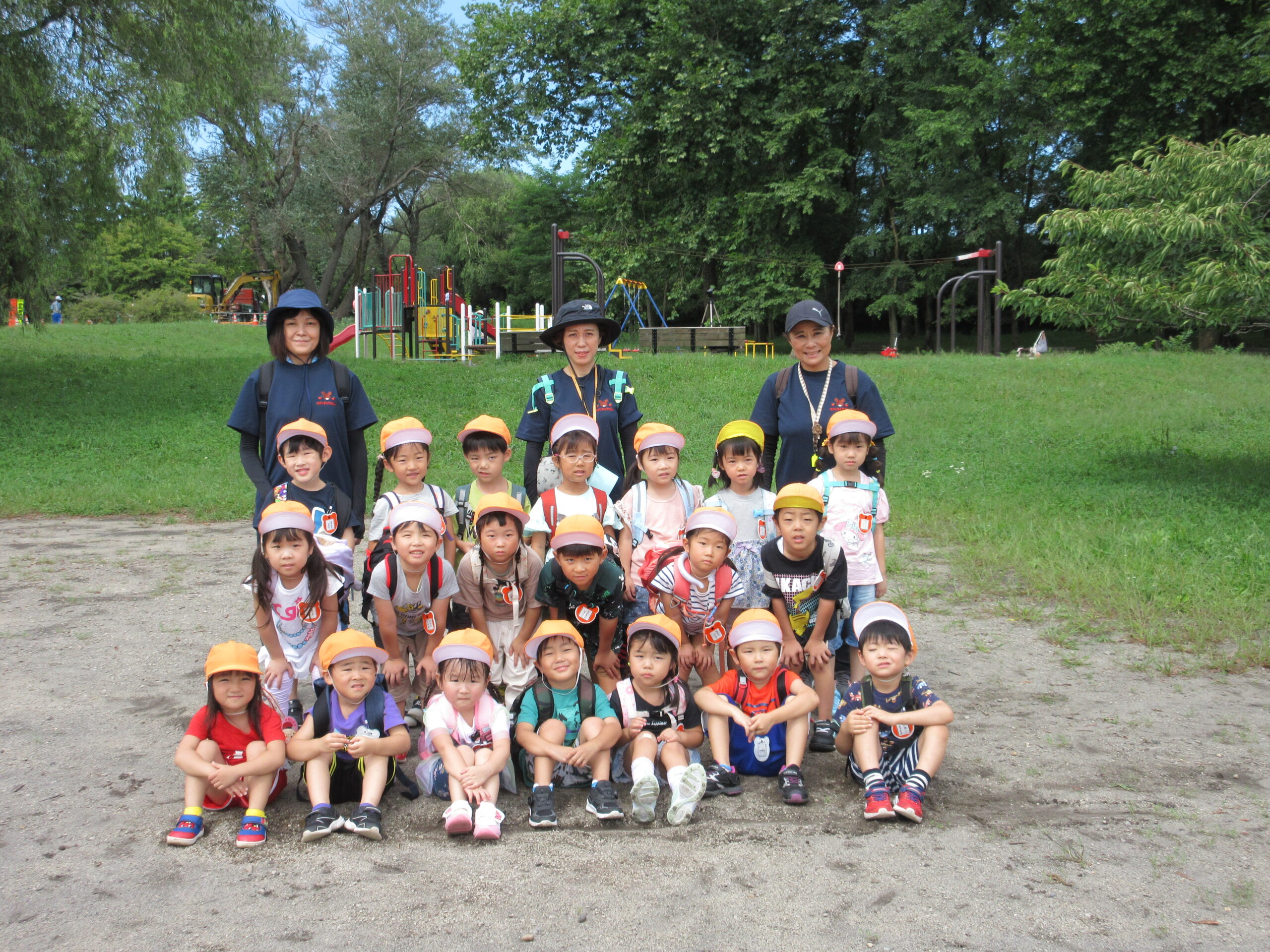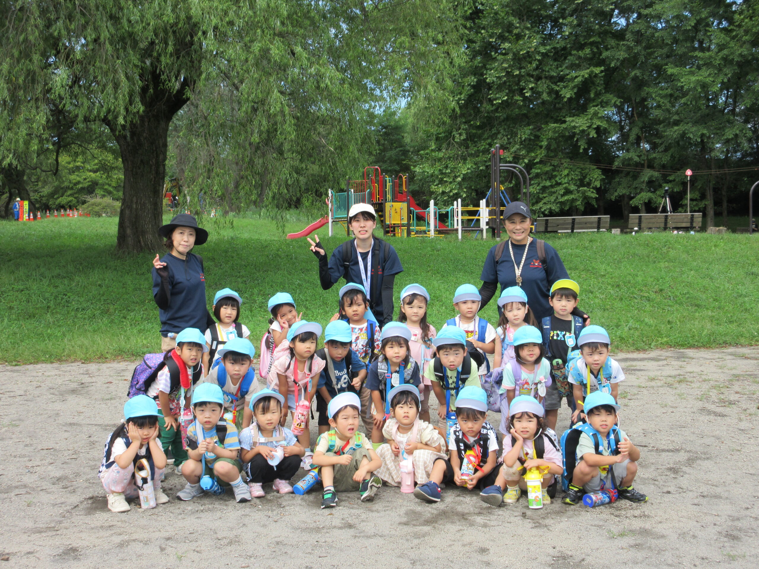 本日9月15日(金)秋の遠足を実施しました。昨日までの降水量で現地の中島公園が心配でしたが、今日はお天気に恵まれ歩きやすい気温でした。例年通り中島公園までは学年毎で2人手を繋ぎ歩きました。休憩(水分補給)をしながら順調に歩くことができていましたね。年長学年を先頭に、続いて歩く年中学年。そして少し距離をおいての年少学年。交通ルールを守りながら歩くことができました。現地ではそれぞれの敷物を敷いておにぎり🍙おやつ🍭を食べ、遊具で沢山遊び充実した時間を過ごすことができました。