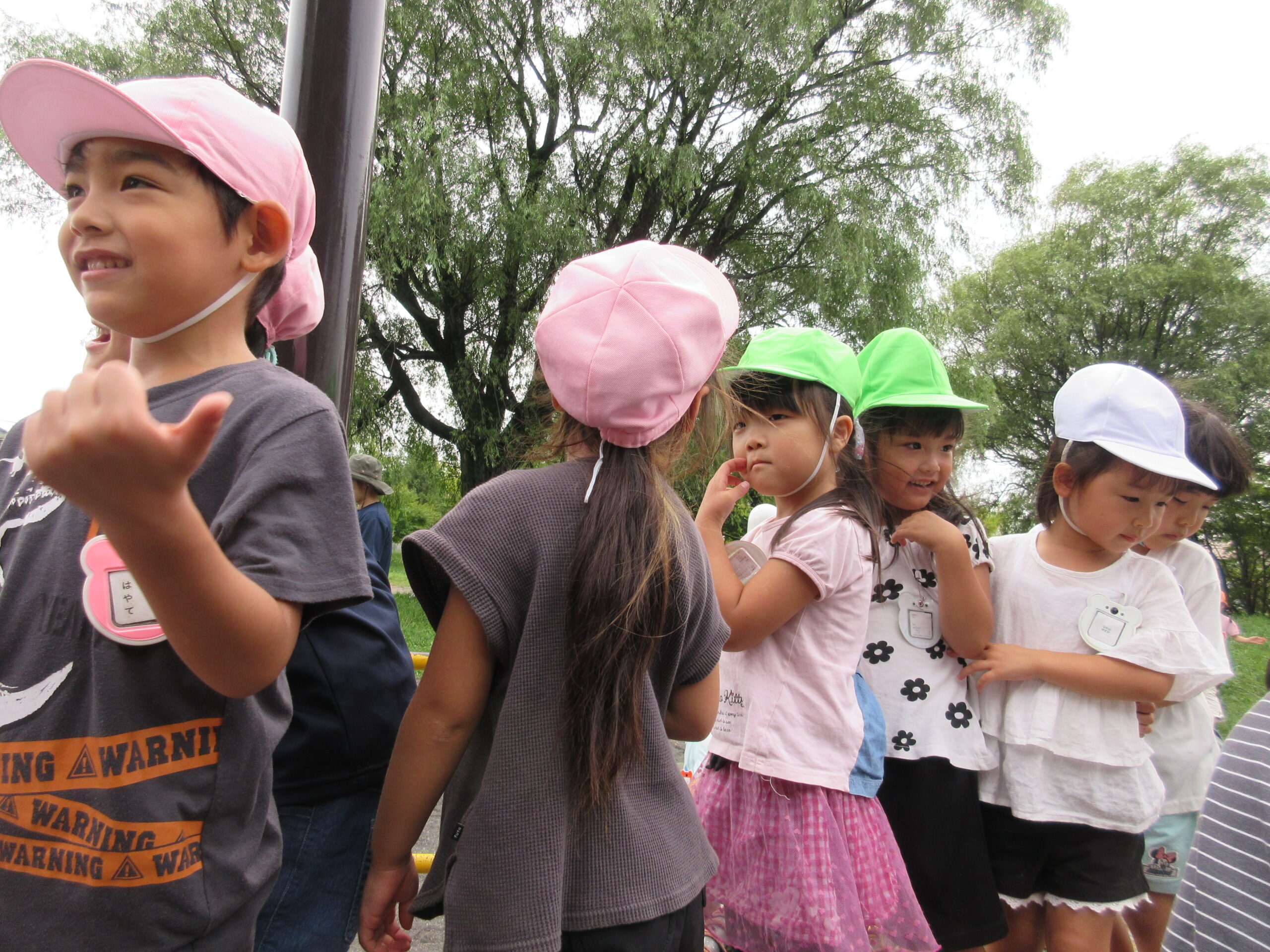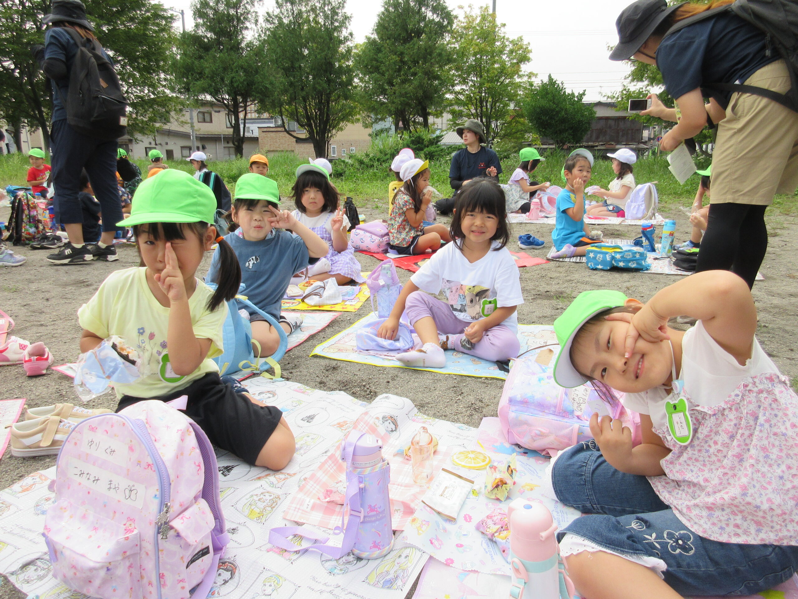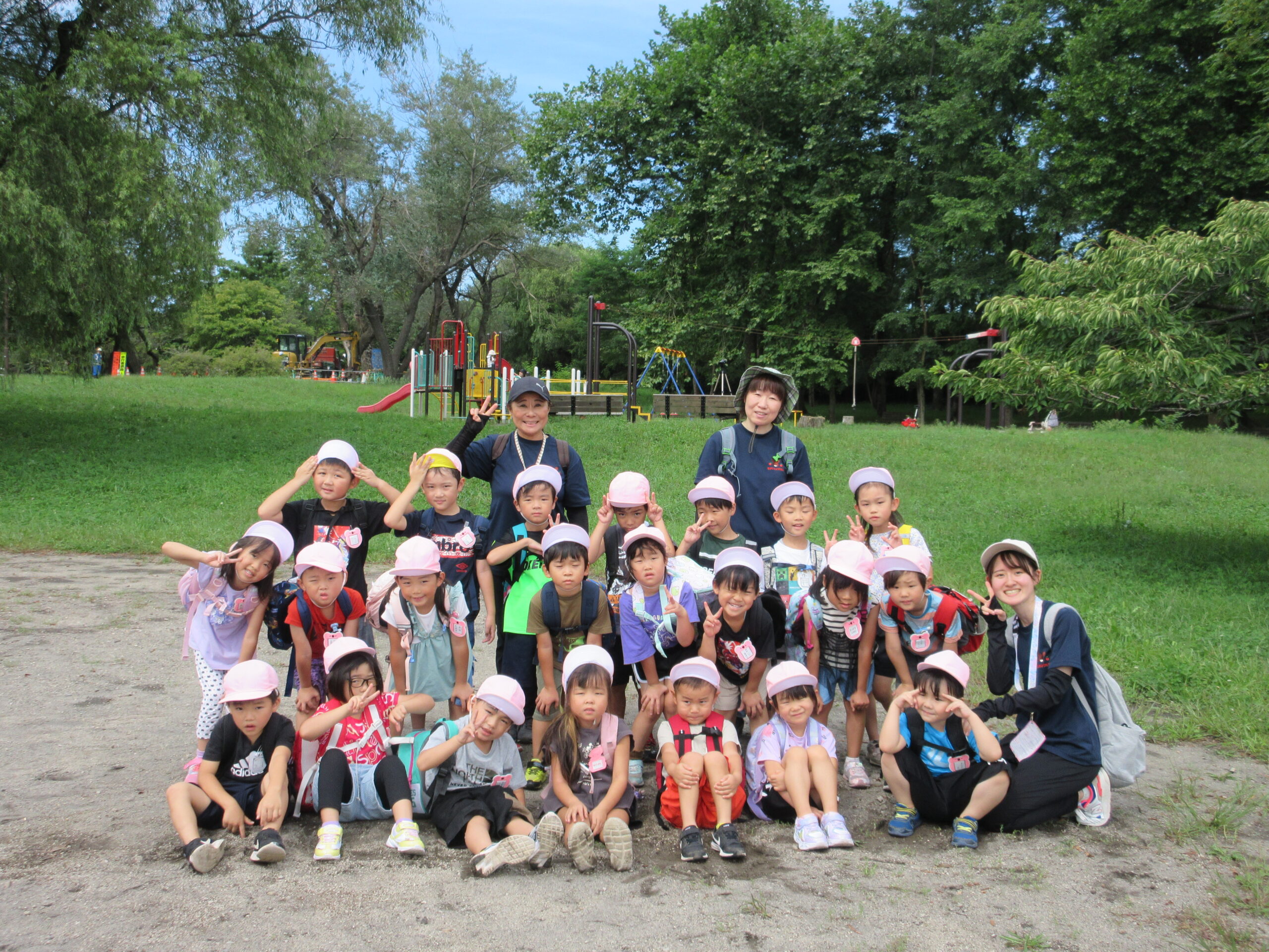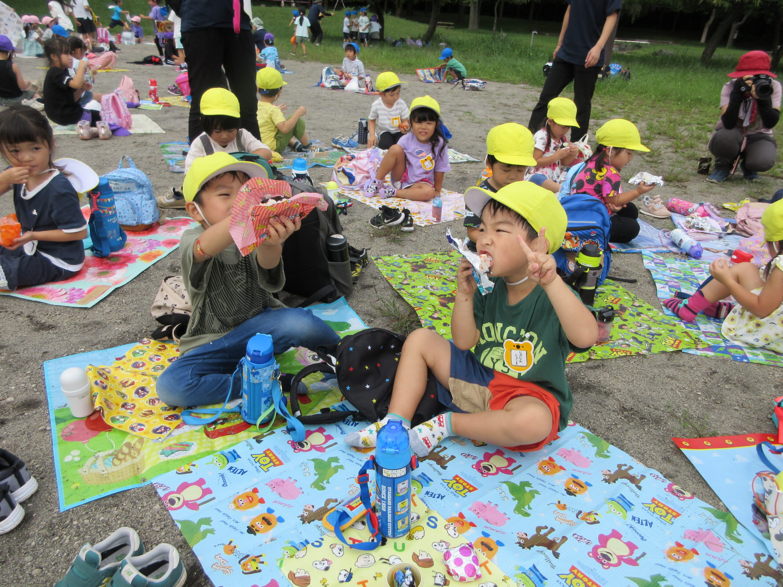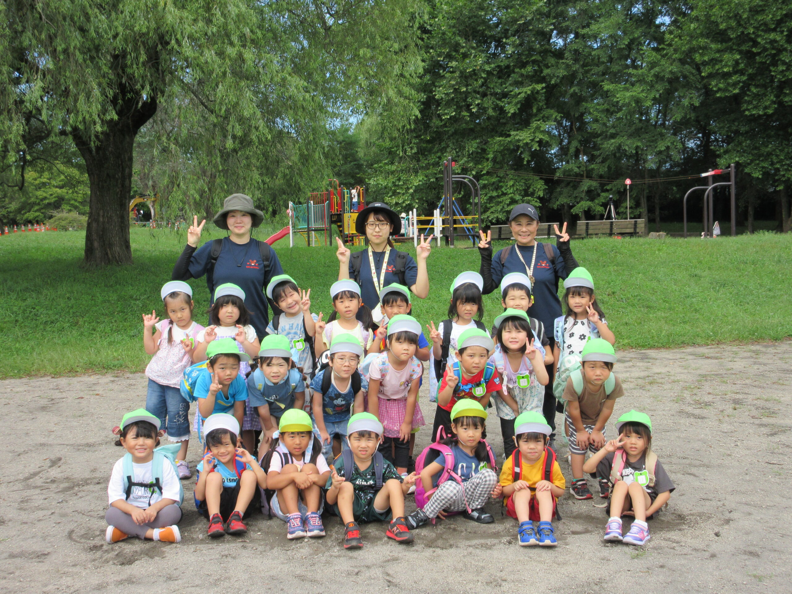 本日9月15日(金)秋の遠足を実施しました。昨日までの降水量で現地の中島公園が心配でしたが、今日はお天気に恵まれ歩きやすい気温でした。例年通り中島公園までは学年毎で2人手を繋ぎ歩きました。休憩(水分補給)をしながら順調に歩くことができていましたね。年長学年を先頭に、続いて歩く年中学年。そして少し距離をおいての年少学年。交通ルールを守りながら歩くことができました。現地ではそれぞれの敷物を敷いておにぎり🍙おやつ🍭を食べ、遊具で沢山遊び充実した時間を過ごすことができました。