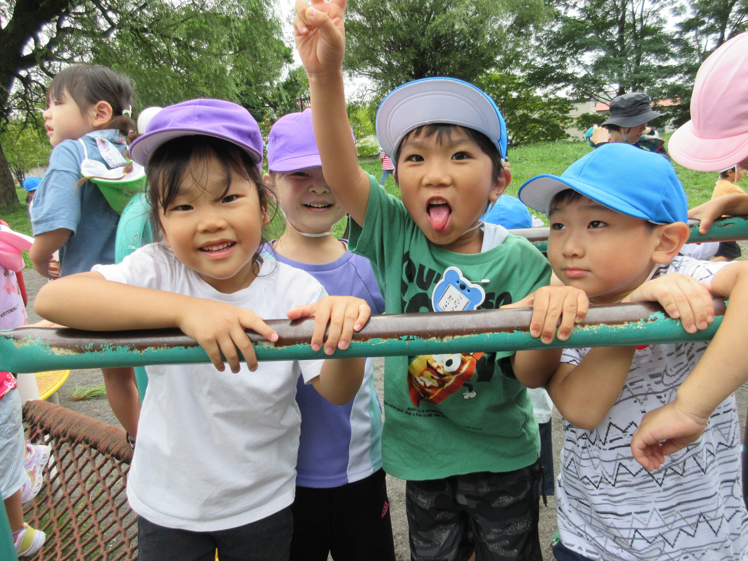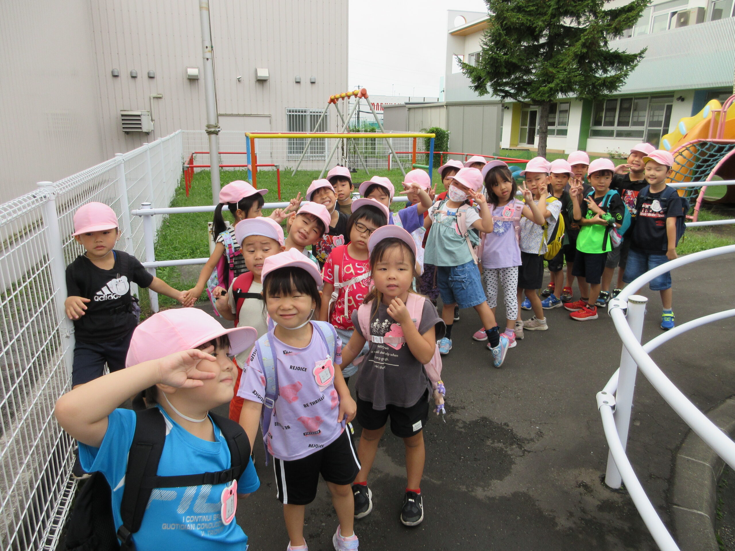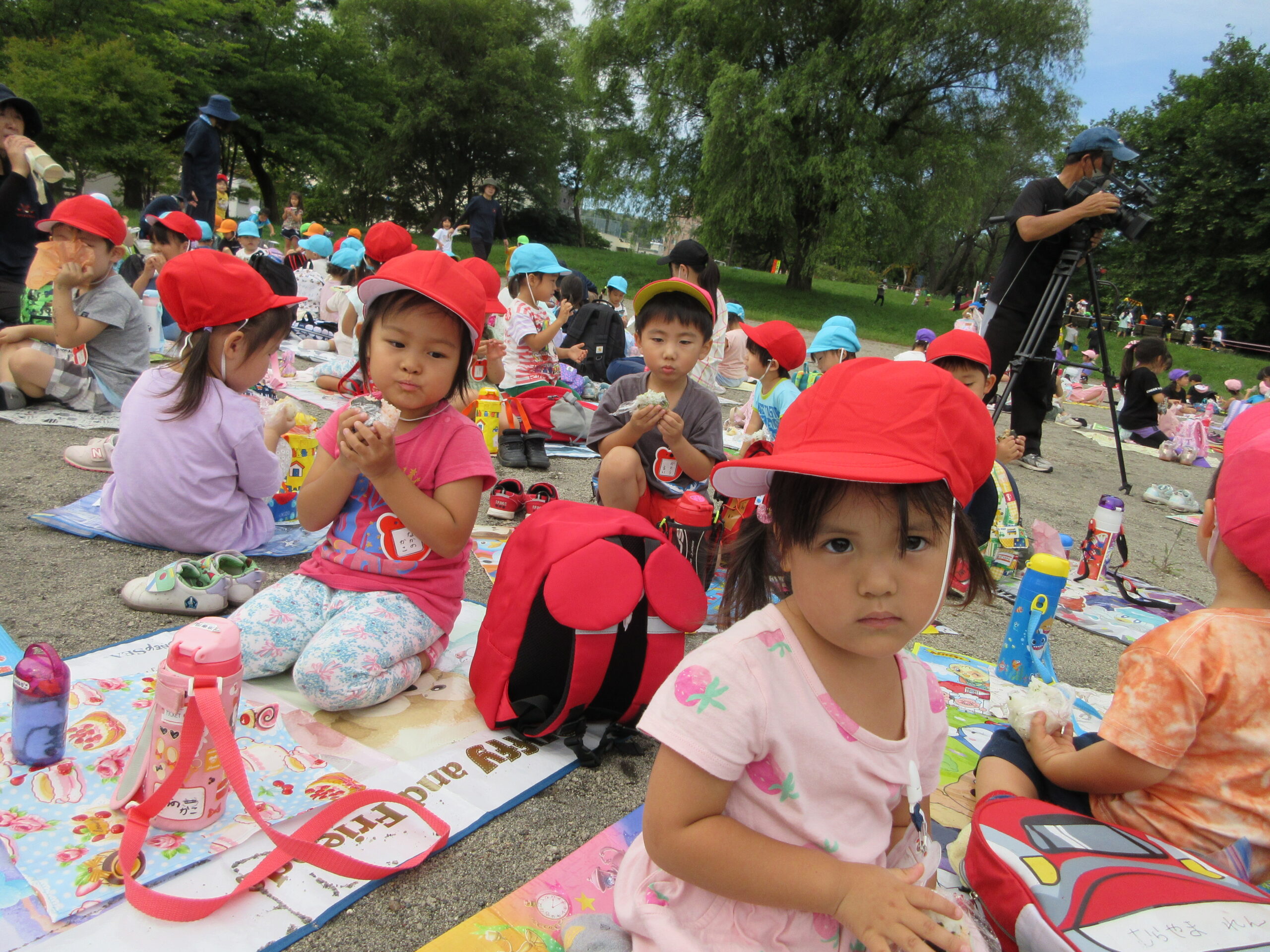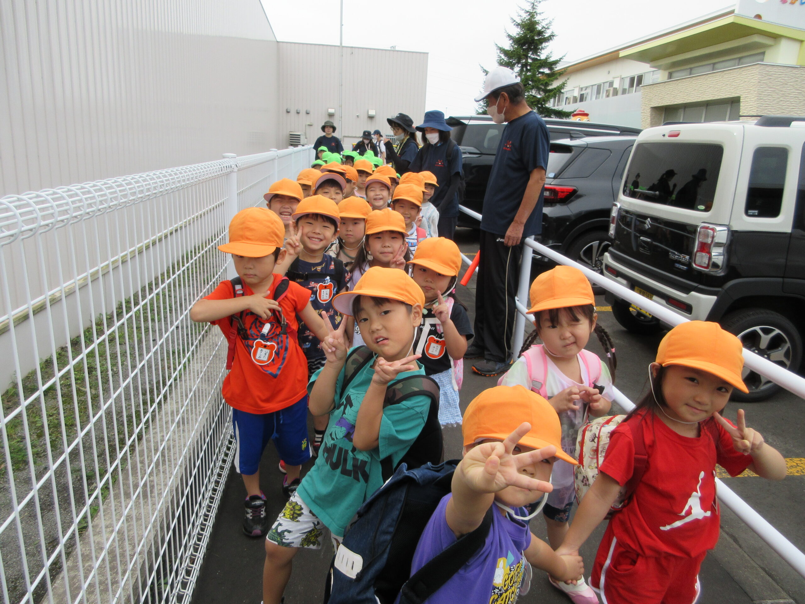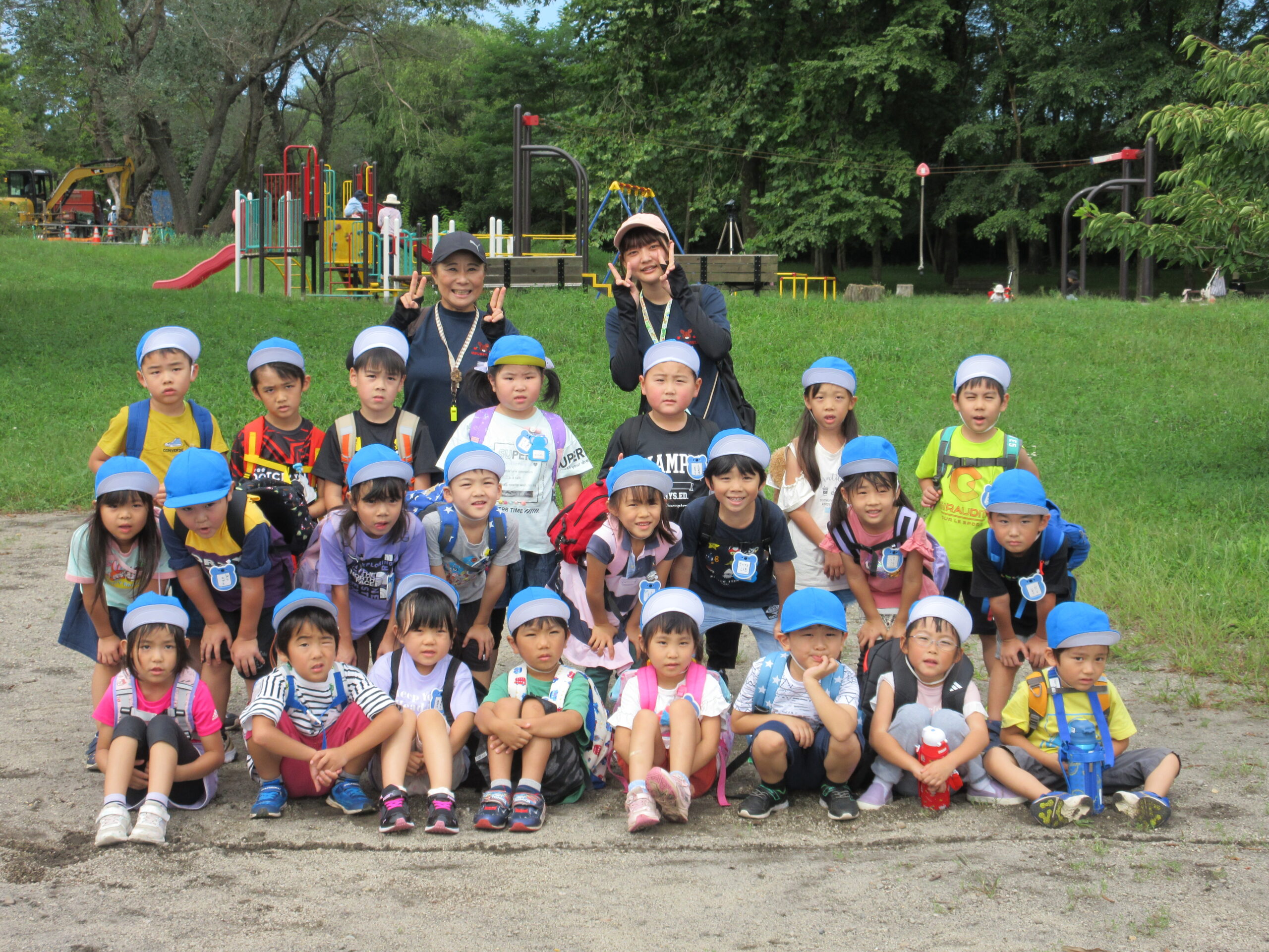 本日9月15日(金)秋の遠足を実施しました。昨日までの降水量で現地の中島公園が心配でしたが、今日はお天気に恵まれ歩きやすい気温でした。例年通り中島公園までは学年毎で2人手を繋ぎ歩きました。休憩(水分補給)をしながら順調に歩くことができていましたね。年長学年を先頭に、続いて歩く年中学年。そして少し距離をおいての年少学年。交通ルールを守りながら歩くことができました。現地ではそれぞれの敷物を敷いておにぎり🍙おやつ🍭を食べ、遊具で沢山遊び充実した時間を過ごすことができました。