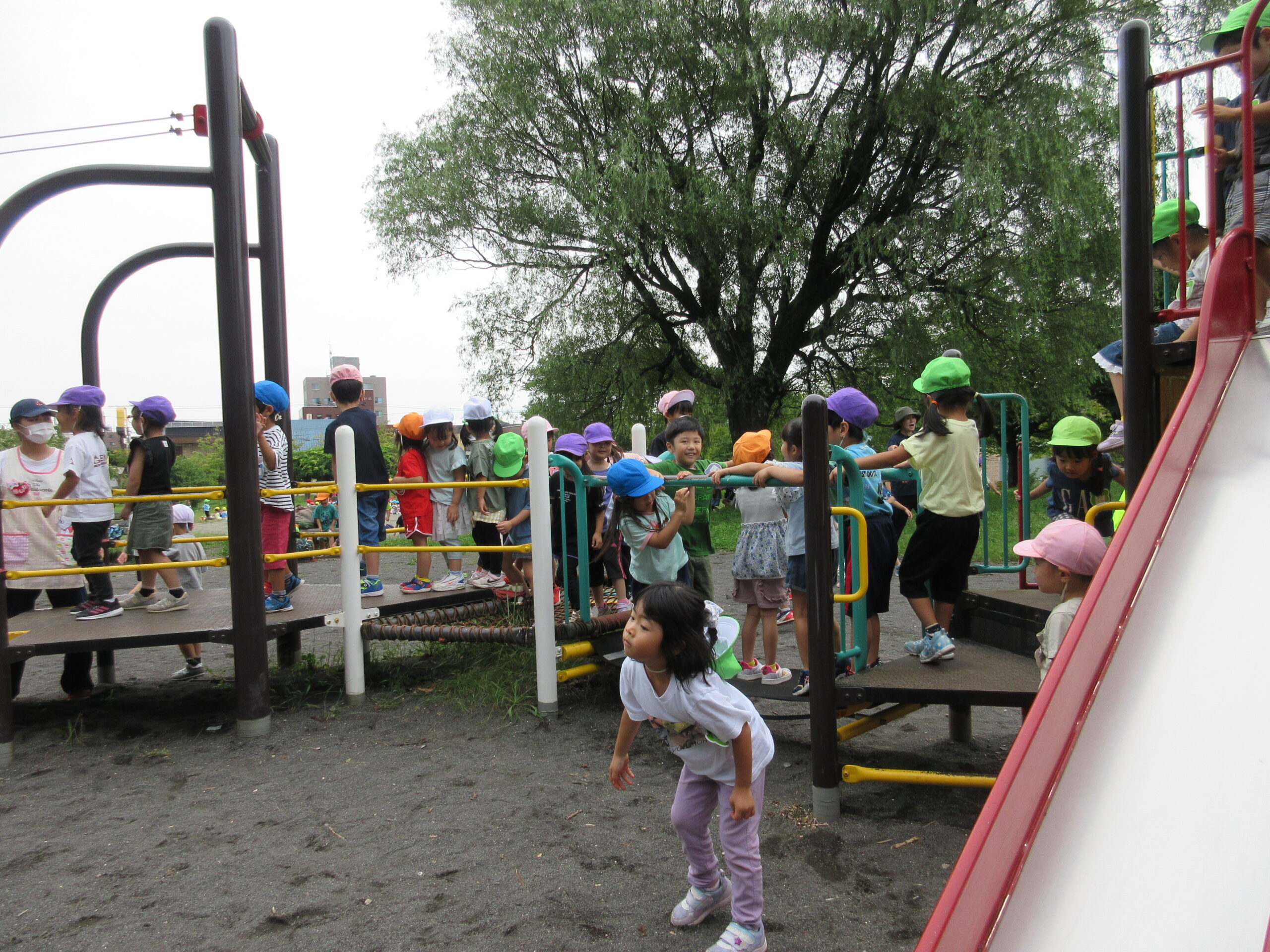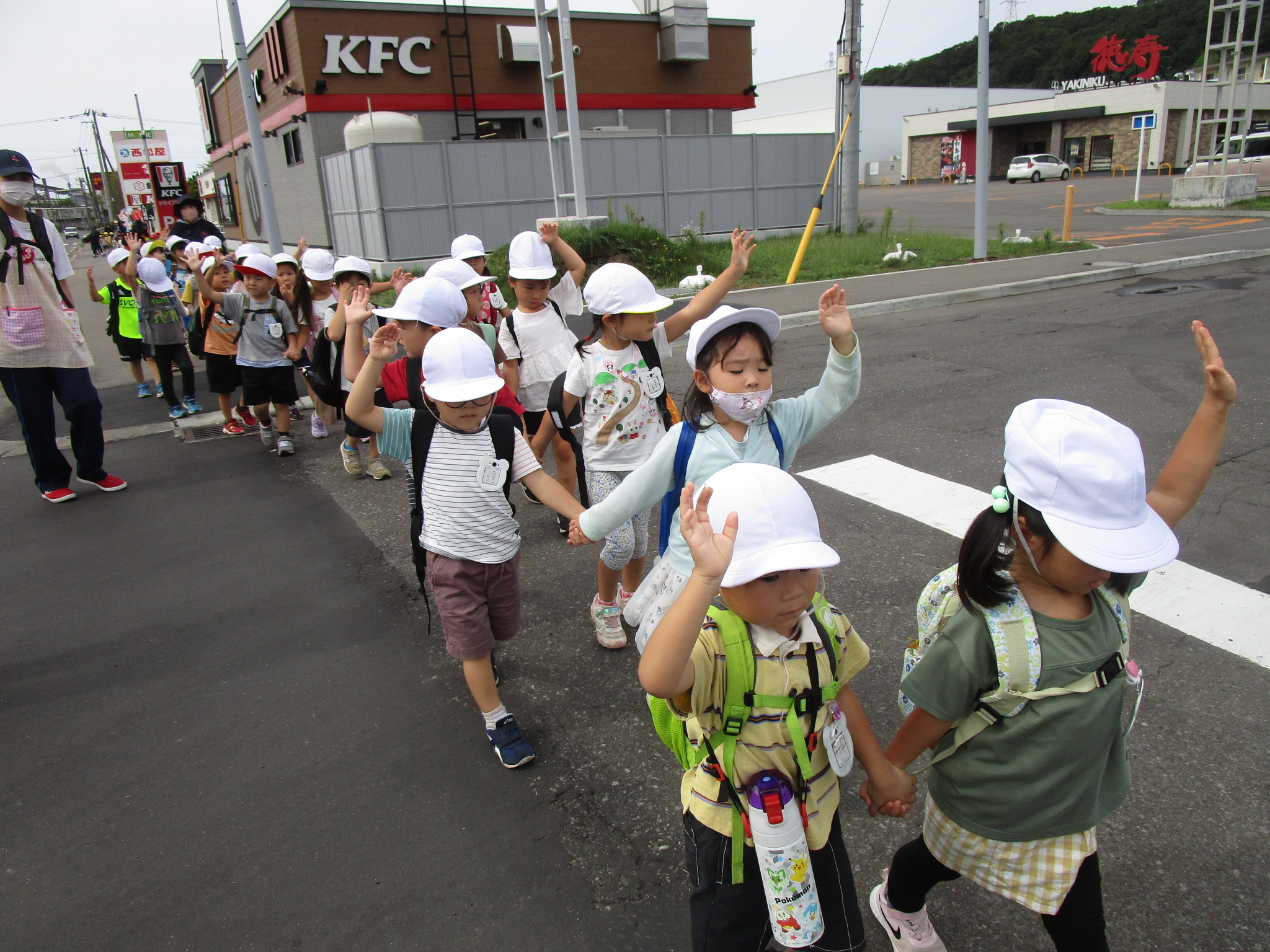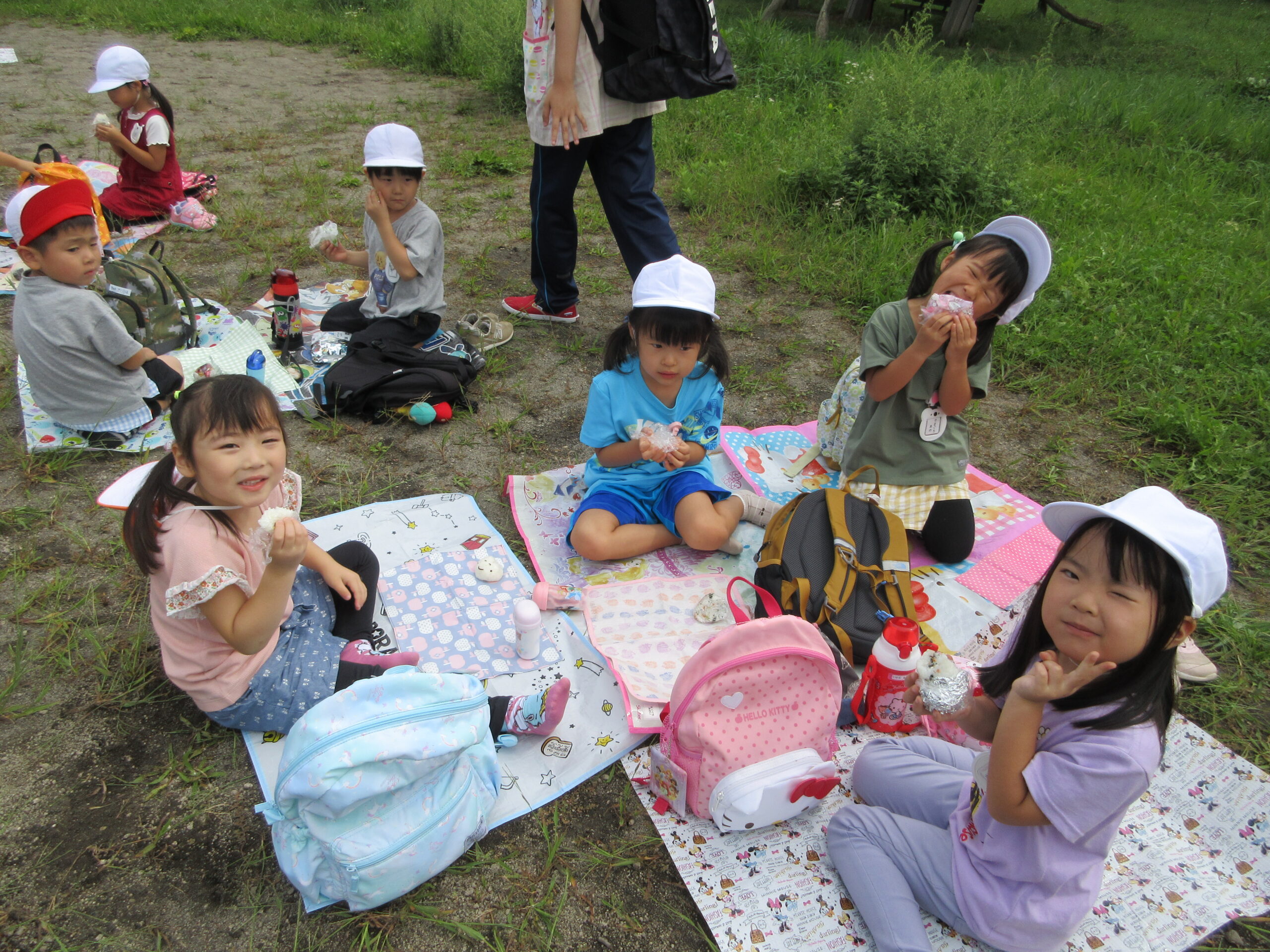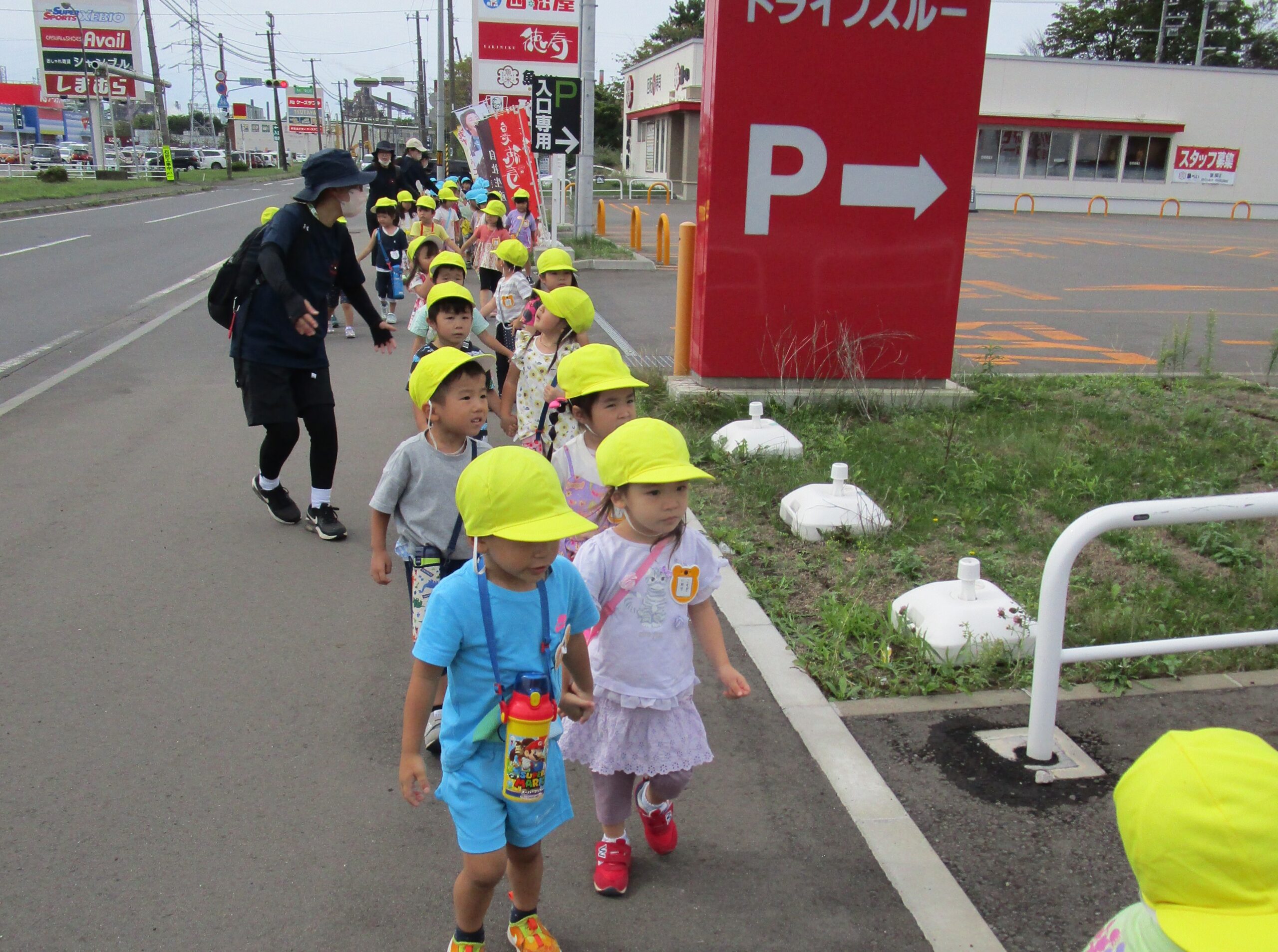 本日9月15日(金)秋の遠足を実施しました。昨日までの降水量で現地の中島公園が心配でしたが、今日はお天気に恵まれ歩きやすい気温でした。例年通り中島公園までは学年毎で2人手を繋ぎ歩きました。休憩(水分補給)をしながら順調に歩くことができていましたね。年長学年を先頭に、続いて歩く年中学年。そして少し距離をおいての年少学年。交通ルールを守りながら歩くことができました。現地ではそれぞれの敷物を敷いておにぎり🍙おやつ🍭を食べ、遊具で沢山遊び充実した時間を過ごすことができました。