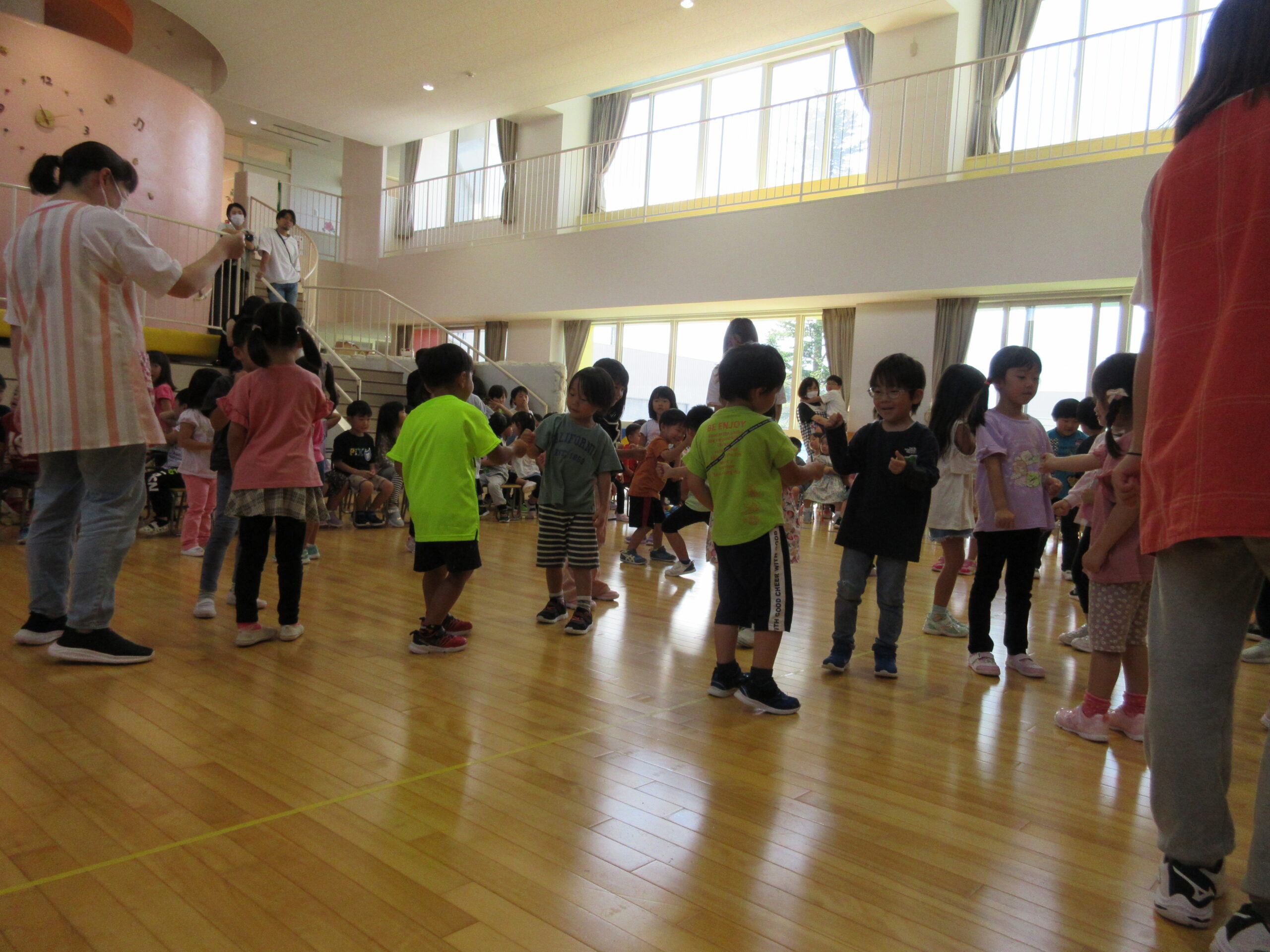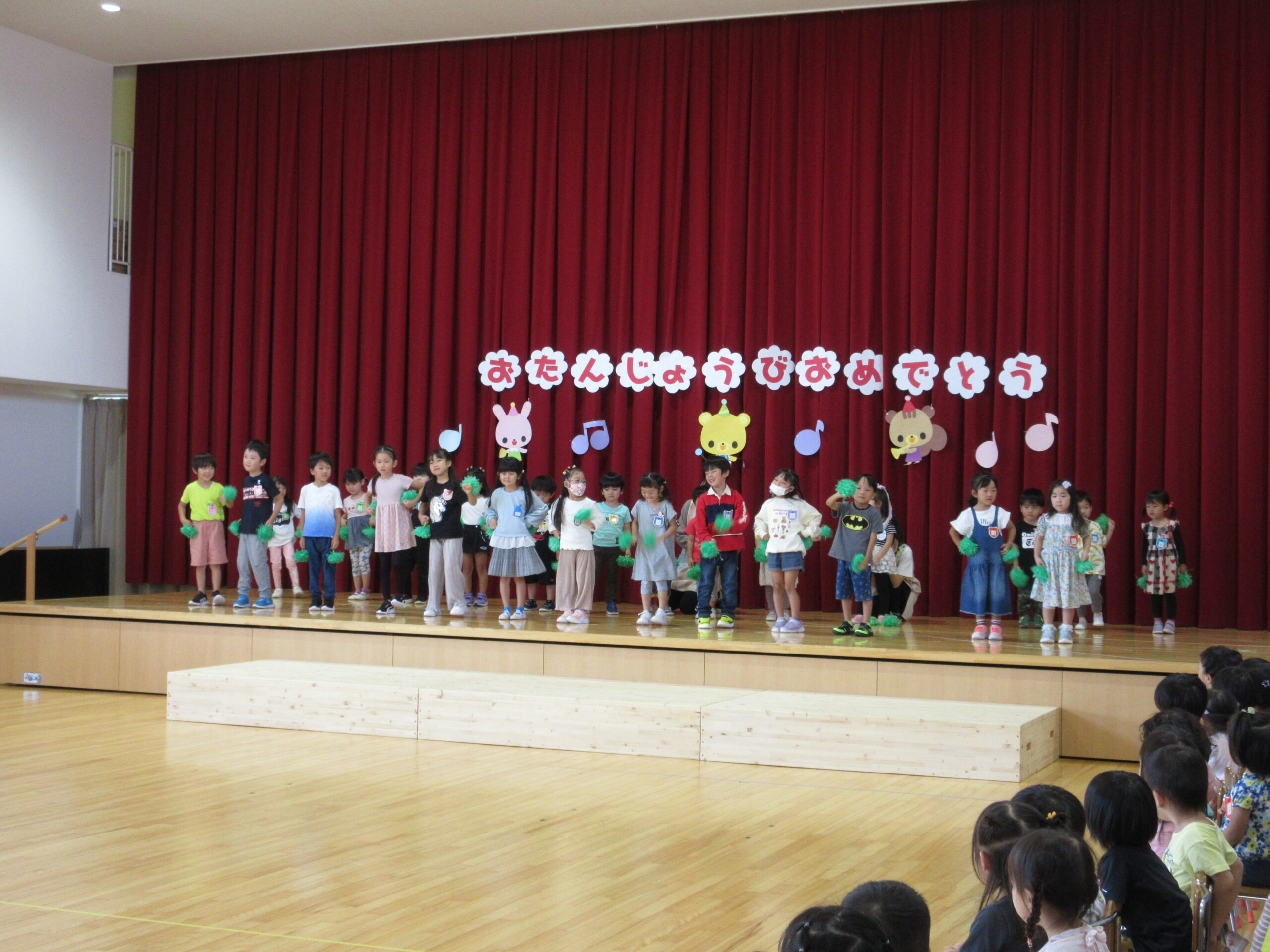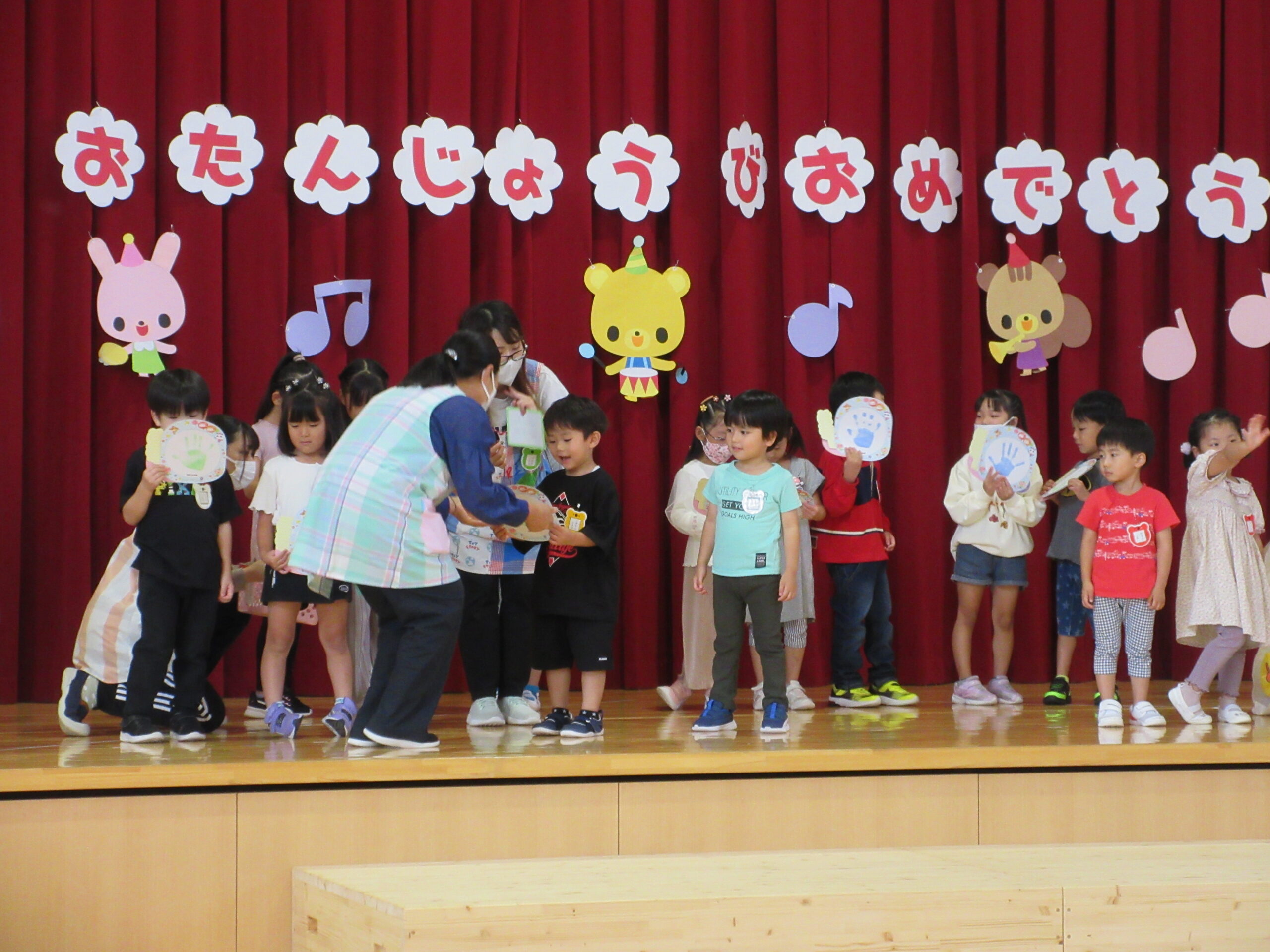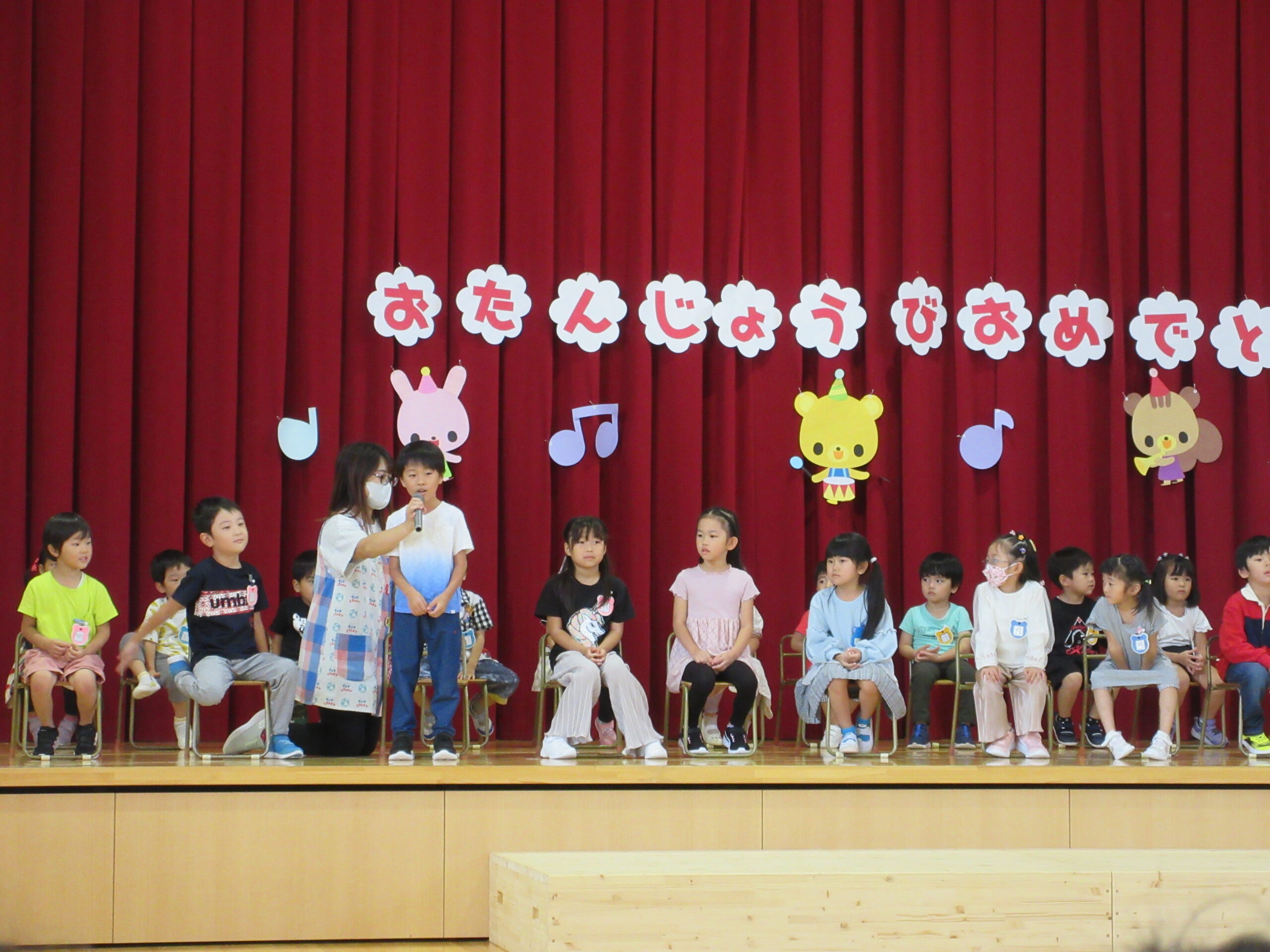 今年は格別に残暑が厳しい状況でありましたが、少しずつ過ごしやすく肌寒さも感じるようになりました。本日9月29日(金)は26名の9月生まれのお誕生会を実施しました。誕生会で披露する踊りはテンポよいサンバの踊りで楽しんで参加していました。自己紹介もみんなの前で上手に発表できました。誕生会後の「おつかいありさん」ゲームではじゃんけんの掛け声に合わせてタイミングよく理解して楽しんでいましたね。