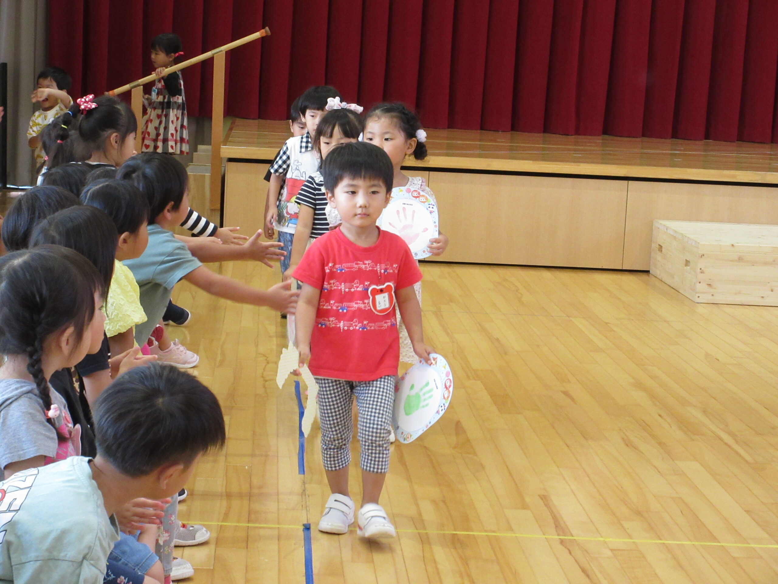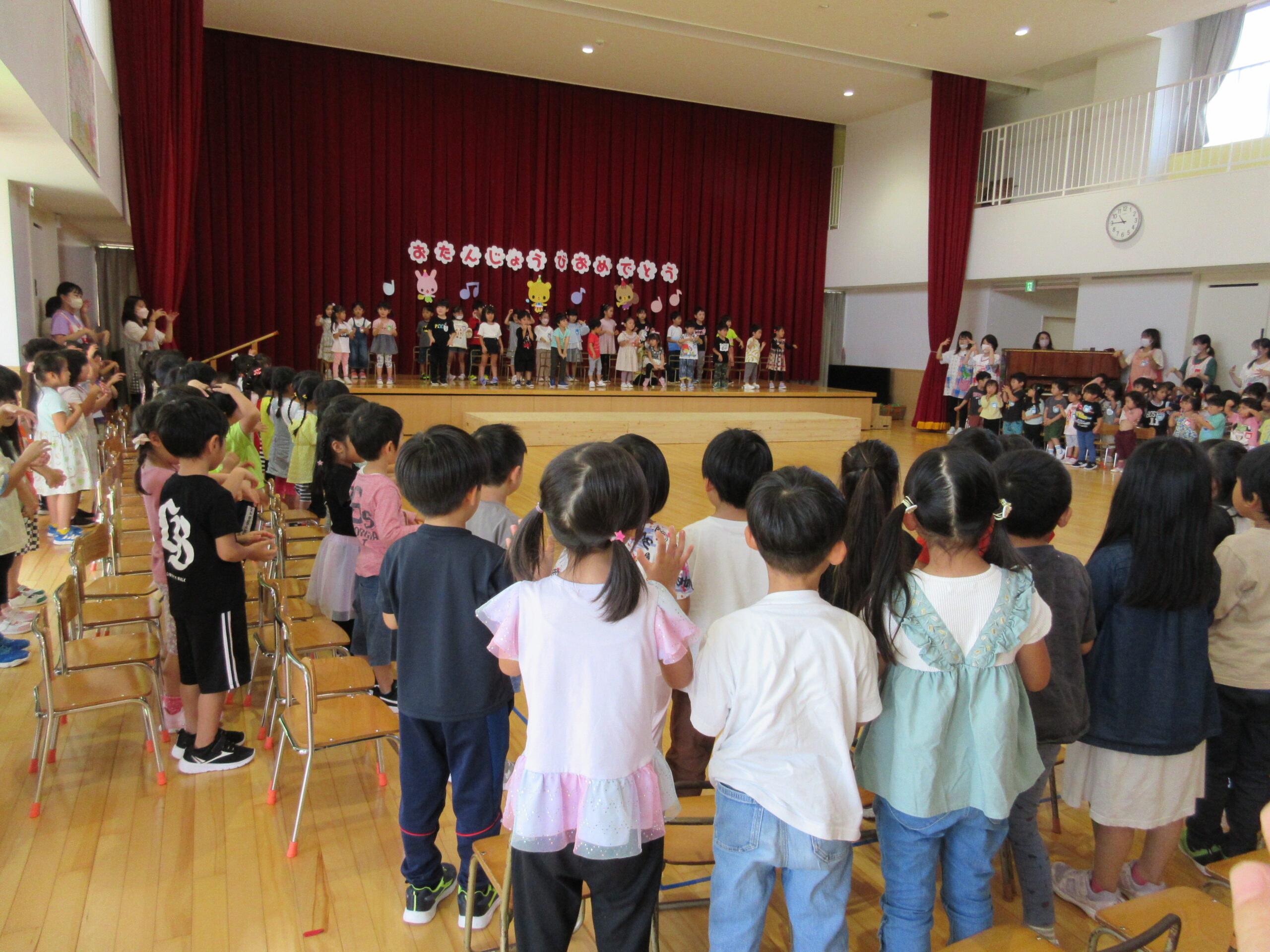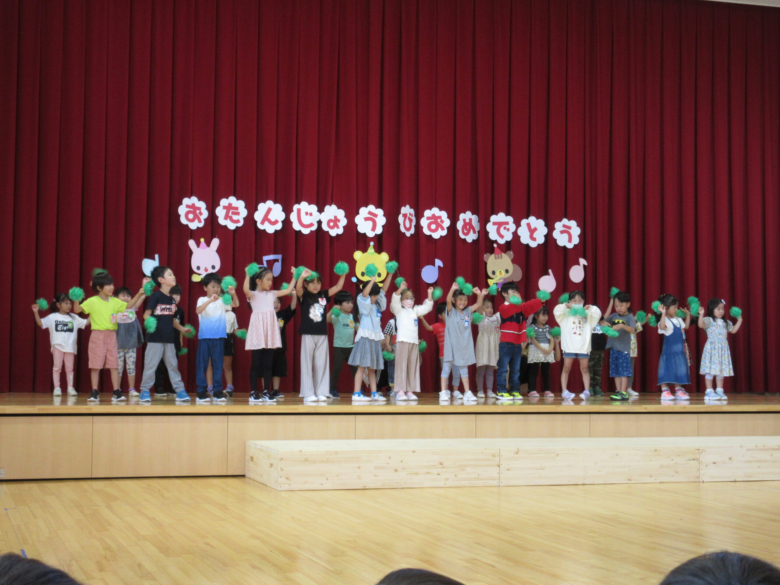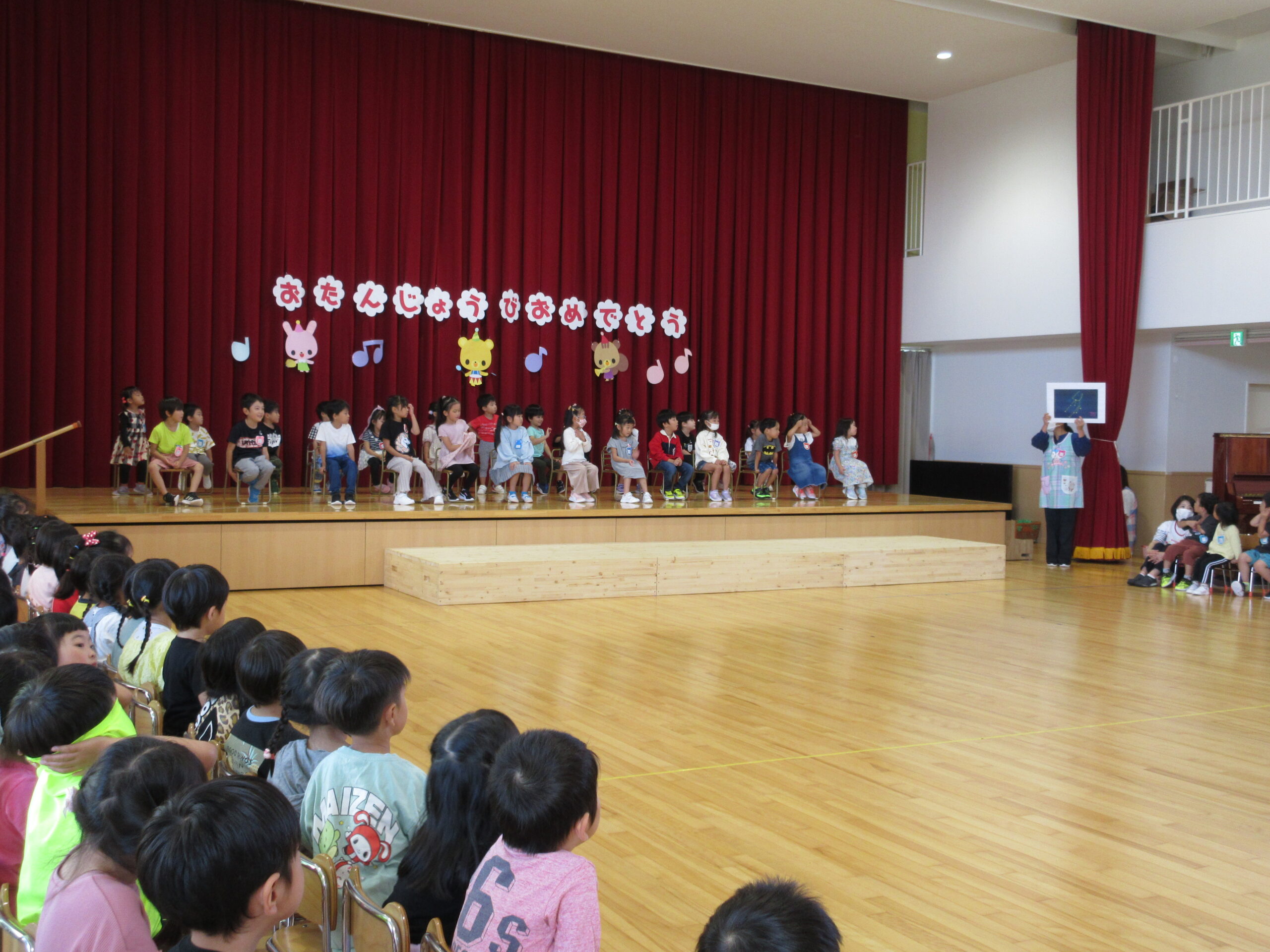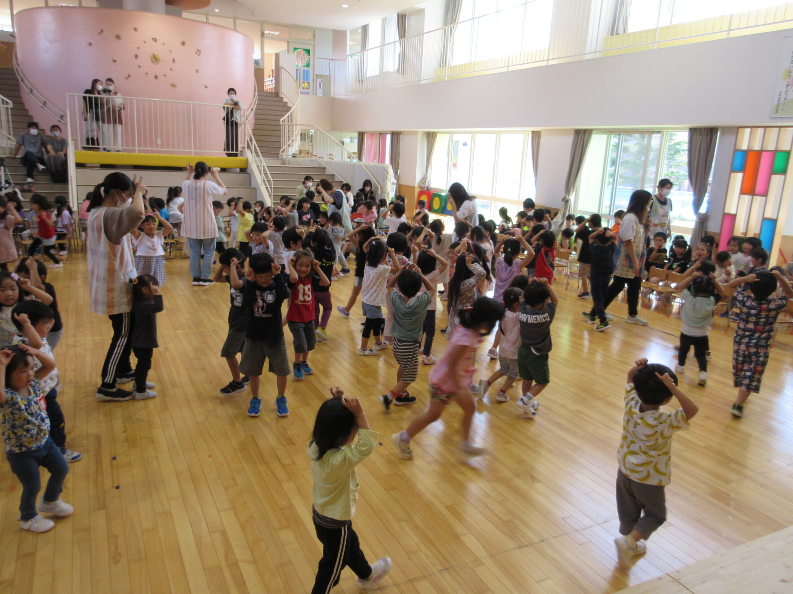 今年は格別に残暑が厳しい状況でありましたが、少しずつ過ごしやすく肌寒さも感じるようになりました。本日9月29日(金)は26名の9月生まれのお誕生会を実施しました。誕生会で披露する踊りはテンポよいサンバの踊りで楽しんで参加していました。自己紹介もみんなの前で上手に発表できました。誕生会後の「おつかいありさん」ゲームではじゃんけんの掛け声に合わせてタイミングよく理解して楽しんでいましたね。