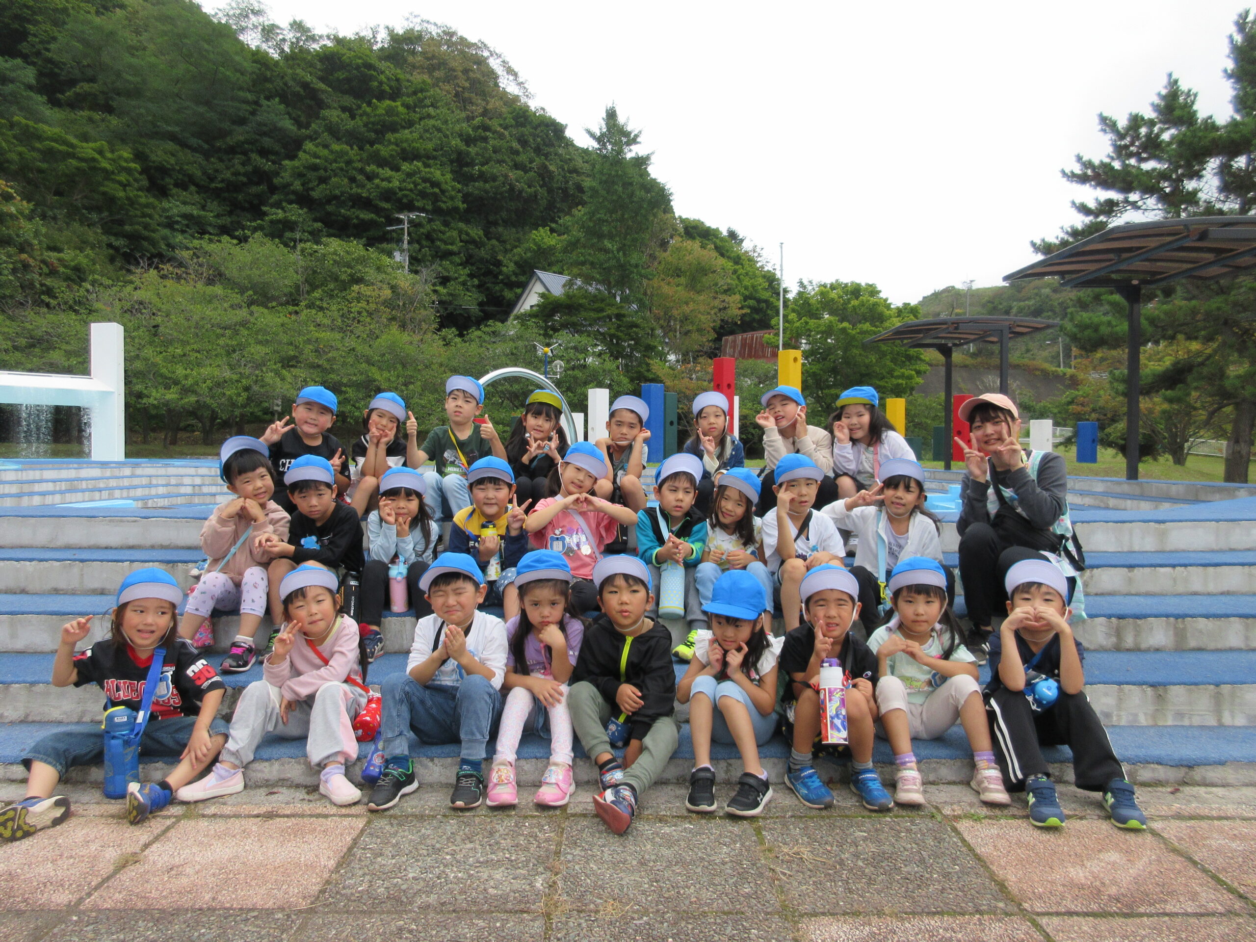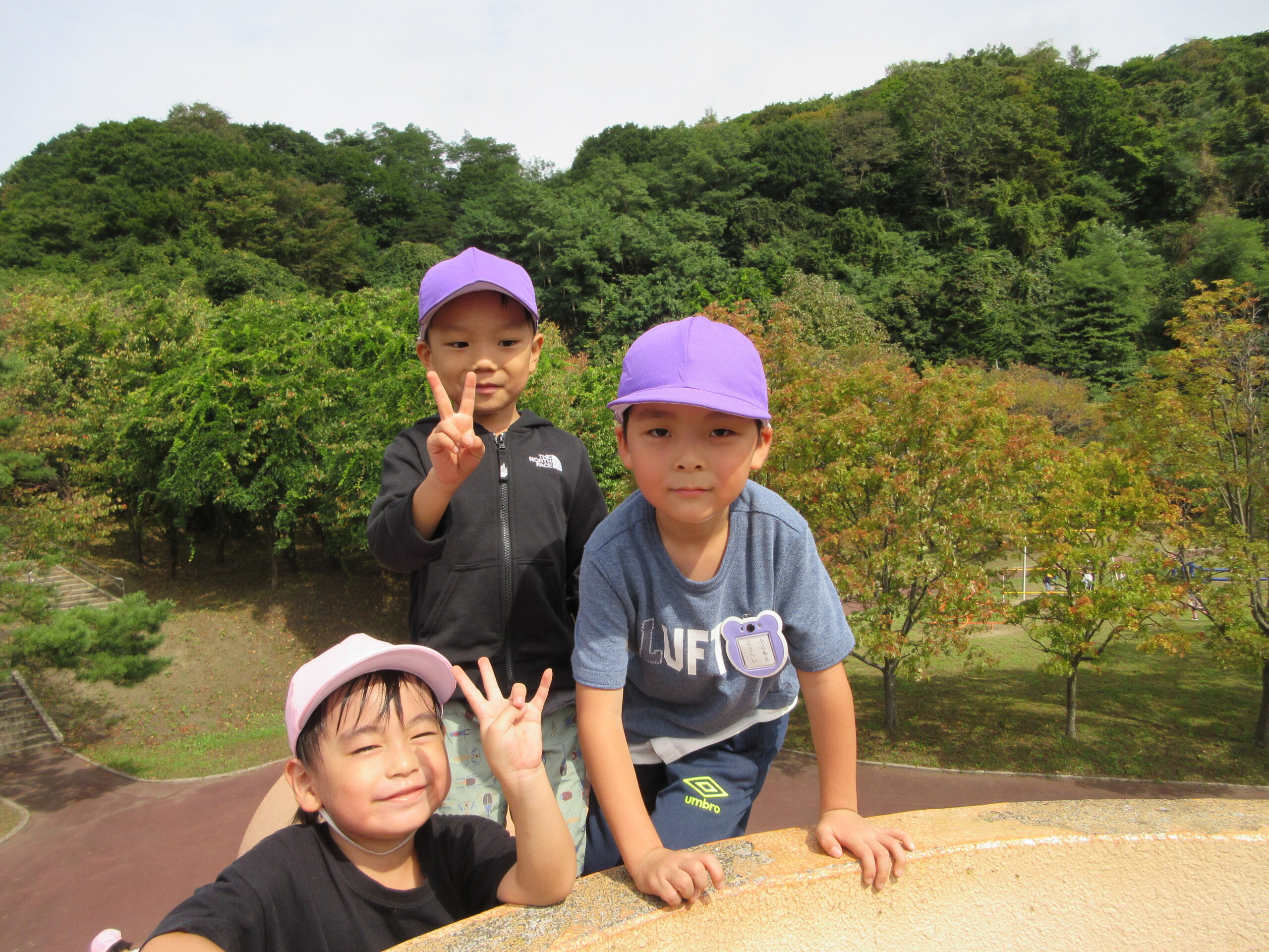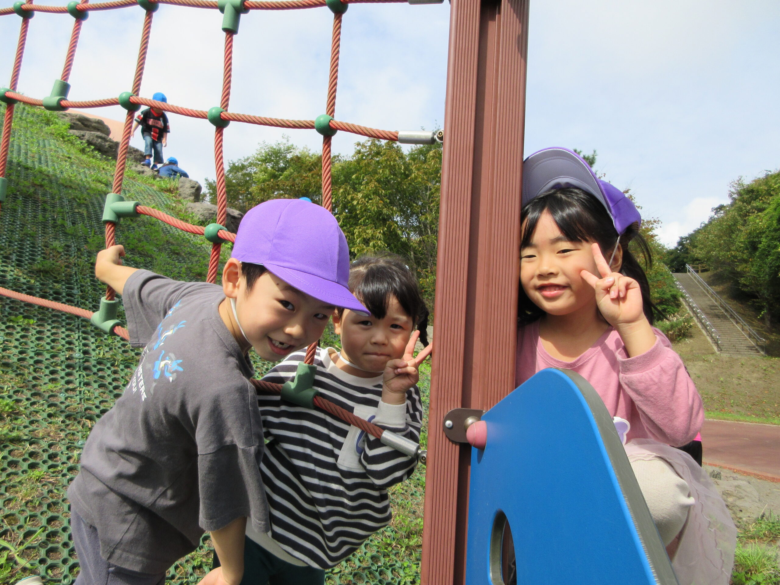 今日9月26日(火)は年長学年で入江公園まで出かけました。朝10時15分頃に園バスで幼稚園を出発して現地に着くまで子ども達は会話も弾み気持ちが高ぶっていました。現地では遊具の遊び方、決まり等のお話を聞き、ルールを守りながら遊ぶことができました。特に巨大滑り台がインパクトあり、子ども達は積極的に回数を重ねて楽しむ姿が見られました。また、途中より「清泉幼稚園」のお友だちもご一緒になり、短い時間ではありましたが交流をもつことができました。清泉幼稚園のお友だち、職員の皆様ありがとうございました。
