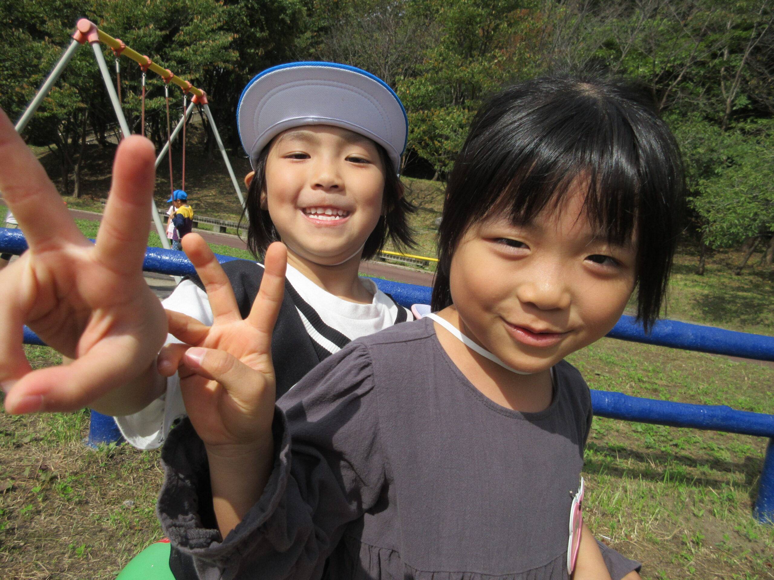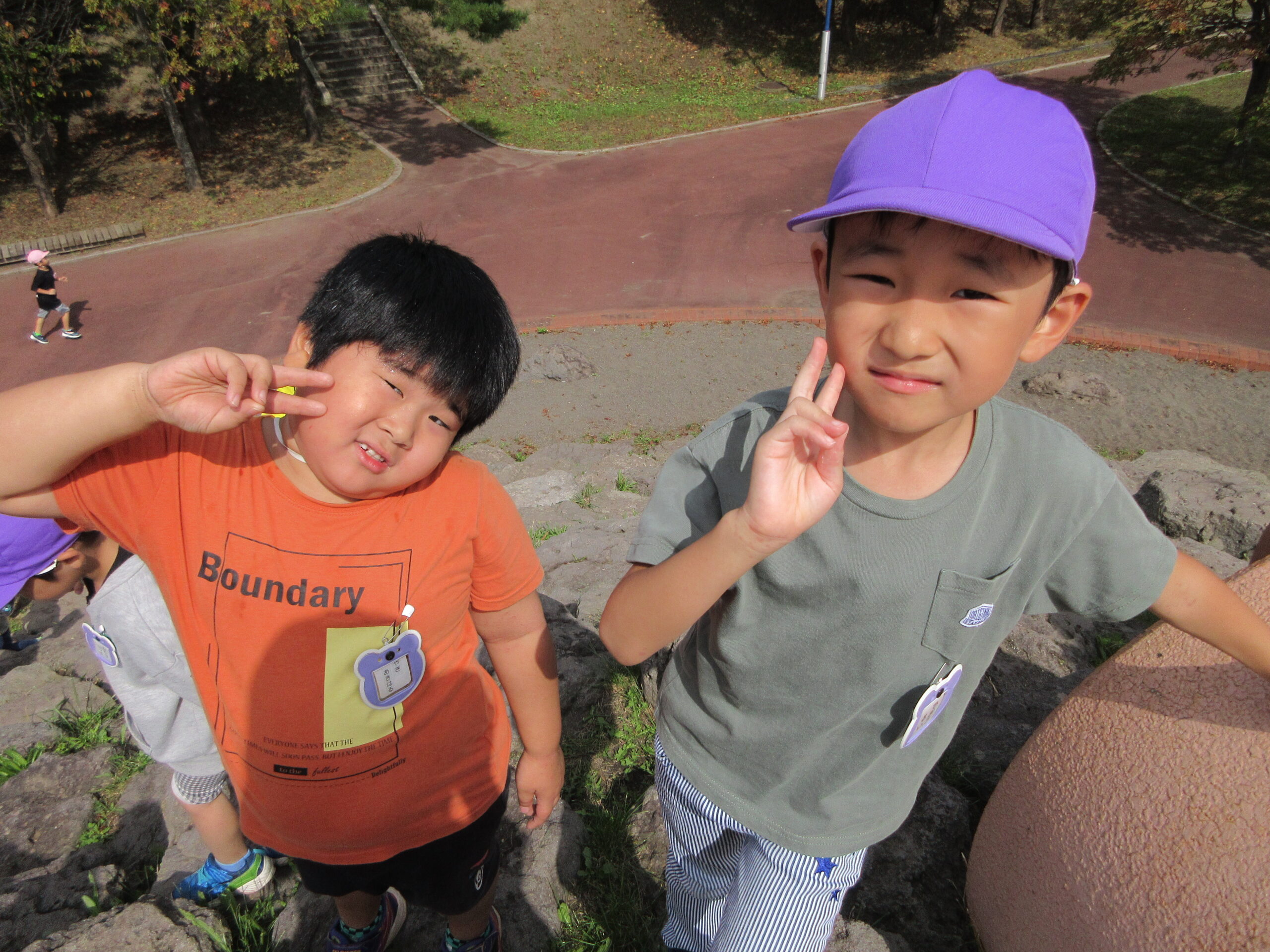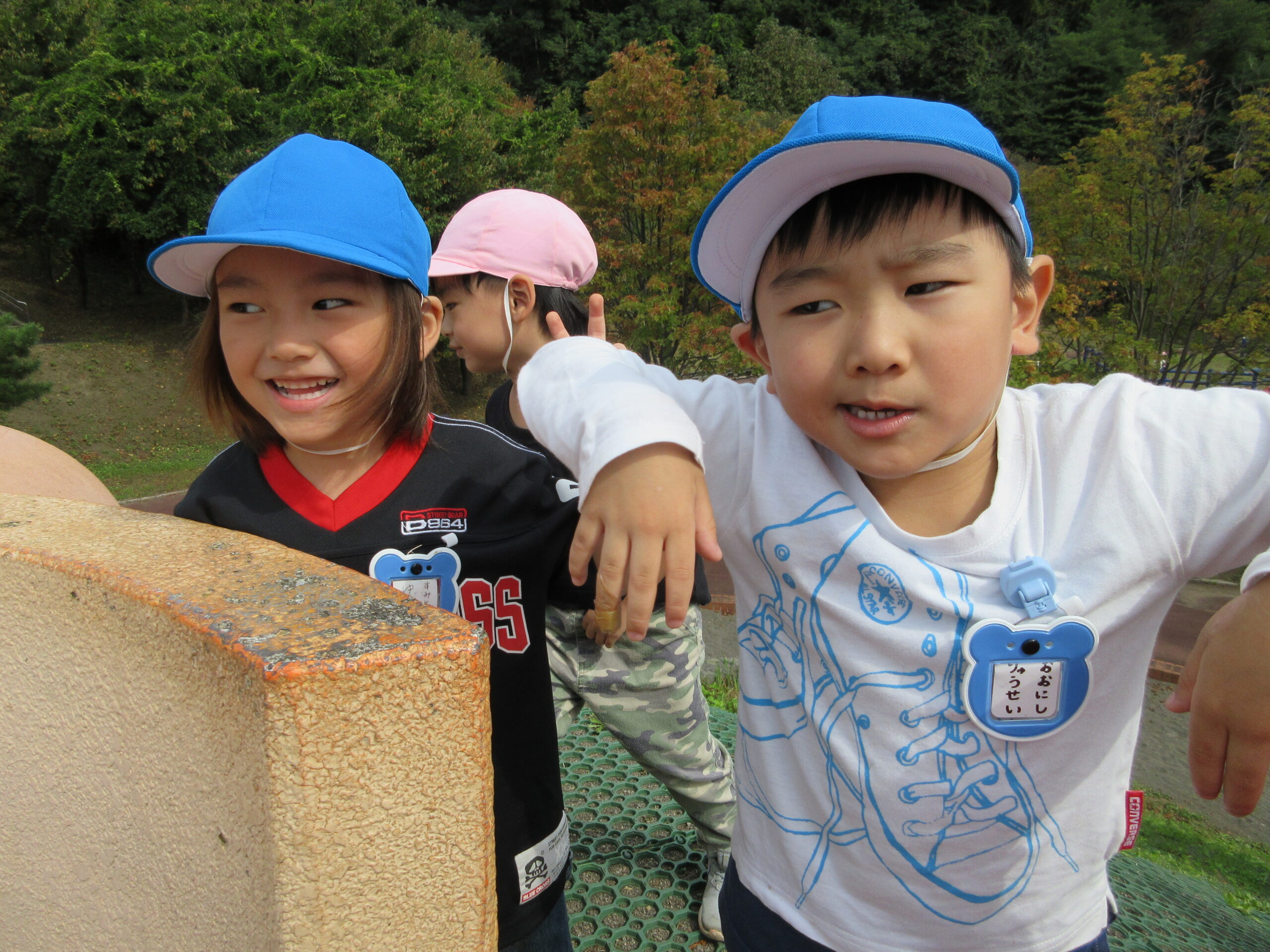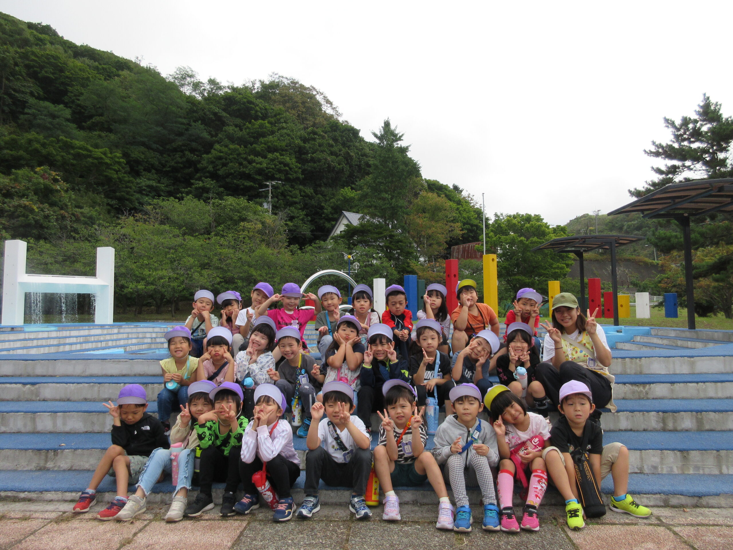 今日9月26日(火)は年長学年で入江公園まで出かけました。朝10時15分頃に園バスで幼稚園を出発して現地に着くまで子ども達は会話も弾み気持ちが高ぶっていました。現地では遊具の遊び方、決まり等のお話を聞き、ルールを守りながら遊ぶことができました。特に巨大滑り台がインパクトあり、子ども達は積極的に回数を重ねて楽しむ姿が見られました。また、途中より「清泉幼稚園」のお友だちもご一緒になり、短い時間ではありましたが交流をもつことができました。清泉幼稚園のお友だち、職員の皆様ありがとうございました。