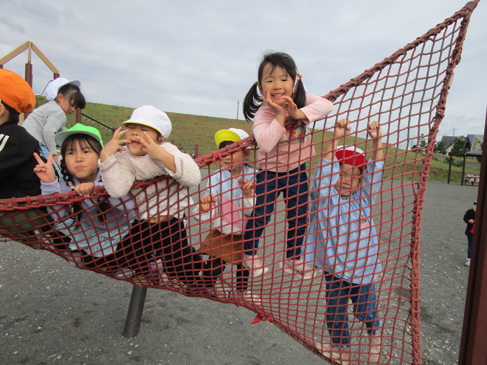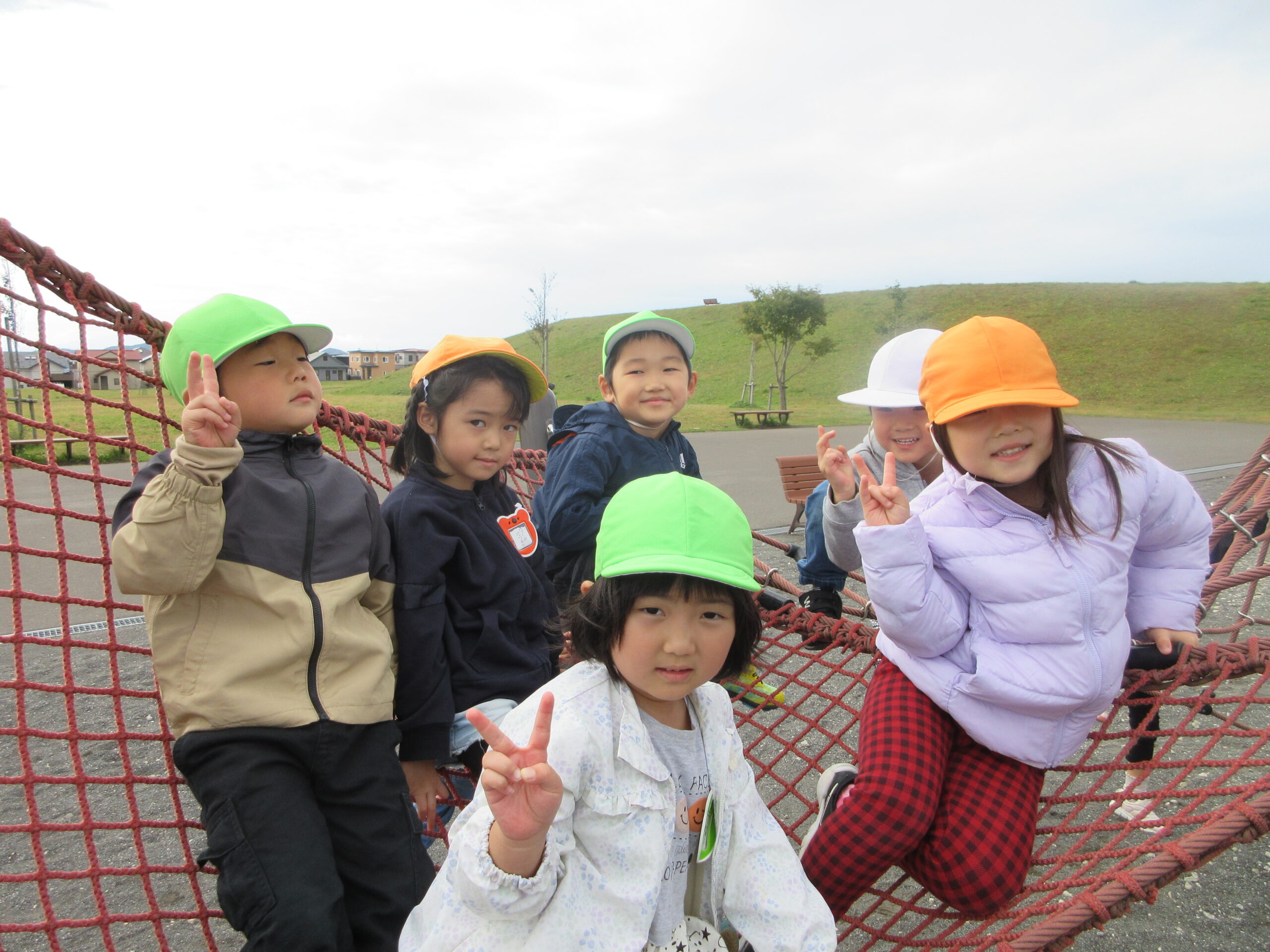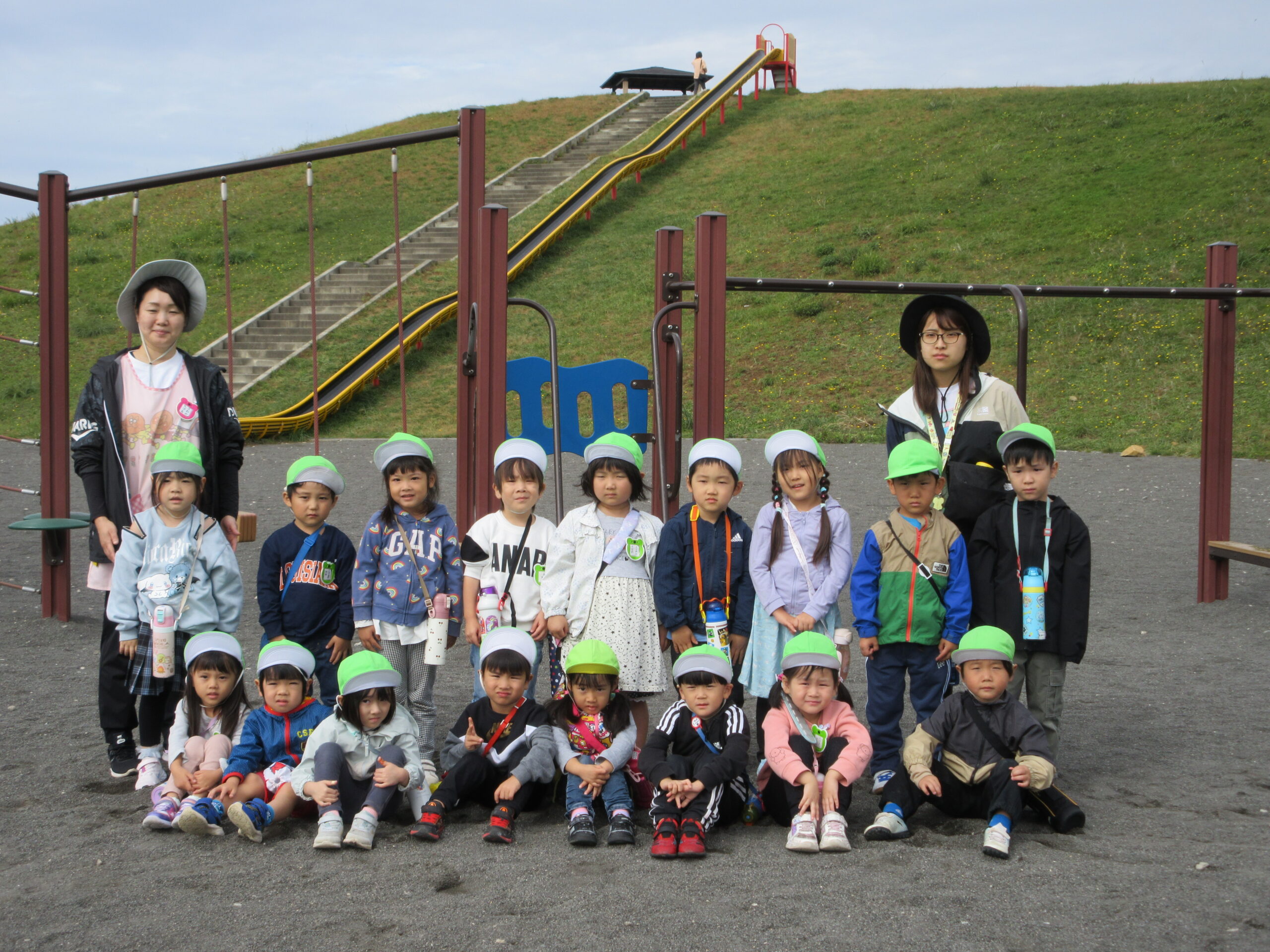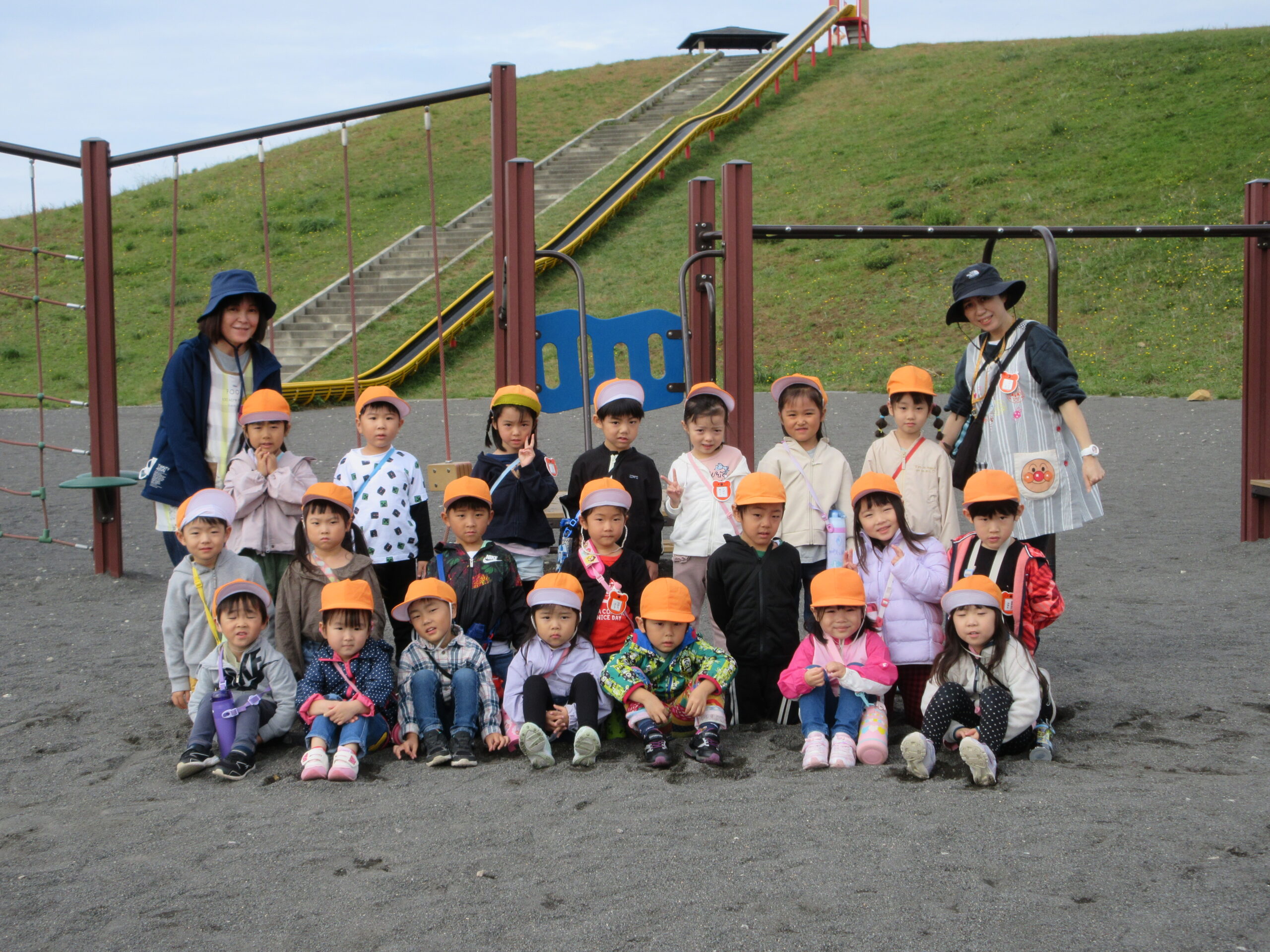 (75)令和5年度「年中学年 南公園」 2023年10月10日 園内ブログ 昨夜の雨で天候が心配でした今日10月10日(火)年中学年は南公園にお出掛けの日でした。幼稚園バスで水筒を持って10時15分に出発をしています。道中のバスの中では気持ちルンルン、現地では元気一杯楽しむ姿が見られました。広範囲で遊具に行ったり来たりする子や、同じ遊具で繰り返し遊ぶ子、砂で山を造ったり、石を積み上げたり等、学年で充実した時間を過ごすことができました。