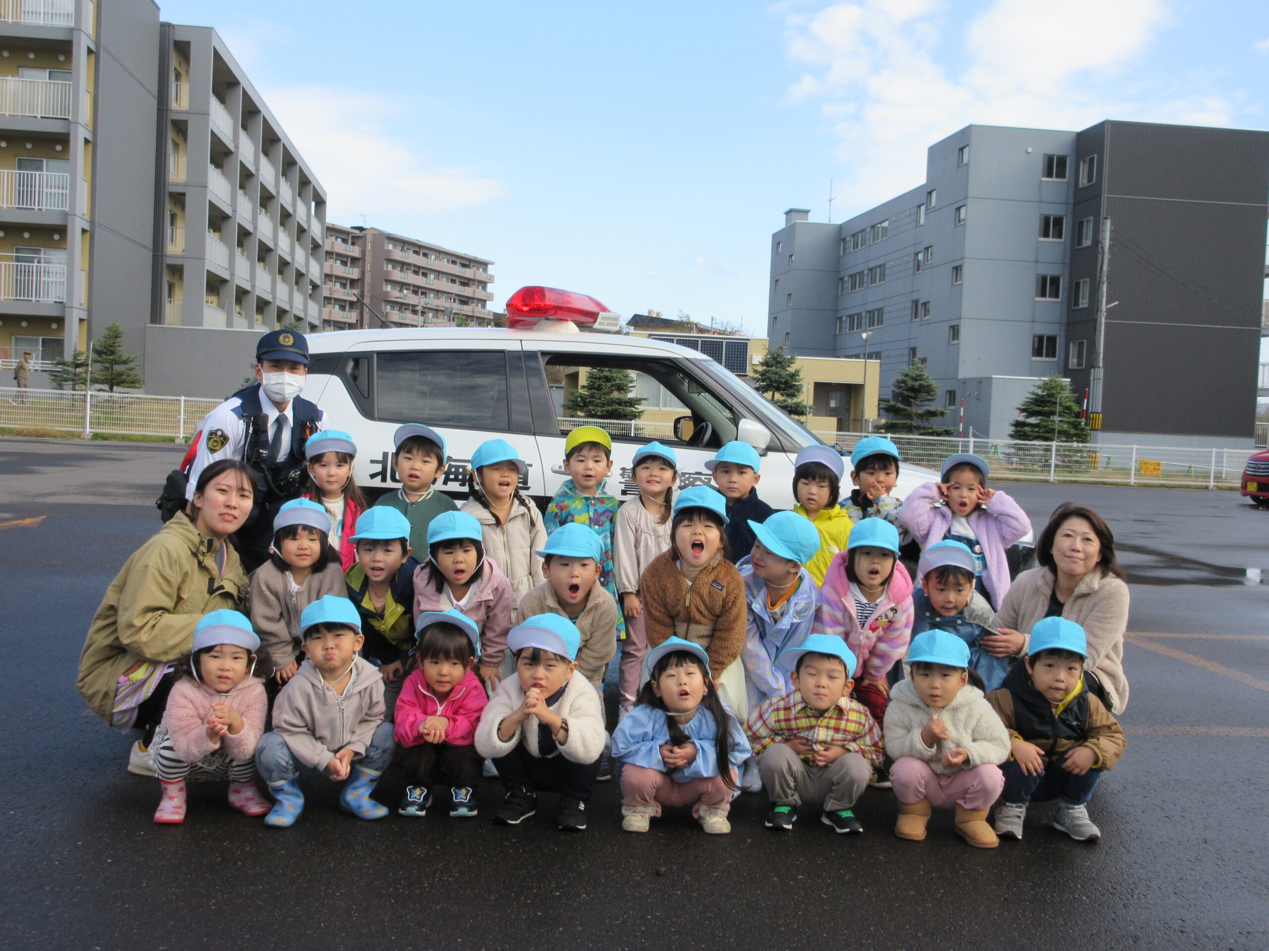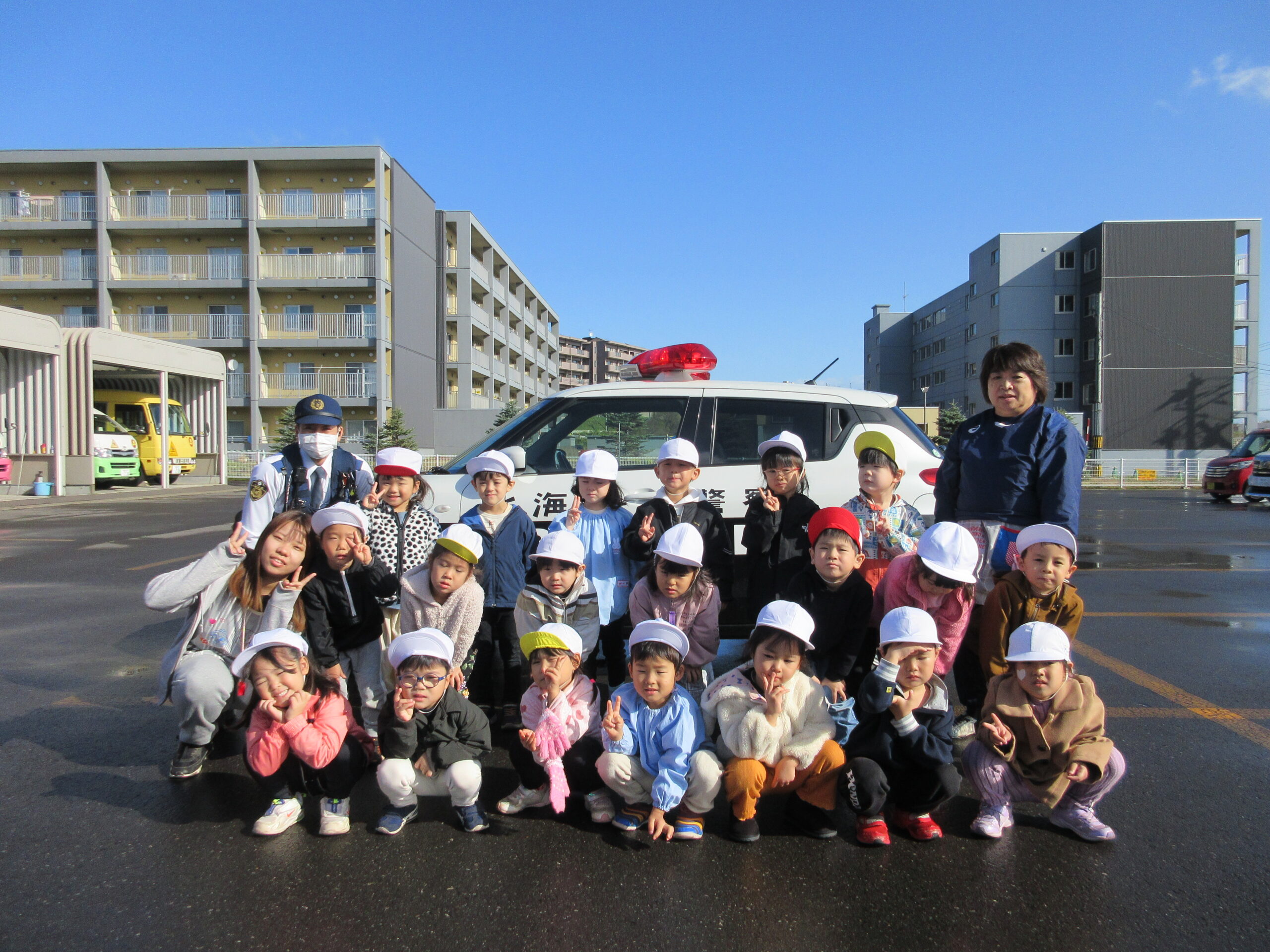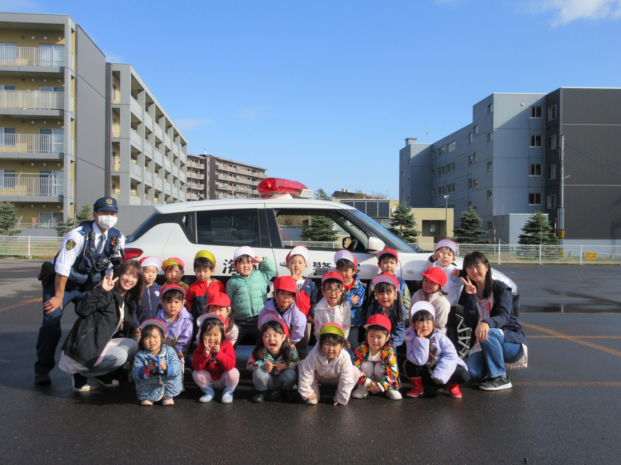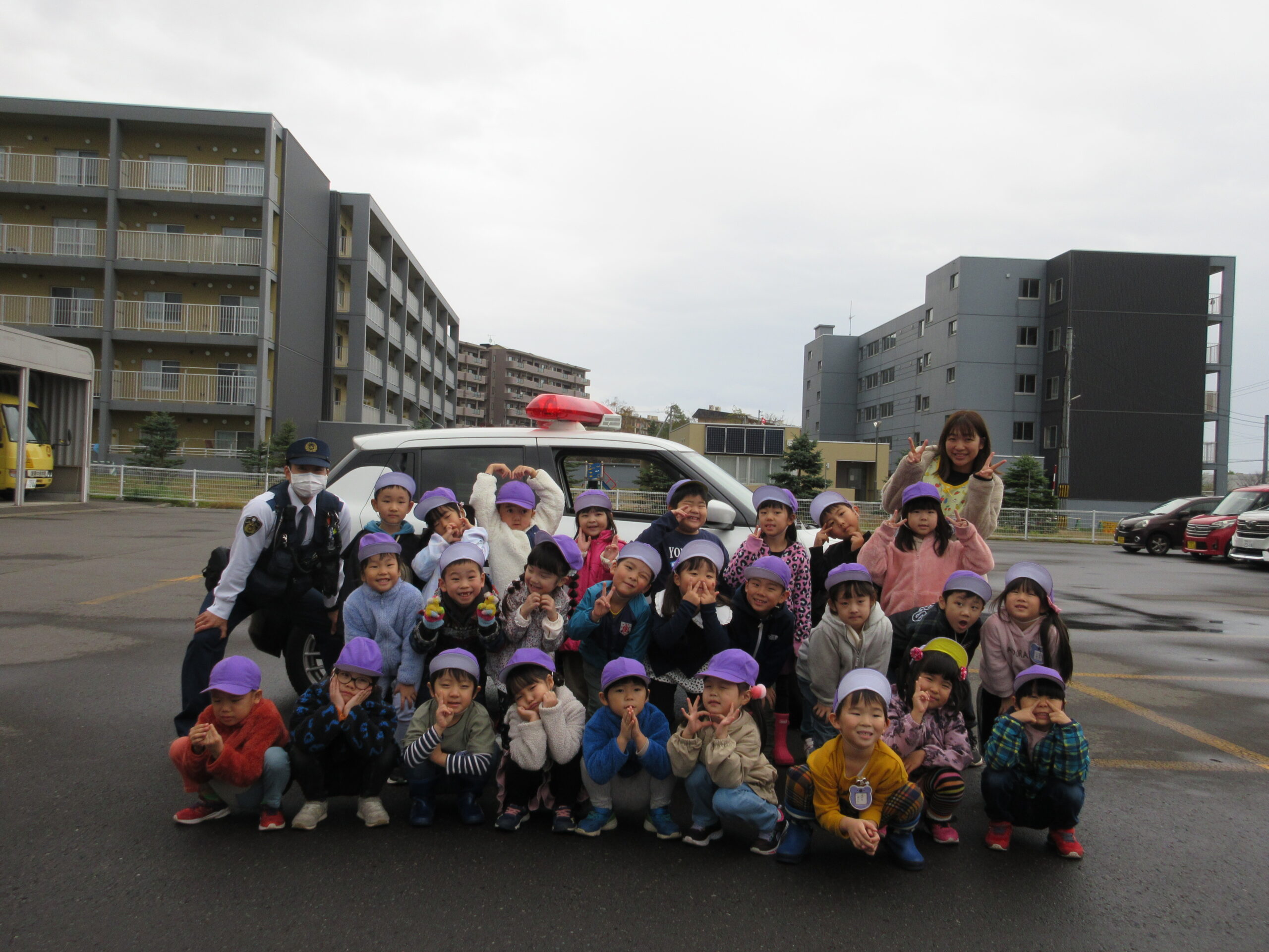 本日11月7日(火)室蘭警察署の方々が来園し防犯指導をして頂きました。昨年から警察署のお世話になり実施しております防犯指導学習は、警察署の方の来園とパトカー見学に子ども達の気持ちが高ぶり、少々緊張気味でありました。悪天候の為、パトカー🚔見学を心配しておりましたが無事に終えることが出来子ども達は大満足です。子ども達には紙芝居を通して「いかのおすし」を大変わかりやすく真剣な眼差しでの学習となりました。貴重なお話をして頂き室蘭警察署の皆様有難うございました。