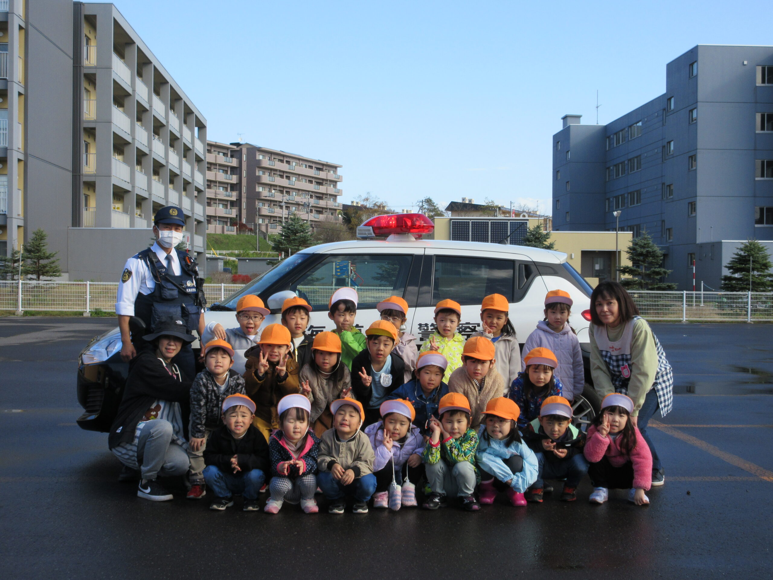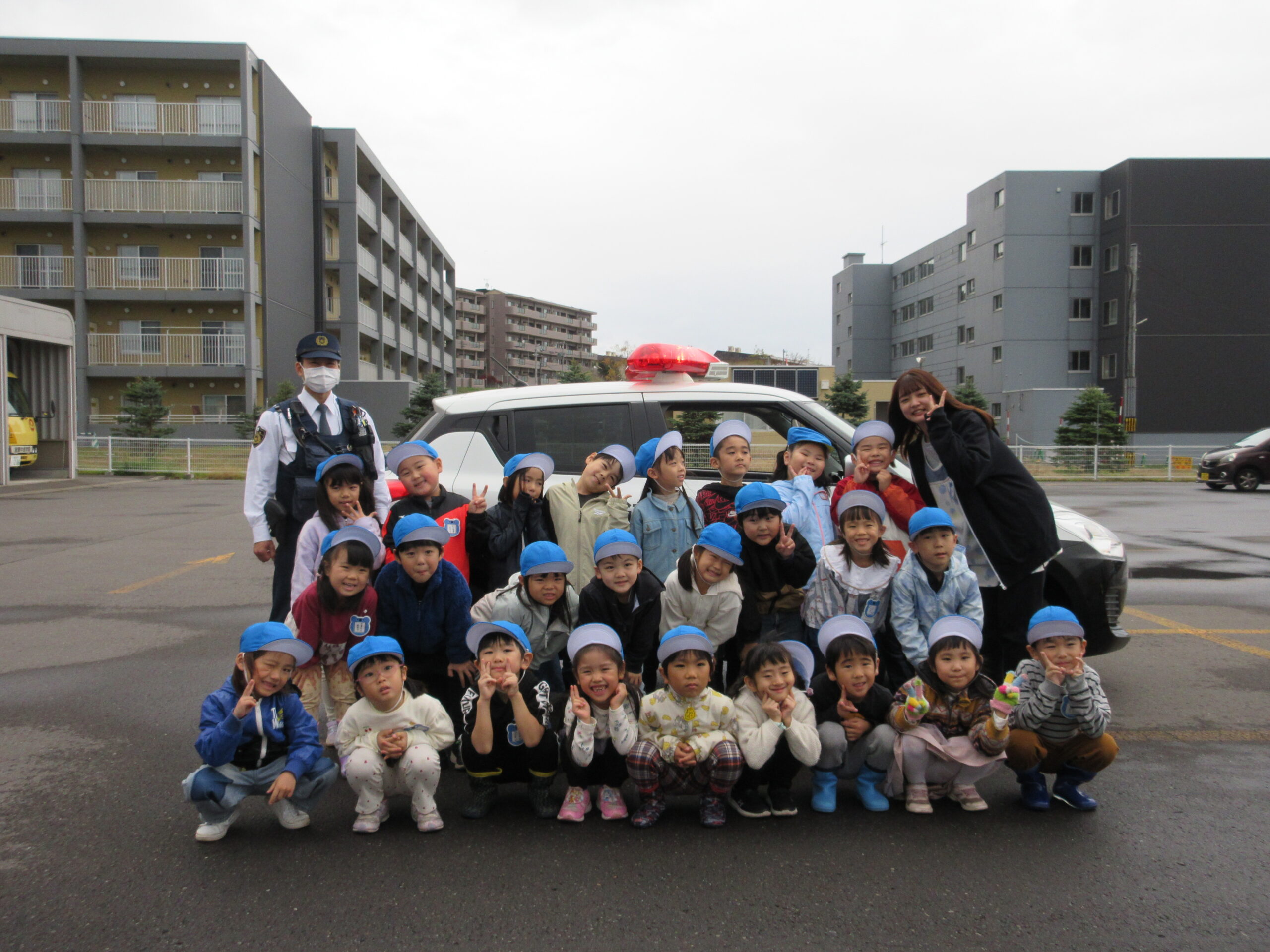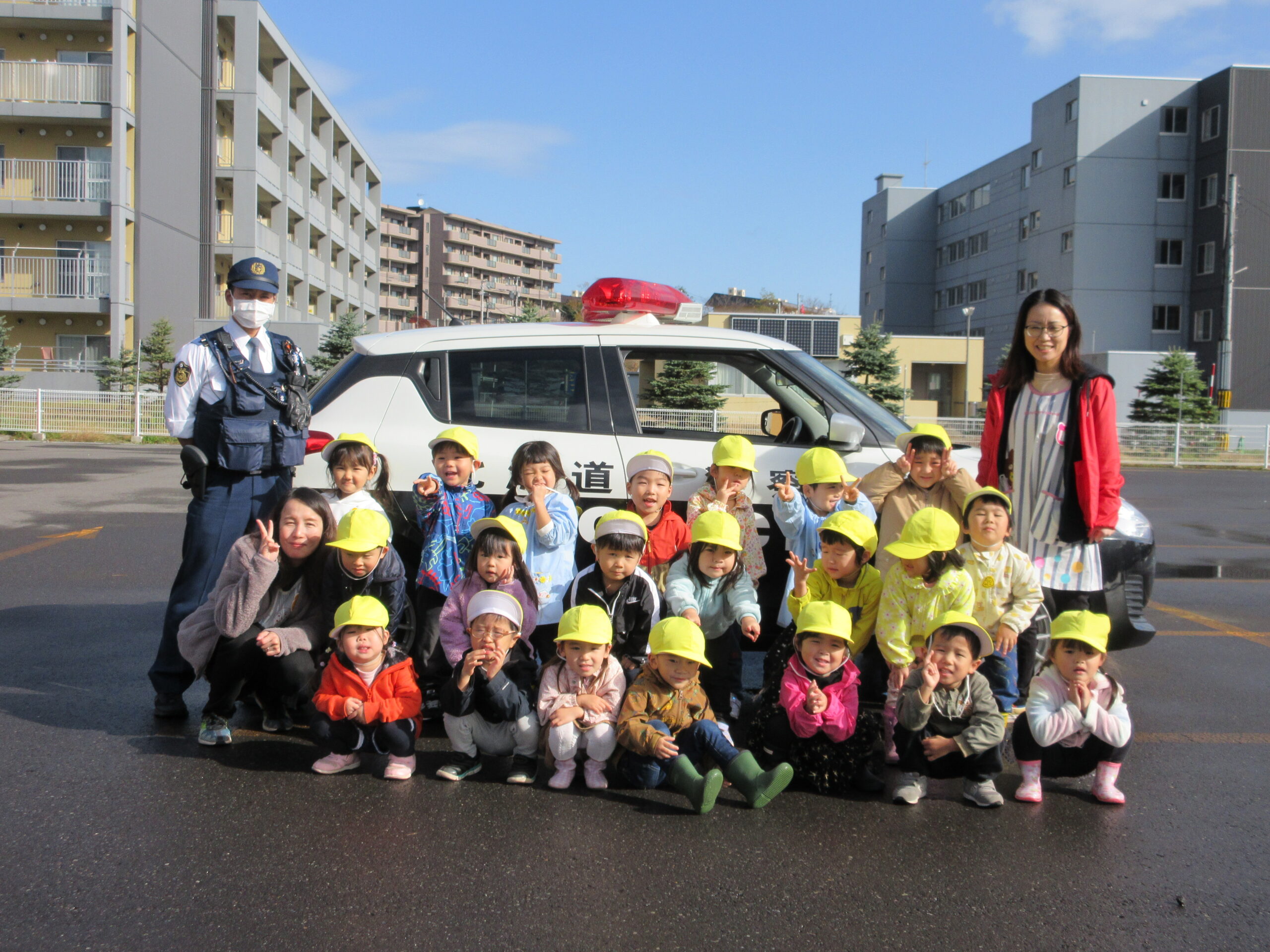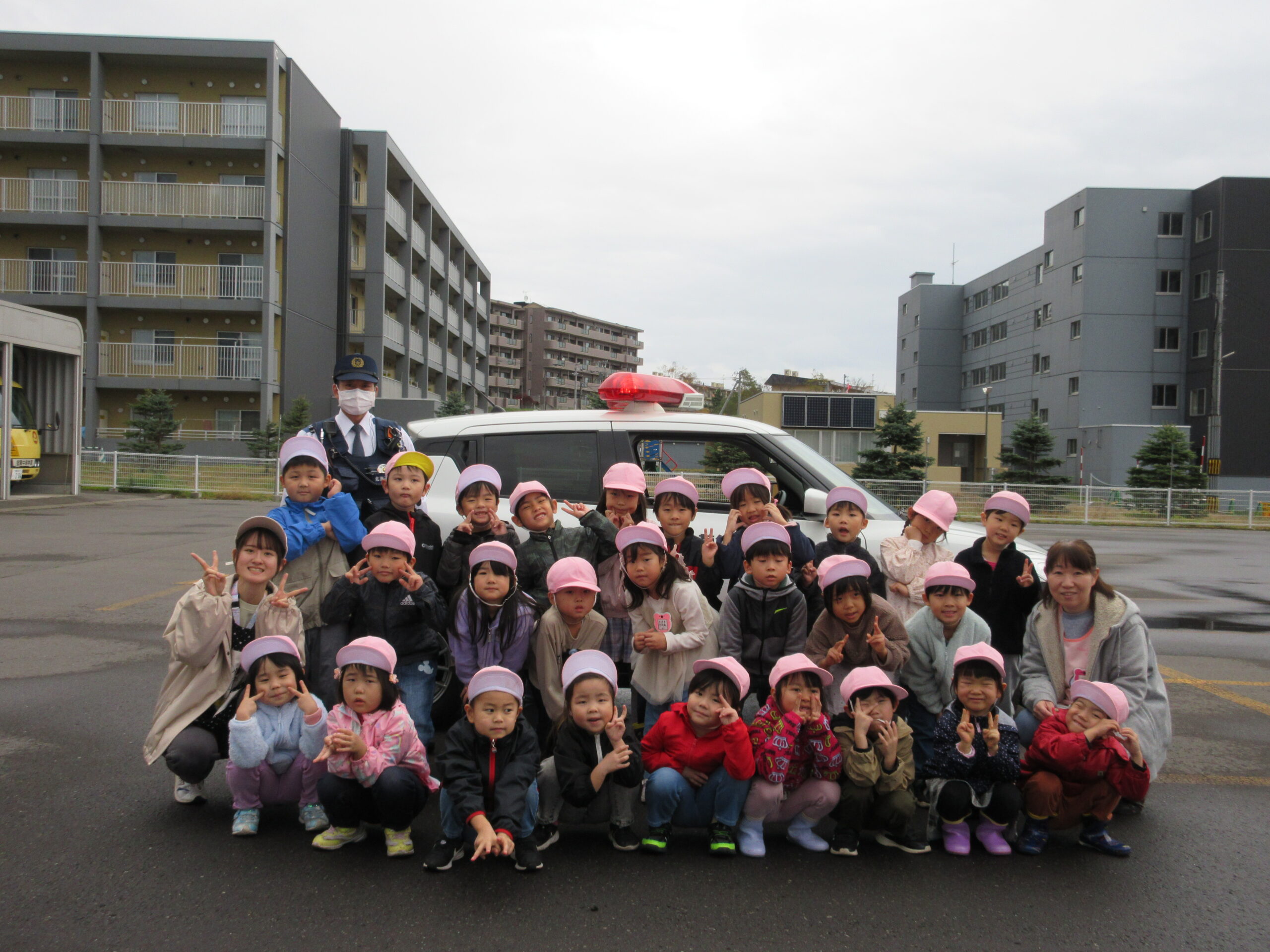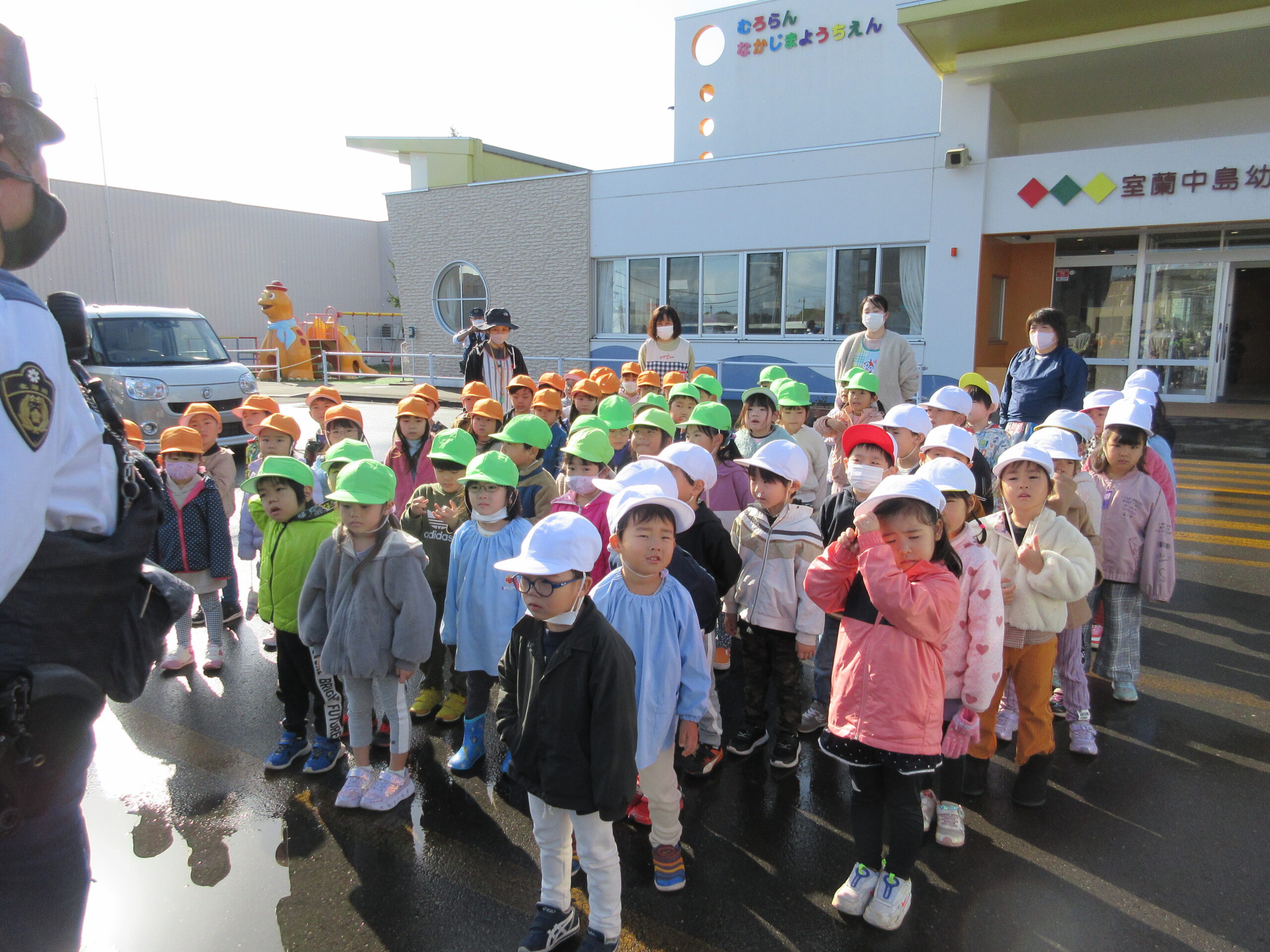本日11月7日(火)室蘭警察署の方々が来園し防犯指導をして頂きました。昨年から警察署のお世話になり実施しております防犯指導学習は、警察署の方の来園とパトカー見学に子ども達の気持ちが高ぶり、少々緊張気味でありました。悪天候の為、パトカー🚔見学を心配しておりましたが無事に終えることが出来子ども達は大満足です。子ども達には紙芝居を通して「いかのおすし」を大変わかりやすく真剣な眼差しでの学習となりました。貴重なお話をして頂き室蘭警察署の皆様有難うございました。