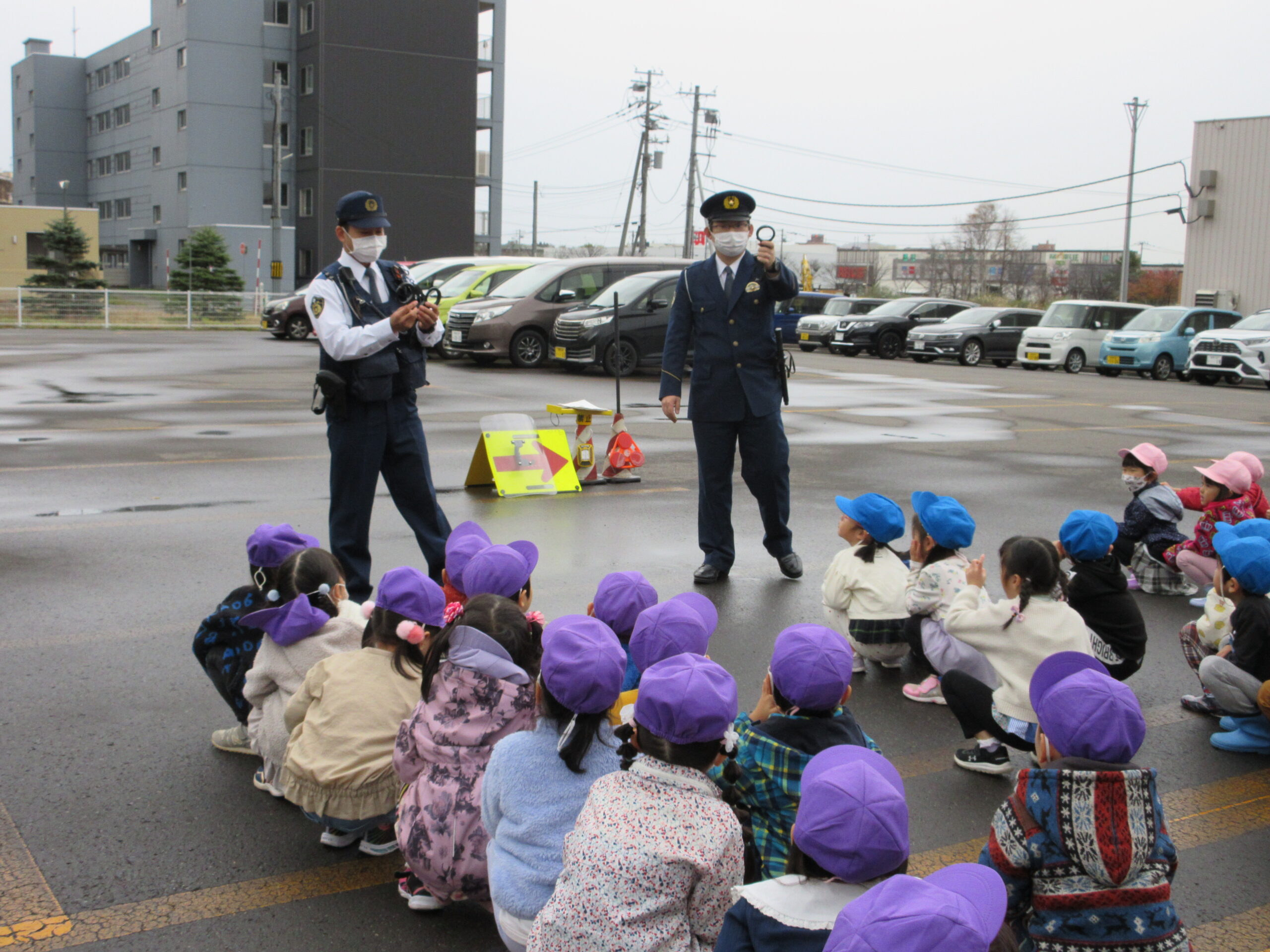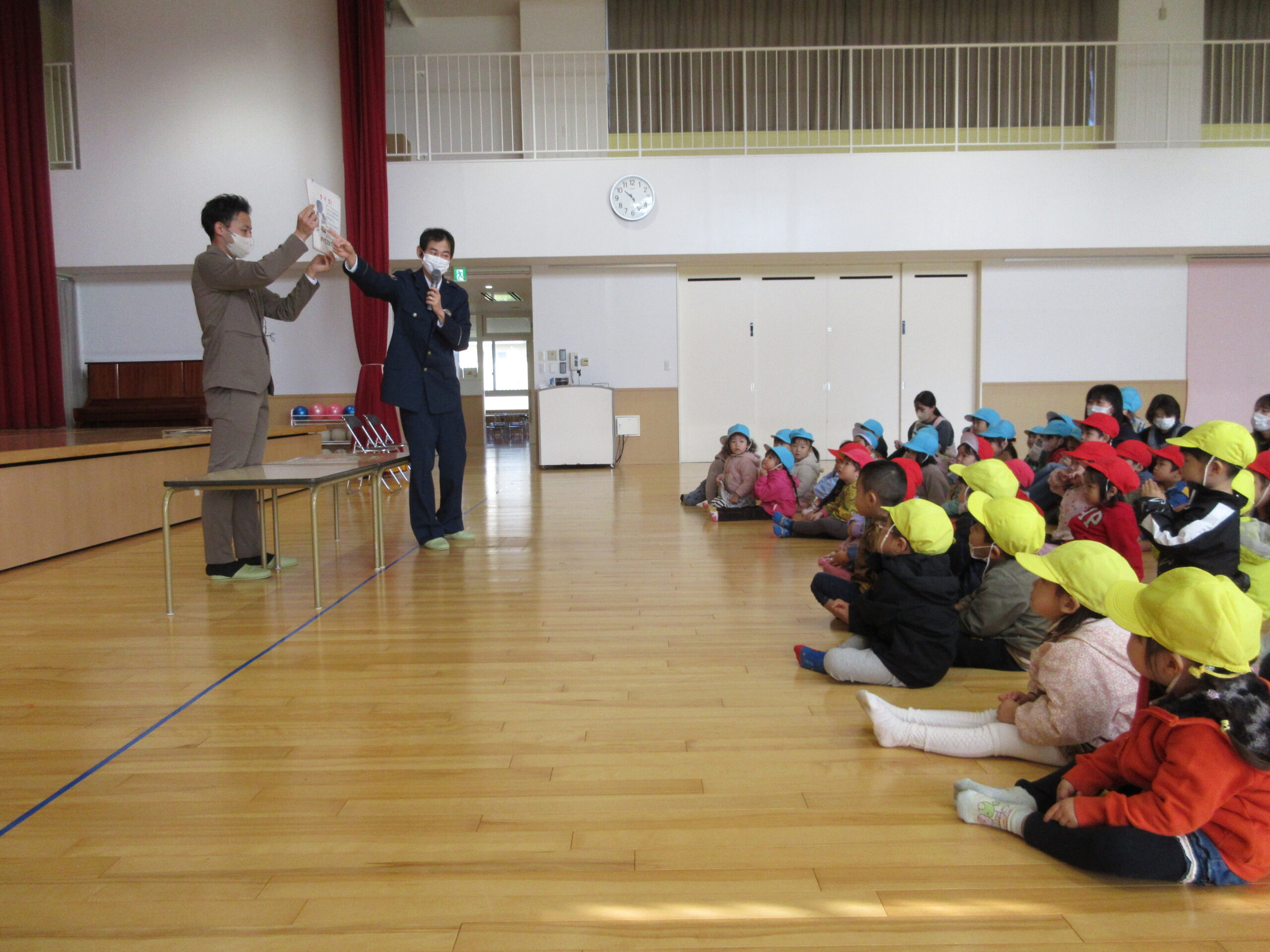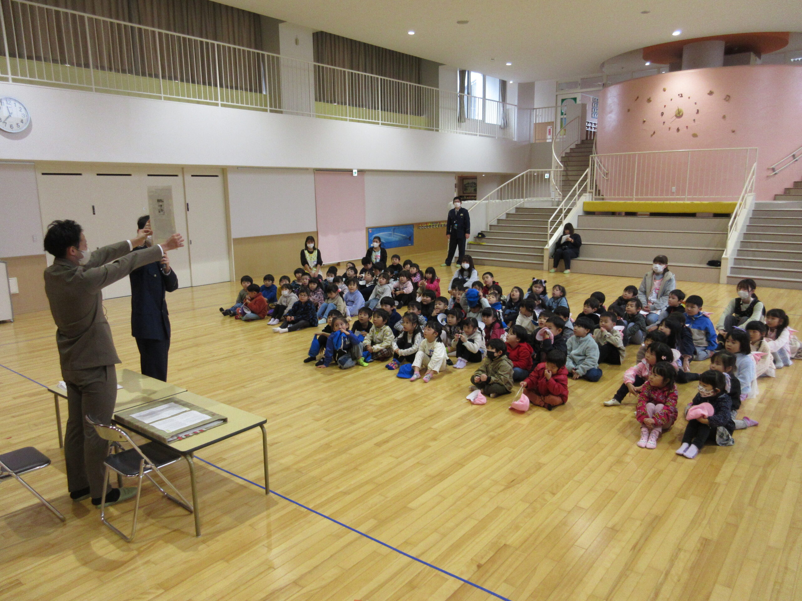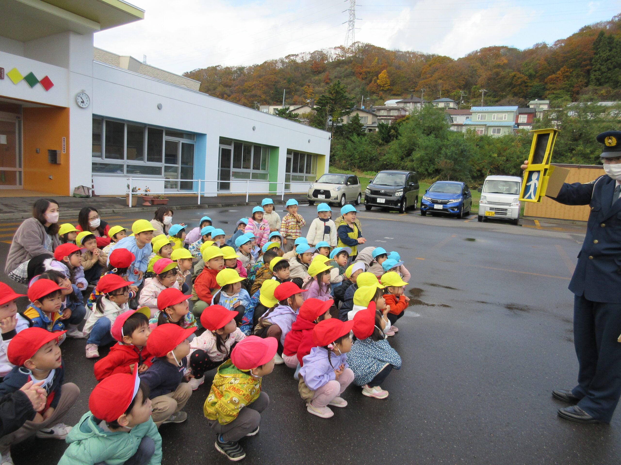 本日11月7日(火)室蘭警察署の方々が来園し防犯指導をして頂きました。昨年から警察署のお世話になり実施しております防犯指導学習は、警察署の方の来園とパトカー見学に子ども達の気持ちが高ぶり、少々緊張気味でありました。悪天候の為、パトカー🚔見学を心配しておりましたが無事に終えることが出来子ども達は大満足です。子ども達には紙芝居を通して「いかのおすし」を大変わかりやすく真剣な眼差しでの学習となりました。貴重なお話をして頂き室蘭警察署の皆様有難うございました。