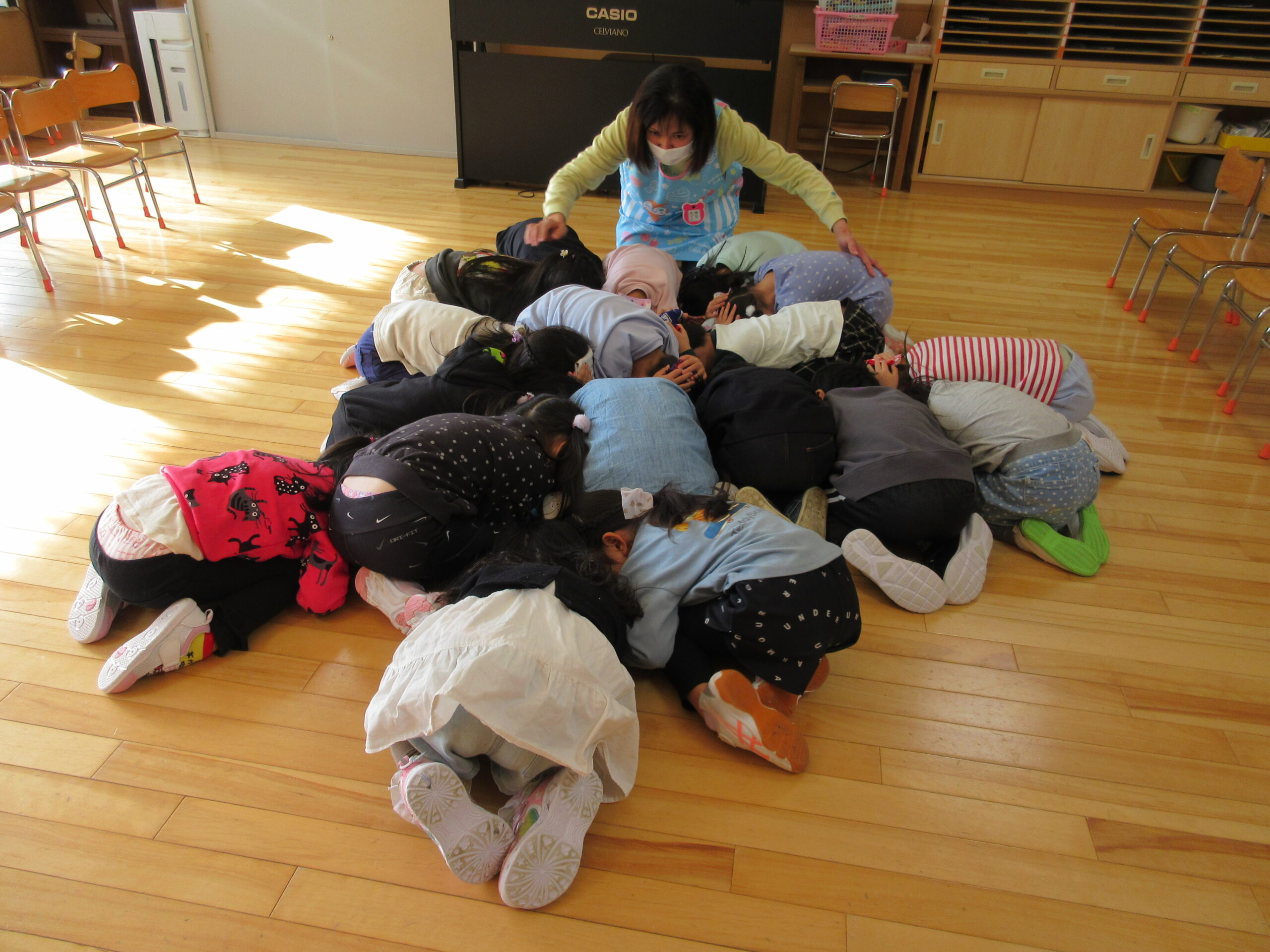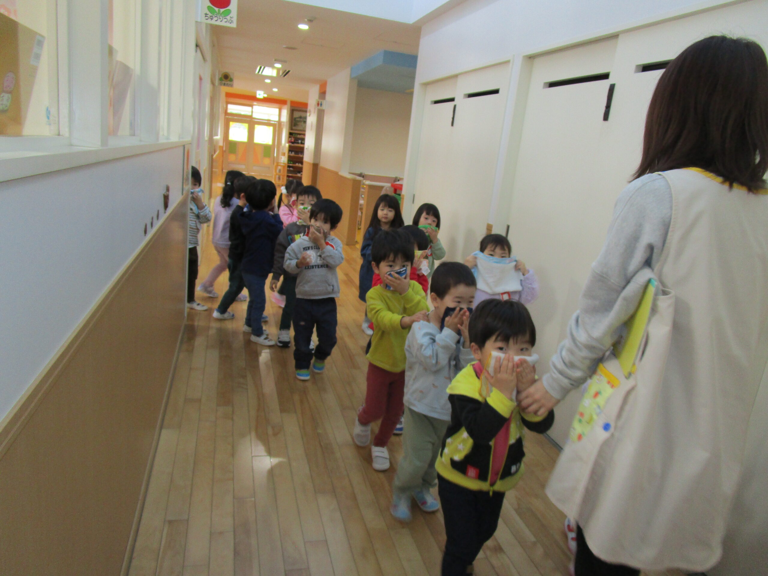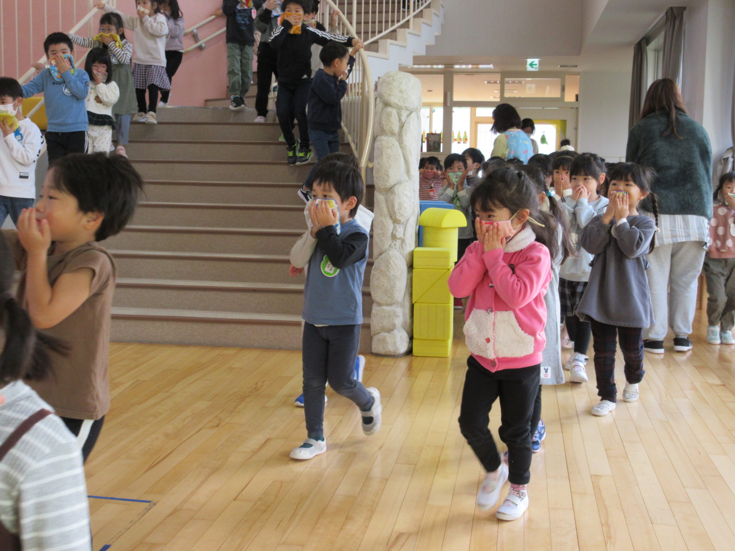 10月6日に行われる避難訓練でありましたが暴風で休園となったことで延期となり、今日11月24日(金)に避難訓練を実施しました。雨天の為、この度は地震発生から火災であることで子ども達は地震での避難・続いて火災での避難を行いました。ホールに避難した子ども達はスムーズに素早く行動することができていました。担任の指示で口にハンカチをあてながらお約束は「お・は・し・も」で理解し取り組みました。