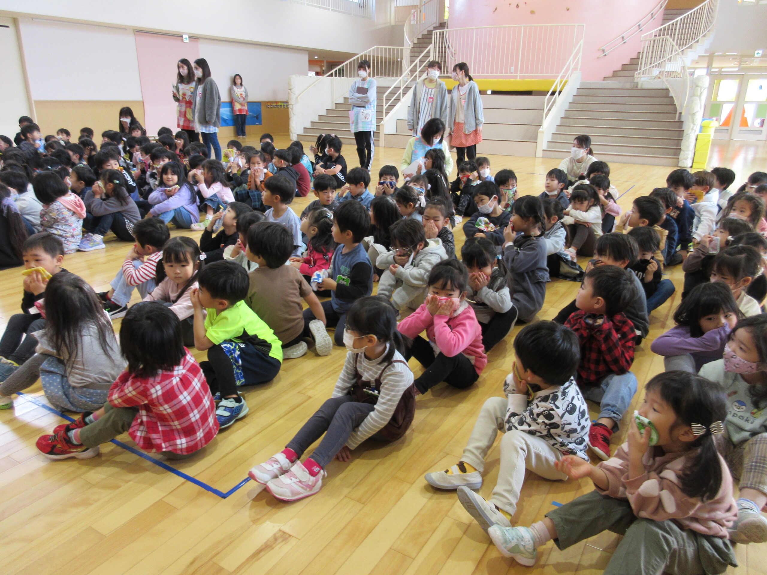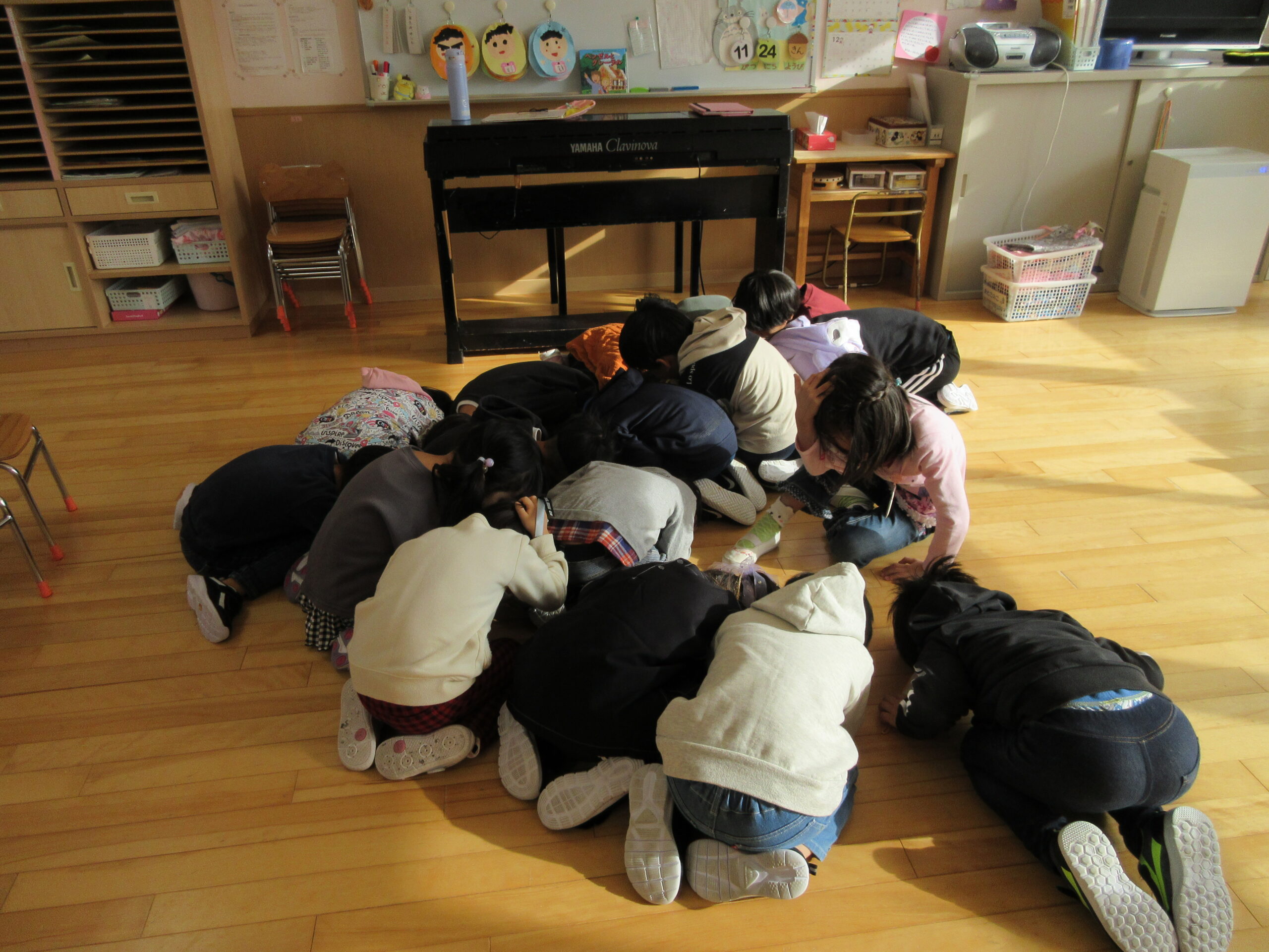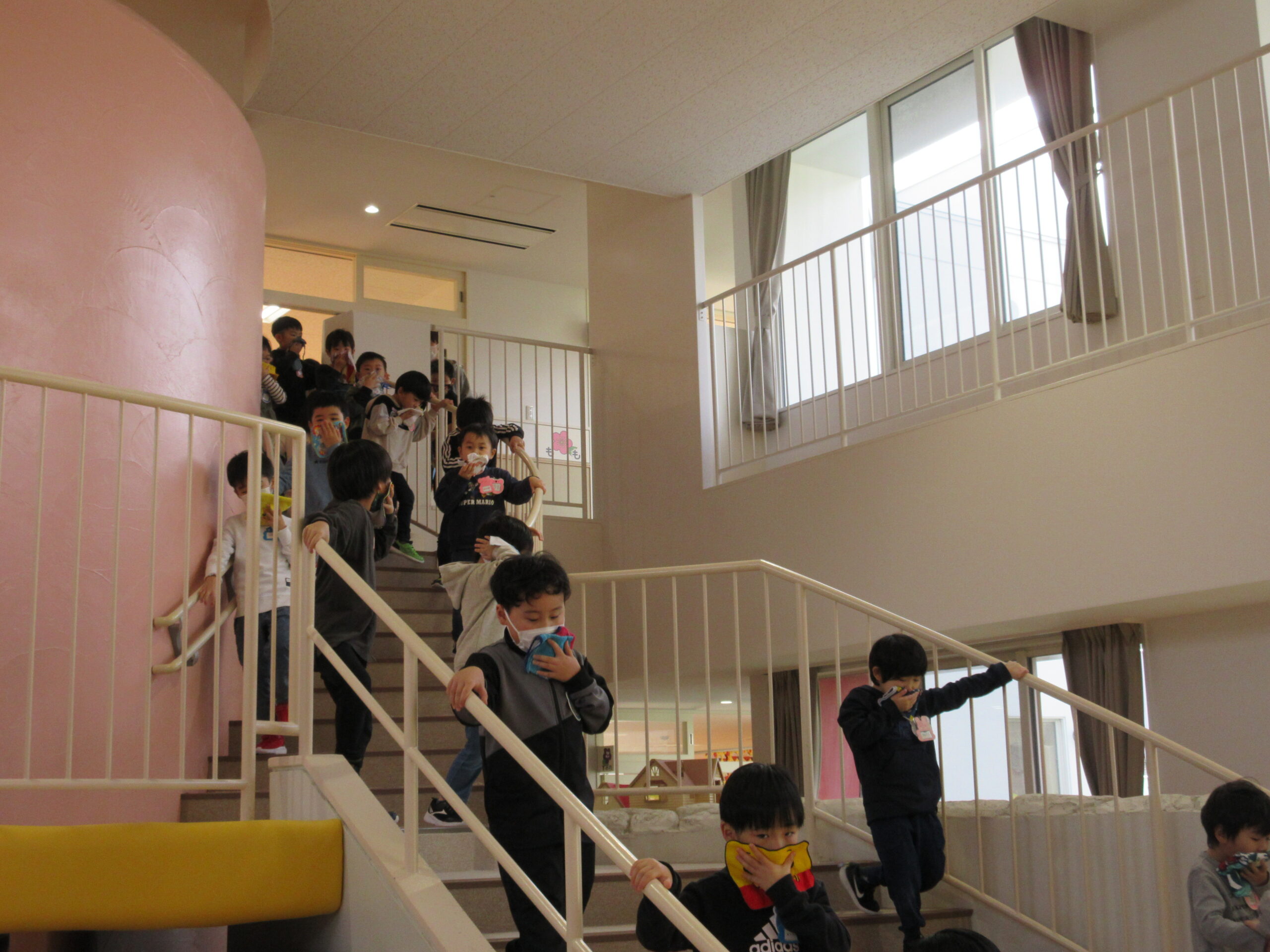10月6日に行われる避難訓練でありましたが暴風で休園となったことで延期となり、今日11月24日(金)に避難訓練を実施しました。雨天の為、この度は地震発生から火災であることで子ども達は地震での避難・続いて火災での避難を行いました。ホールに避難した子ども達はスムーズに素早く行動することができていました。担任の指示で口にハンカチをあてながらお約束は「お・は・し・も」で理解し取り組みました。