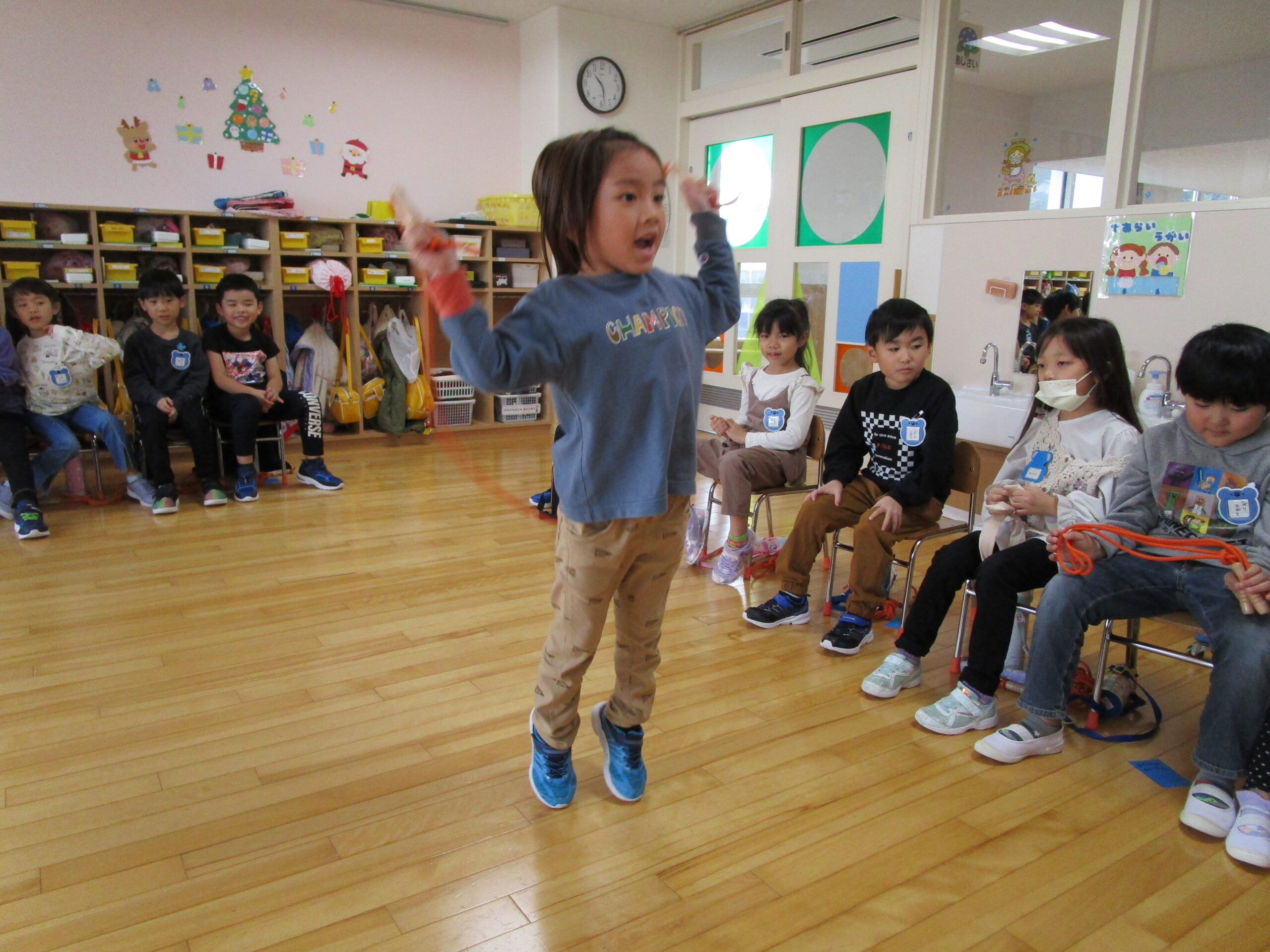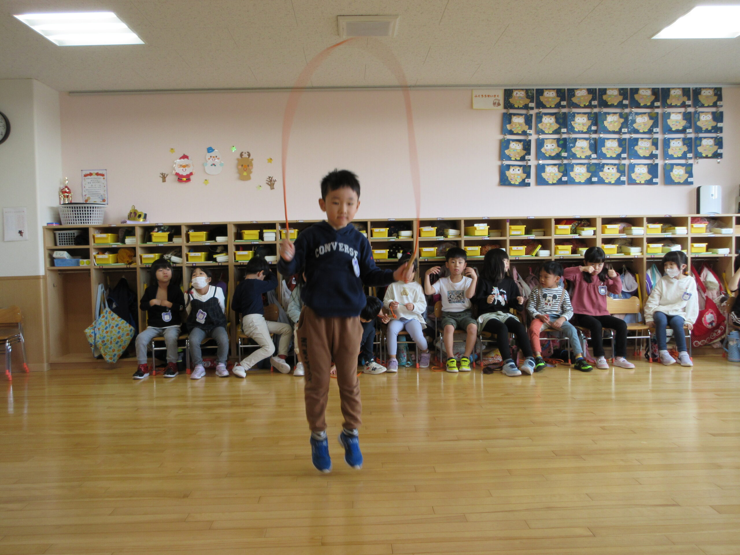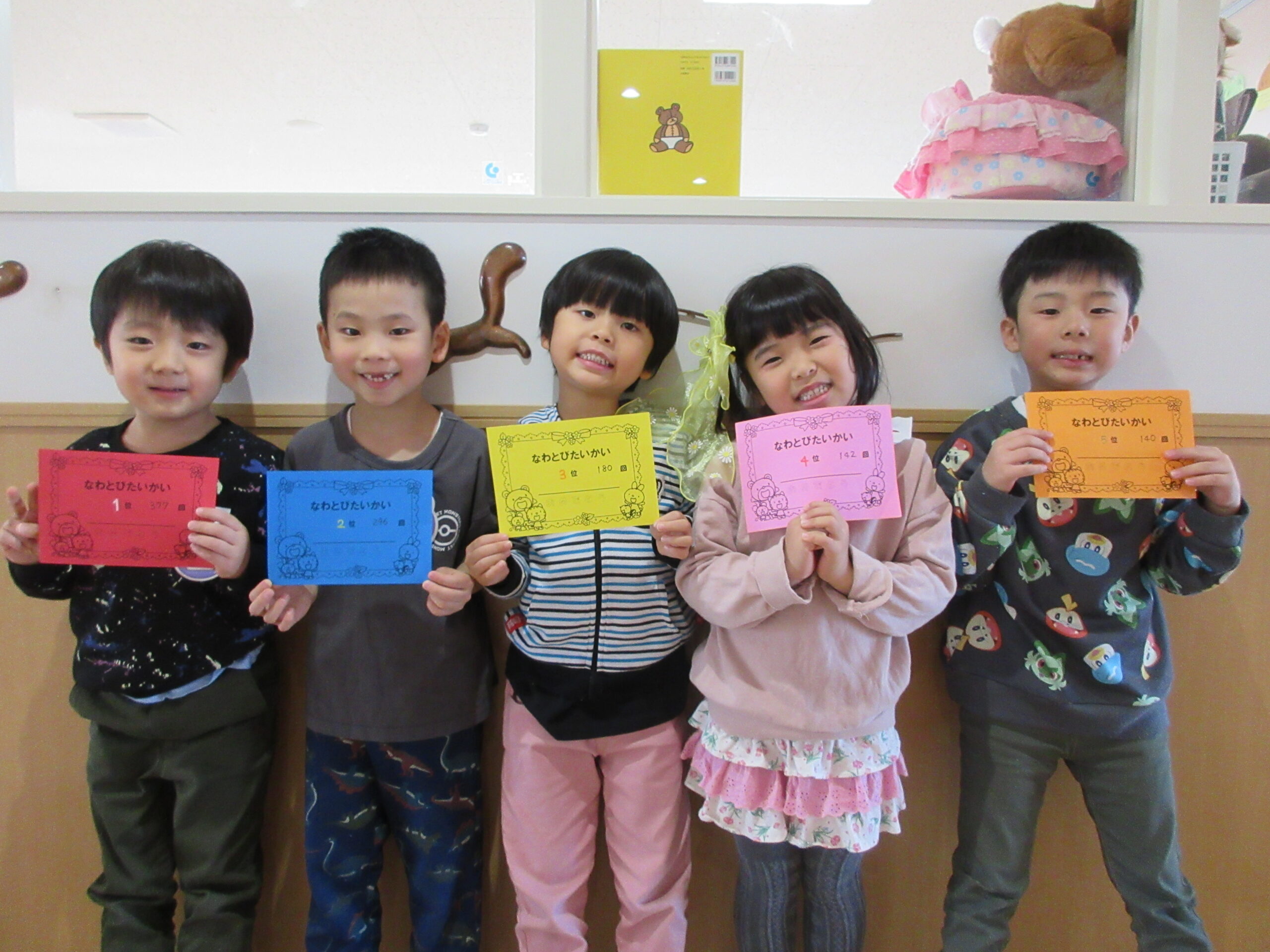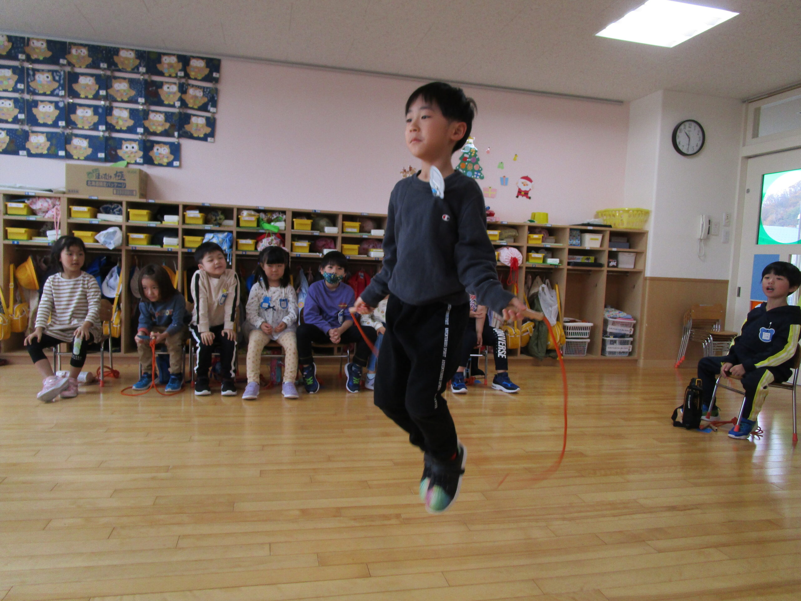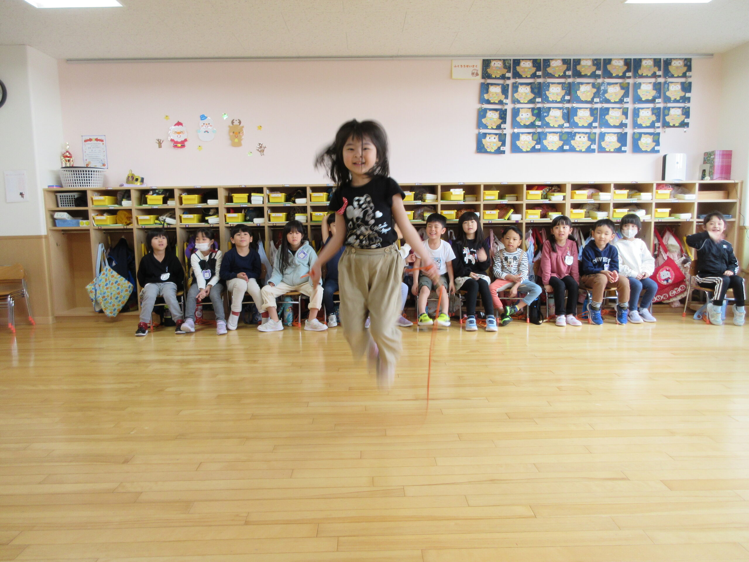 本日は、クラス毎にお部屋での縄跳び大会でした。久しぶりの縄跳び大会にワクワクしているお友達や、「すごくドキドキする」と緊張している様子も見られました。お友達の一生懸命な姿を応援したり、「一緒に頑張ろうね!」と励ます姿もありました。回を重ねる毎に練習の成果が表れ「前よりもたくさん跳べた!」と自信が付き嬉しそうな表情も見られました。次回はホールでの縄跳び大会になりますので、諦めない気持ちを持って取り組みたいと思います