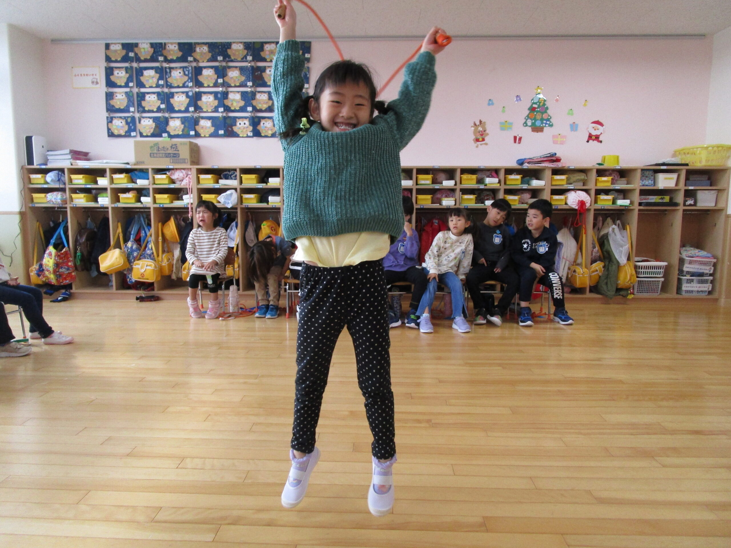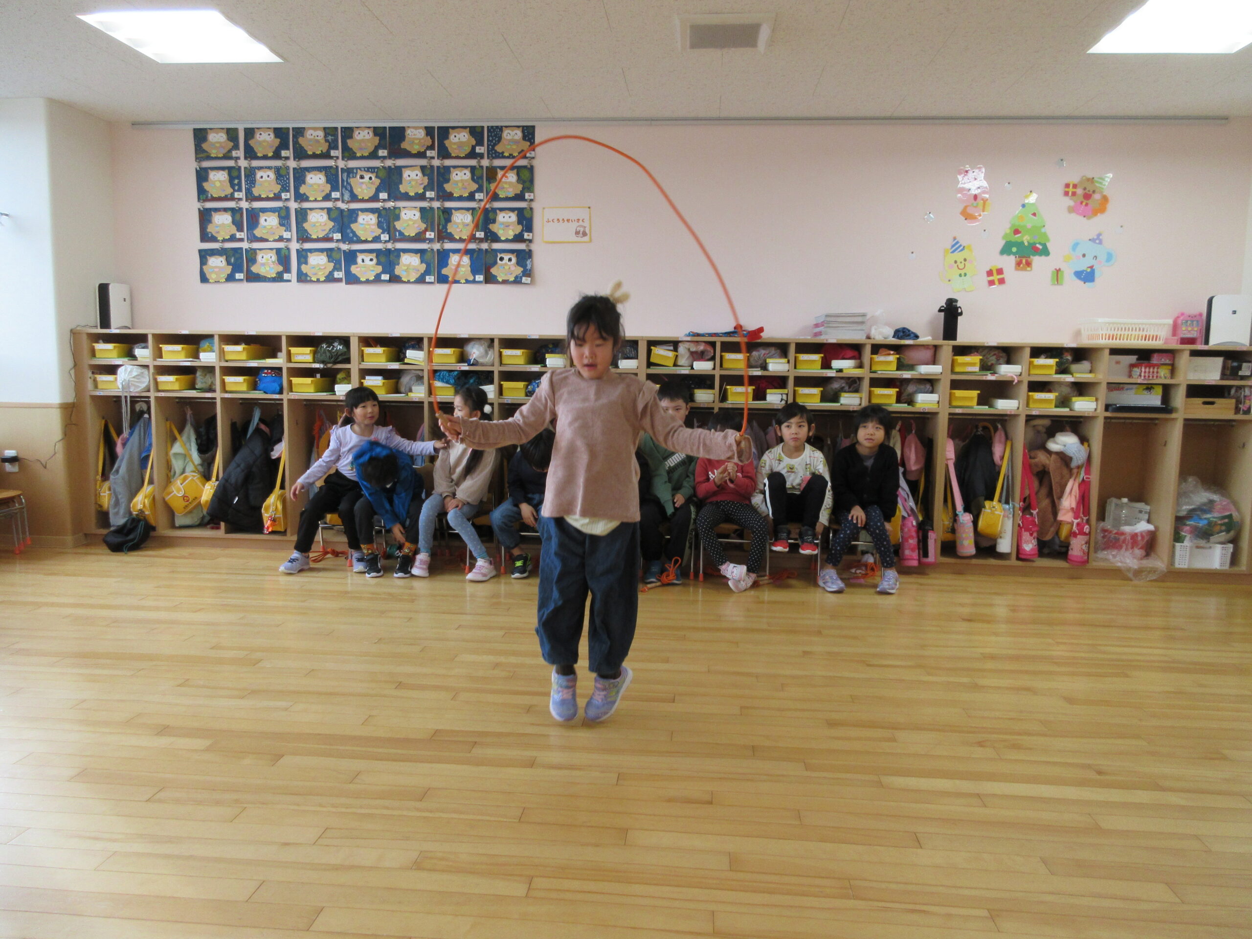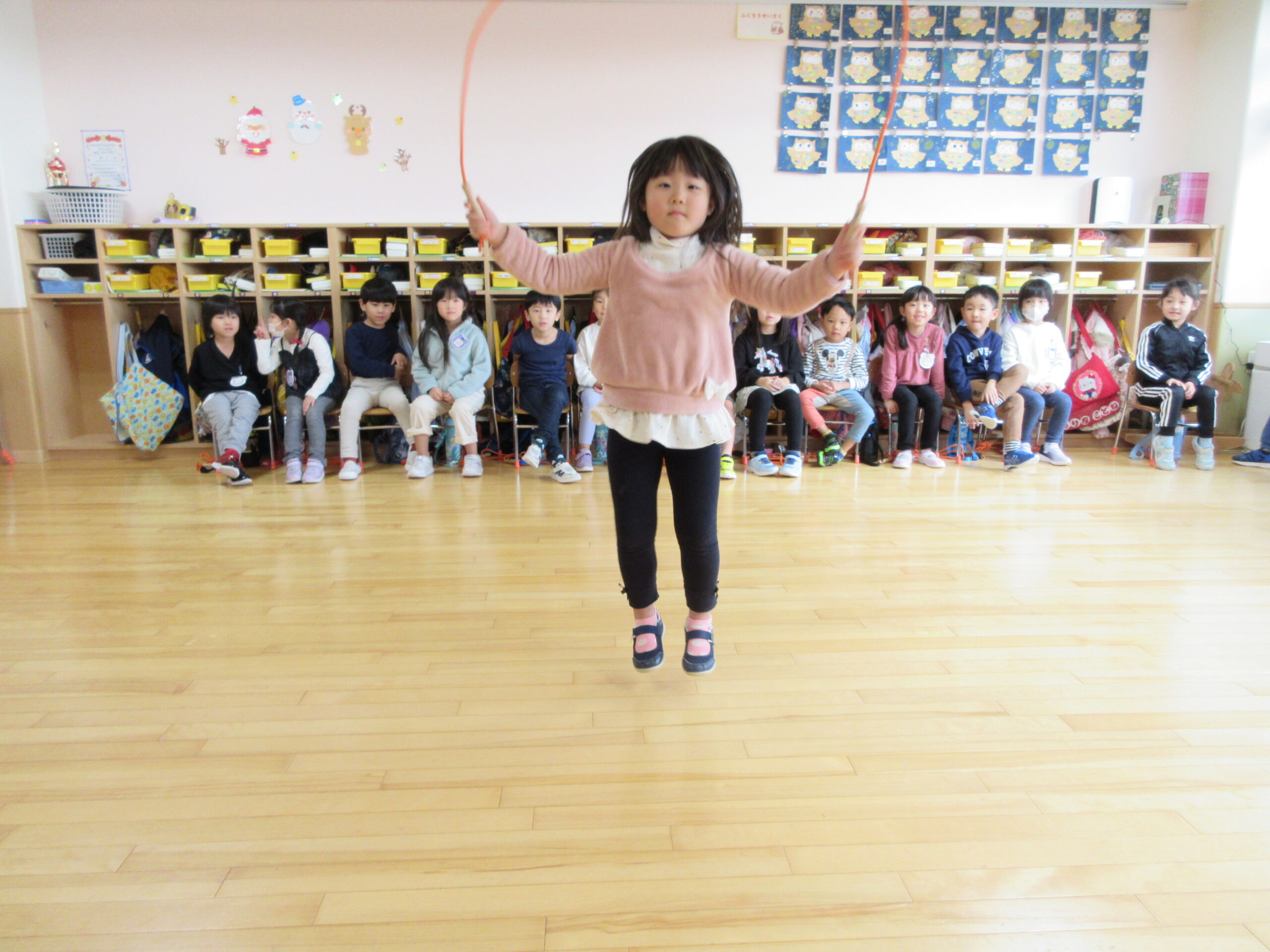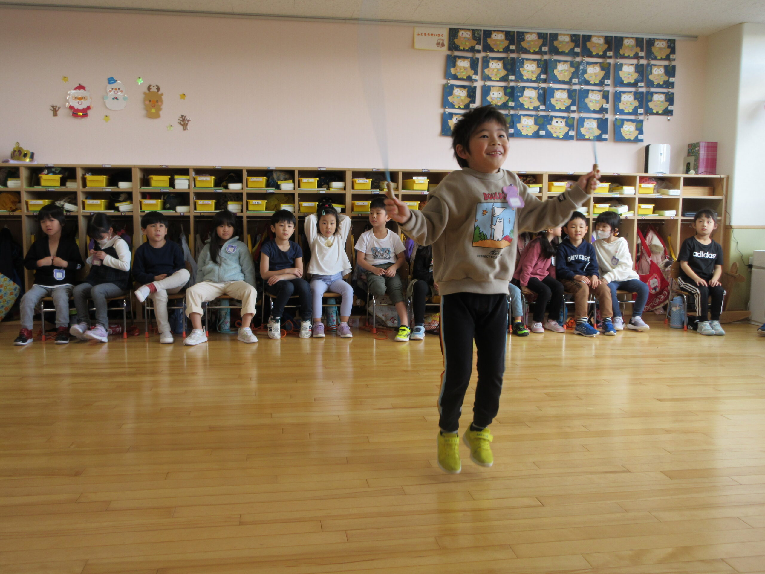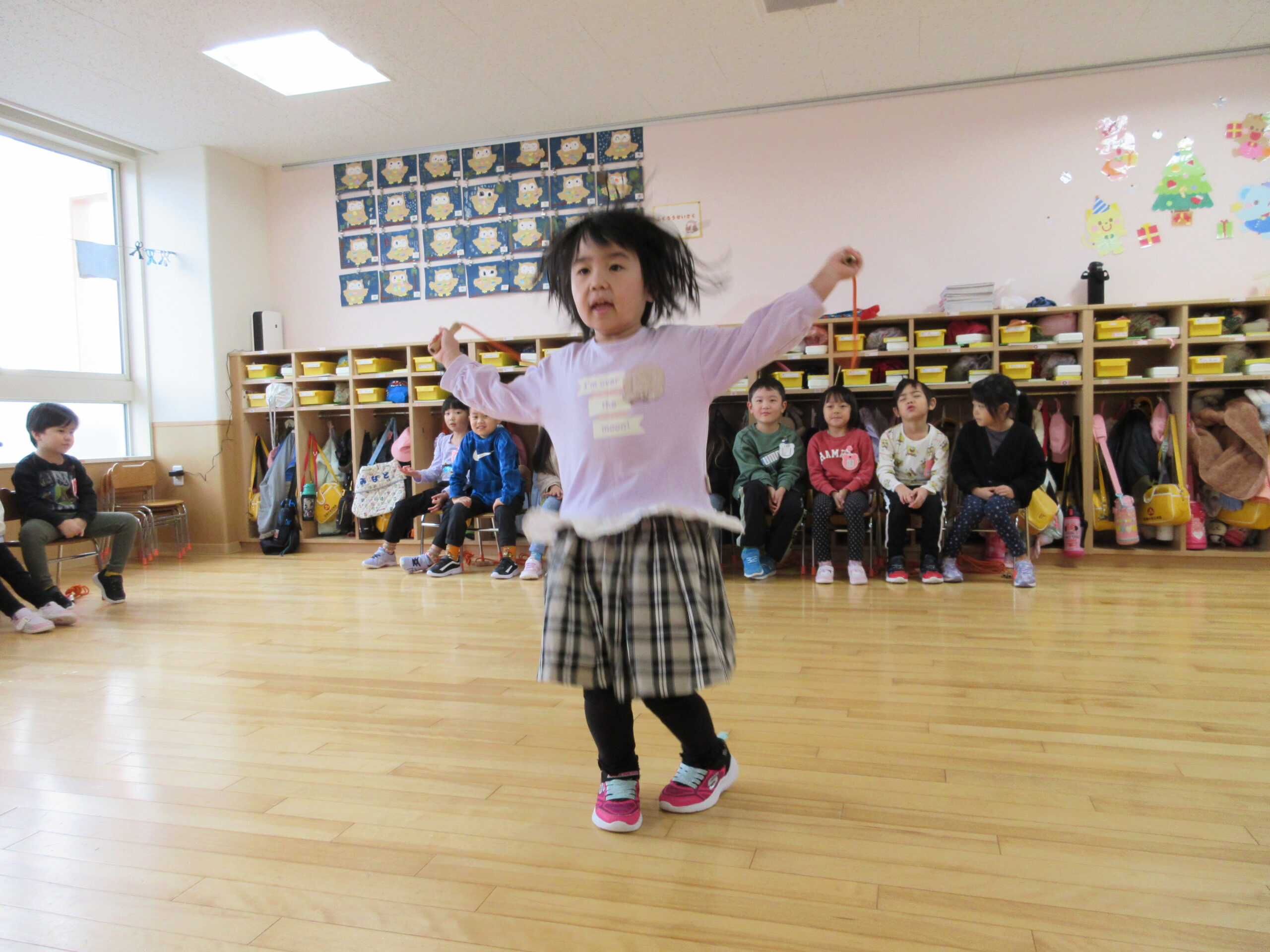 本日は、クラス毎にお部屋での縄跳び大会でした。久しぶりの縄跳び大会にワクワクしているお友達や、「すごくドキドキする」と緊張している様子も見られました。お友達の一生懸命な姿を応援したり、「一緒に頑張ろうね!」と励ます姿もありました。回を重ねる毎に練習の成果が表れ「前よりもたくさん跳べた!」と自信が付き嬉しそうな表情も見られました。次回はホールでの縄跳び大会になりますので、諦めない気持ちを持って取り組みたいと思います