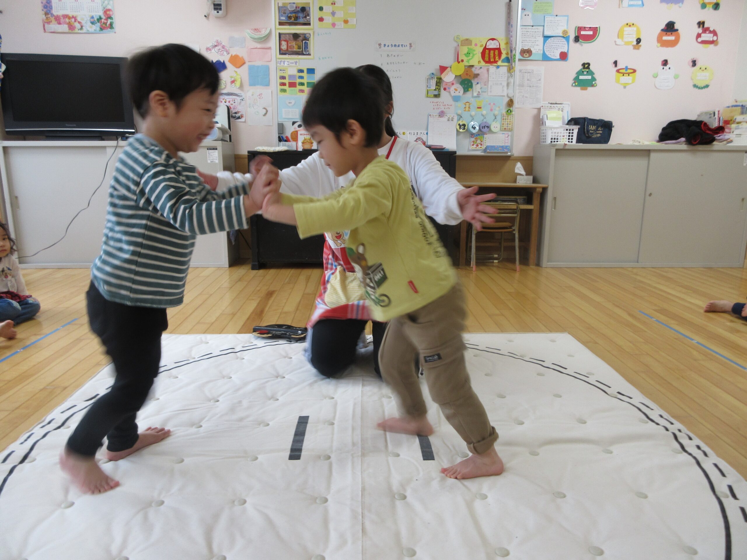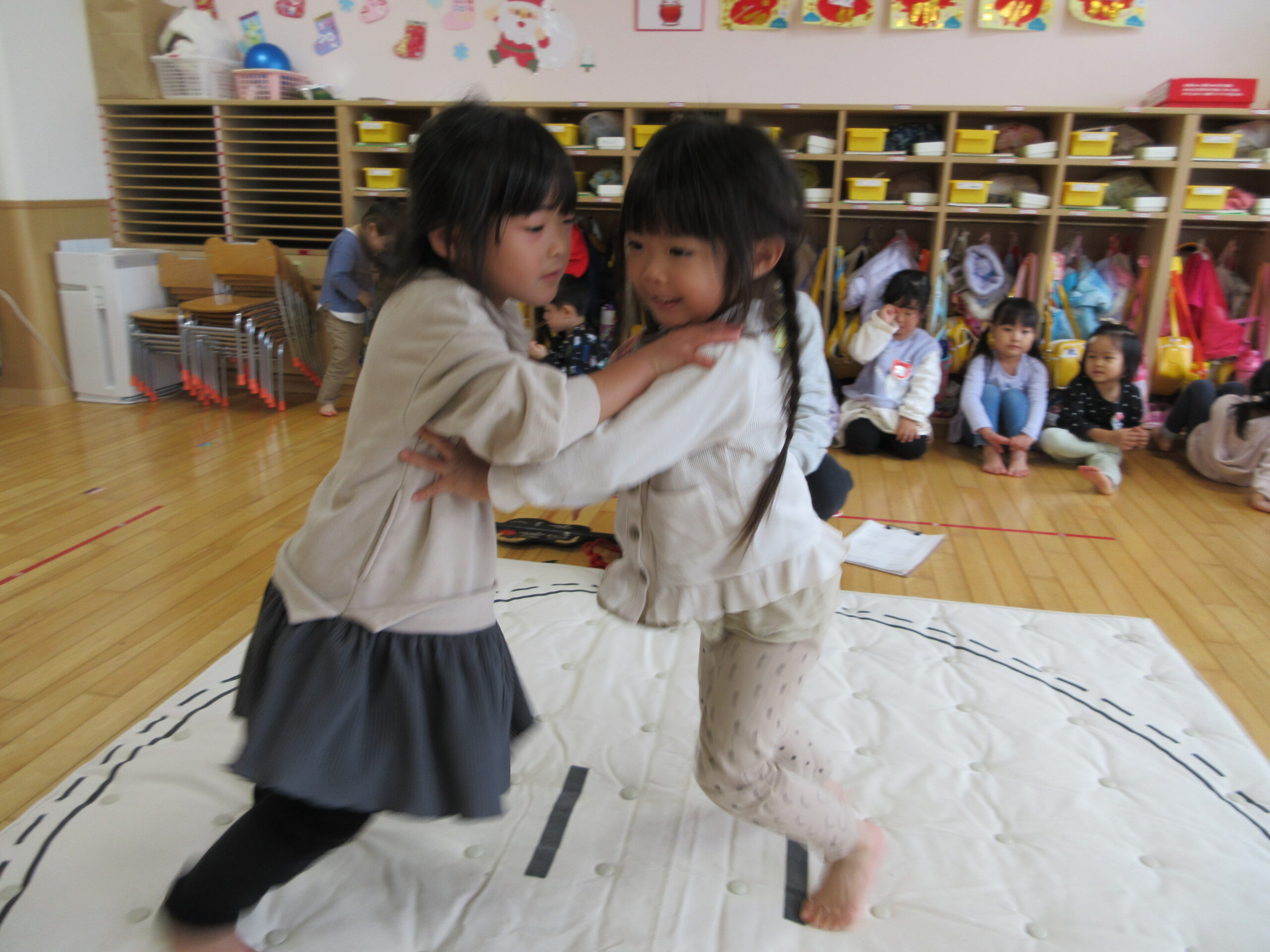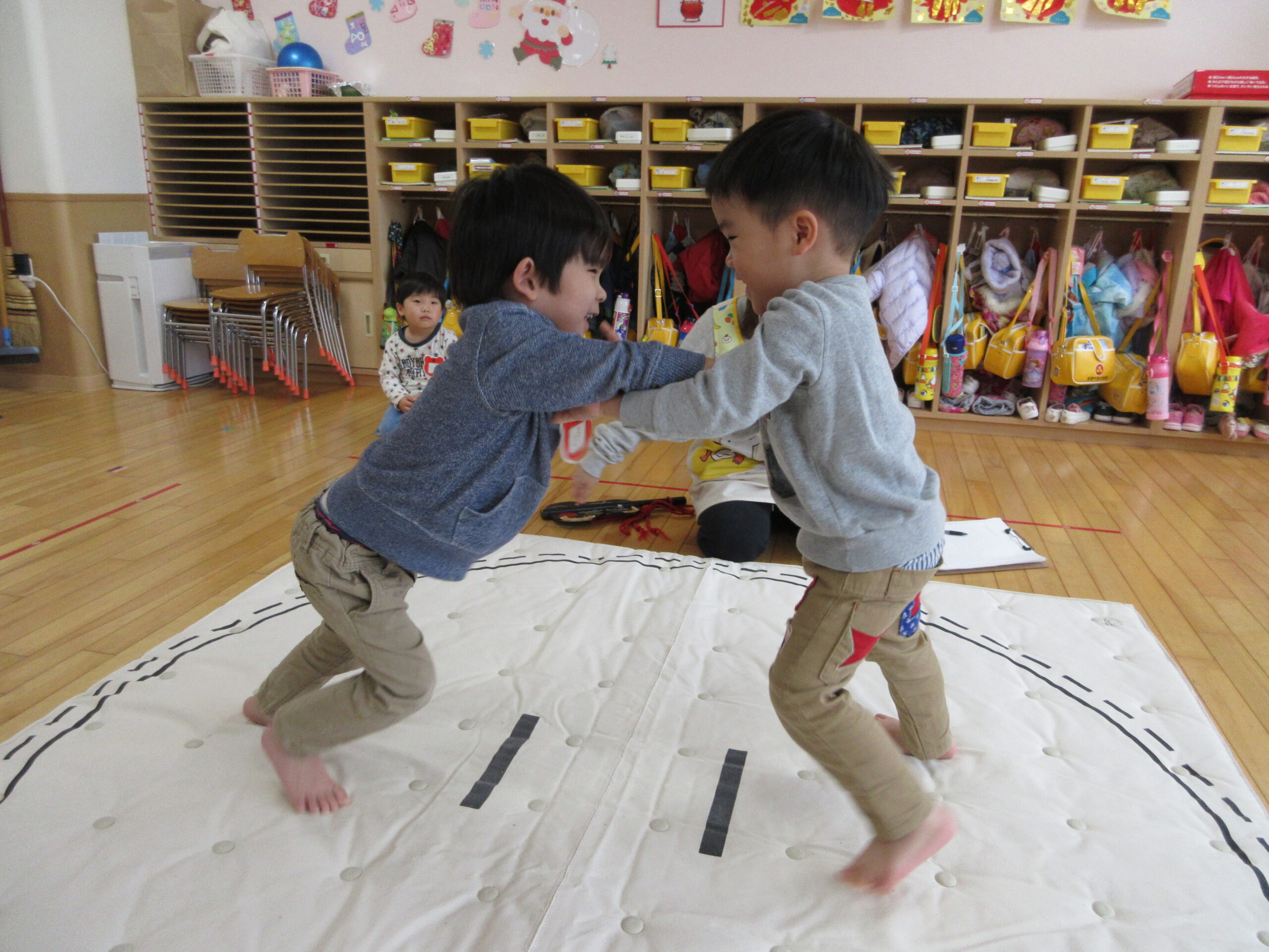 (95)令和5年度「年少学年 お相撲大会」 2023年12月5日 園内ブログ 12月4日(月)は、クラス毎にお部屋でおすもう大会を行いました。2回目のおすもう大会ということもあり、「家で練習してきたよ!」「楽しみ!」という声が上がっていました。やる気満々の子ども達は、1学期よりも体力や筋力もつき、取り組みも粘り強く頑張っている姿が見られました。とても見応えのある取り組みばかりで、3学期のおすもう大会も楽しみにしている様子でした!