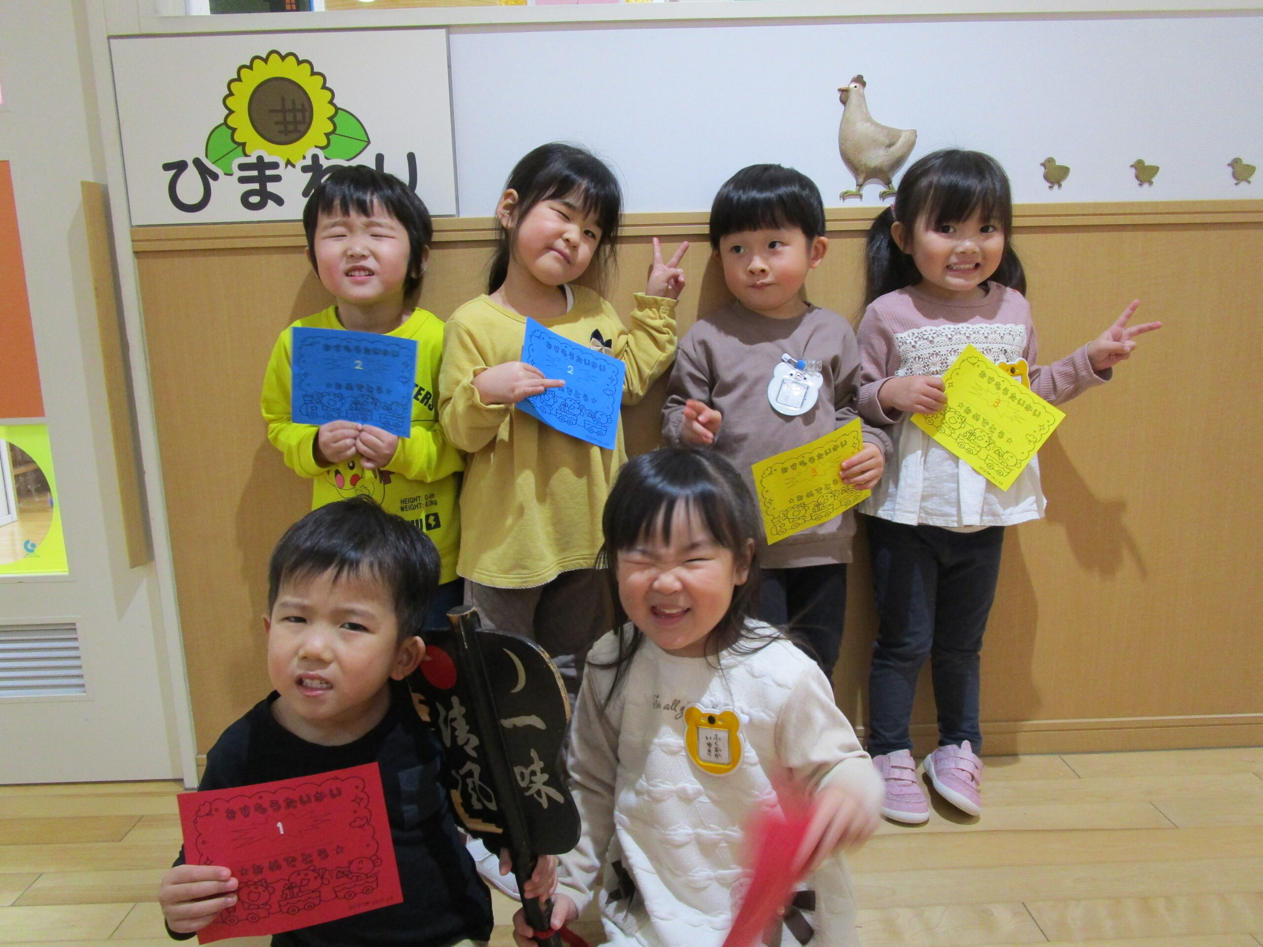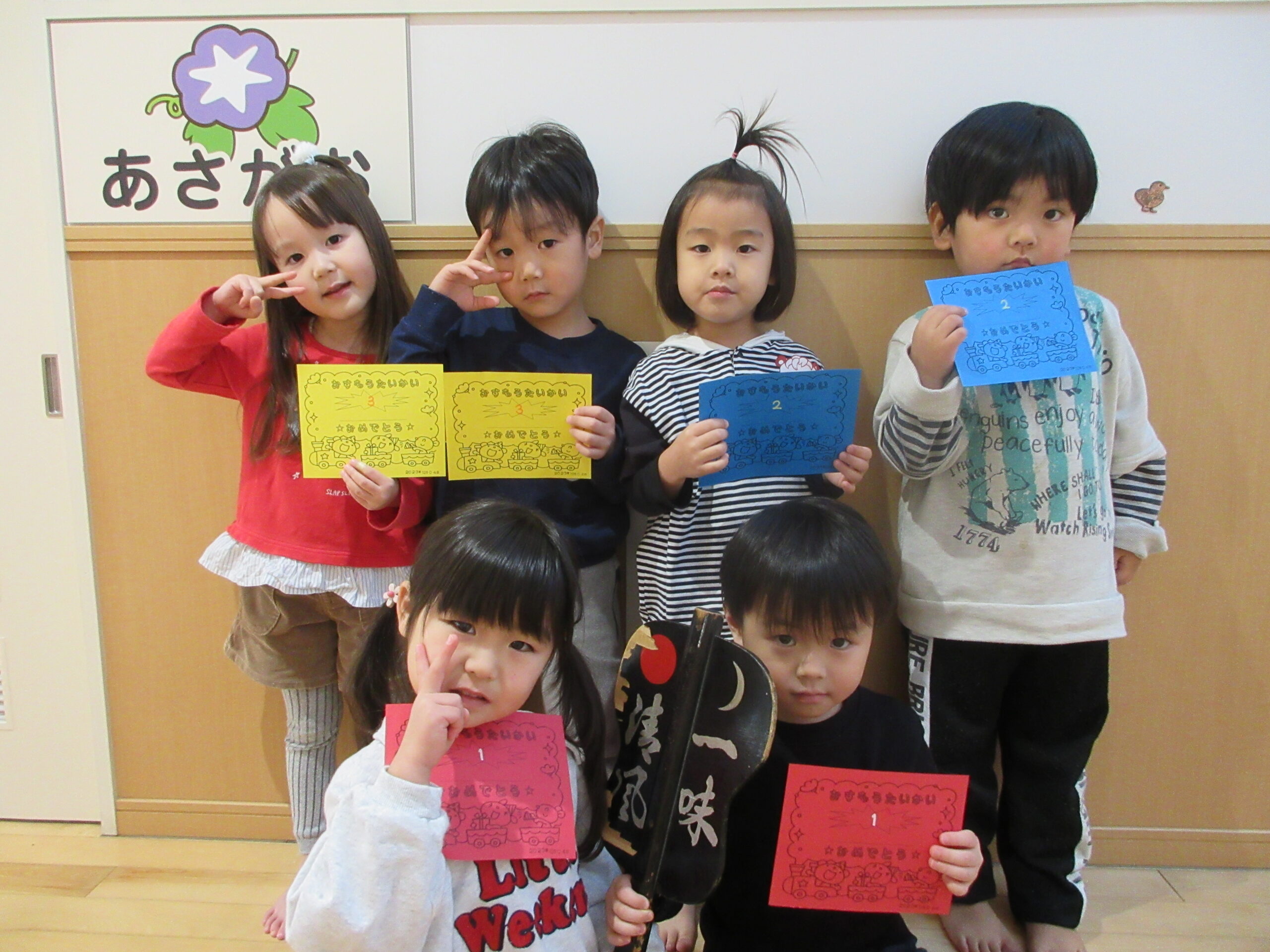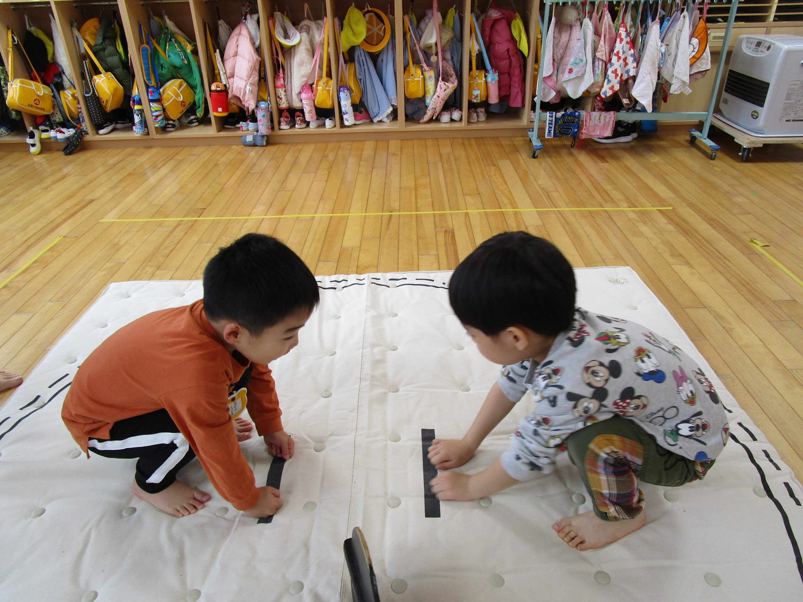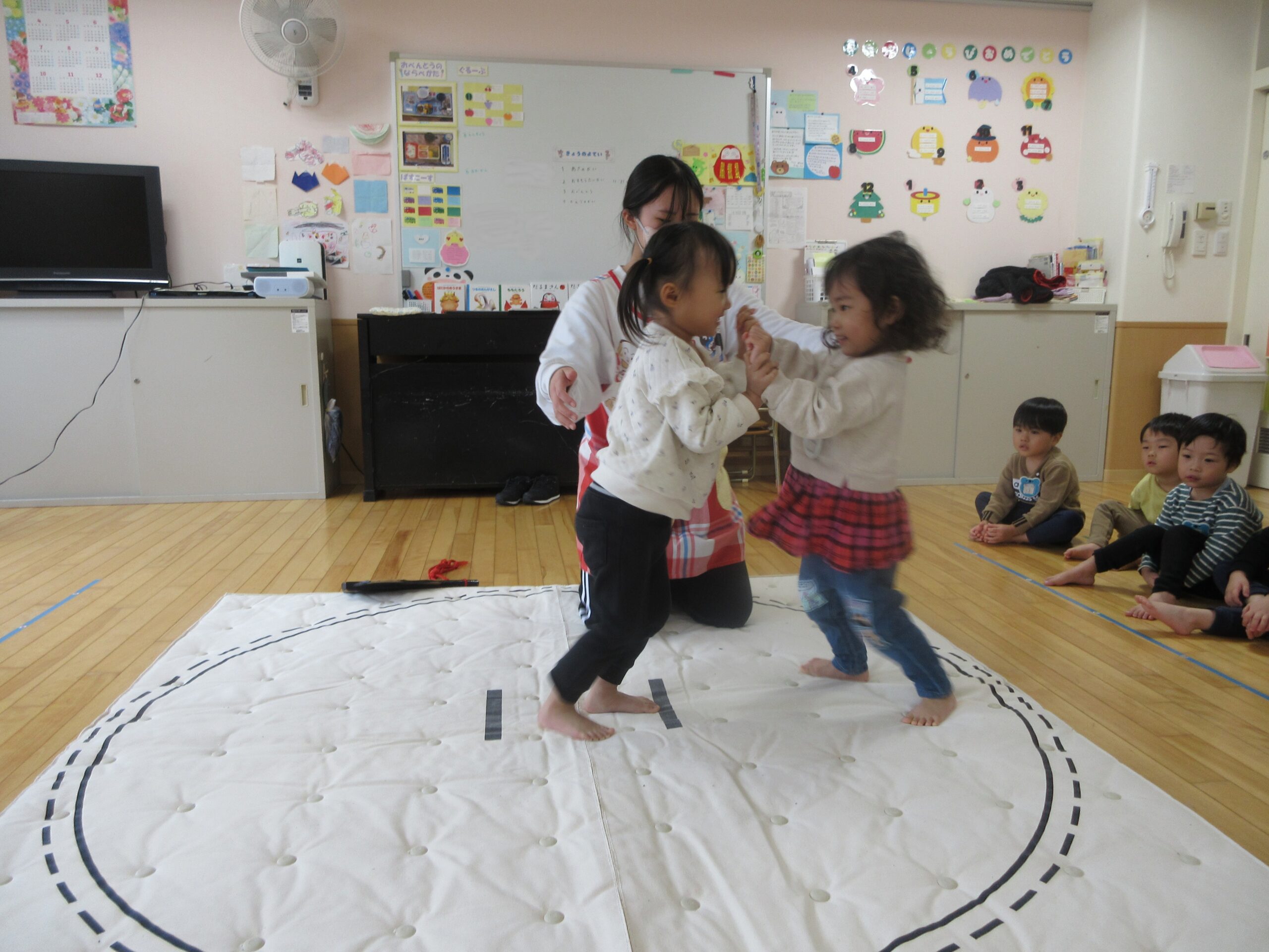 (95)令和5年度「年少学年 お相撲大会」 2023年12月5日 園内ブログ 12月4日(月)は、クラス毎にお部屋でおすもう大会を行いました。2回目のおすもう大会ということもあり、「家で練習してきたよ!」「楽しみ!」という声が上がっていました。やる気満々の子ども達は、1学期よりも体力や筋力もつき、取り組みも粘り強く頑張っている姿が見られました。とても見応えのある取り組みばかりで、3学期のおすもう大会も楽しみにしている様子でした!