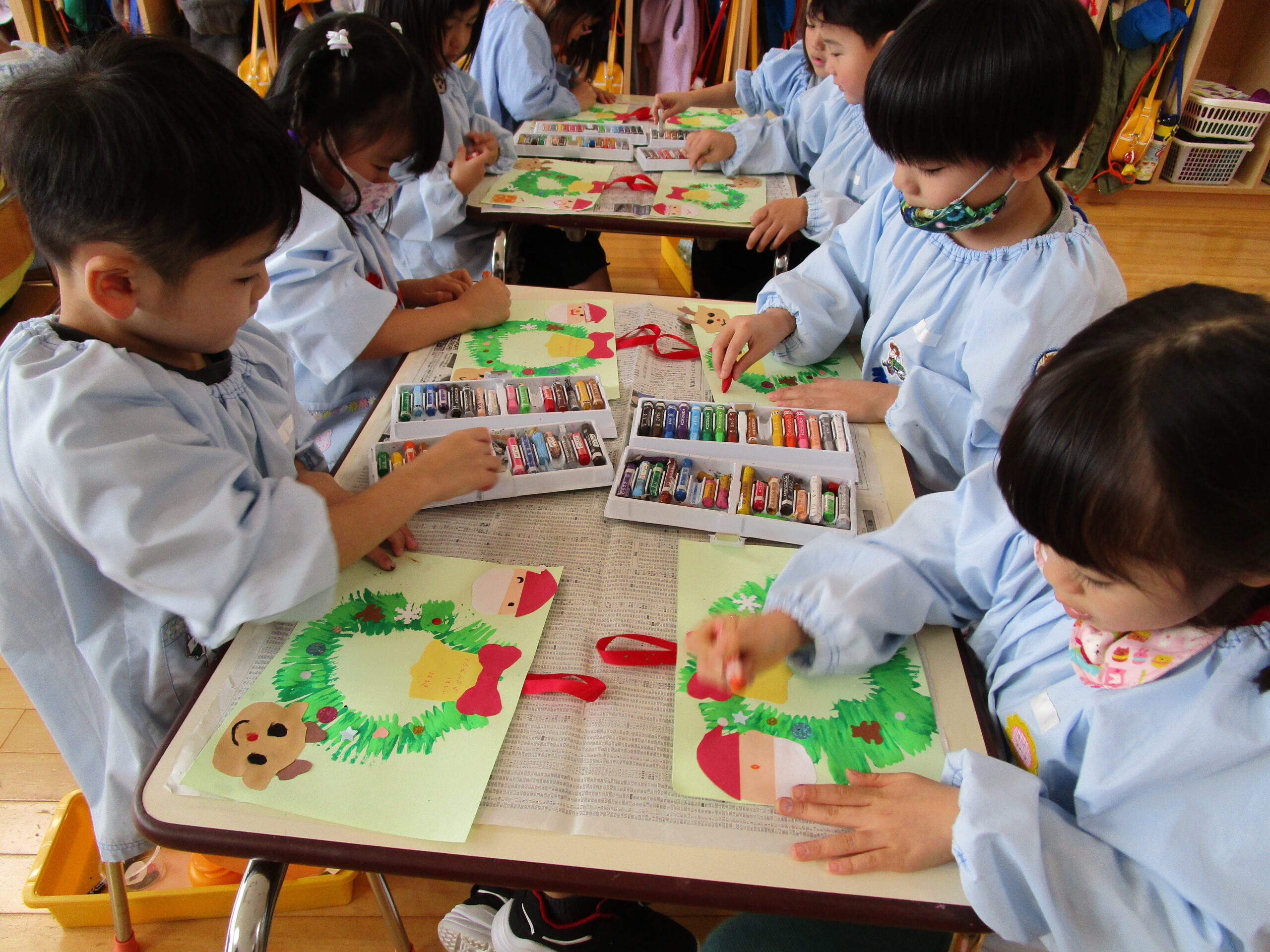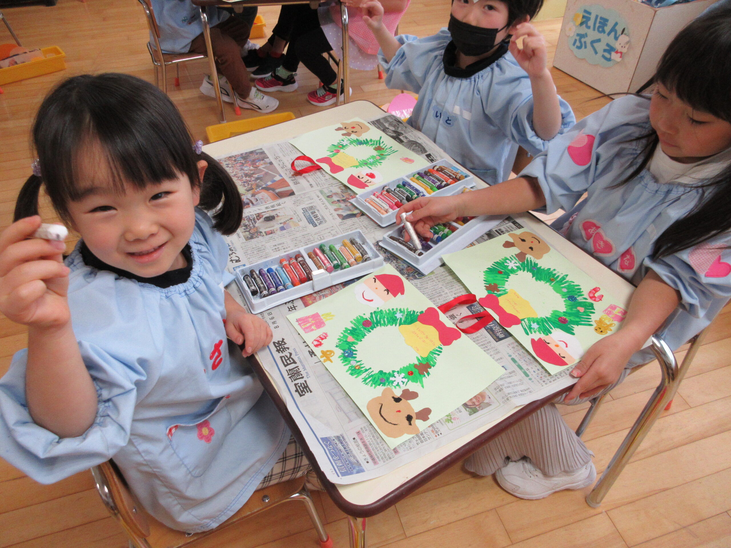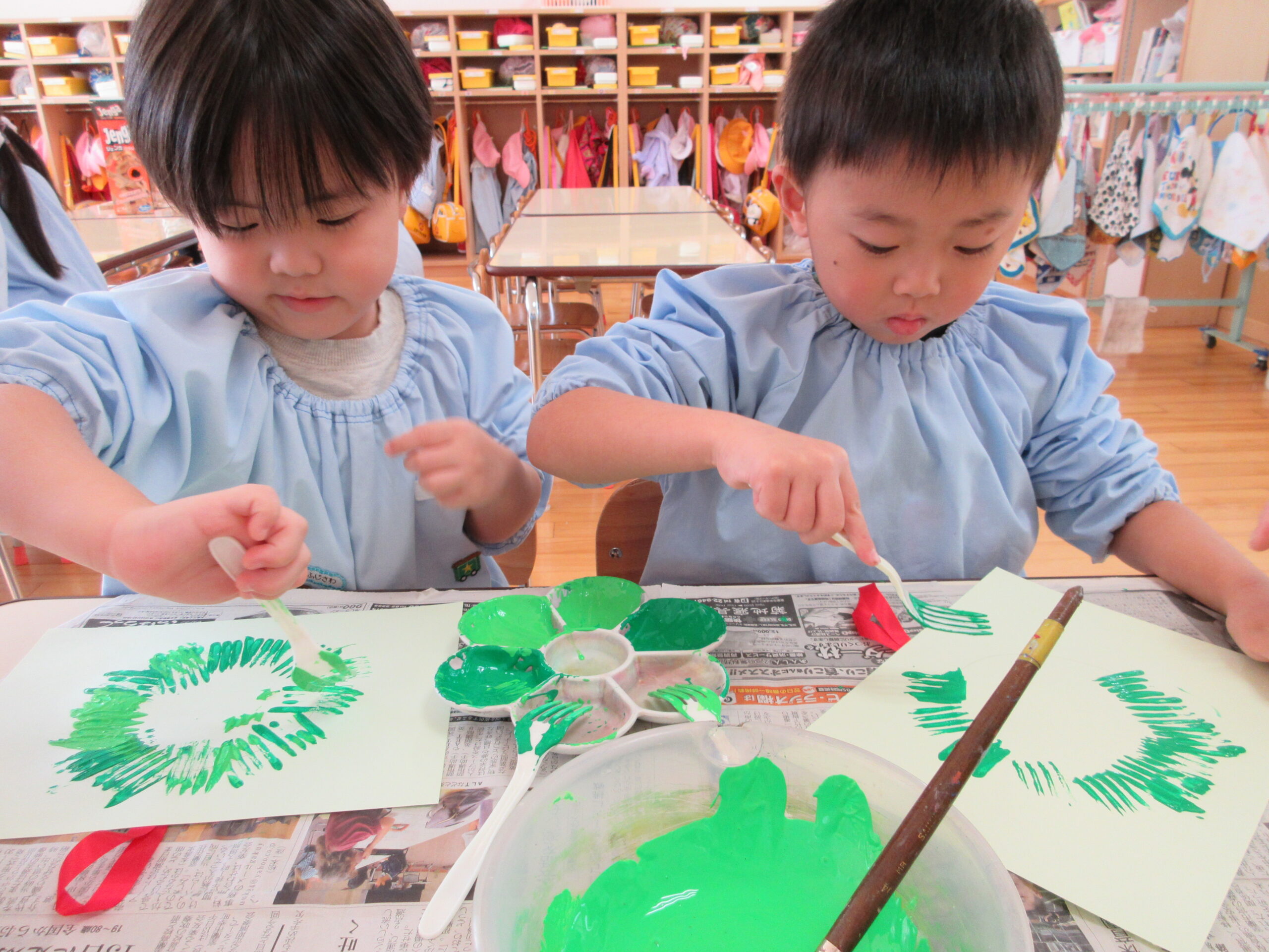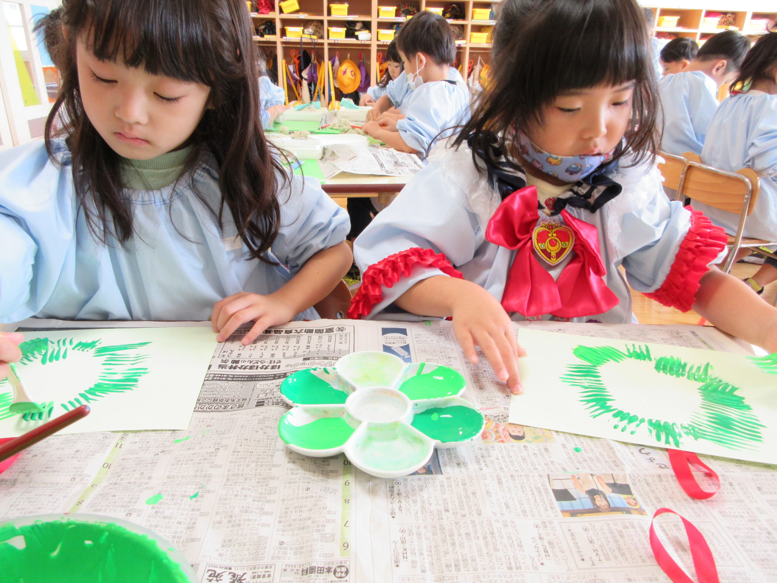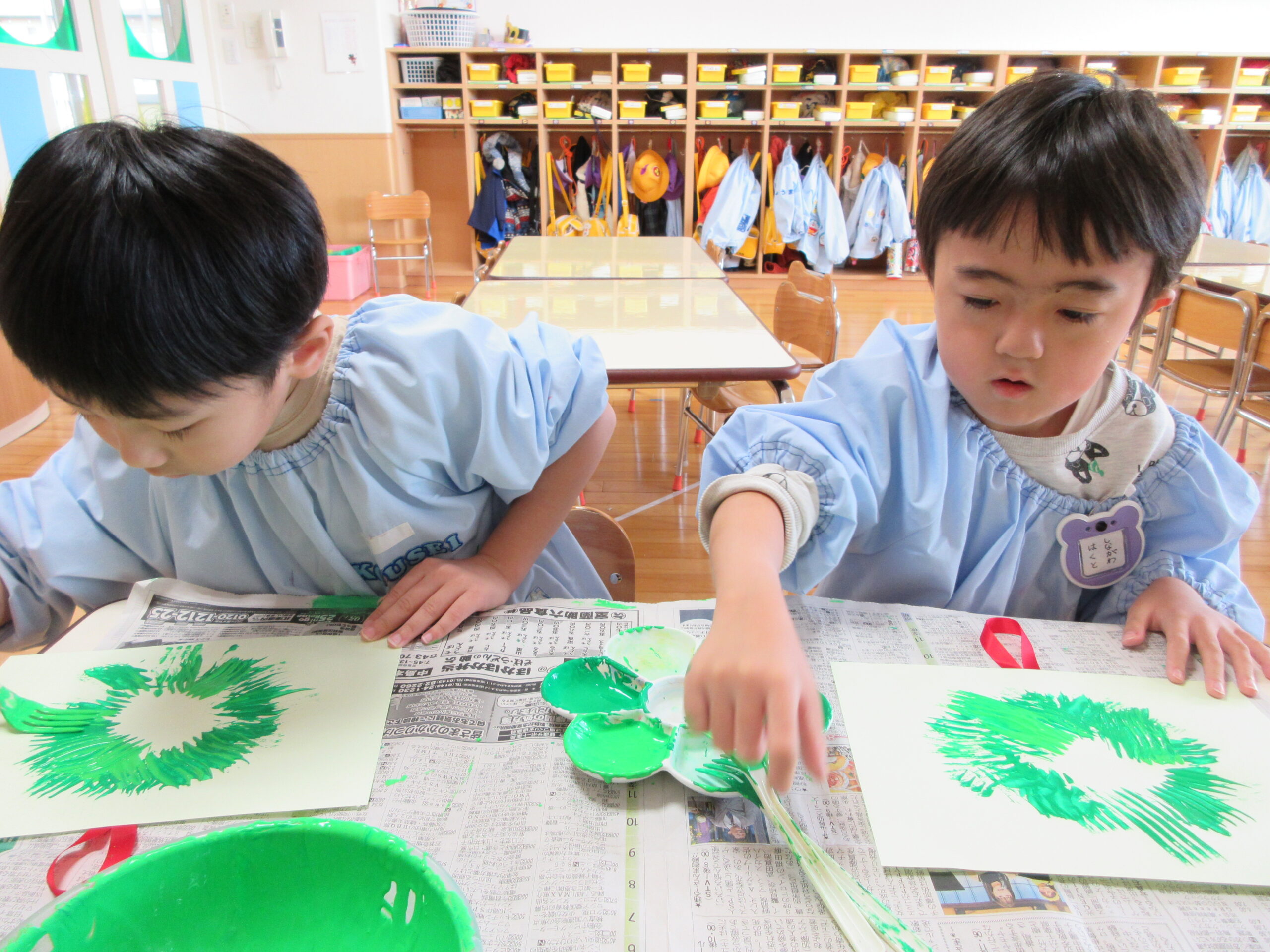 クリスマス製作ではフォークを使ってリースを作ったり、年賀状製作では歯ブラシを使ってスパッタリングという技法で製作を行いました。絵の具を使った製作は子ども達も楽しんでおり、「たのしかった」「きれい〜」などの声があがり、素敵な作品が出来ました。