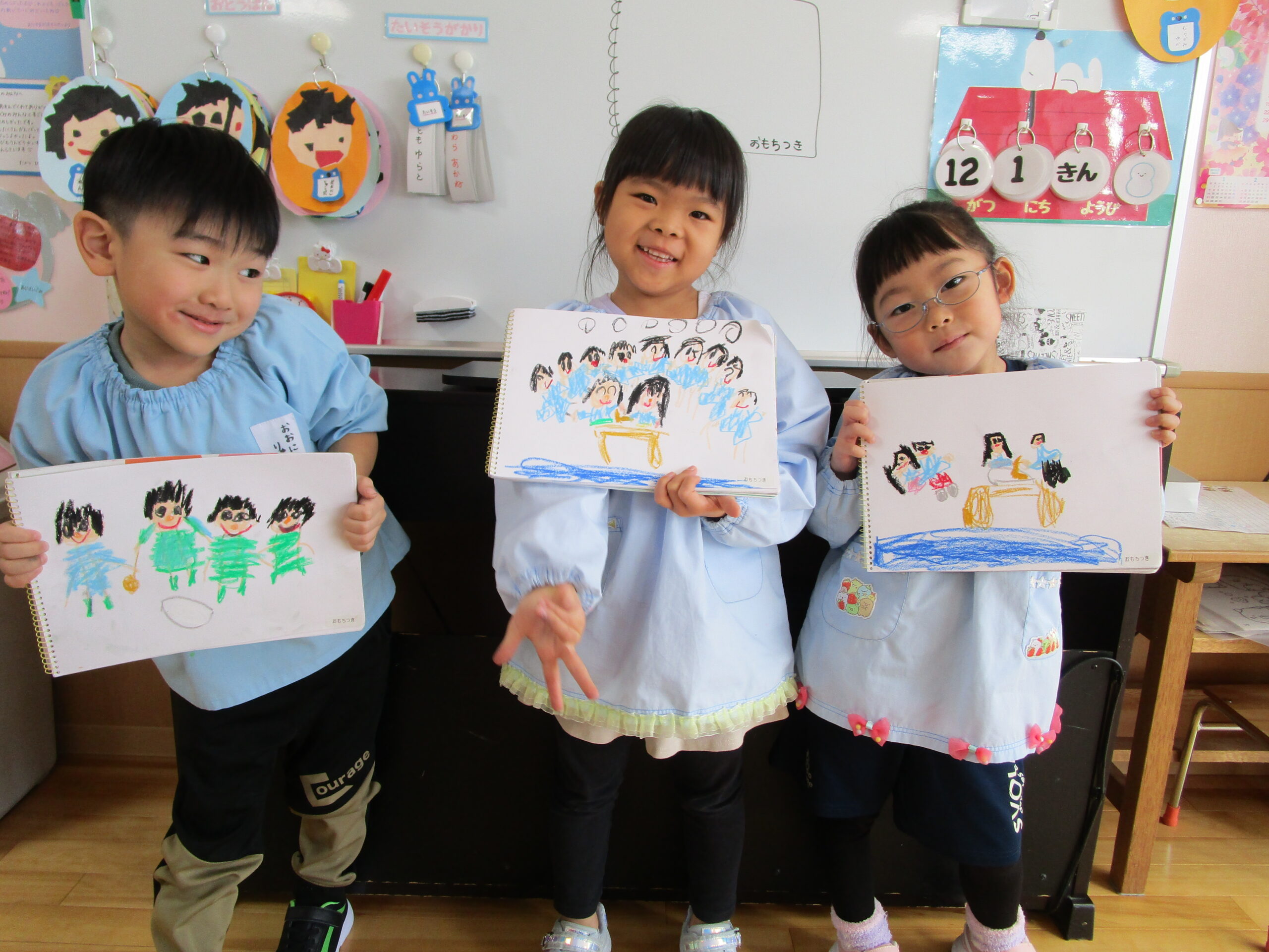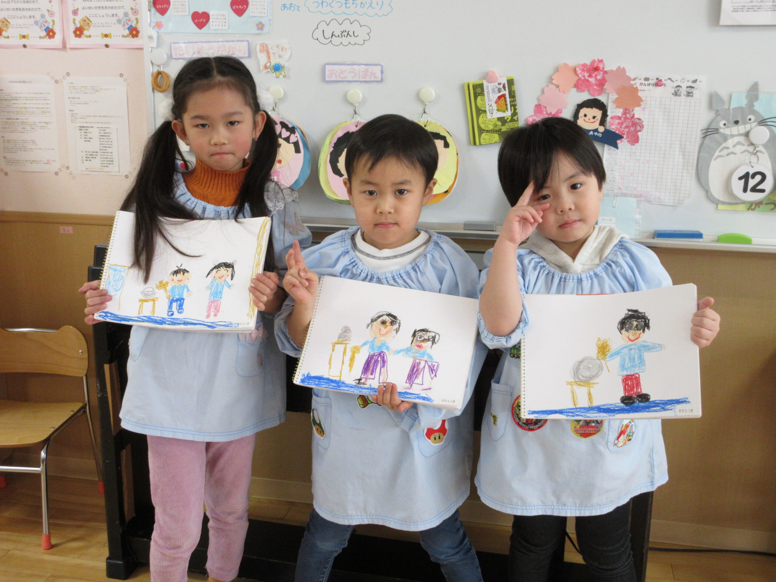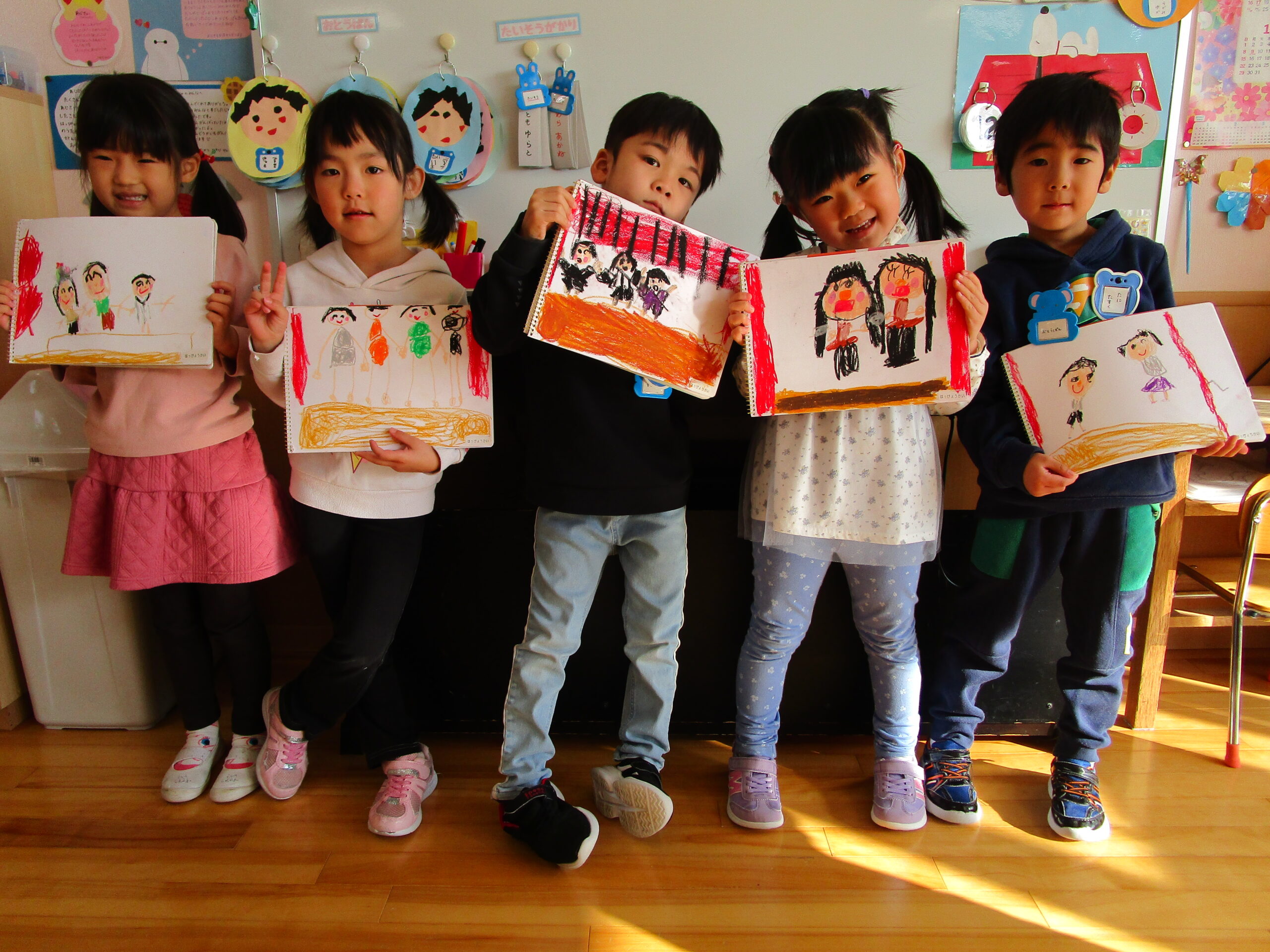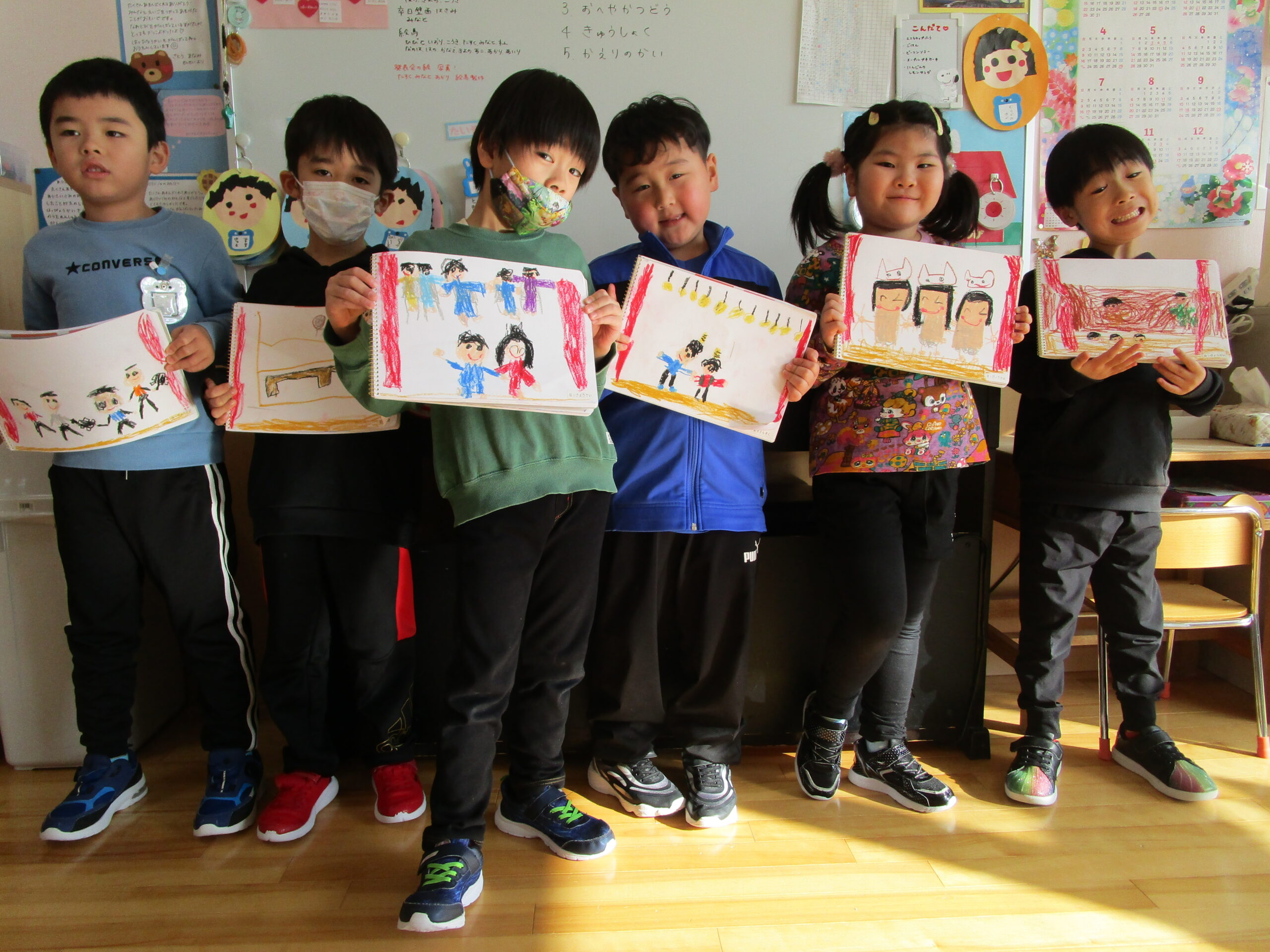 発表会の絵やお餅つきの絵など、経験したことを自分の思うように表現する事も上手になり、伸び伸びと描くことが出来ていました♪