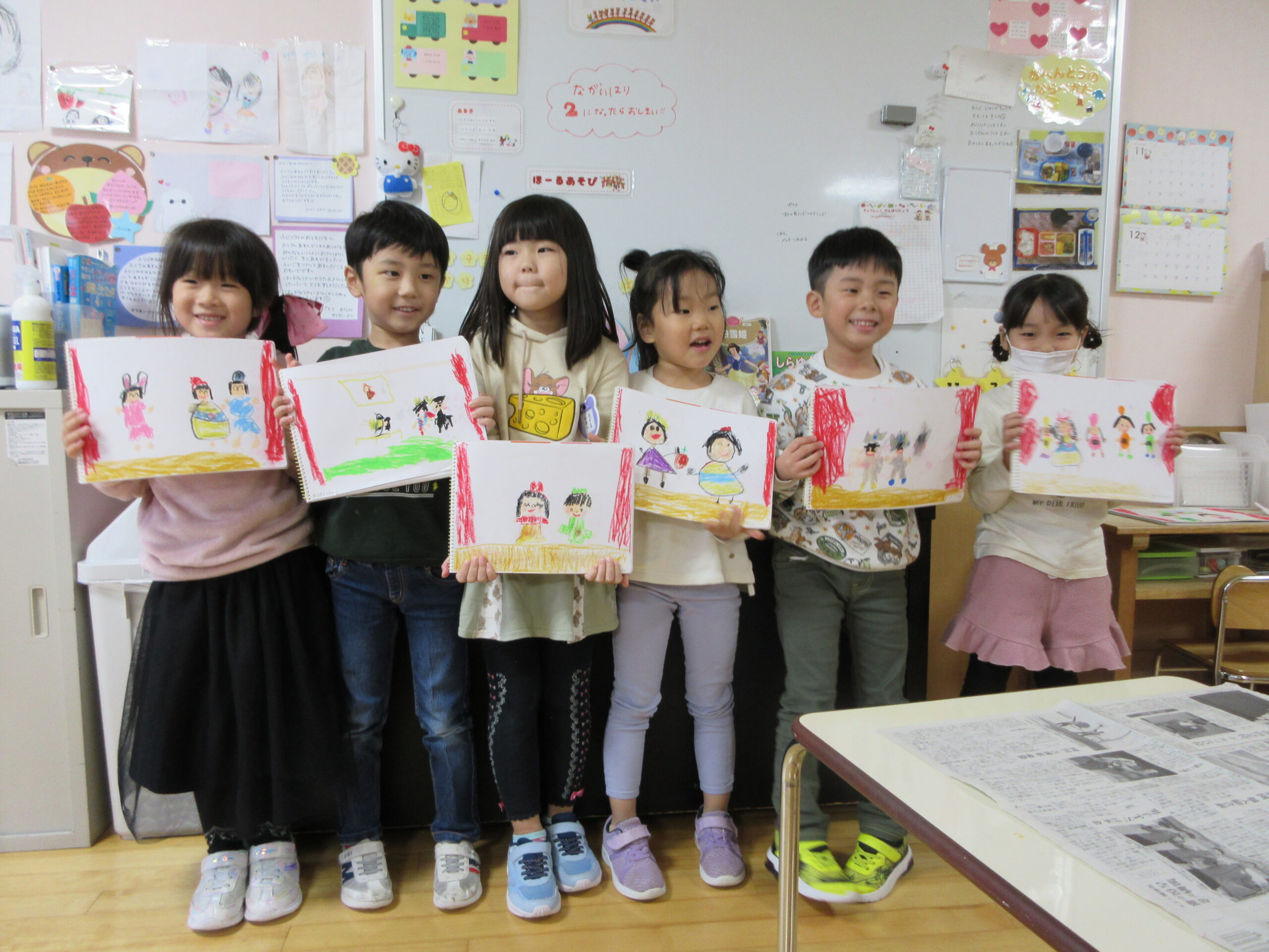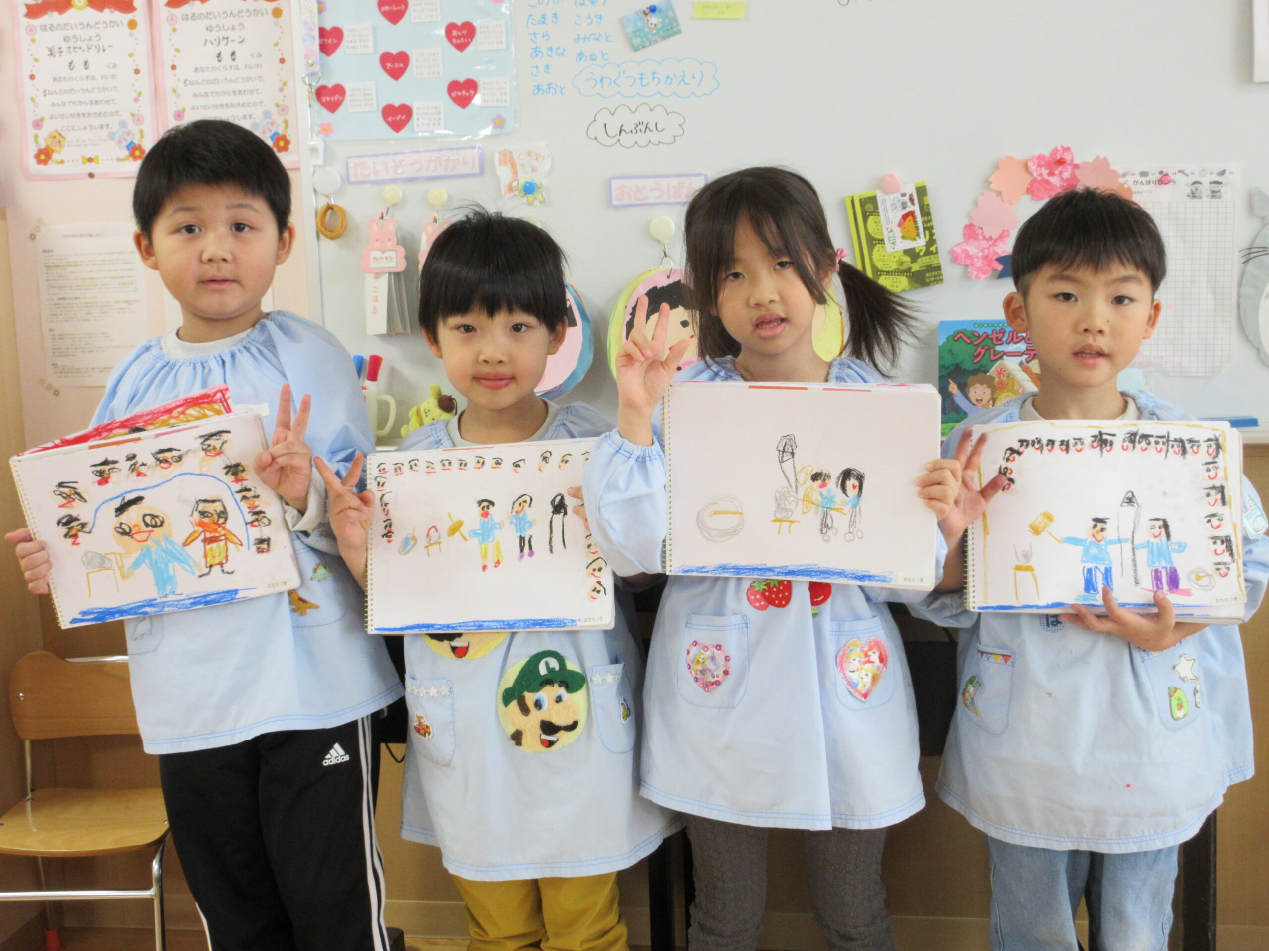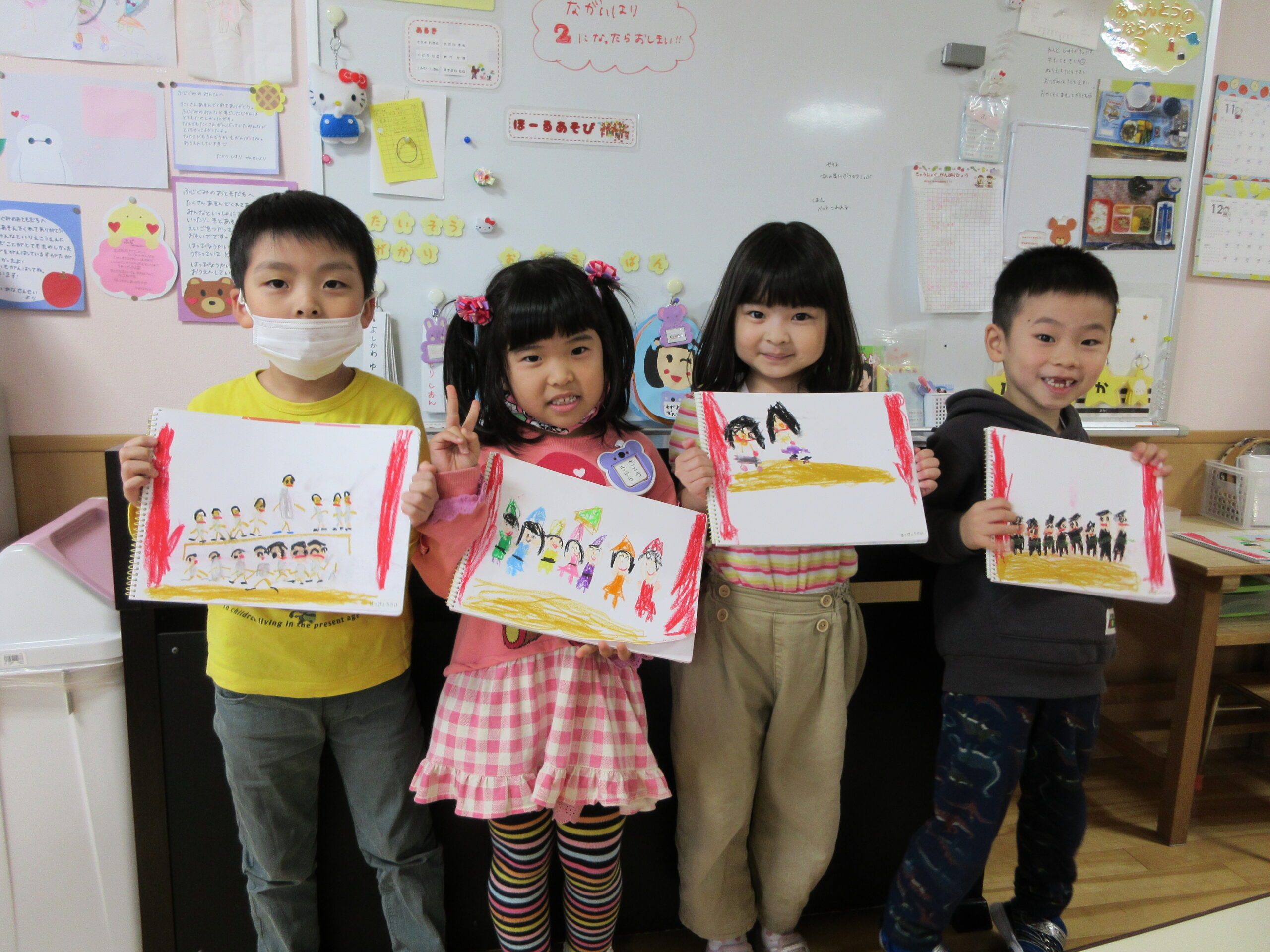 発表会の絵やお餅つきの絵など、経験したことを自分の思うように表現する事も上手になり、伸び伸びと描くことが出来ていました♪