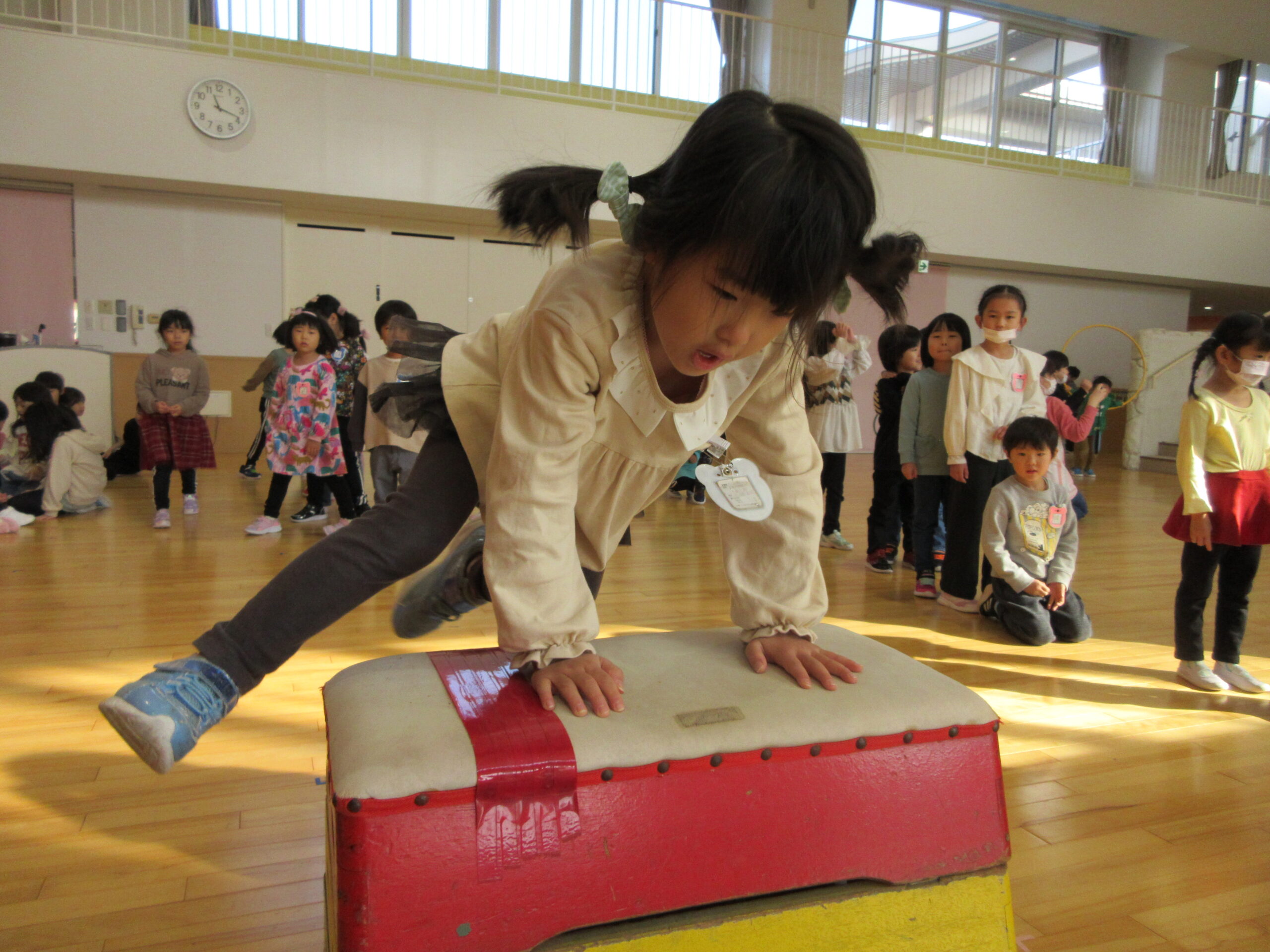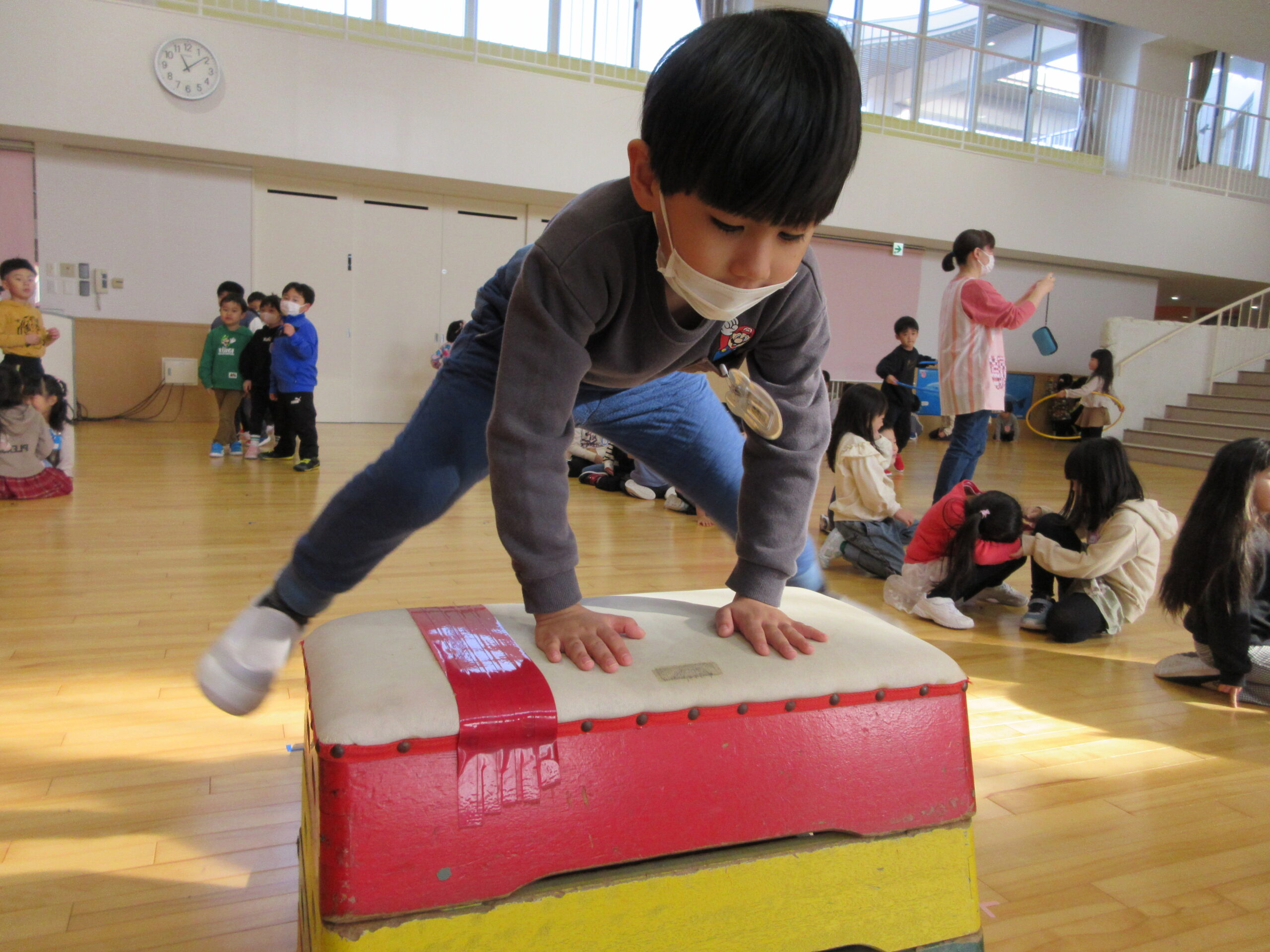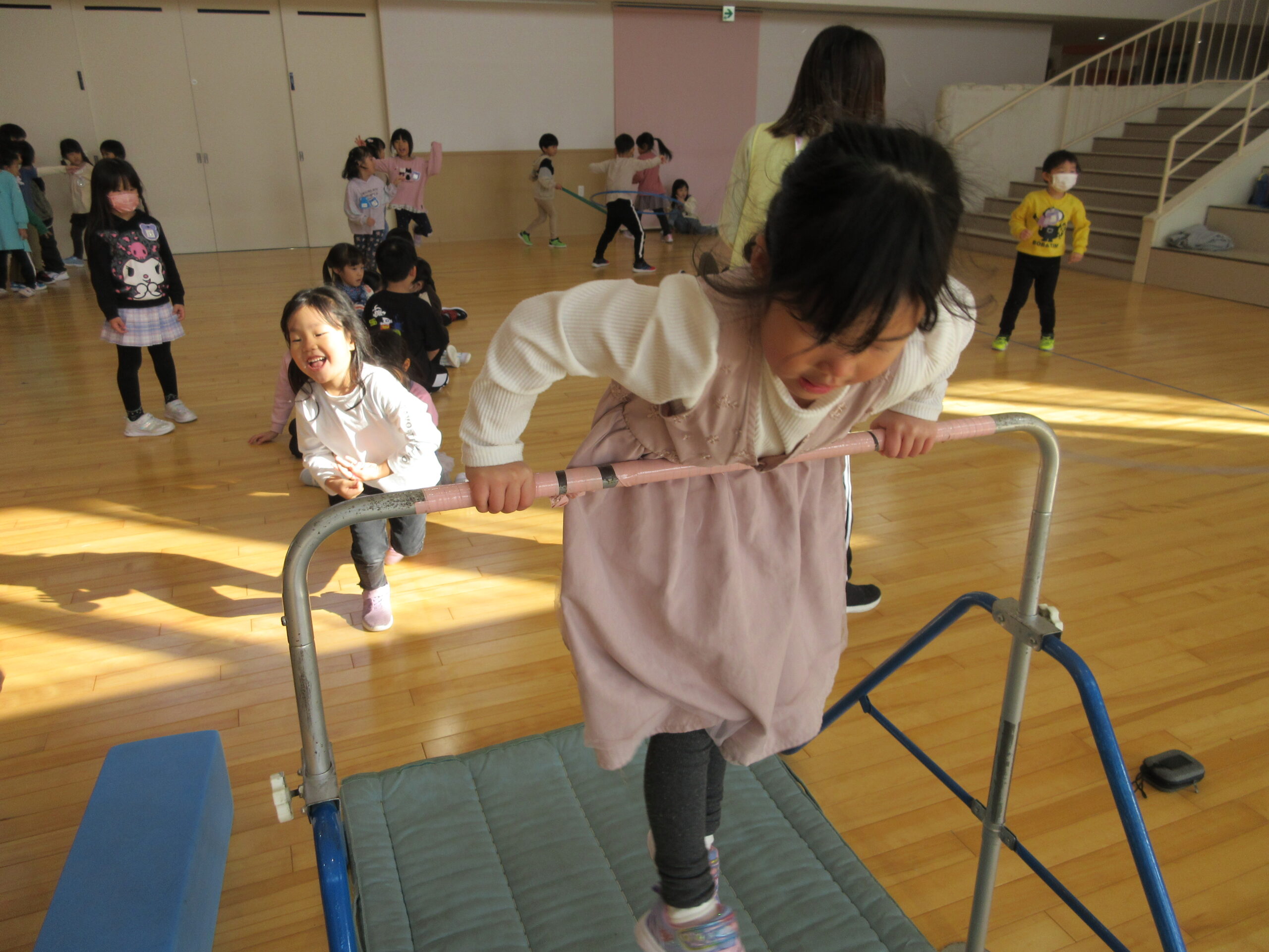 11月27日(月)の運動遊びでは、跳び箱、鉄棒、大縄、フラフープの中から自分のやりたいものに取り組みました。回数を重ねるごとにコツを掴んでできるようになり、成功して喜ぶお友達の姿がたくさん見られました。