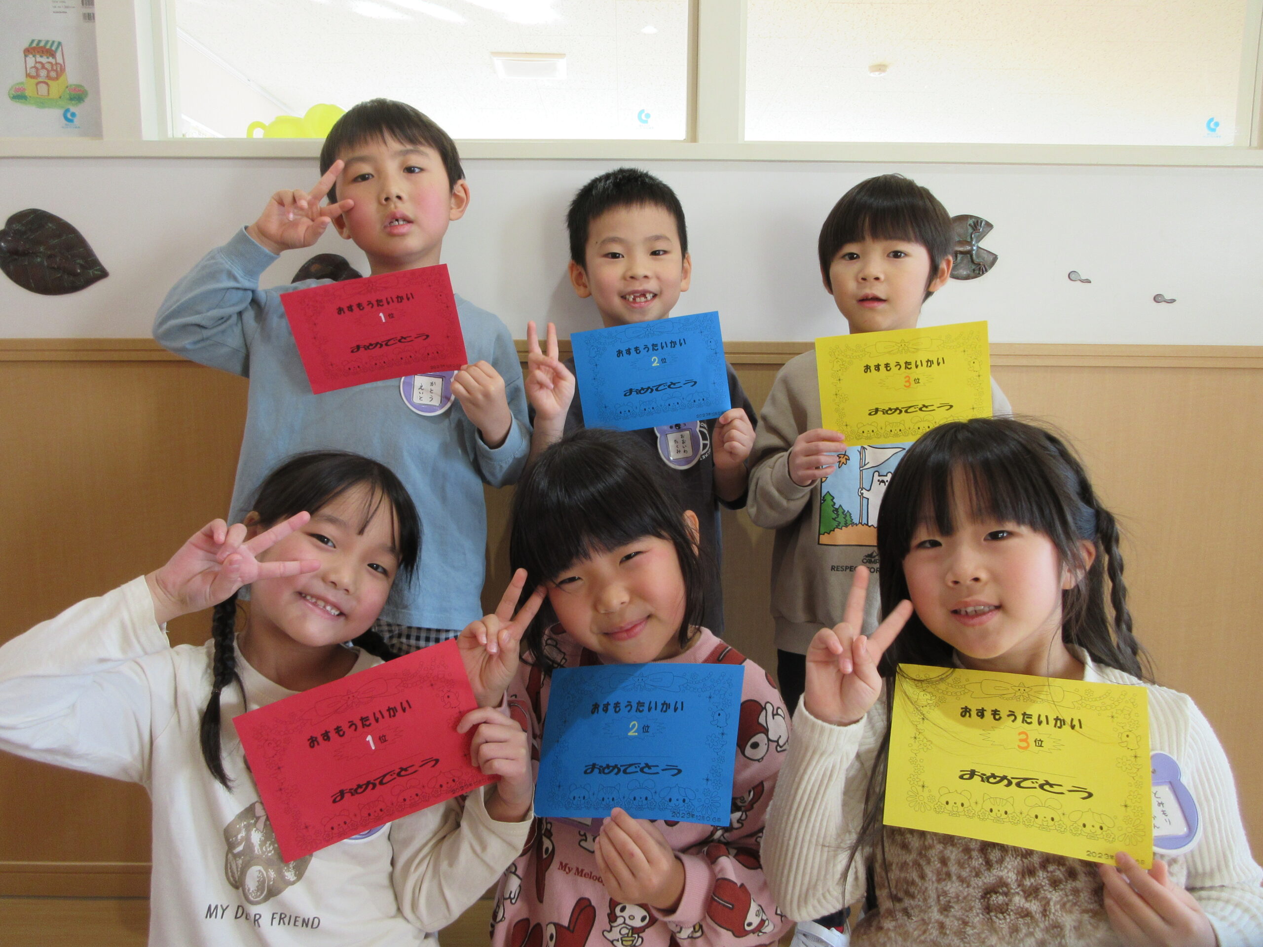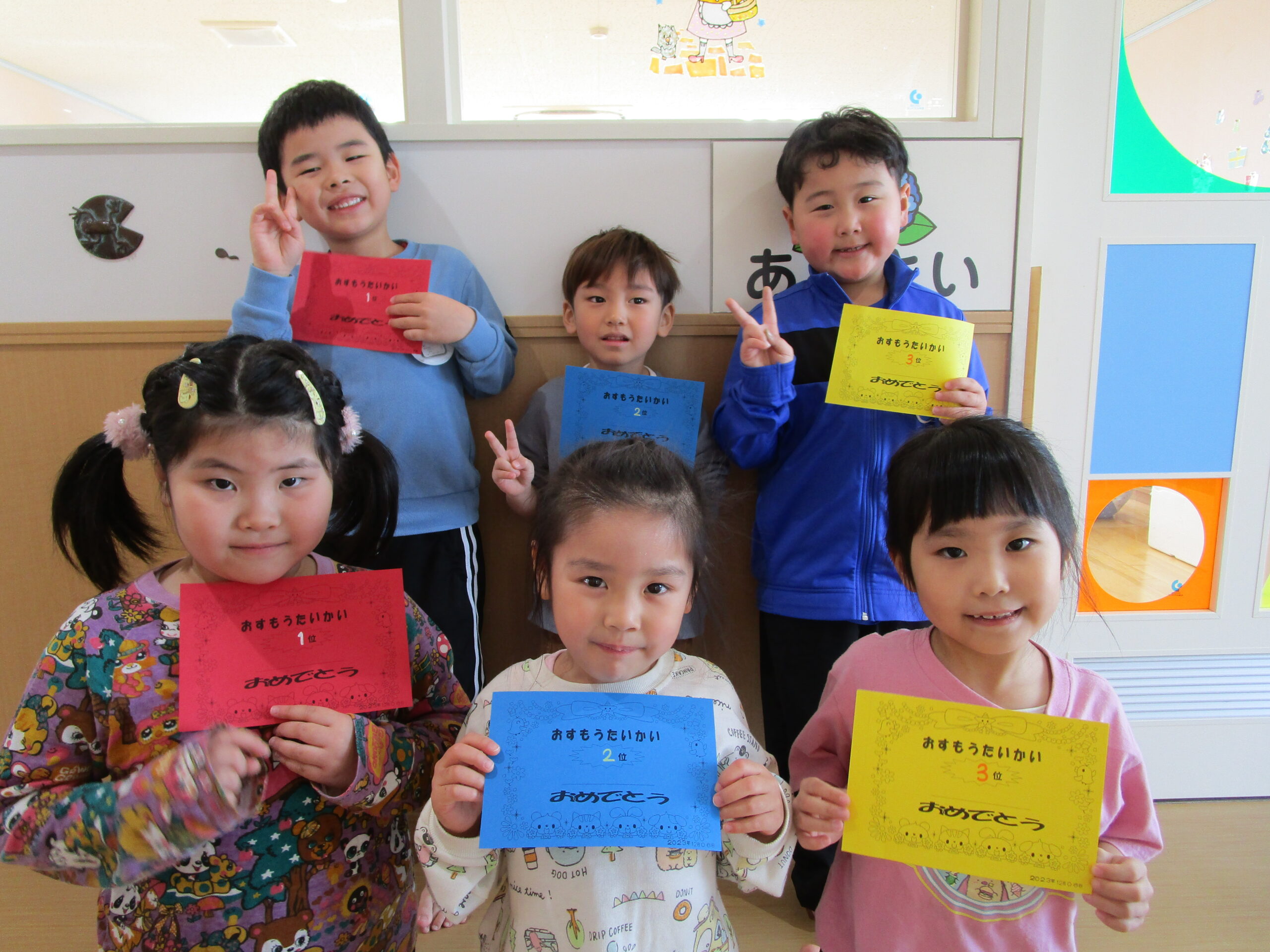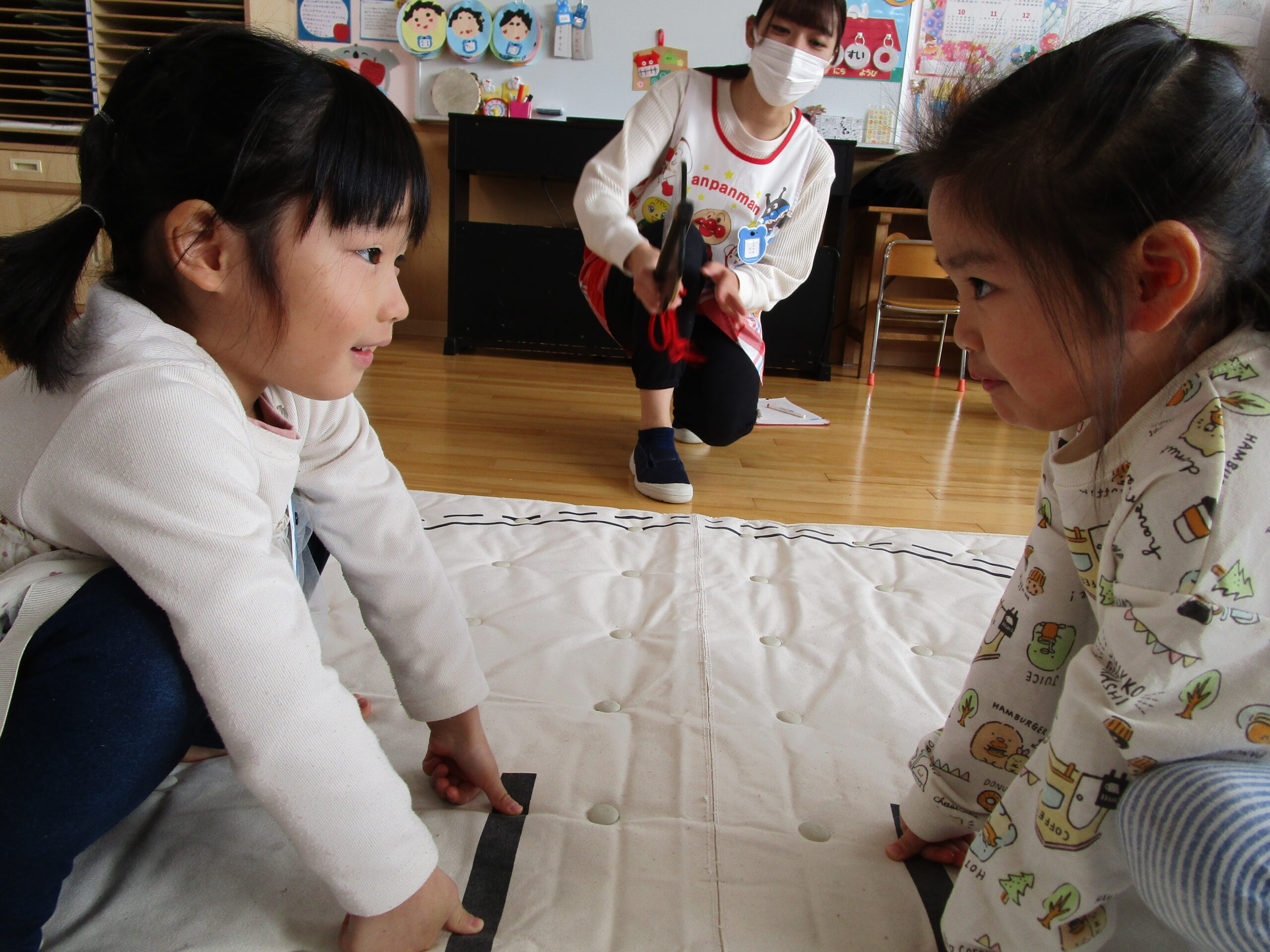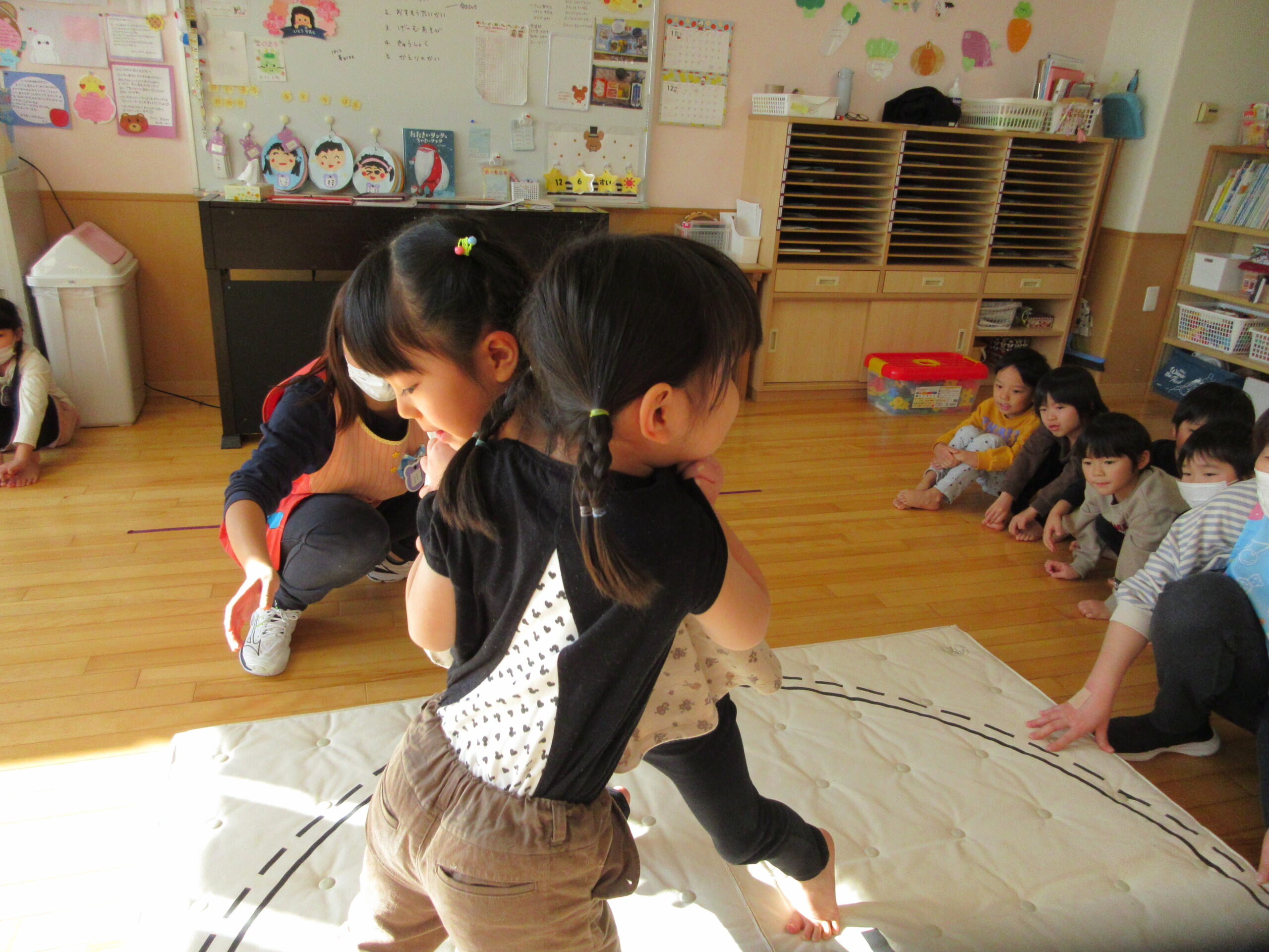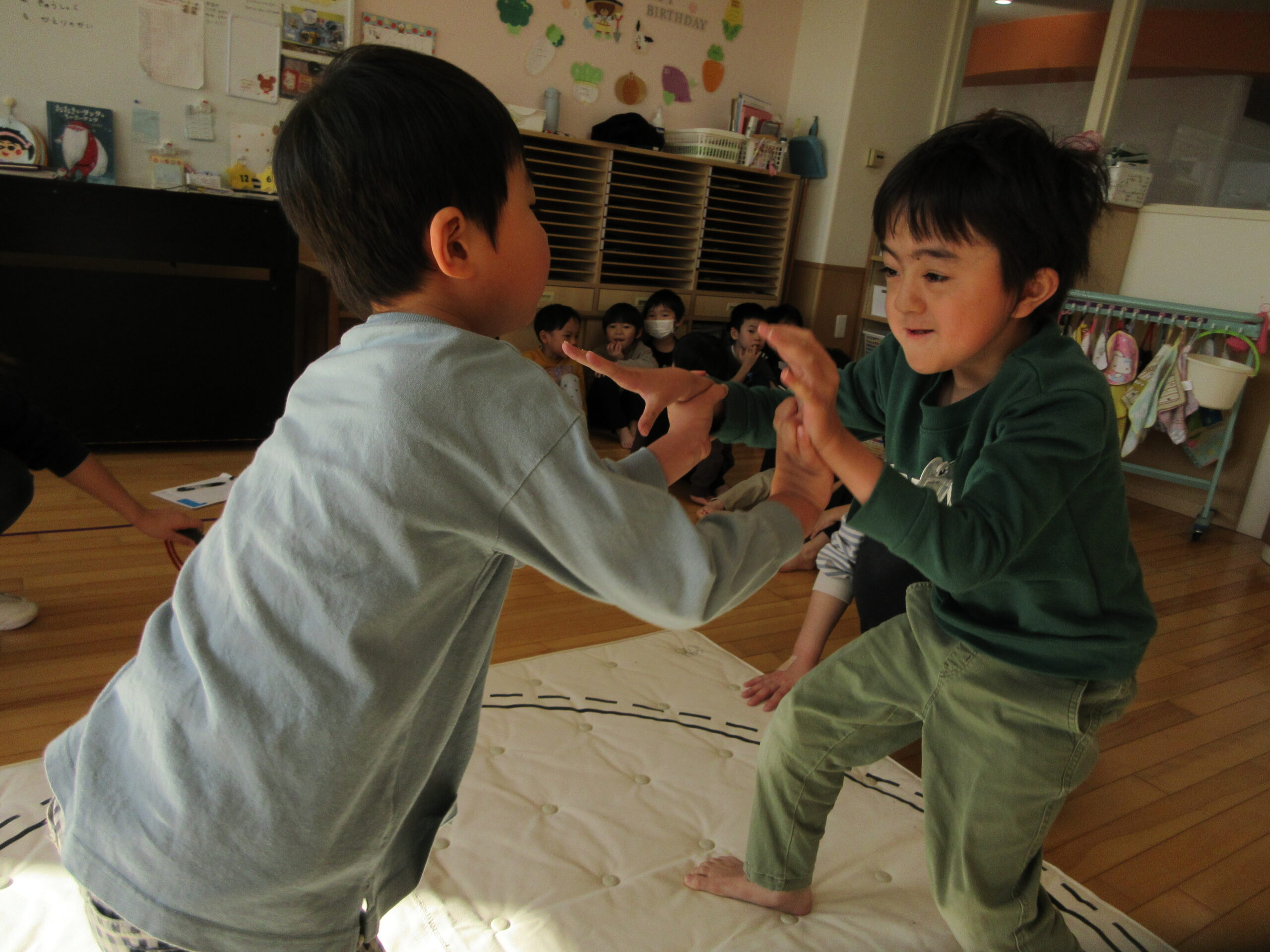 12月6日(水)はお部屋でおすもう大会を行いました。1学期よりもお互い譲らない気持ちが強く、試合時間が長くなるお友達も多くいました。「良い勝負だったね!」や負けて悔しいお友達には「3学期もあるから頑張ろう!」と励ます姿も見られていました。3学期も力を発揮して欲しいと思います!