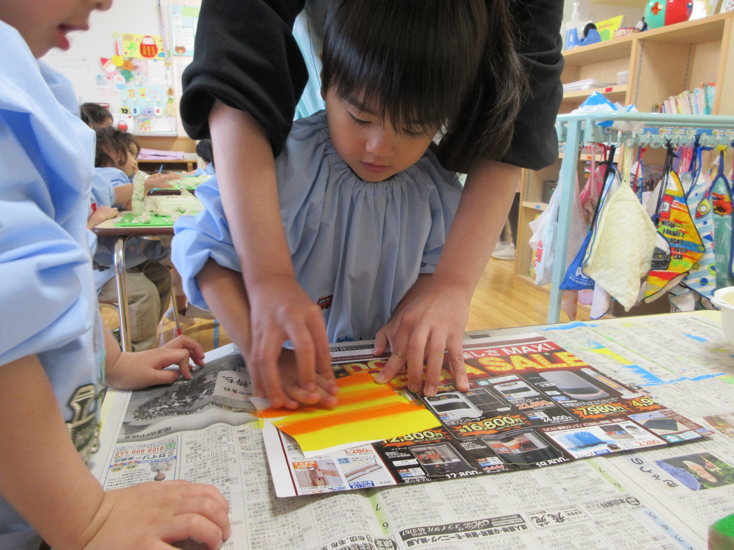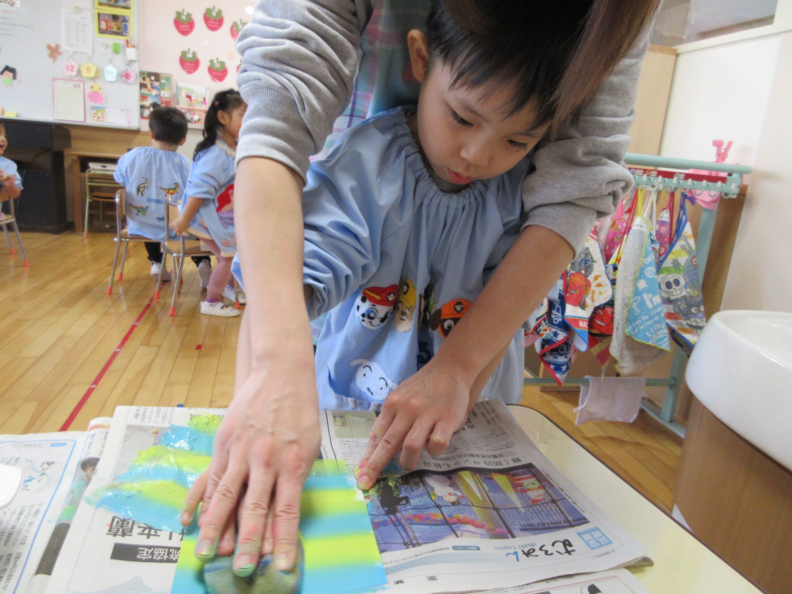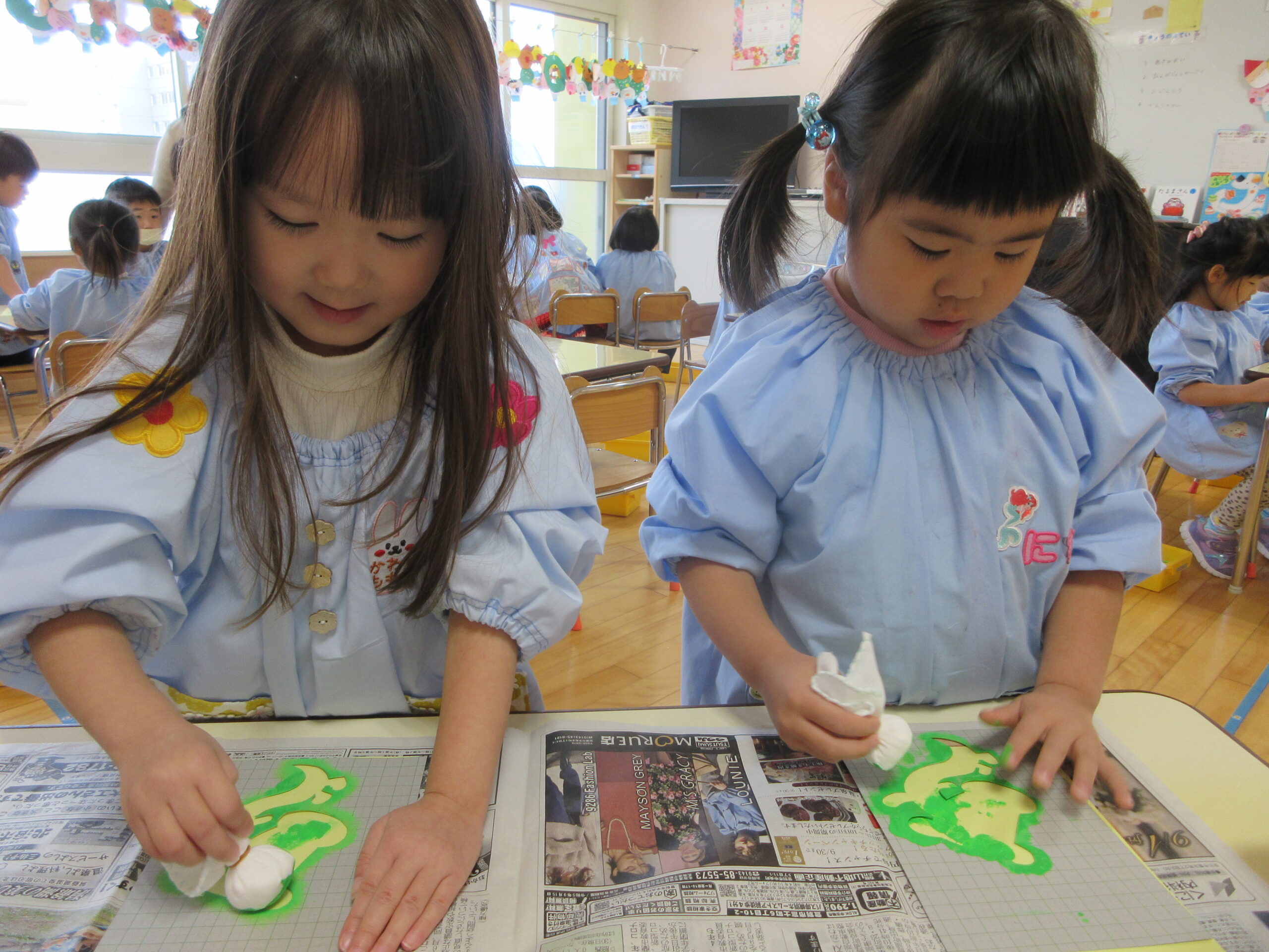 はさみやのりの使い方に成長が見られ、少しずつ製作の難易度も上がってきました。絵の具を使った作品にいくつか挑戦し、様々な表現の方法を楽しむ姿が見られました。