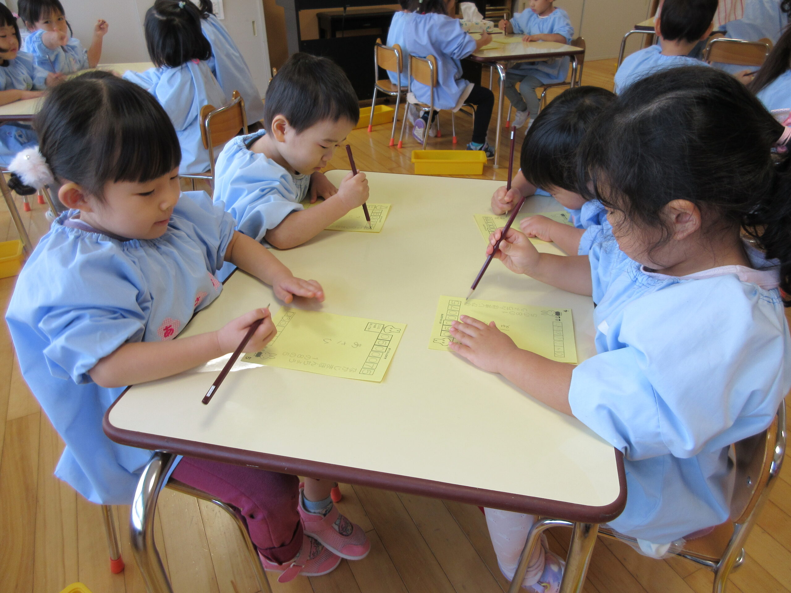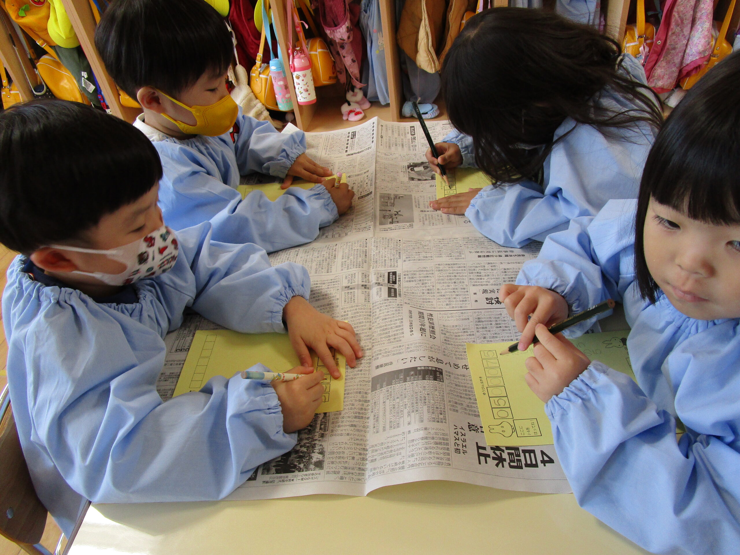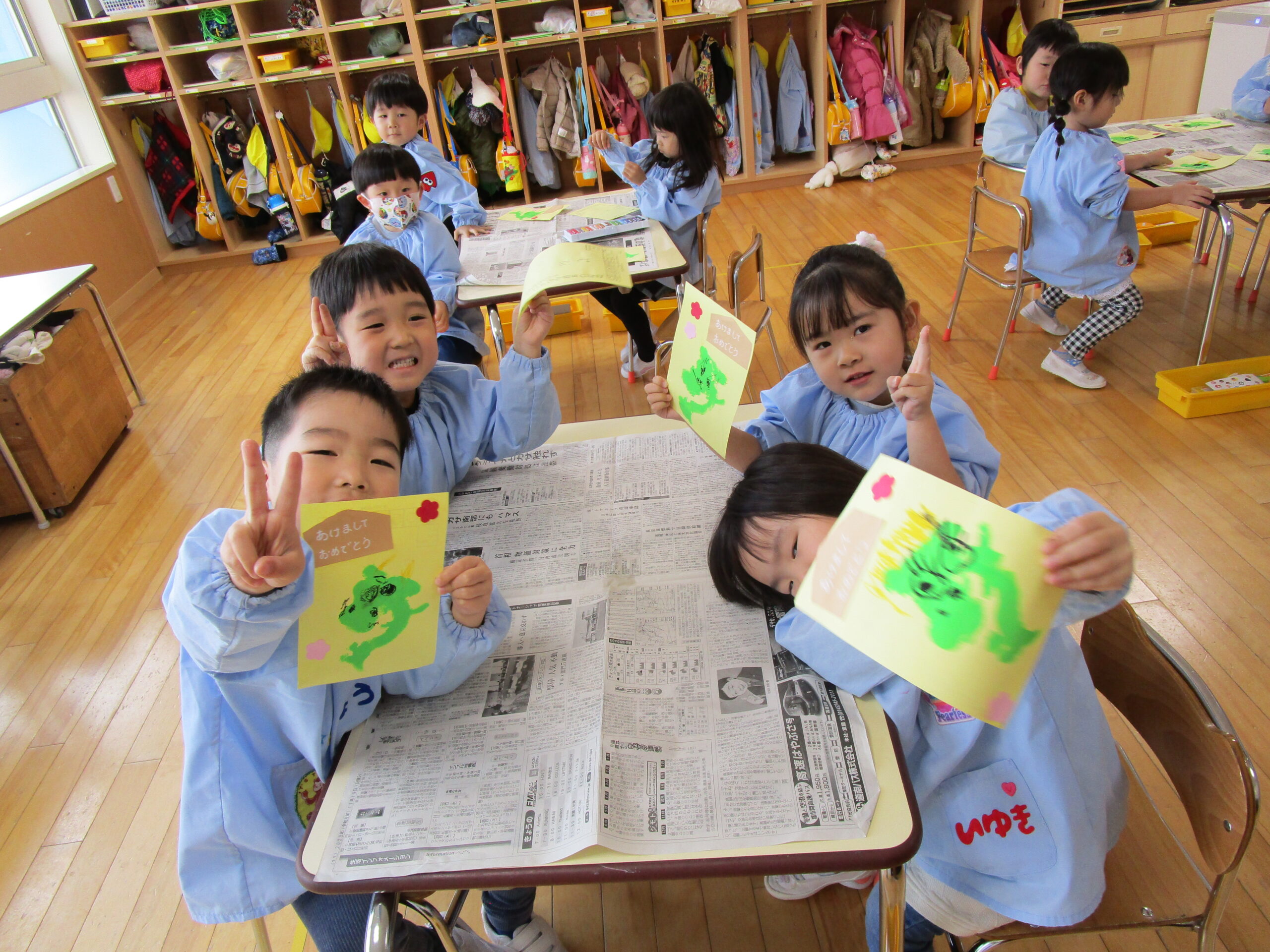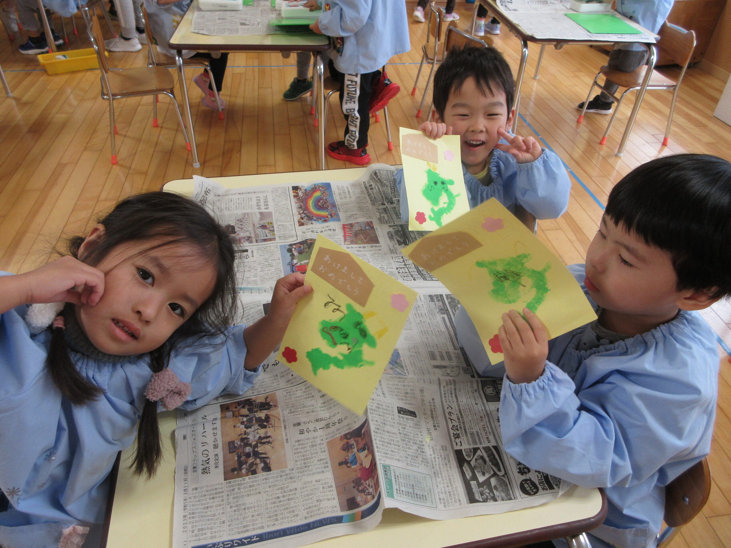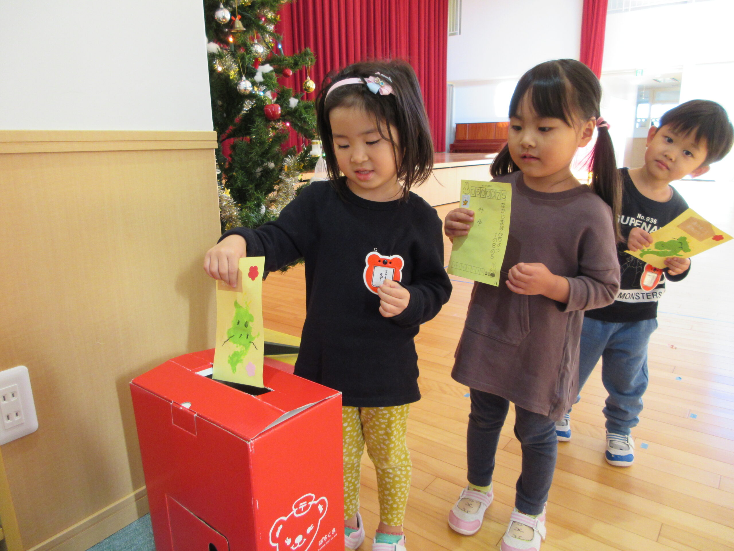 年賀状製作では鉛筆で文字のなぞり書きもしました。難しいかな?と思っていた作業でしたが、薄く書かれた文字を見ながら集中して取り組んでいました。下部は空欄でしたが、好きな数字や文字、形を「むずかしいよ〜」と言いながらも一生懸命記入していました。後日、幼稚園のポストに「届きますように🙏」とみんなで願いを込めて投函しました📮 届くのが楽しみですね♪