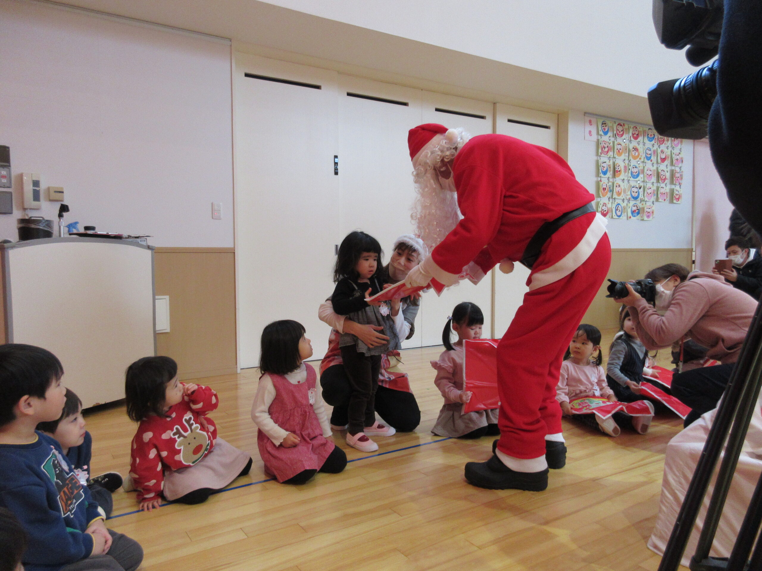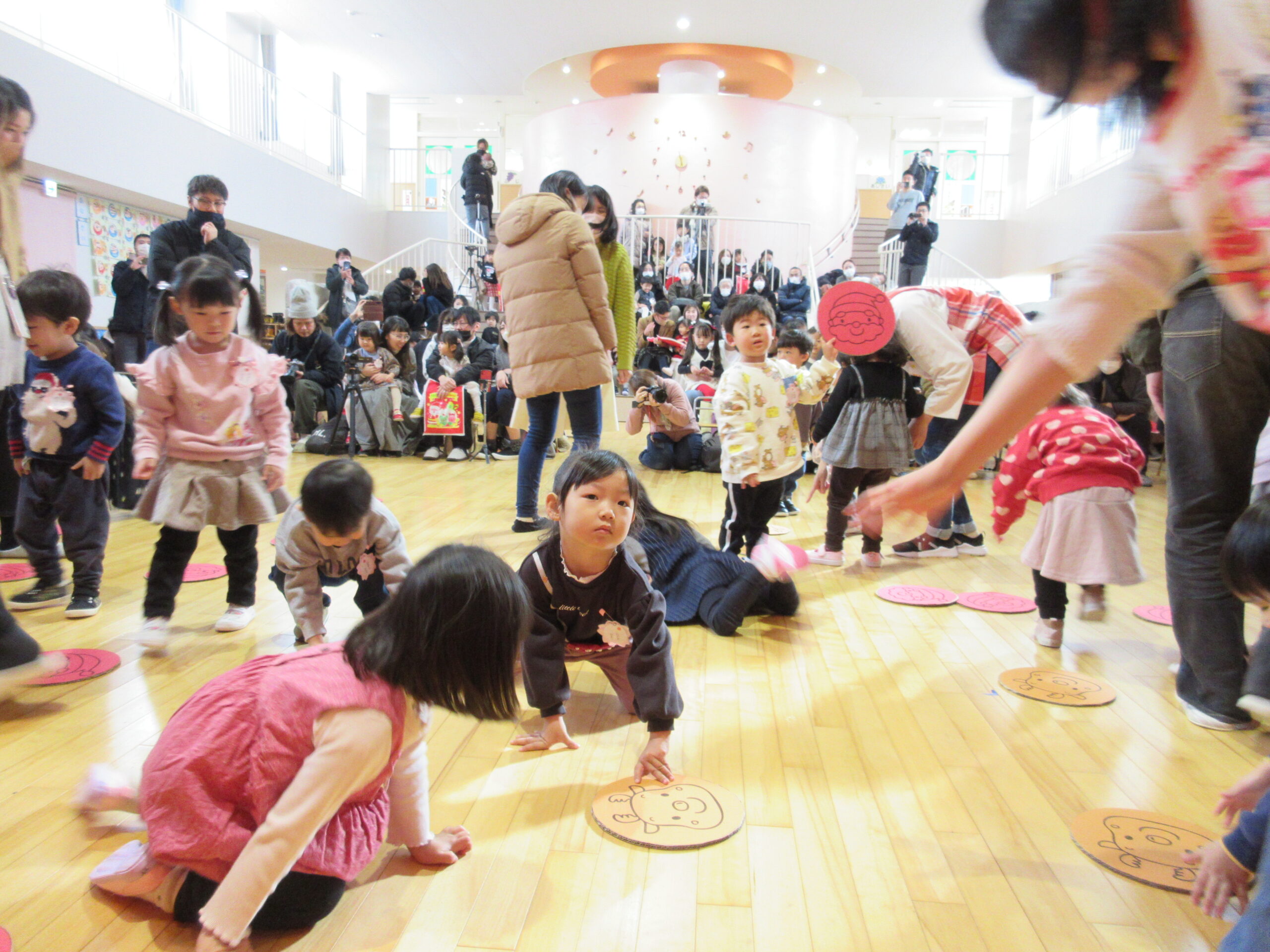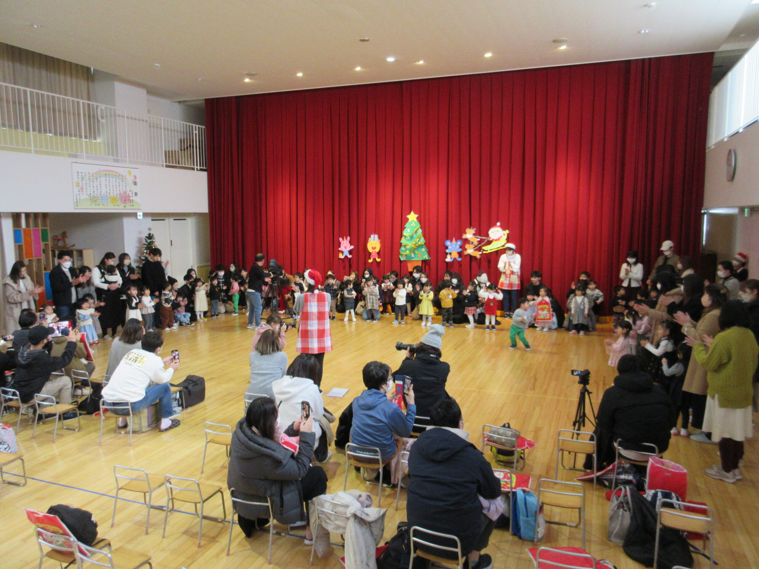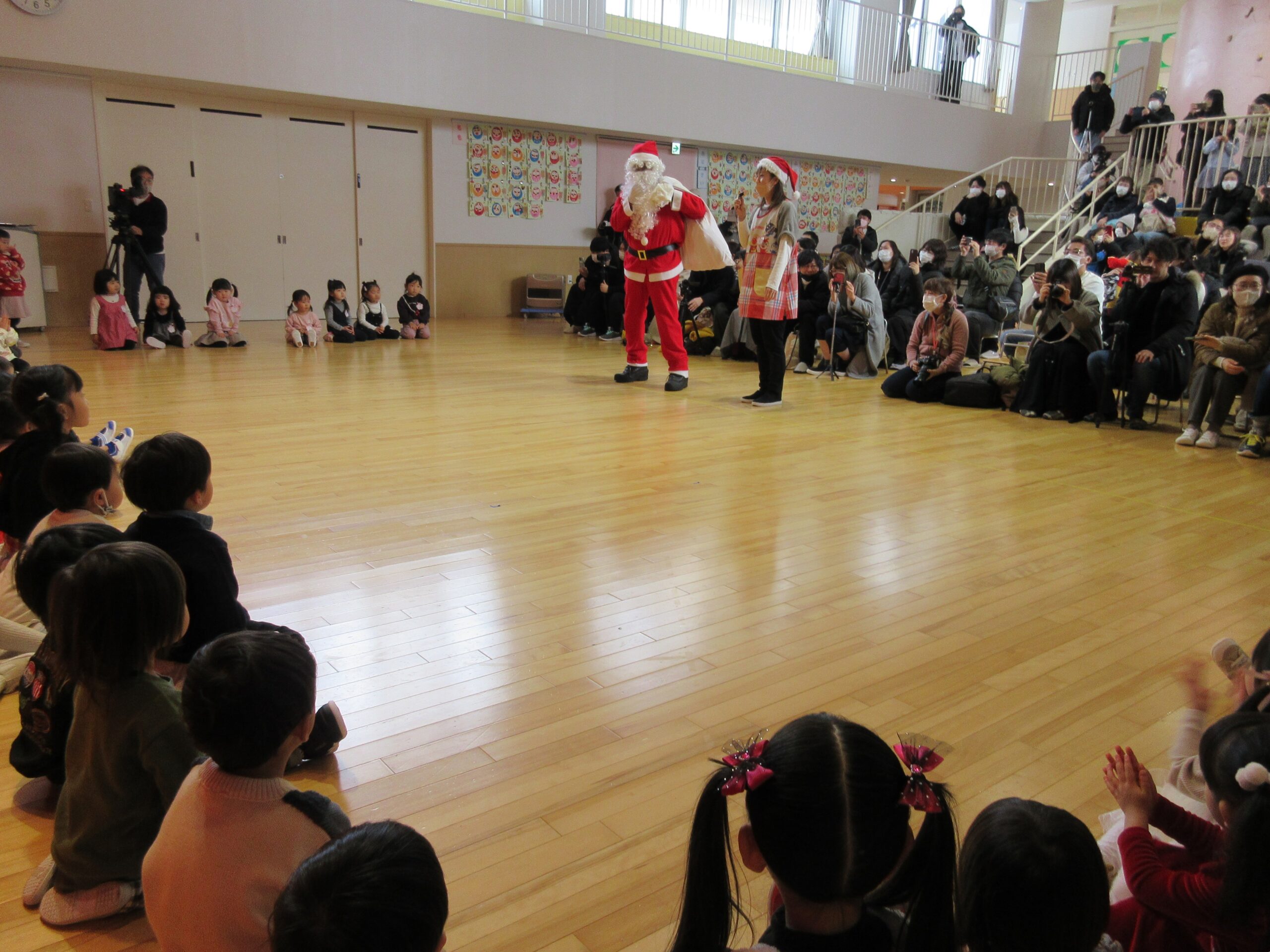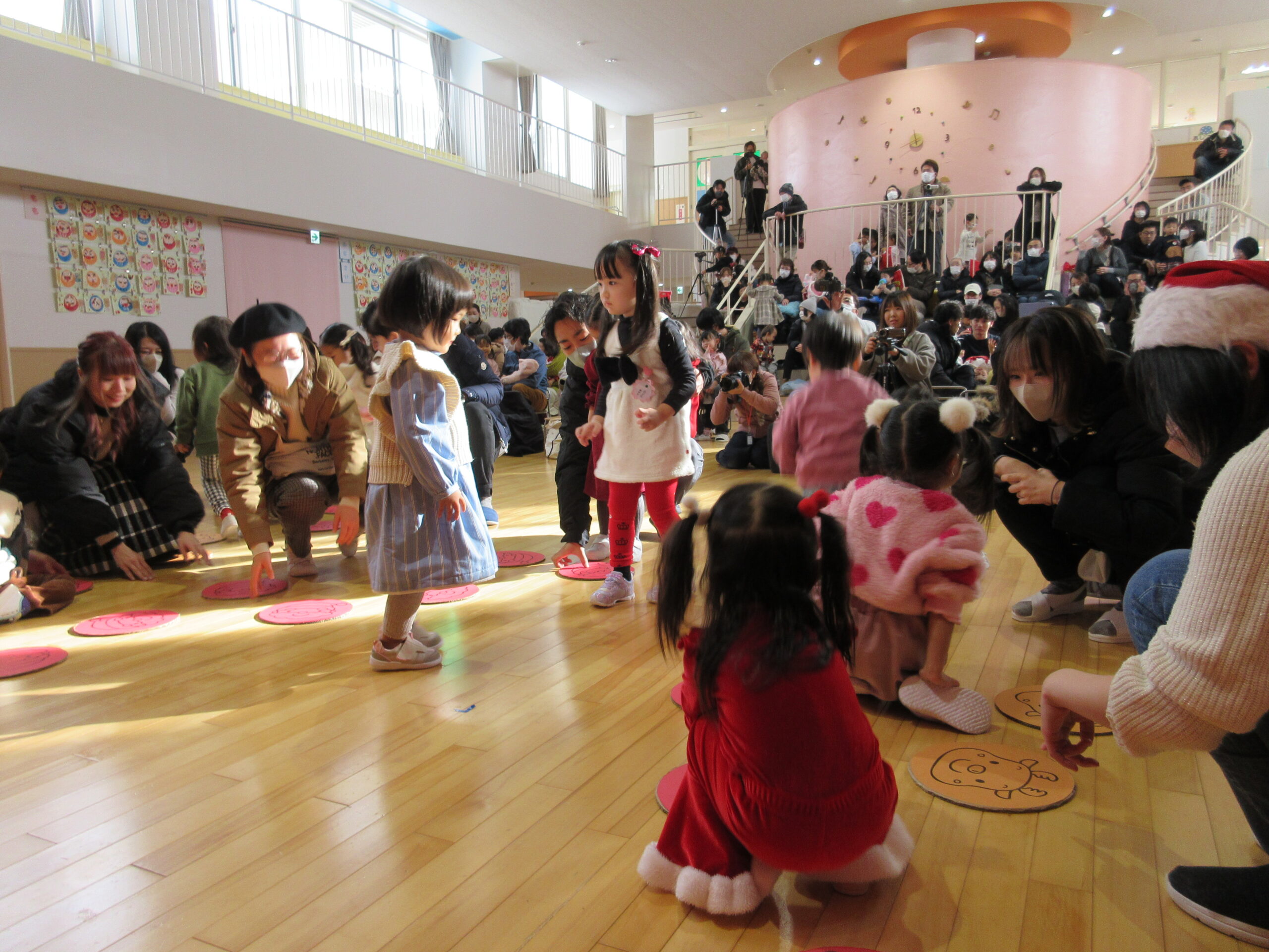(103)令和5年度「プレスクールクリスマス会」 2023年12月19日 園内ブログ 本日12月19日(火)プレスクールのクリスマス会を実施いたしました。3クラスが集う行事は運動会以来で、人数に圧倒されているお子さんもいましたが、器楽や手話歌は練習の成果を発揮して披露することができていました。短い時間ではありましたが、サンタさんとの交流、親子対抗オセロゲームを楽しむことができました🎅参観頂きました保護者の皆様、有難うございました。