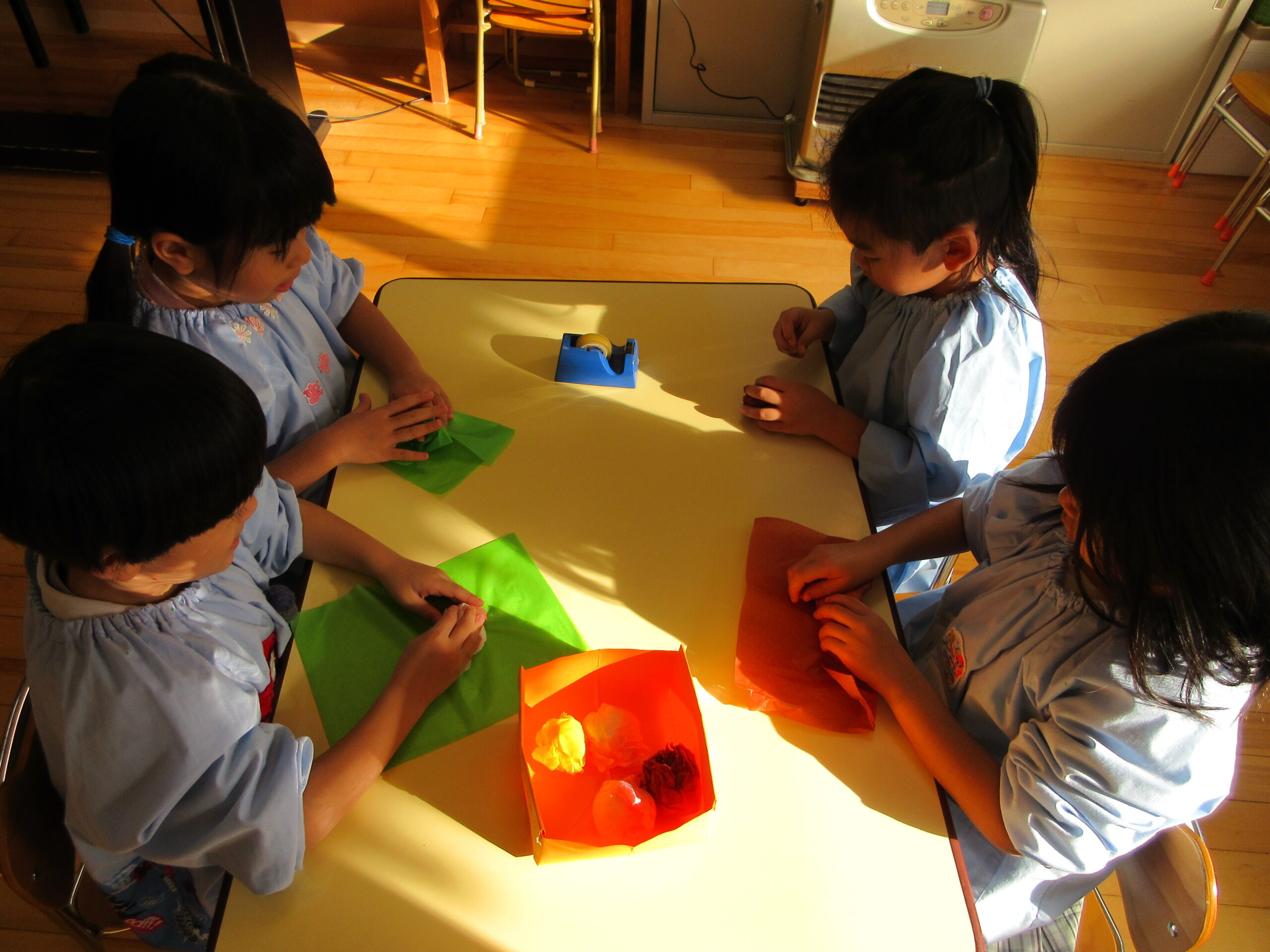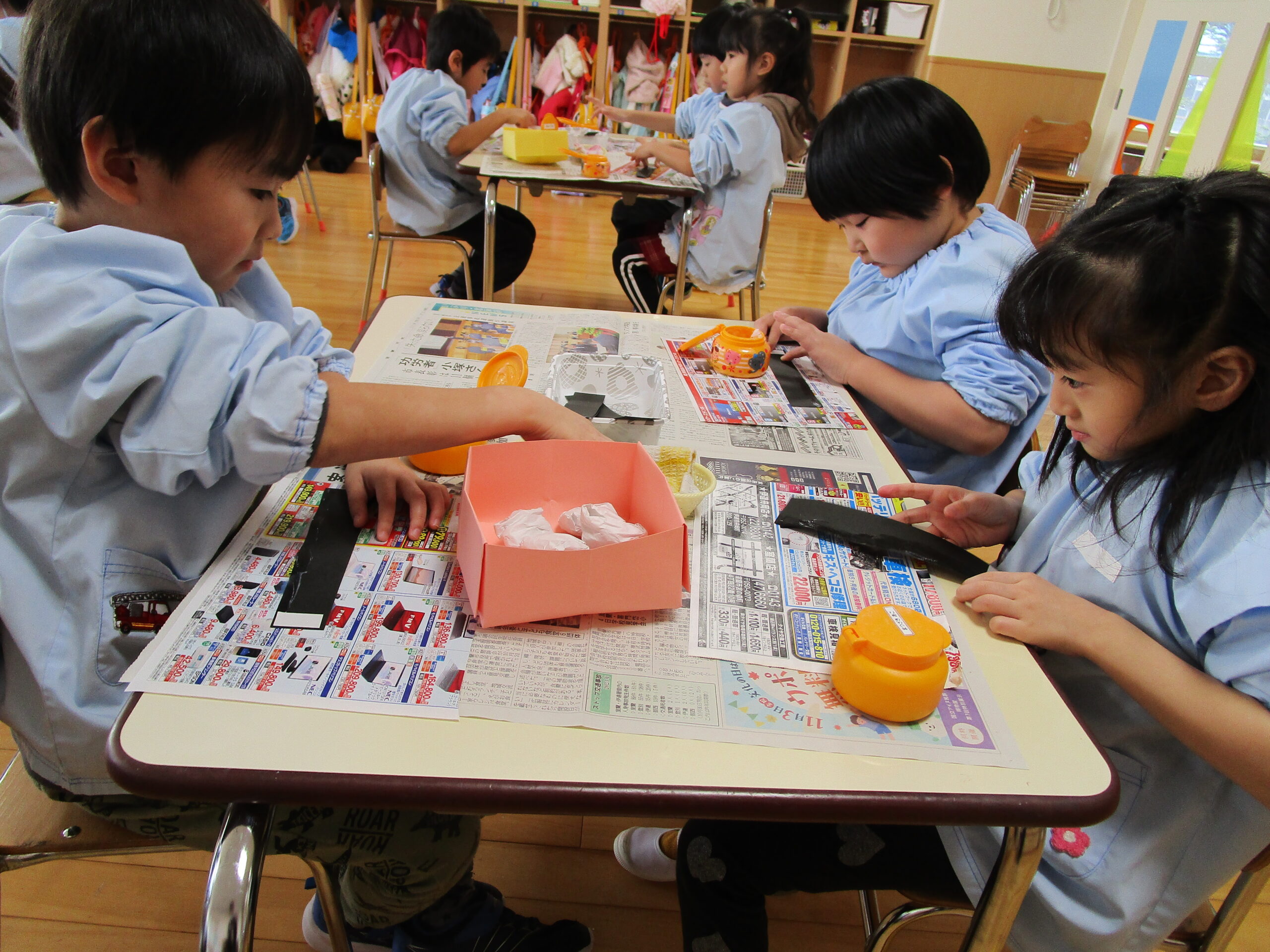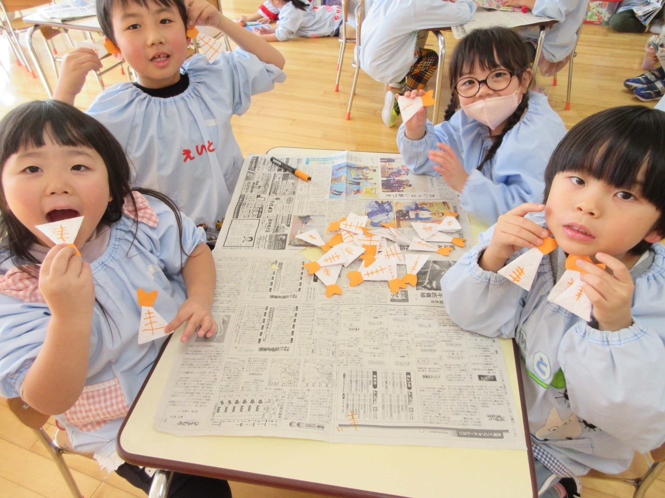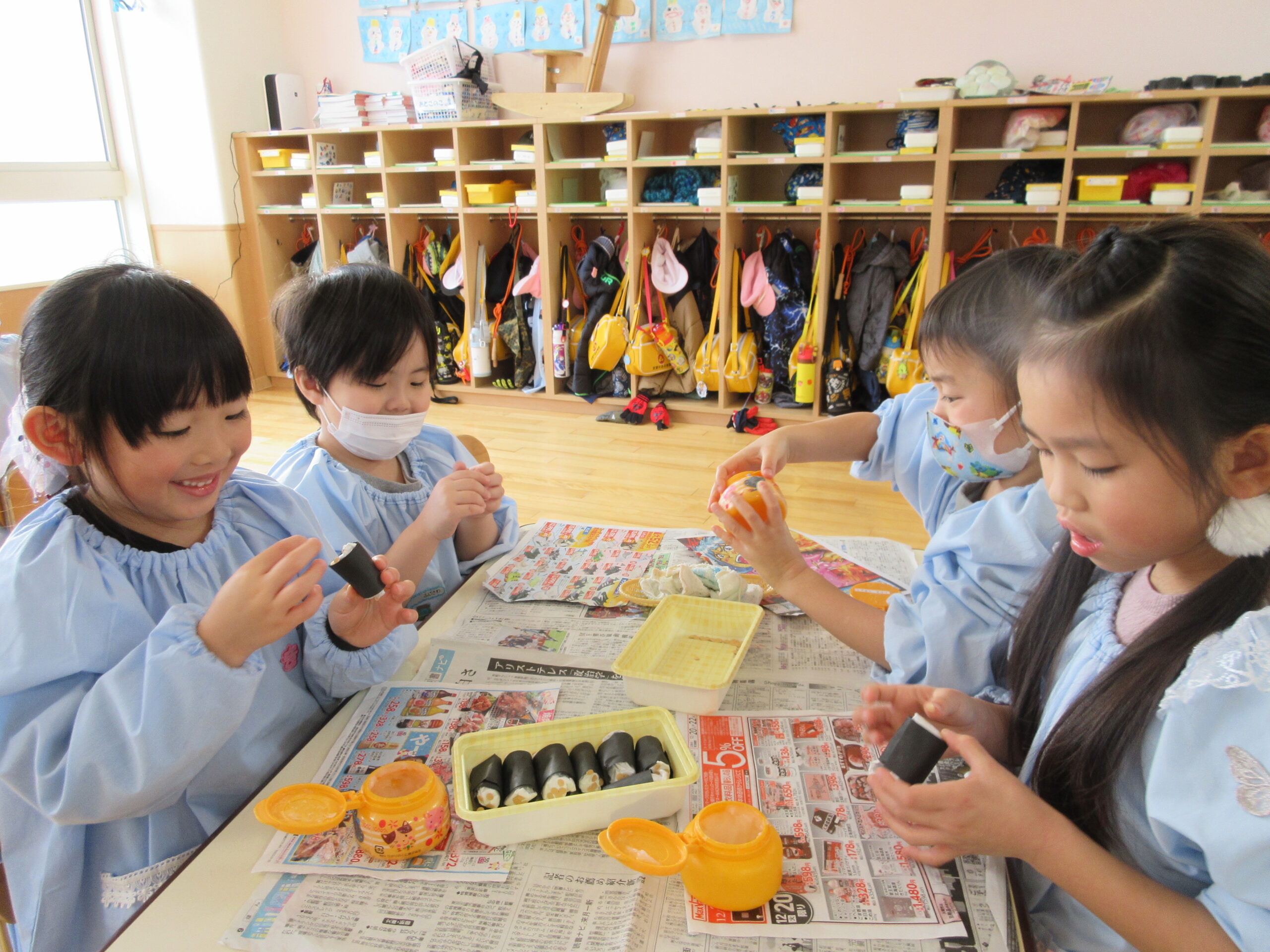 年長さんは、シャリとネタや軍艦の担当でした。マグロやえびなどのネタを折り紙で作り、年中さんが作ってくれた軍艦用のシャリに海苔を付けました。最初は全学年の量を作ることに驚いていましたが、徐々にお寿司を作ることに楽しさを感じ「一丁お待ち!」とお寿司屋さんになりきって取り組む姿がありました。