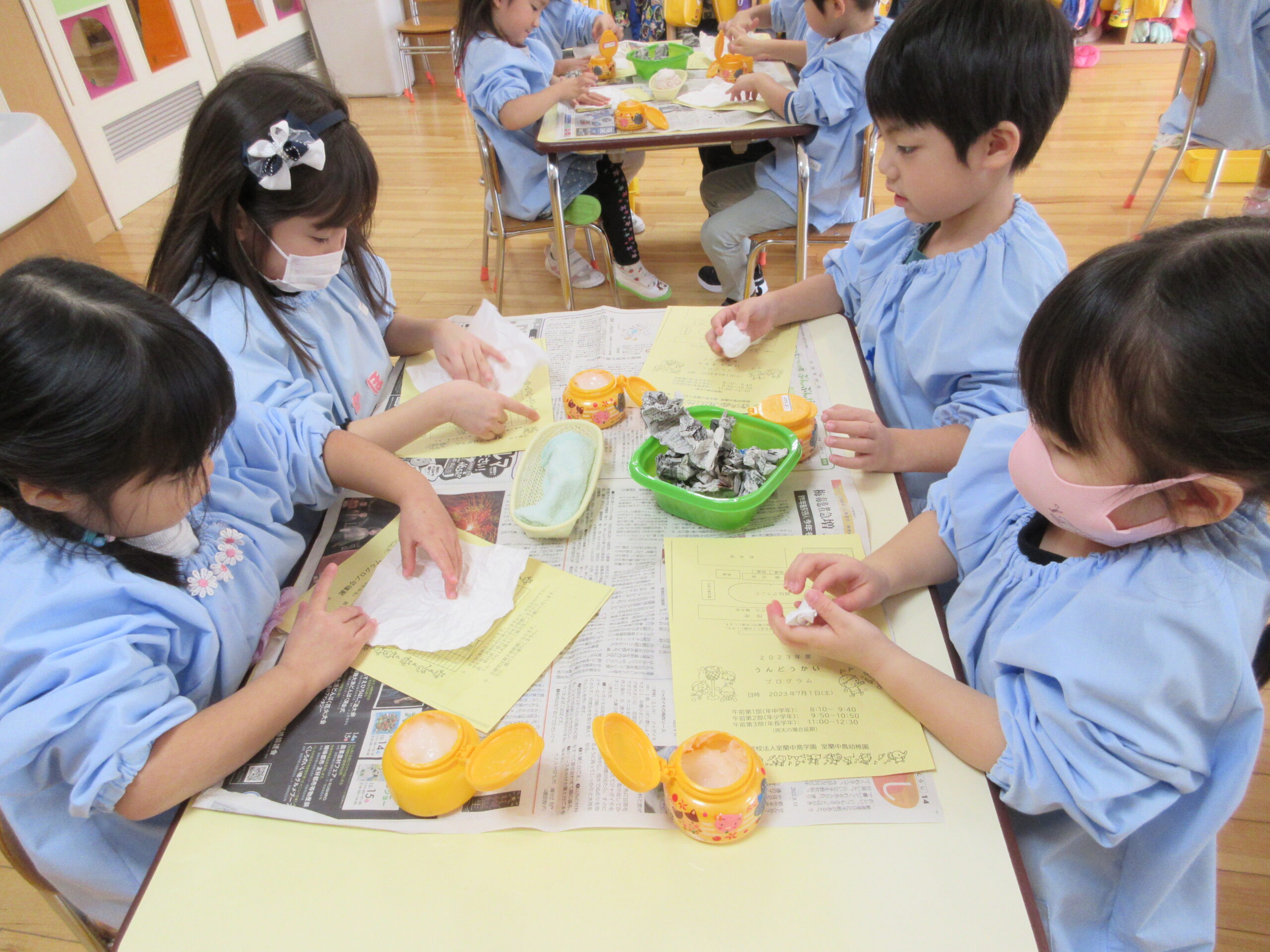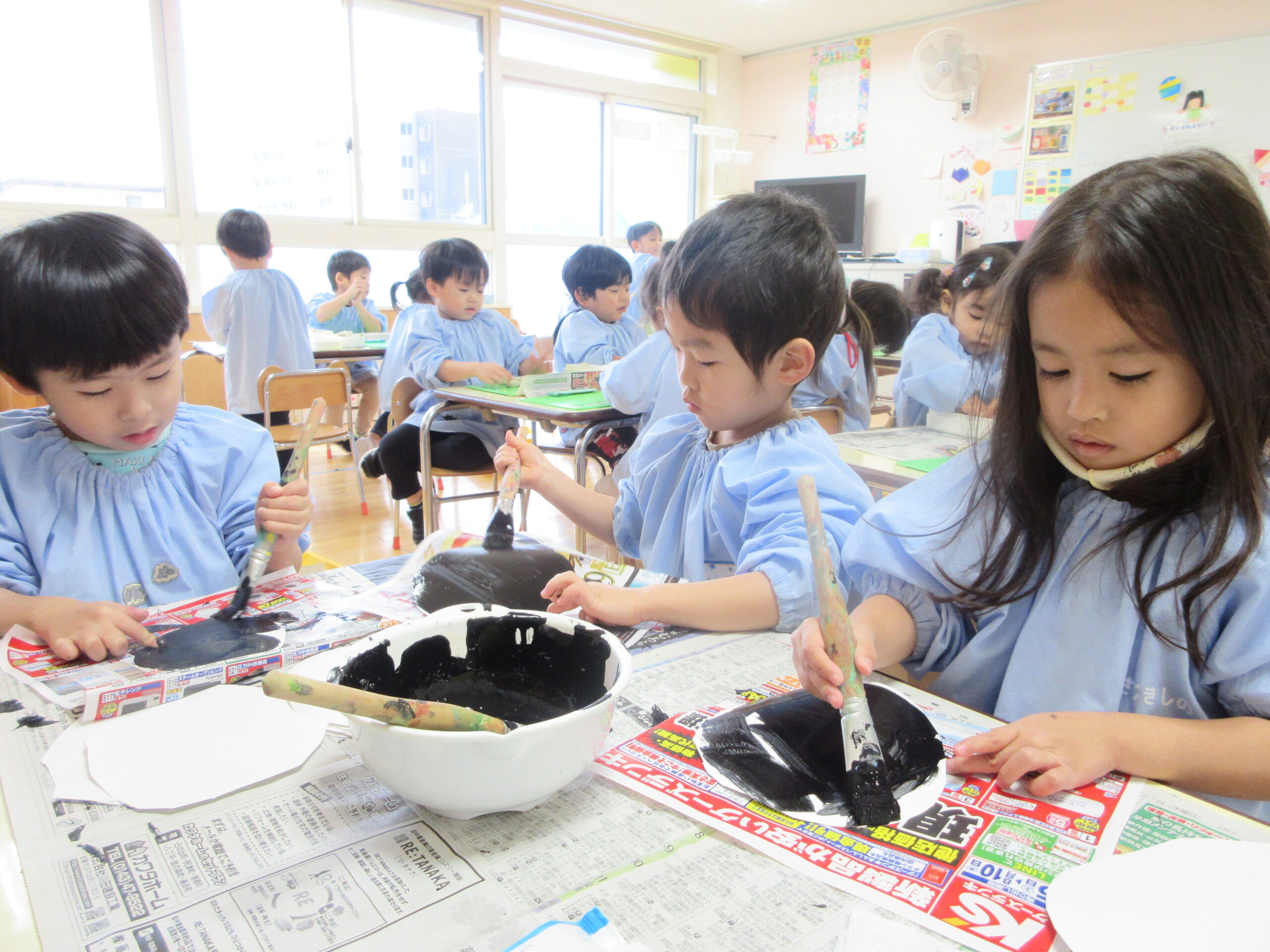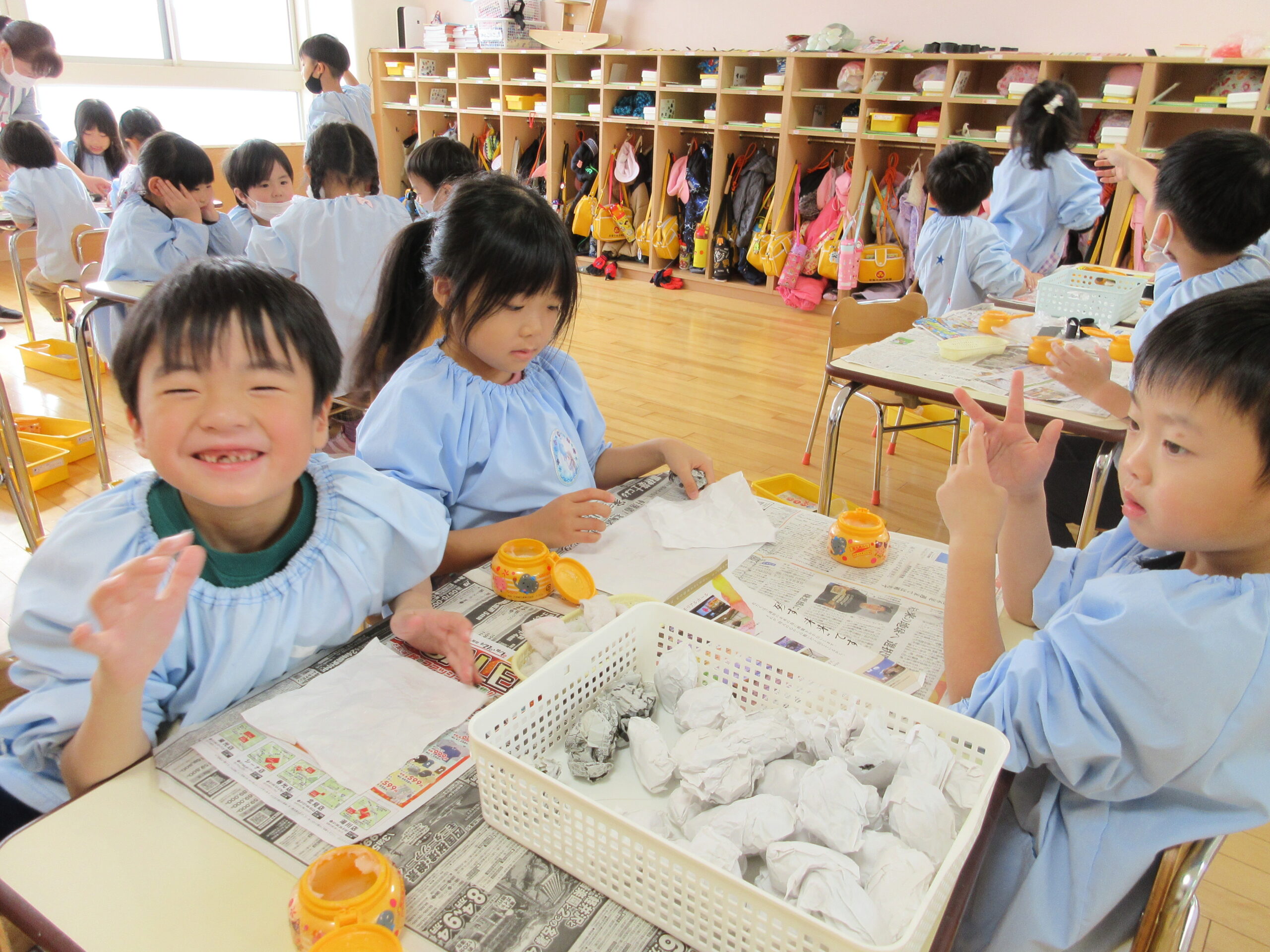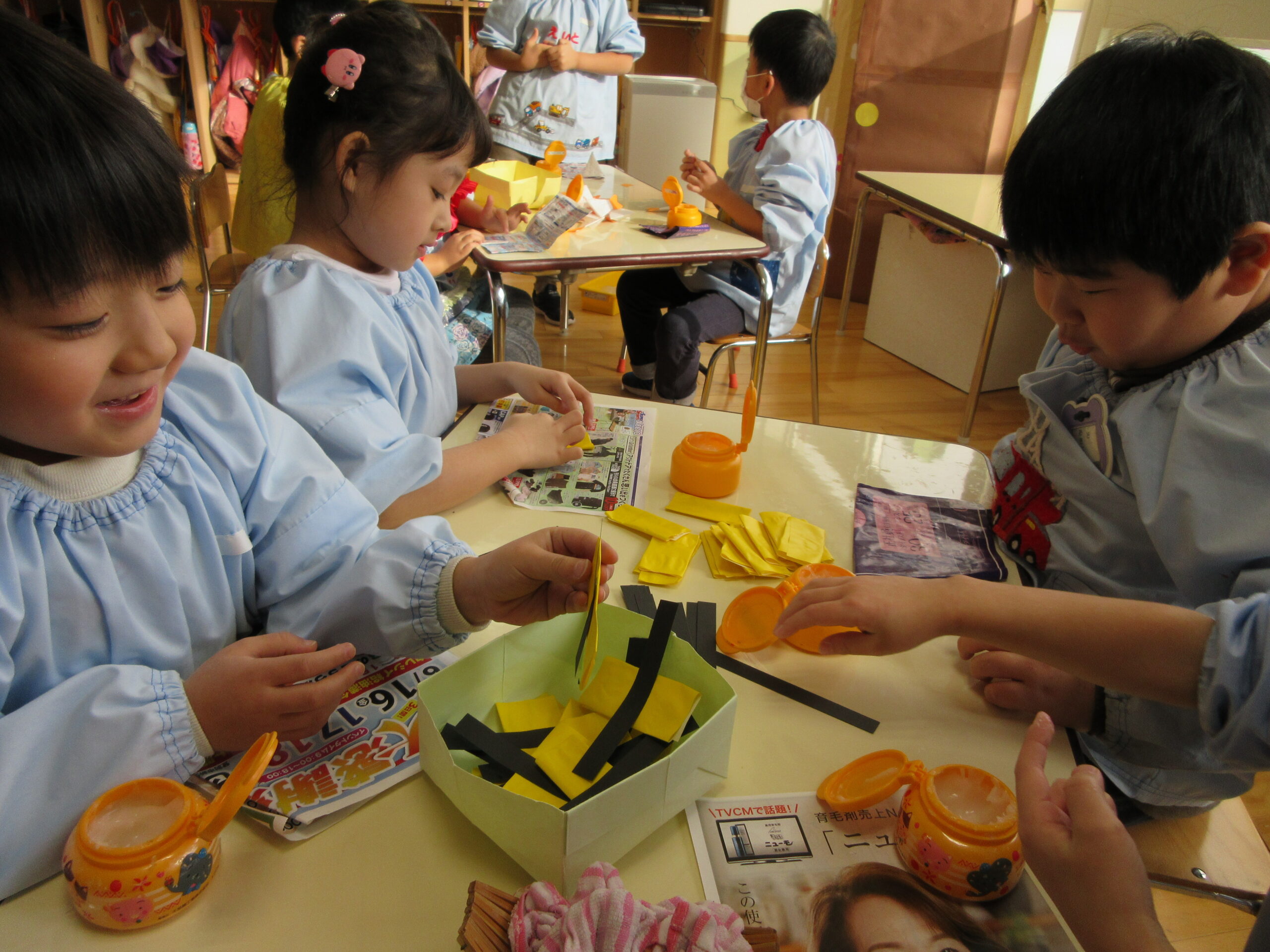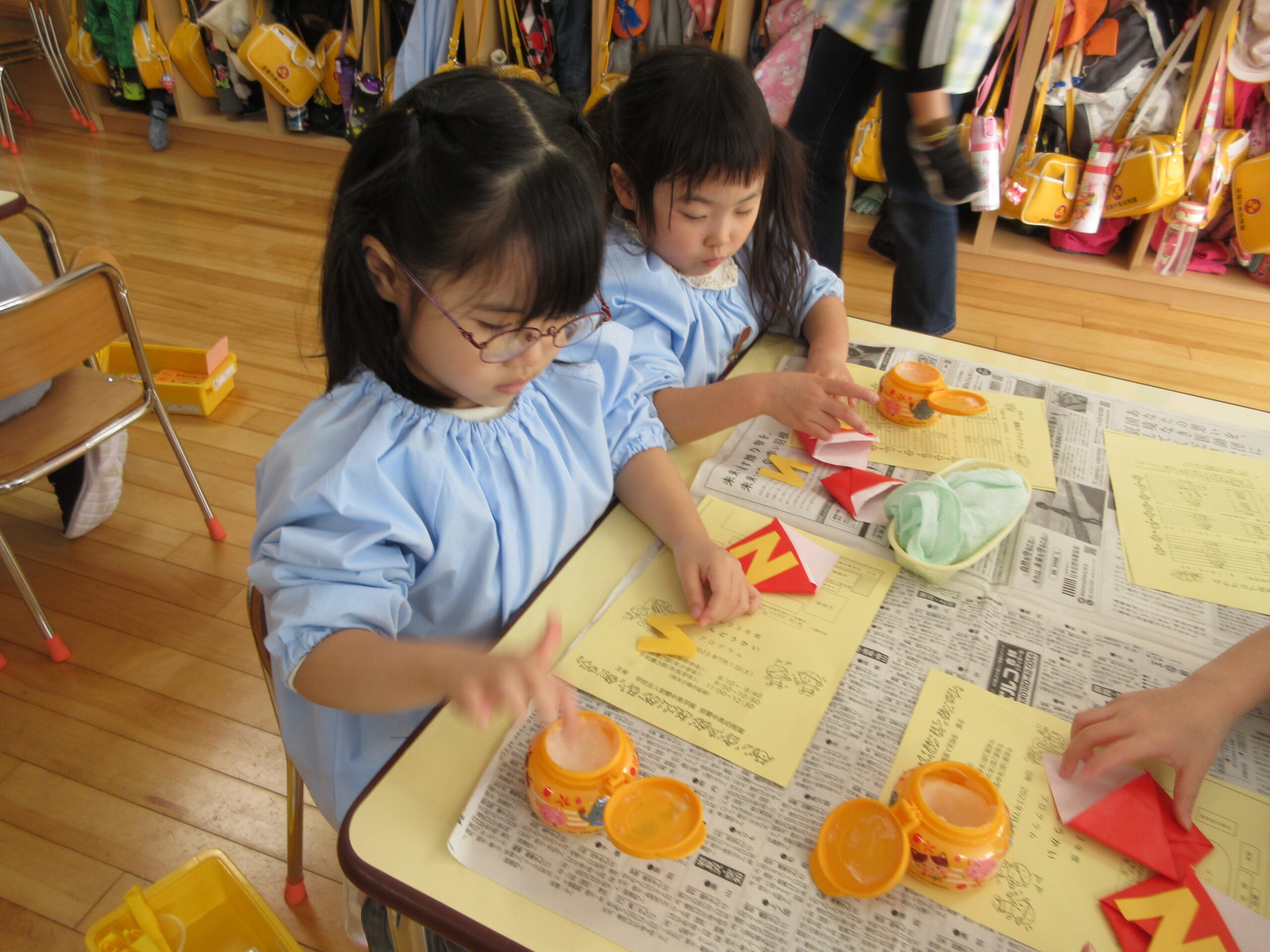 年長さんは、シャリとネタや軍艦の担当でした。マグロやえびなどのネタを折り紙で作り、年中さんが作ってくれた軍艦用のシャリに海苔を付けました。最初は全学年の量を作ることに驚いていましたが、徐々にお寿司を作ることに楽しさを感じ「一丁お待ち!」とお寿司屋さんになりきって取り組む姿がありました。