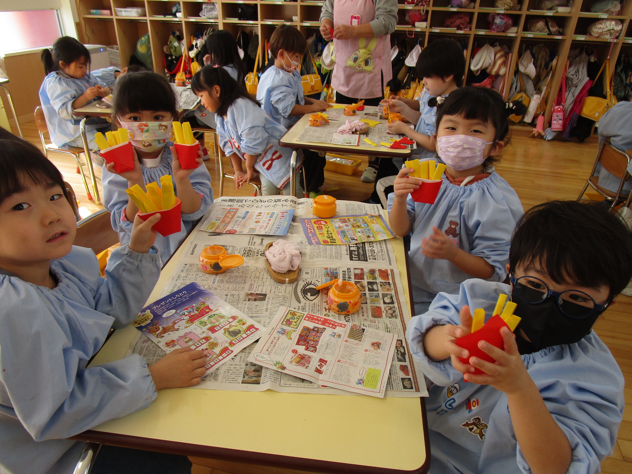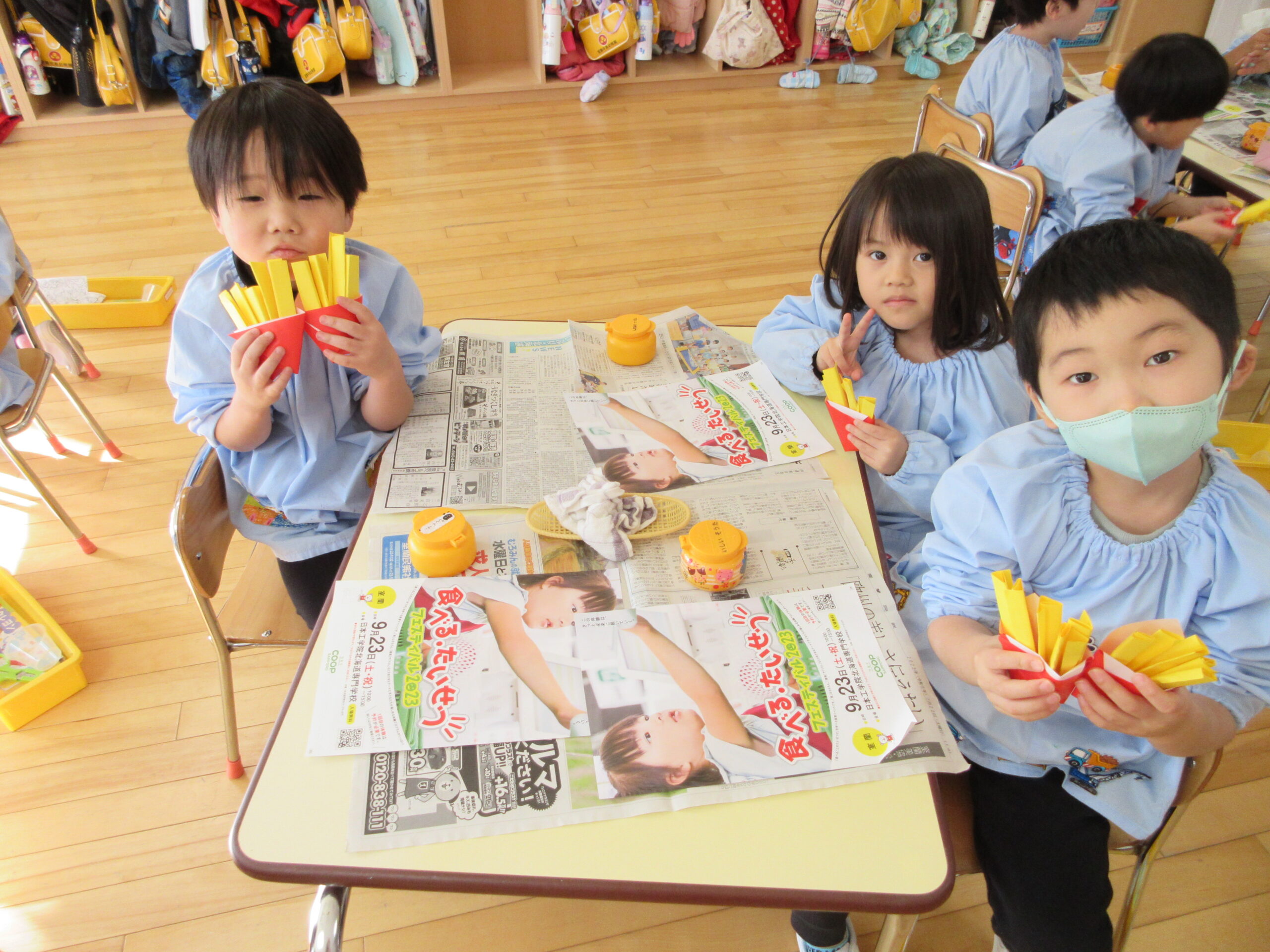 年中さんは、軍艦と巻物のシャリとサイドメニューのポテト、アイスを担当しました。シャリは新聞紙を白い折り紙で包む作業を行いましたが、本物のお寿司をイメージしながら握る力を加減し、形を整えながら作りました。サイドメニューのポテトとアイスは子ども達に大人気で「マックみたい!」と進んで沢山のポテトとアイスを作っていました。ポテトの箱には中島幼稚園の「N」のマークを付けました♪