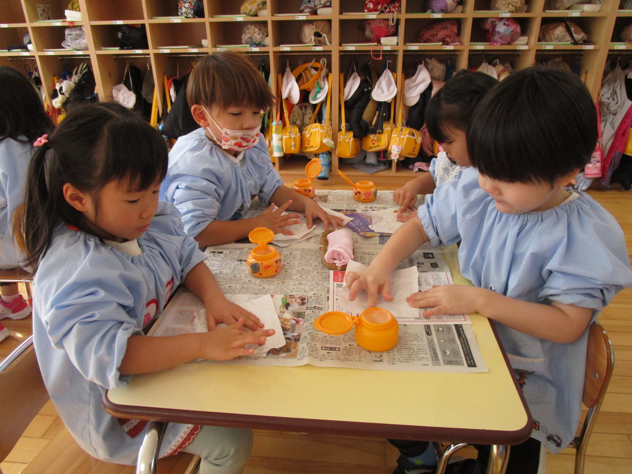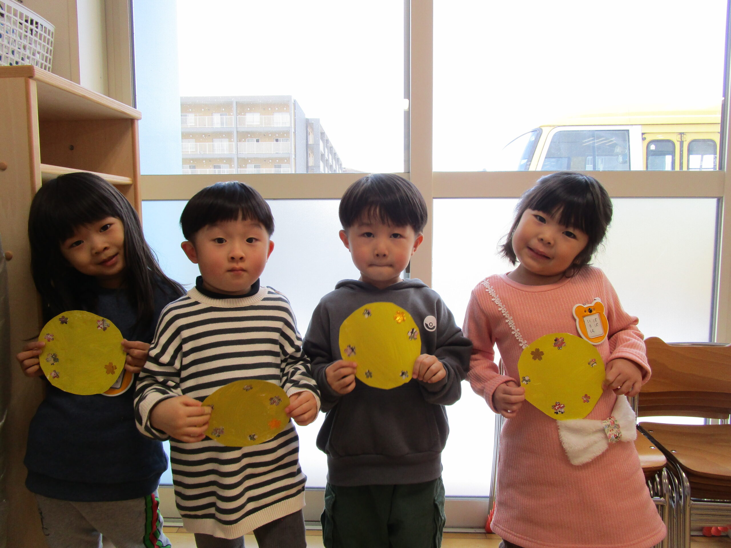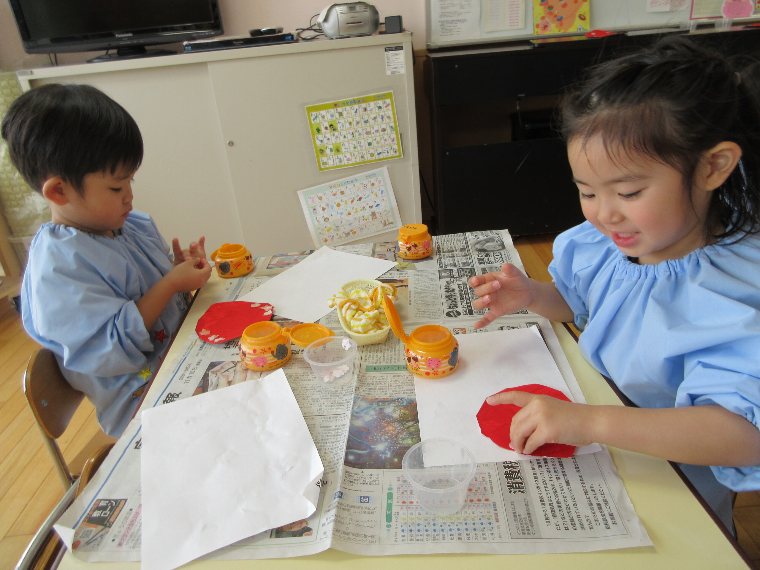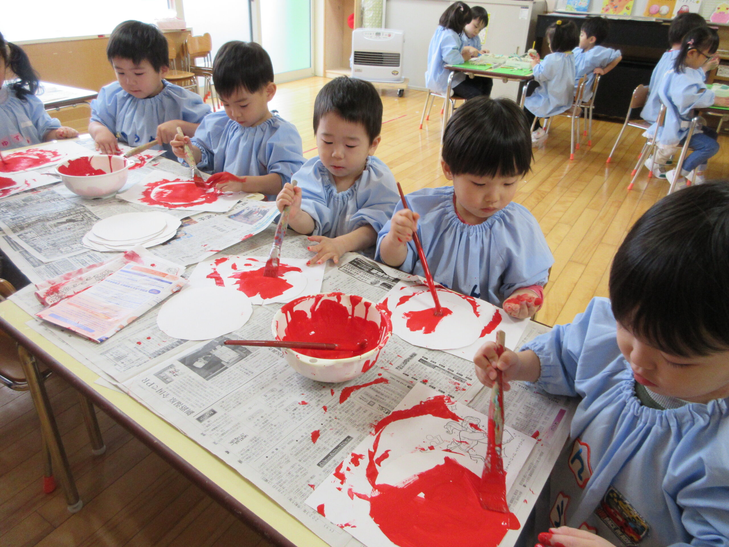 年少さんの担当はお皿です。少し硬い紙をはさみで丸く切り、絵の具で色付けをしてから、のりで飾りを貼りました。全学年分のお皿をみんなでつくったので、「たくさんあると大変だ!」との声もありましたが、絵の具の作業が1番楽しかったようで、伸び伸びと色を塗る様子が見られました。
