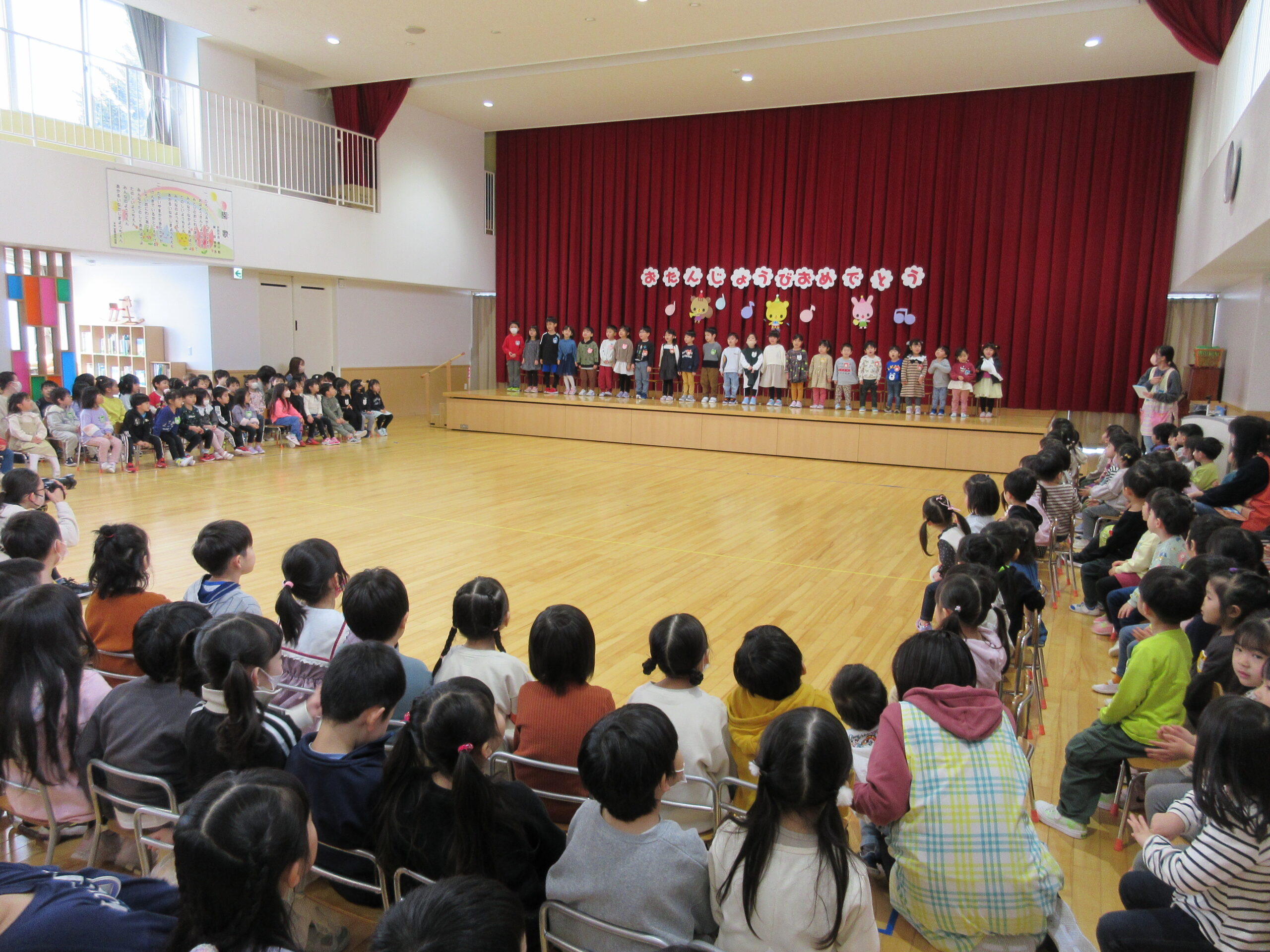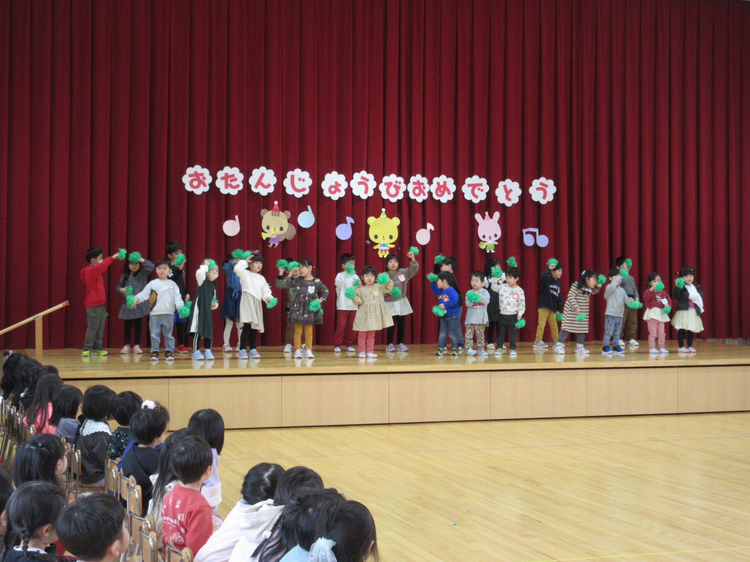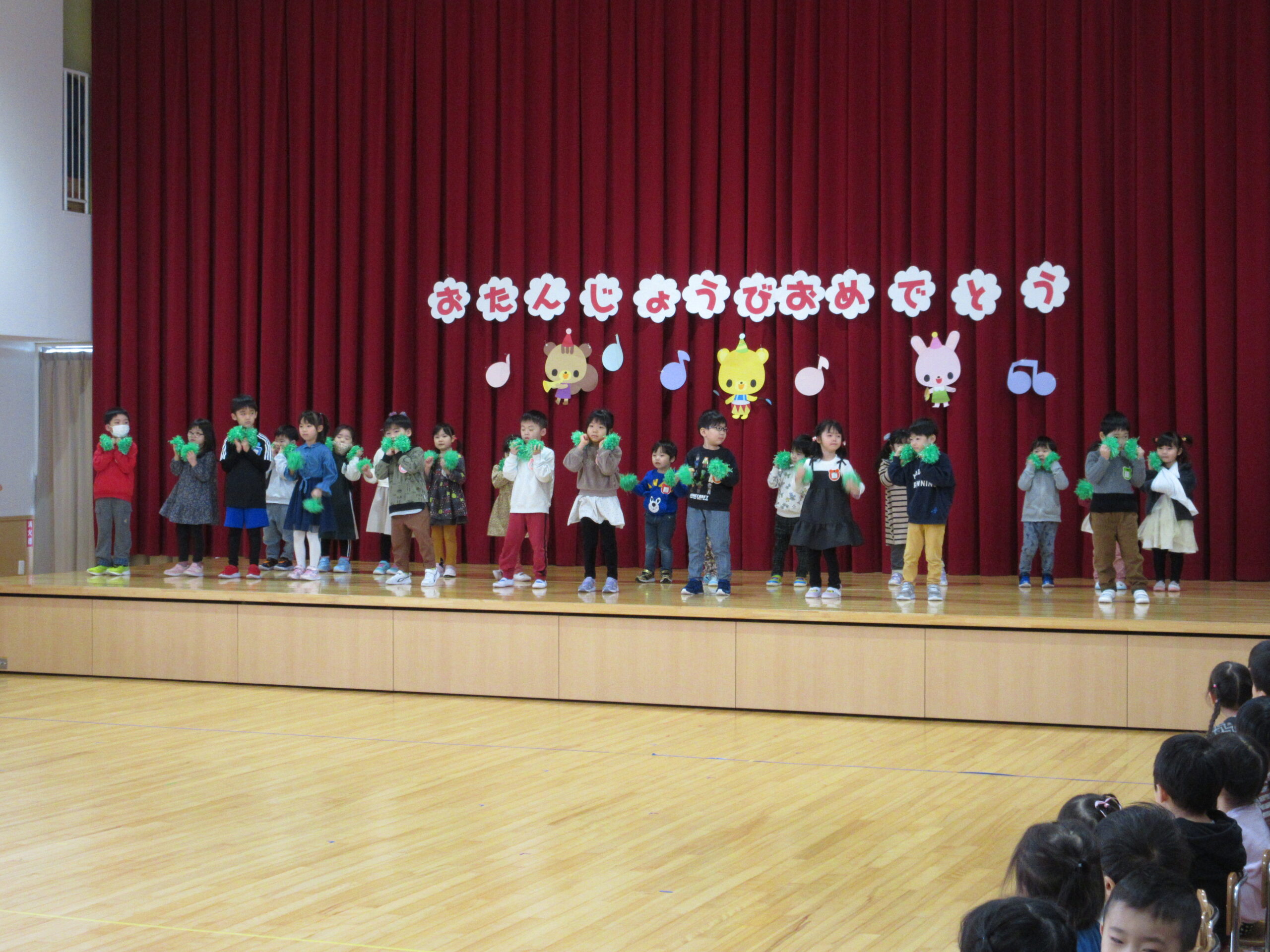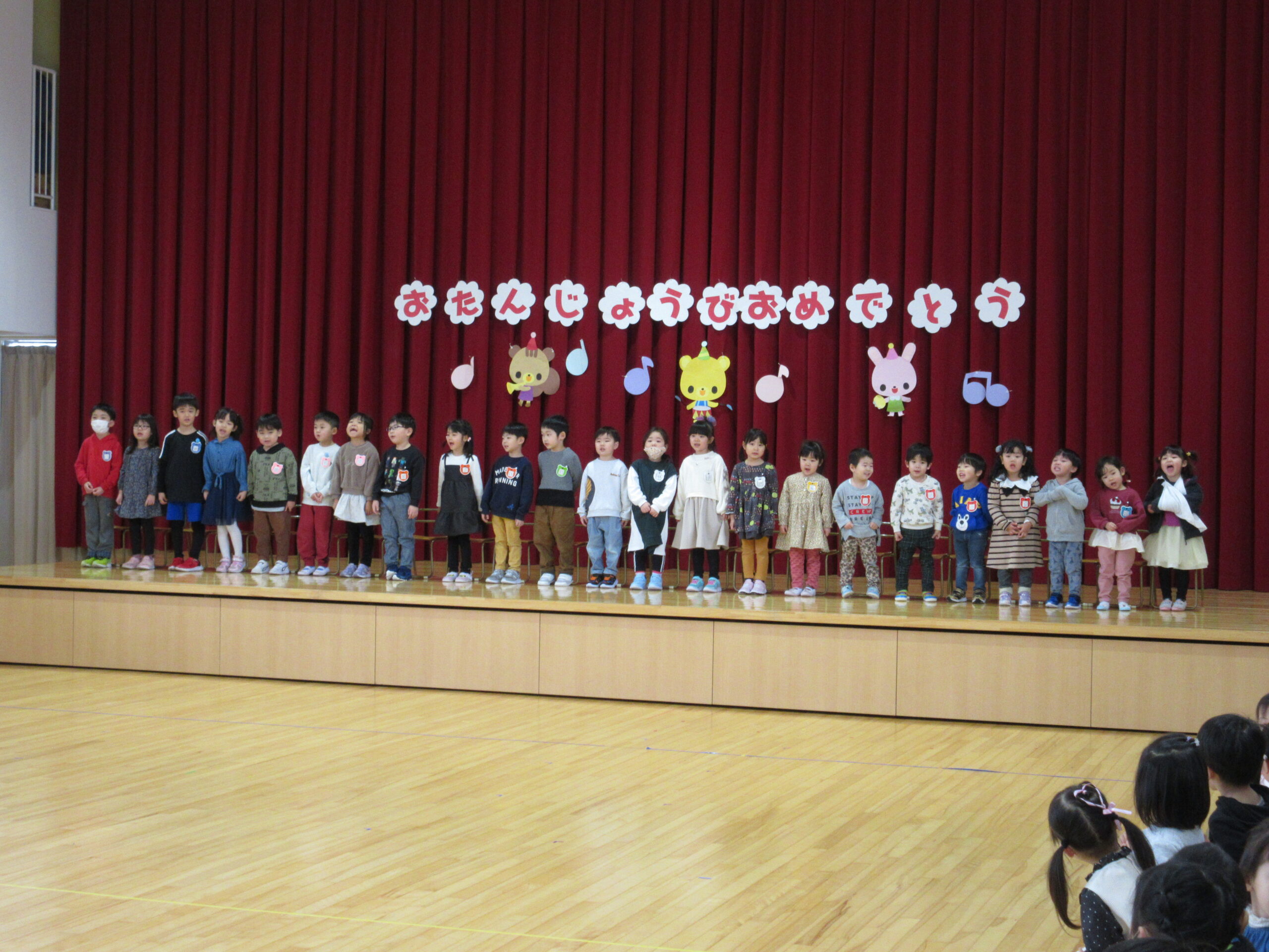 本日1月31日(水)1月生まれのお誕生会を実施しました。23名のお友だちは冬休み明けからの練習でしたが、集中して取り組み、皆さん自己紹介、踊りと上手に披露することが出来ていました。お誕生会後は伝言ゲームをしました。学年に応じて言葉選びをし最初のお友だちから最後のお友だちまで言葉(情報)が変わらなく、子ども達は相手の言葉を一生懸命聞き、伝えることが出来ていました。丁寧に正しく伝える大切さを学びますね!ゲームのルールを守りながら楽しんで参加することができていました。