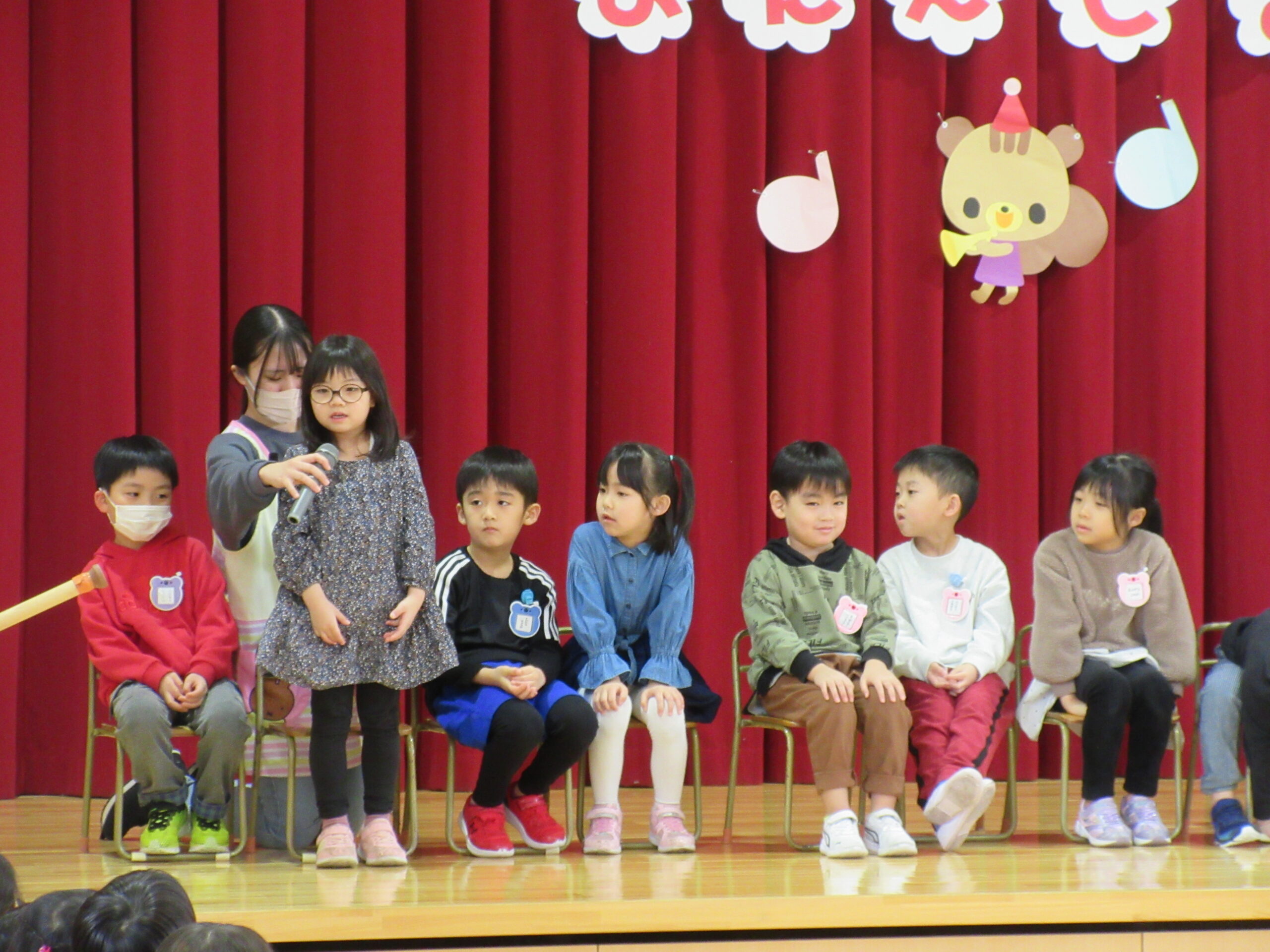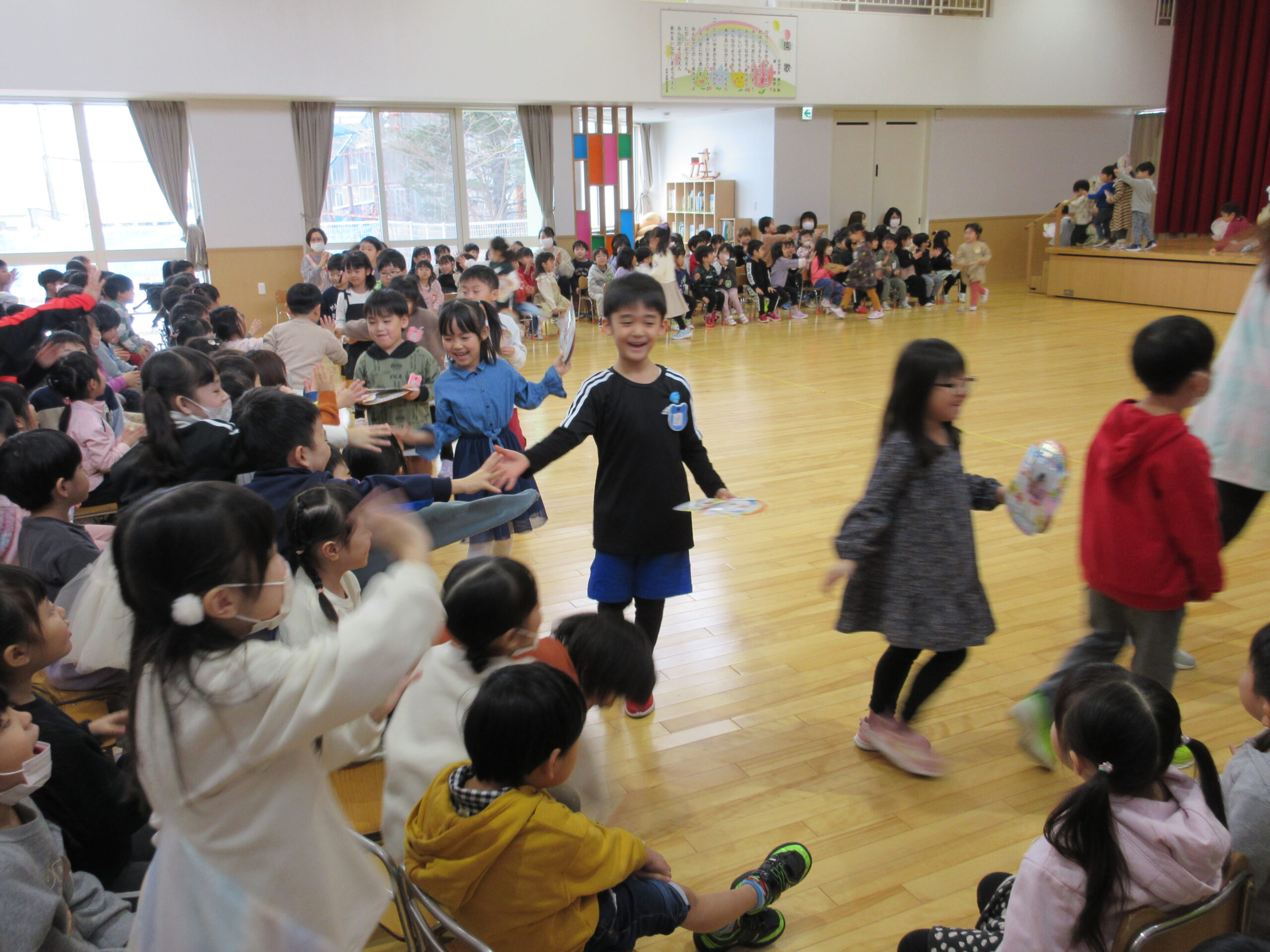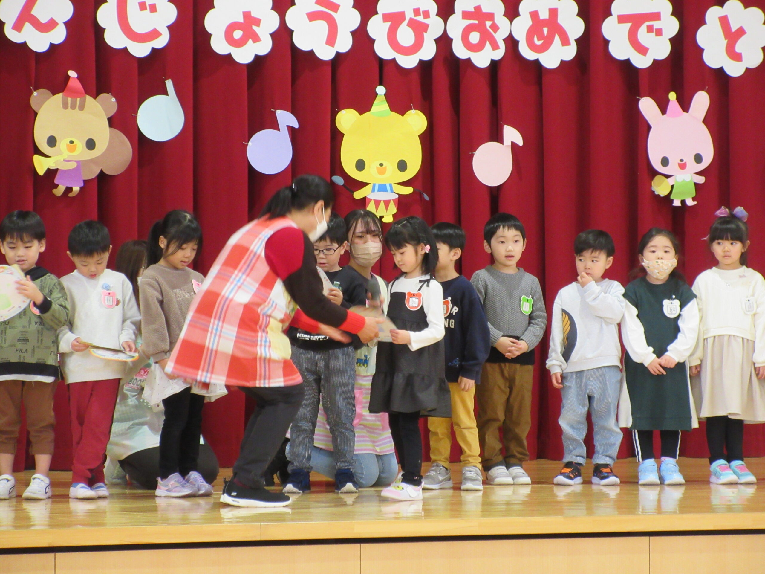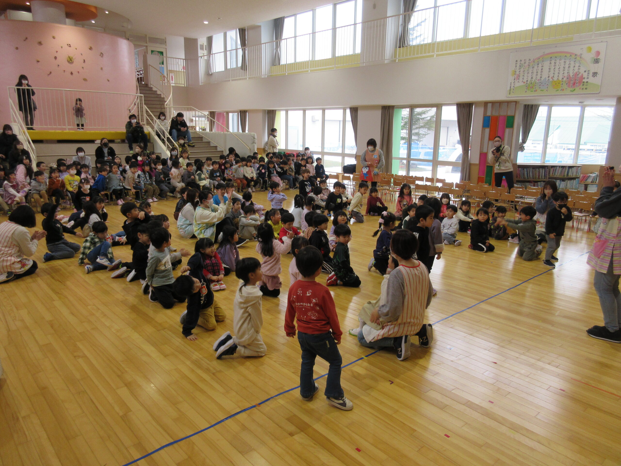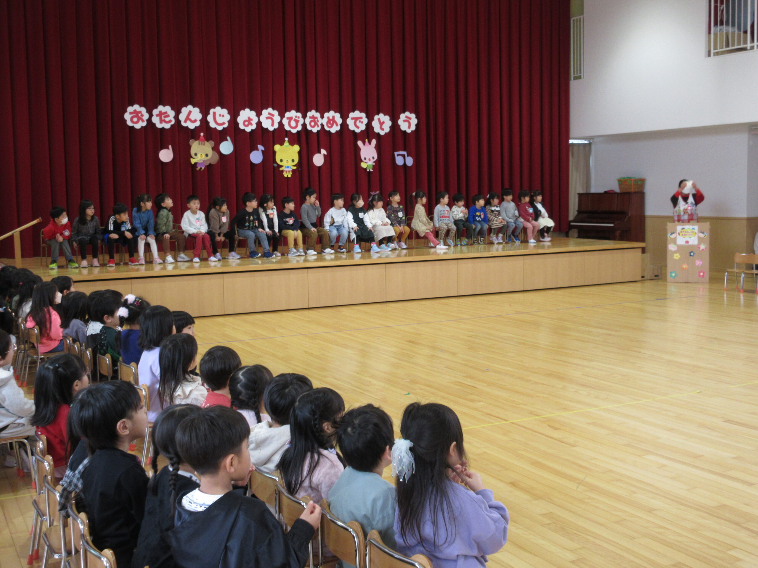 本日1月31日(水)1月生まれのお誕生会を実施しました。23名のお友だちは冬休み明けからの練習でしたが、集中して取り組み、皆さん自己紹介、踊りと上手に披露することが出来ていました。お誕生会後は伝言ゲームをしました。学年に応じて言葉選びをし最初のお友だちから最後のお友だちまで言葉(情報)が変わらなく、子ども達は相手の言葉を一生懸命聞き、伝えることが出来ていました。丁寧に正しく伝える大切さを学びますね!ゲームのルールを守りながら楽しんで参加することができていました。