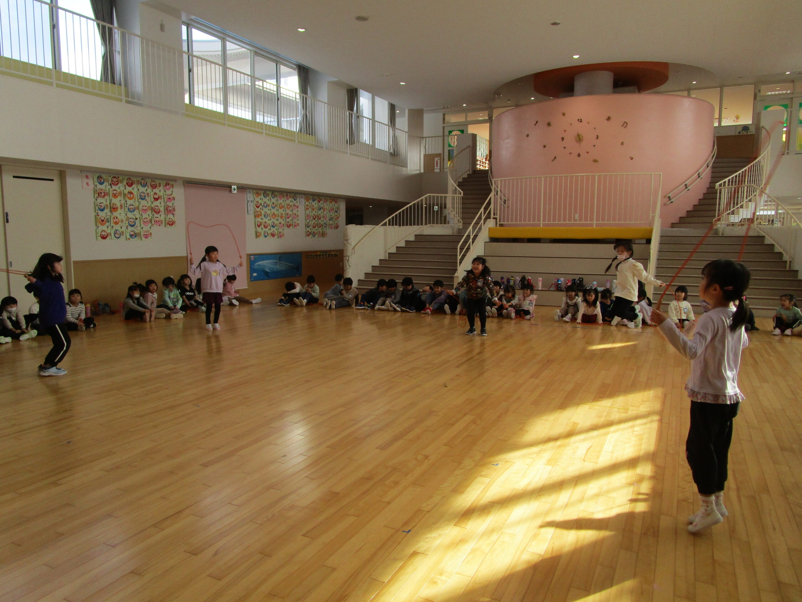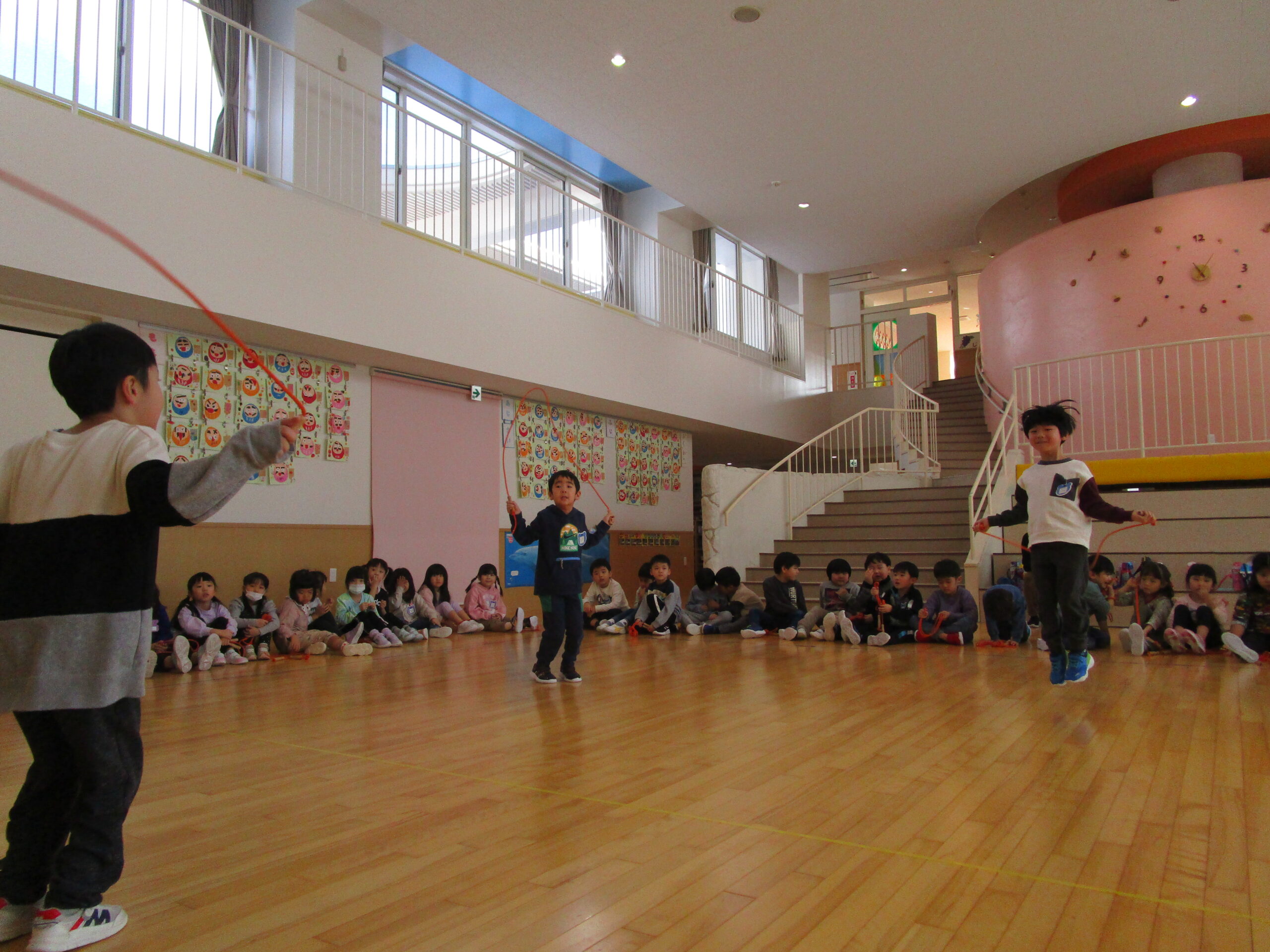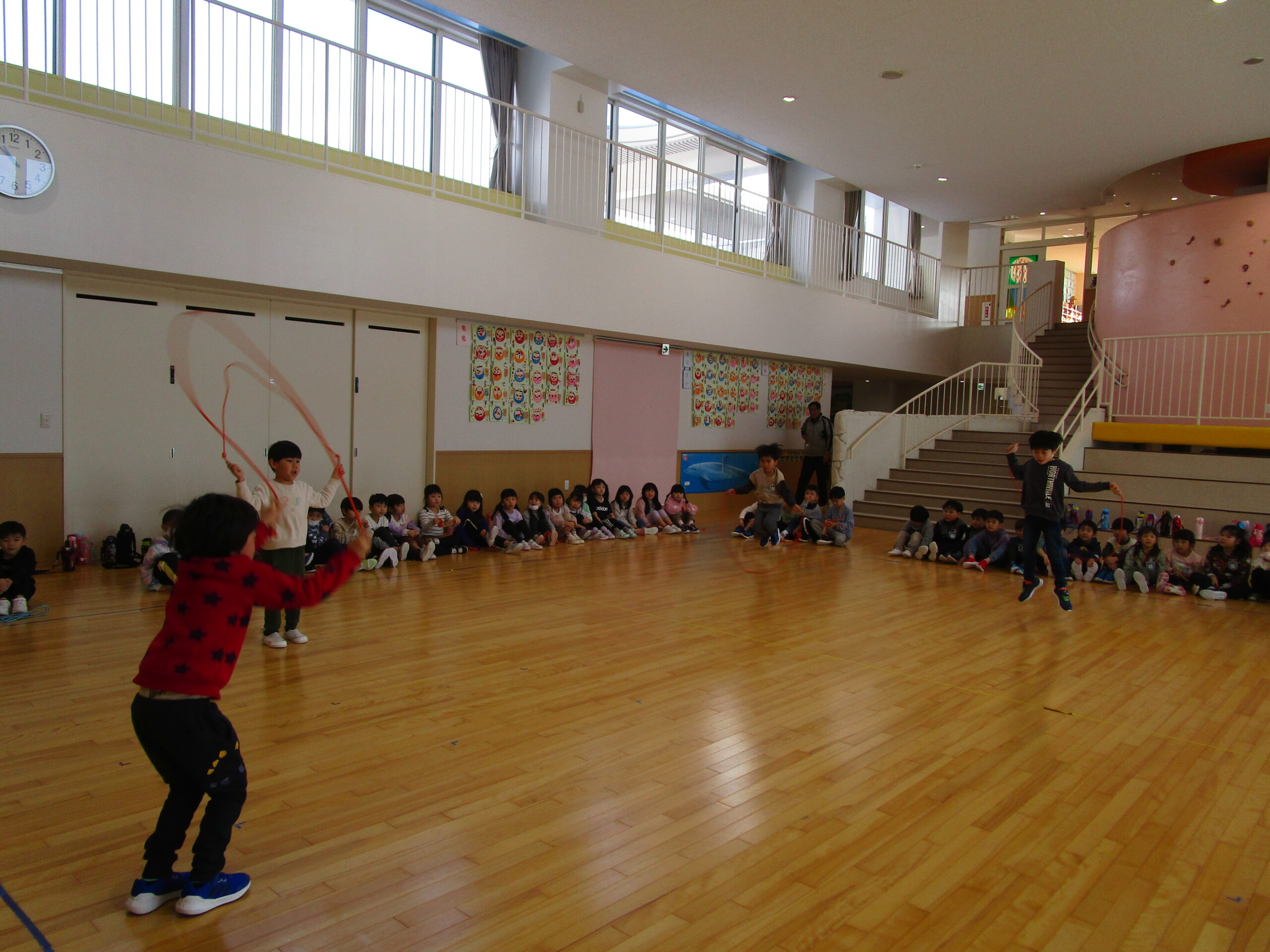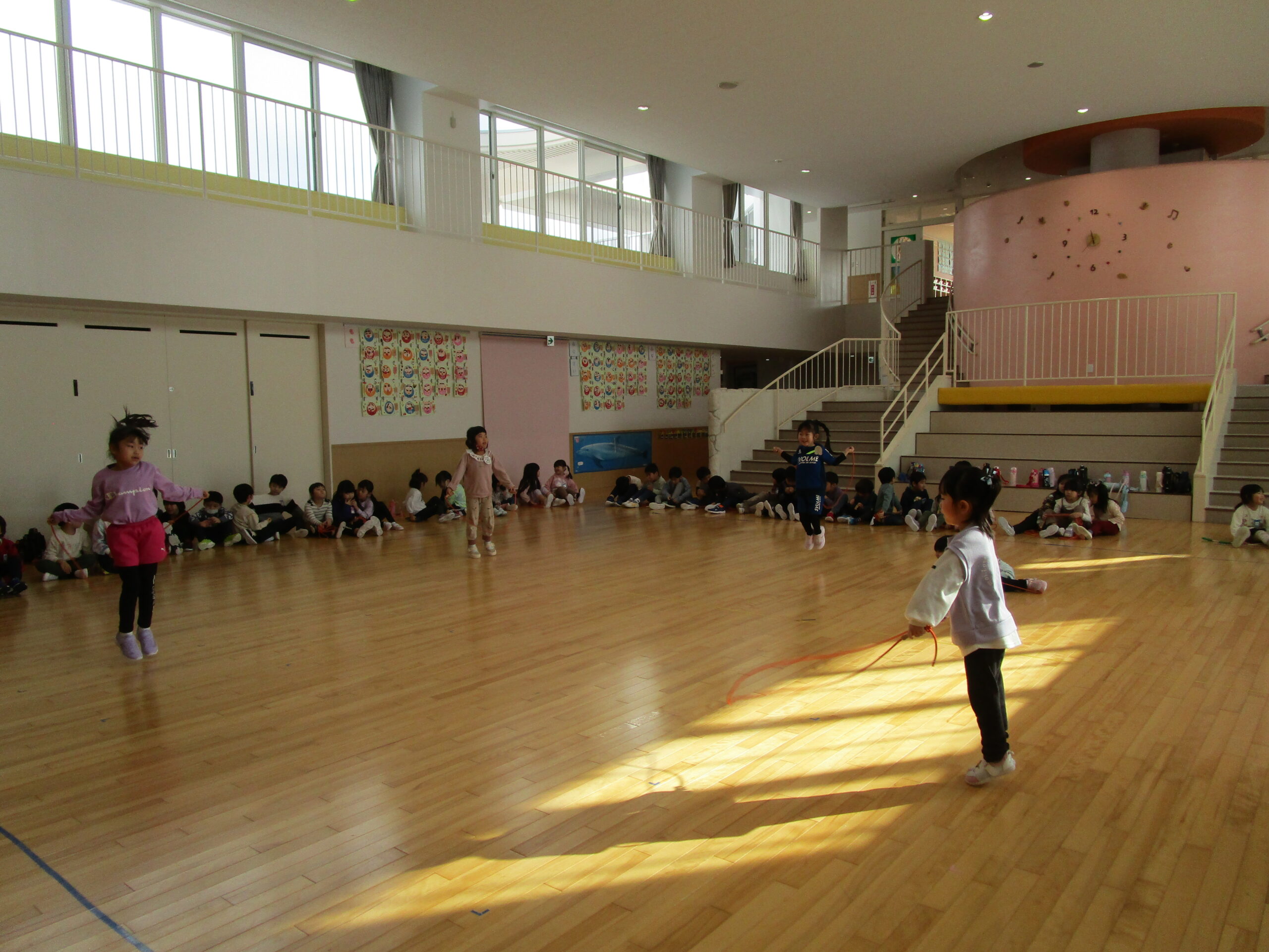 (112)令和5年度「年長学年 縄跳び大会」 2024年1月23日 園内ブログ 本日1月23日(火)は年長学年で、縄跳び大会を持久戦で行いました。ホールで縄跳び大会は最後だったため、今度こそ賞状を取りたいと意気込んでいるお友達や、「冬休みにたくさん練習してきたよ」と気合い十分な様子が見られました。競争心を持ちながらも、お友達の最後まで諦めない姿を見て、自然と応援する姿も見られました。 次回はお部屋での縄跳び大会が年長学年最後となりますので、今までの練習の成果を発揮してほしいと思います。 今日の病気欠席者は、発熱2名、頭痛1名、体調不良1名、大事をとって2名です。