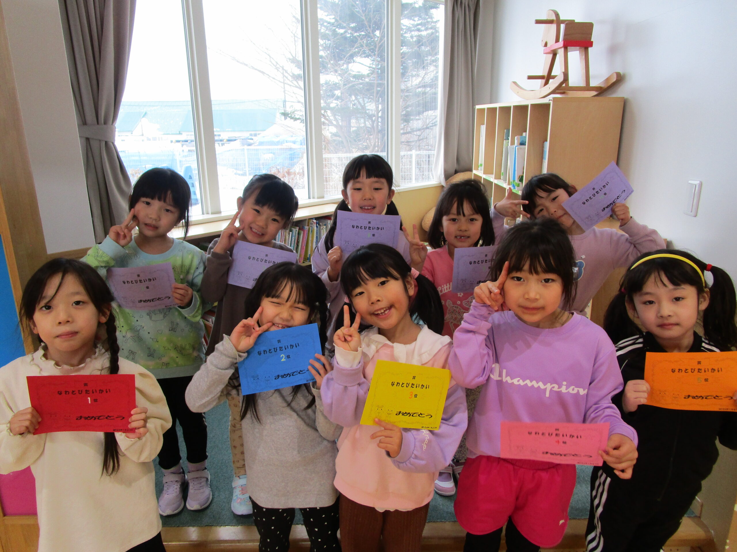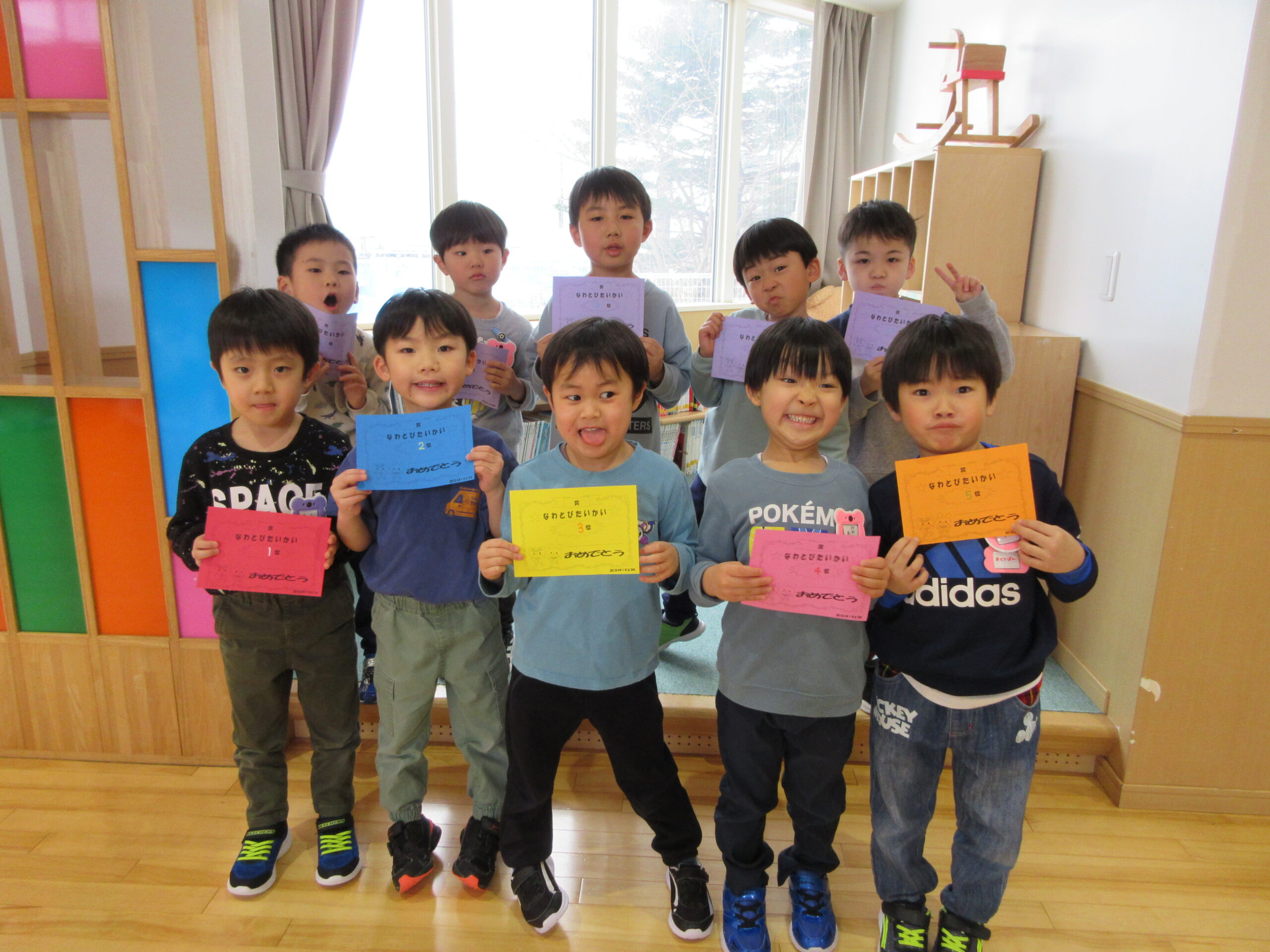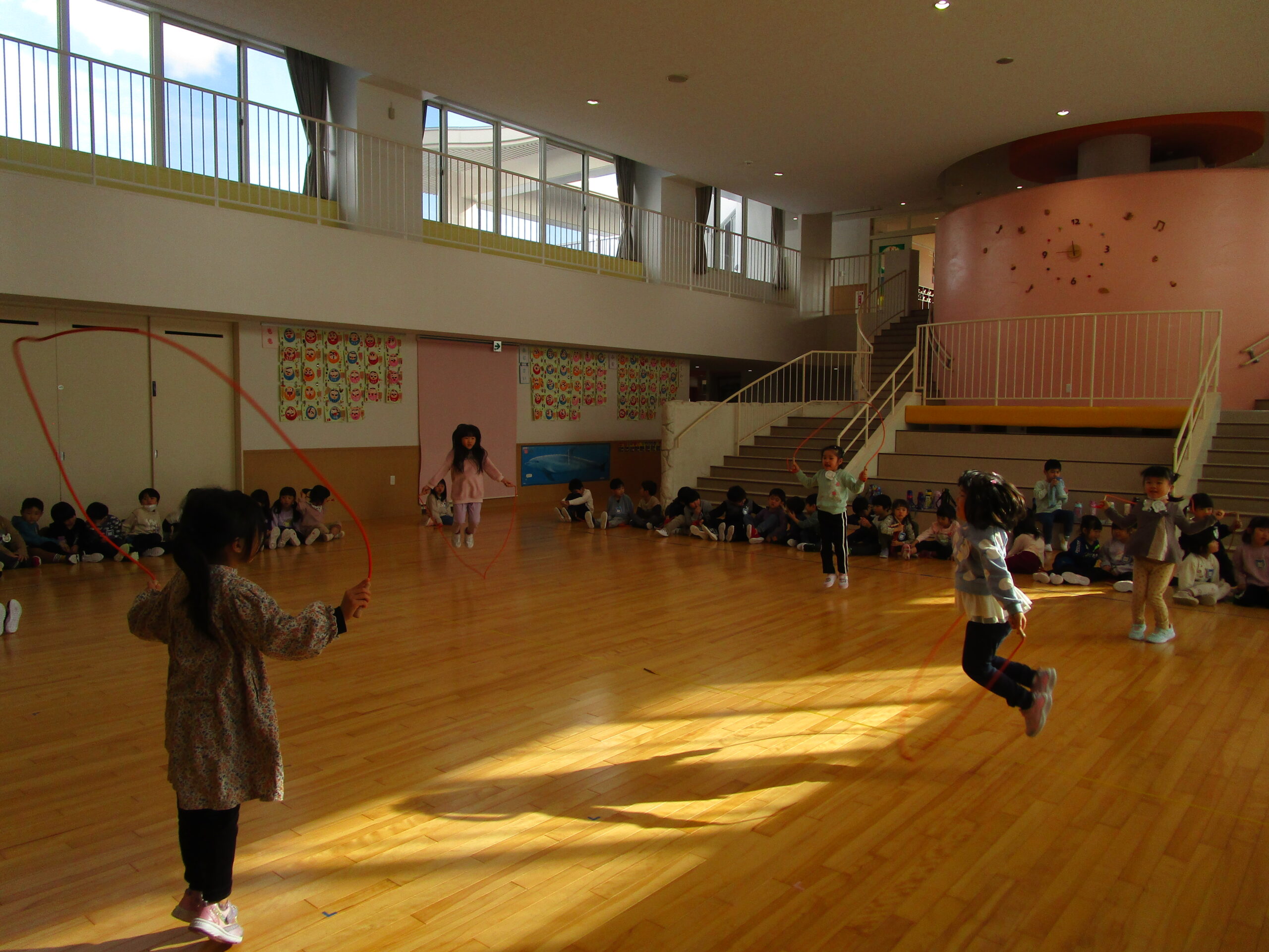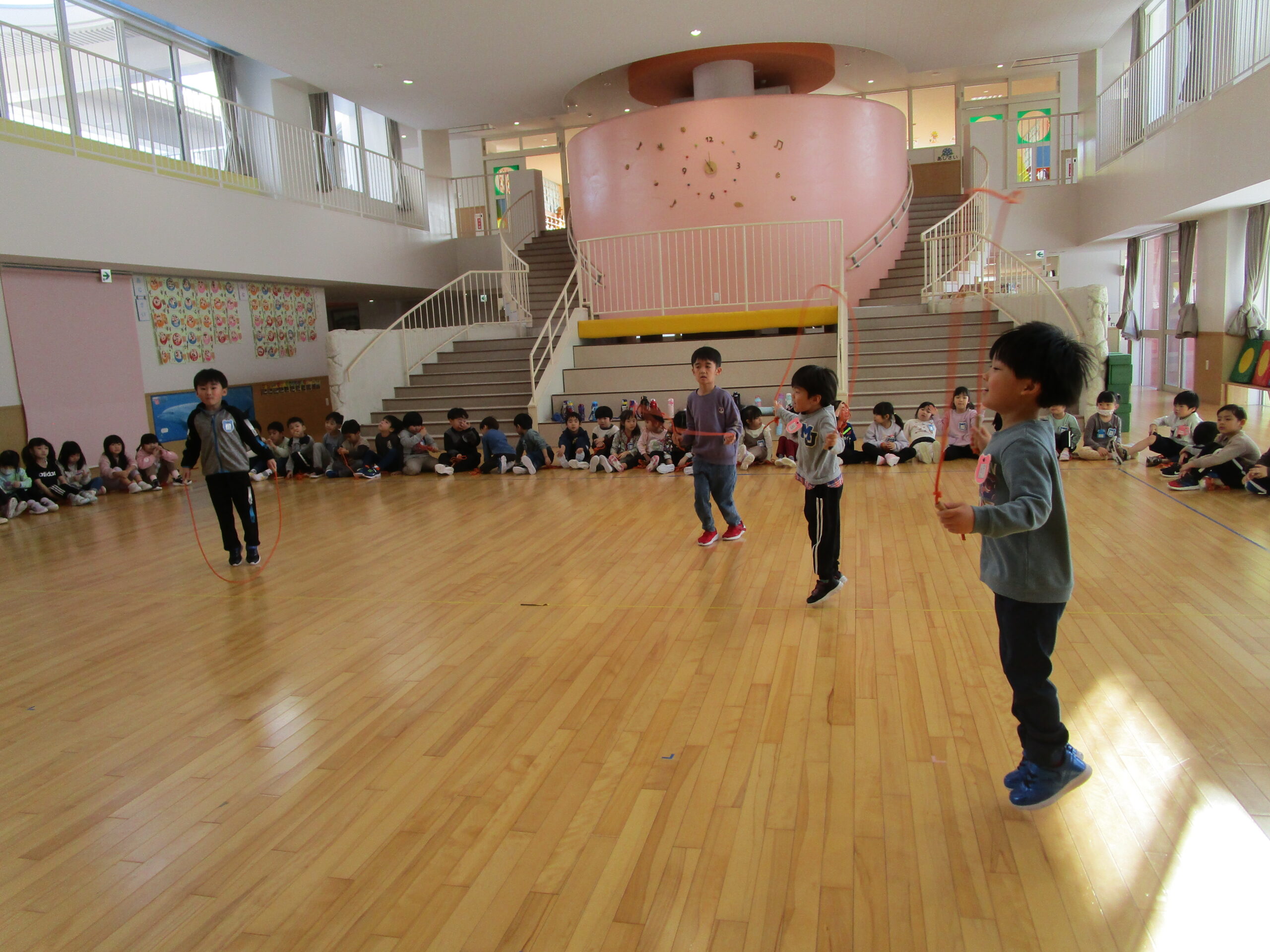 (112)令和5年度「年長学年 縄跳び大会」 2024年1月23日 園内ブログ 本日1月23日(火)は年長学年で、縄跳び大会を持久戦で行いました。ホールで縄跳び大会は最後だったため、今度こそ賞状を取りたいと意気込んでいるお友達や、「冬休みにたくさん練習してきたよ」と気合い十分な様子が見られました。競争心を持ちながらも、お友達の最後まで諦めない姿を見て、自然と応援する姿も見られました。 次回はお部屋での縄跳び大会が年長学年最後となりますので、今までの練習の成果を発揮してほしいと思います。 今日の病気欠席者は、発熱2名、頭痛1名、体調不良1名、大事をとって2名です。