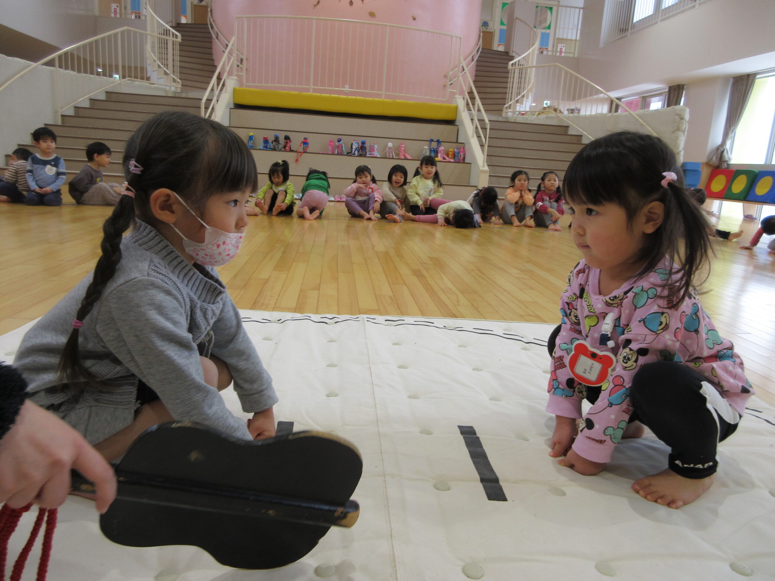 1月22日(月)は全学年ホールにて、年少学年最後のおすもう大会がありました。背の順番を基にトーナメント方式での取り組みとなったため、ほとんどの組み合わせで押し合いが続き、とってもいい勝負でした! 組み合わせによってはなかなか決着がつかず、対戦回数が多くなってしまった子もいました。戦っている子も待っている子も集中が途切れやすかったと思いますが、「頑張れー!」と応援してくれたり、真剣な眼差しで最後まで一生懸命に取り組もうとしている姿が印象的でした。悔し涙を流す子や戦うことを怖がる子もいましたが、力だけではなく、少しずつ心も強くなっていってくれると思います。