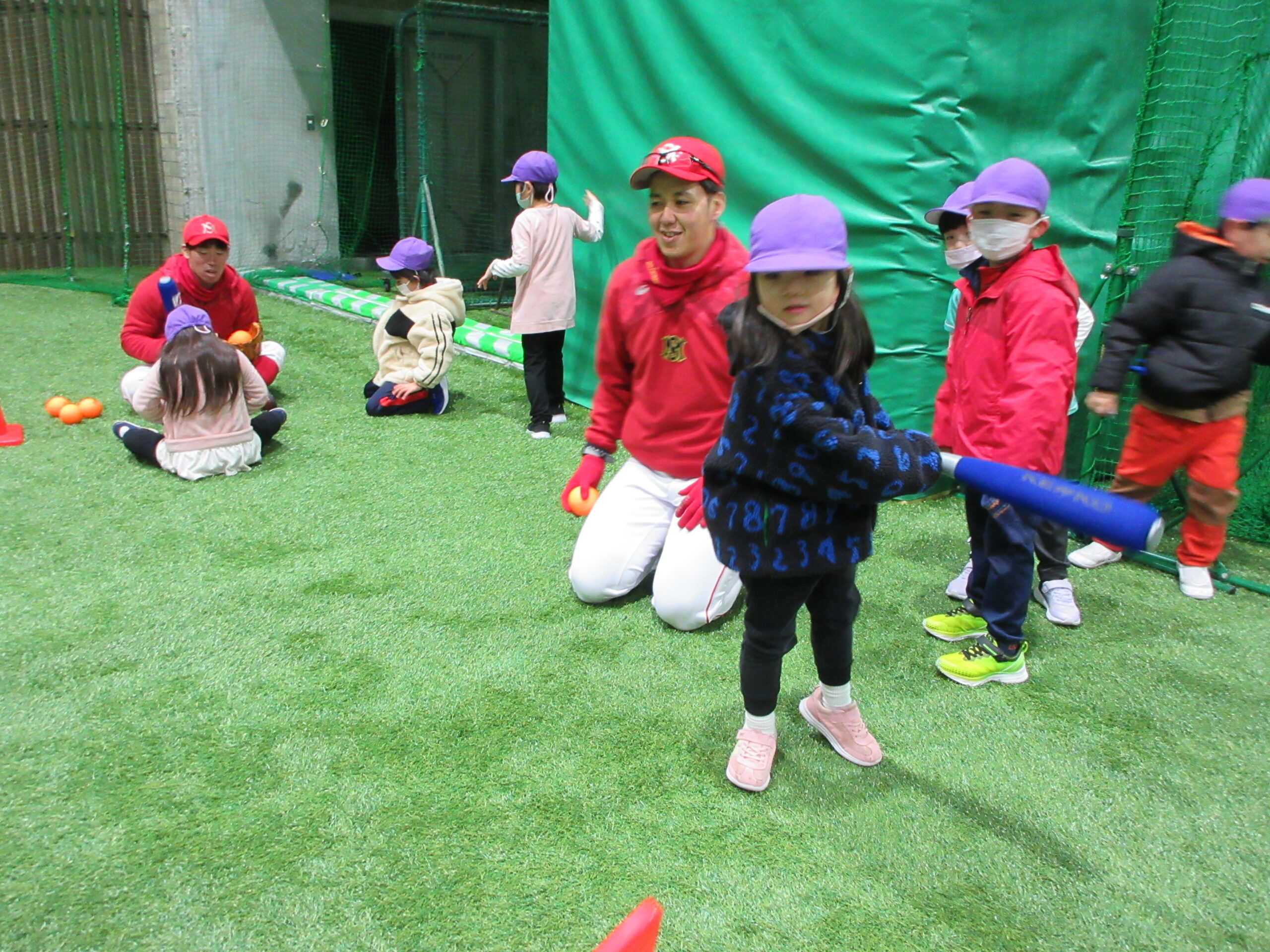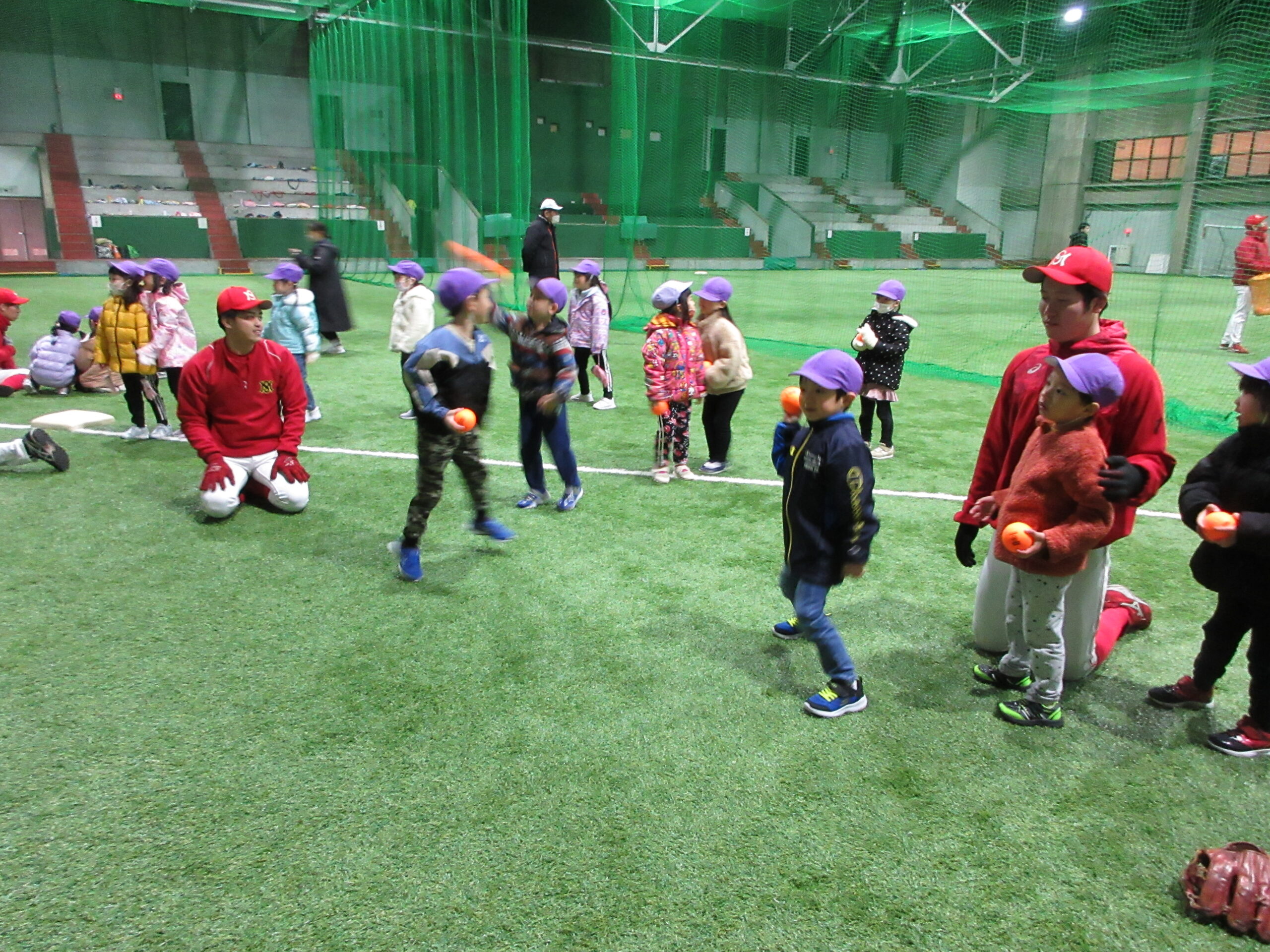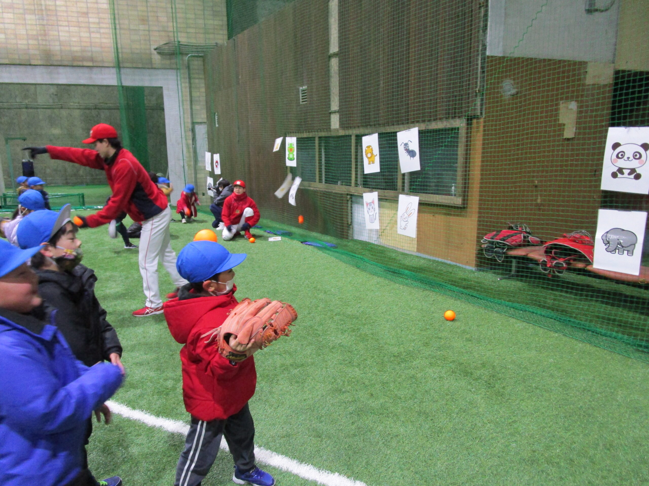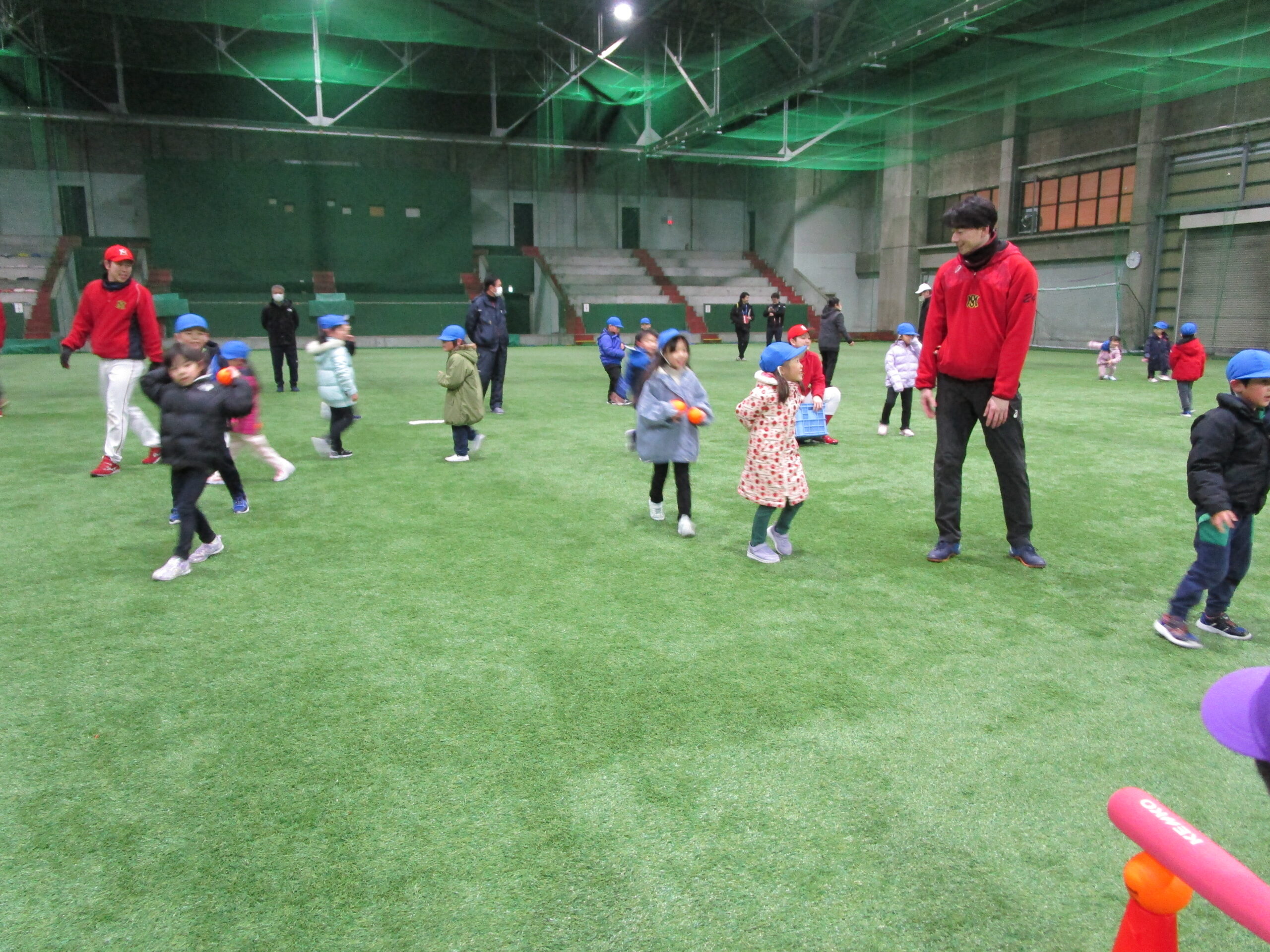本日1月30日(火)は日本製鉄室蘭シャークス主催におきましての「ティーボール教室」に参加しました。年長学年の子ども達は10時20分頃、体育館に到着し、人工芝の体育館を見た子ども達は「わー!すごい!」という声が上がっていました。全員で準備体操をし、その後クラス毎に分かれて選手(指導者)の指示でバッドを持ちポールの上のオレンジボールを打ったり、様々な絵表示を目指してボールを投げたり、そしてミニ野球ゲームをし数々の体験を沢山楽しむことが出来ました。ボールを追いかける子ども達は活き活きしており、そして成功体験を通じて自信に繋がる姿が見られとても良い経験になりました。ご指導頂きました、シャークスの皆様方、お忙しい中ありがとうございました。