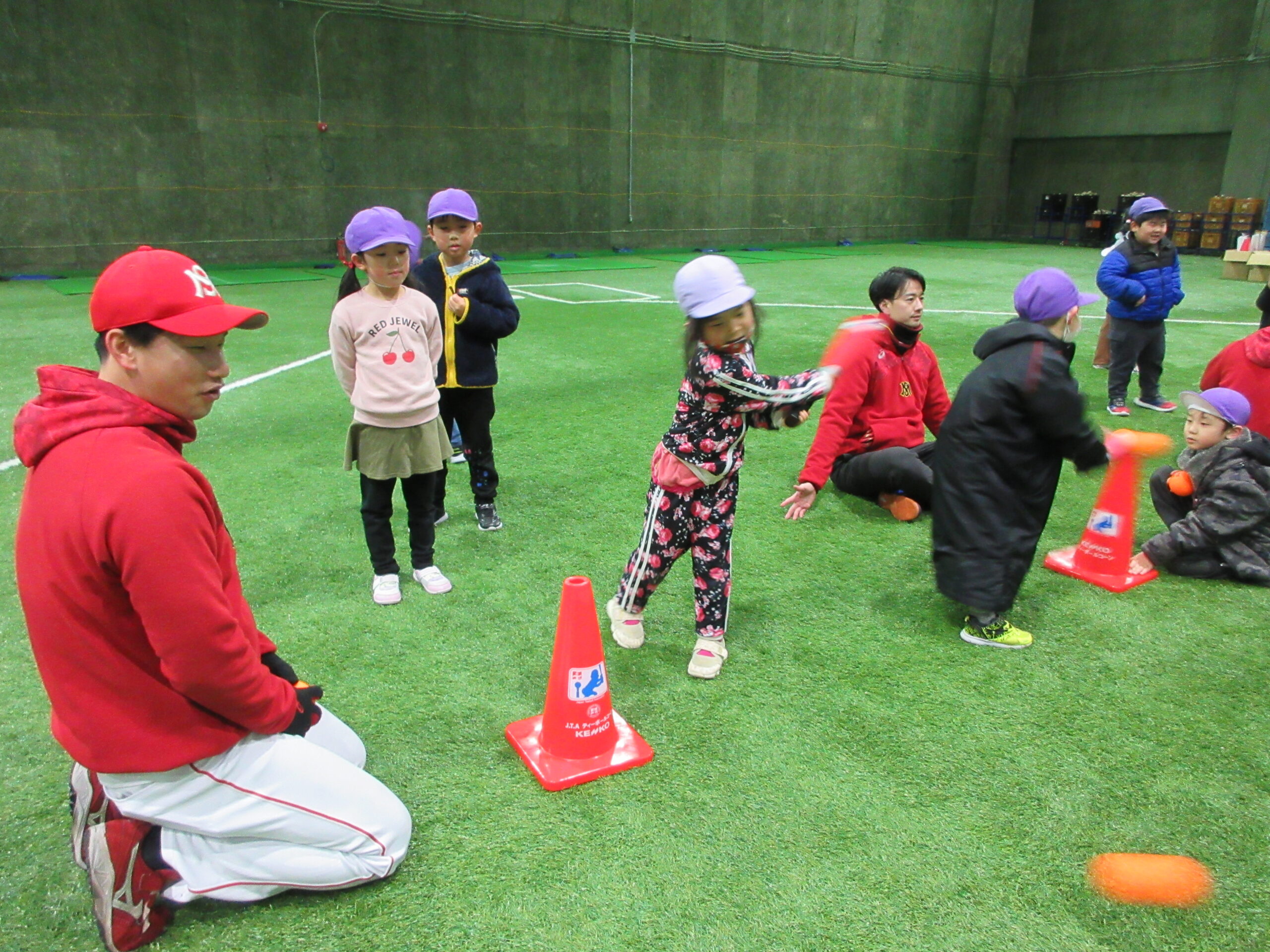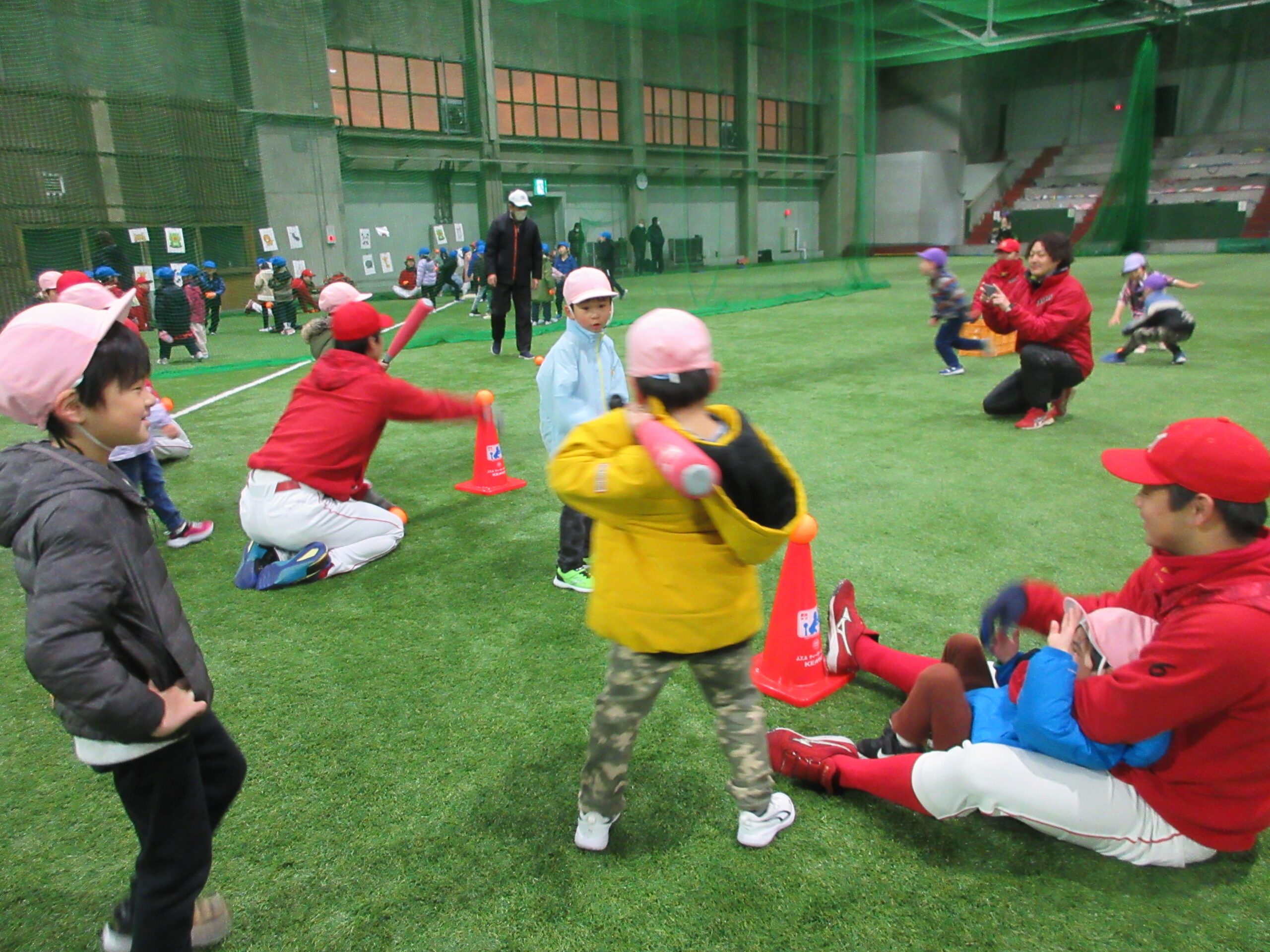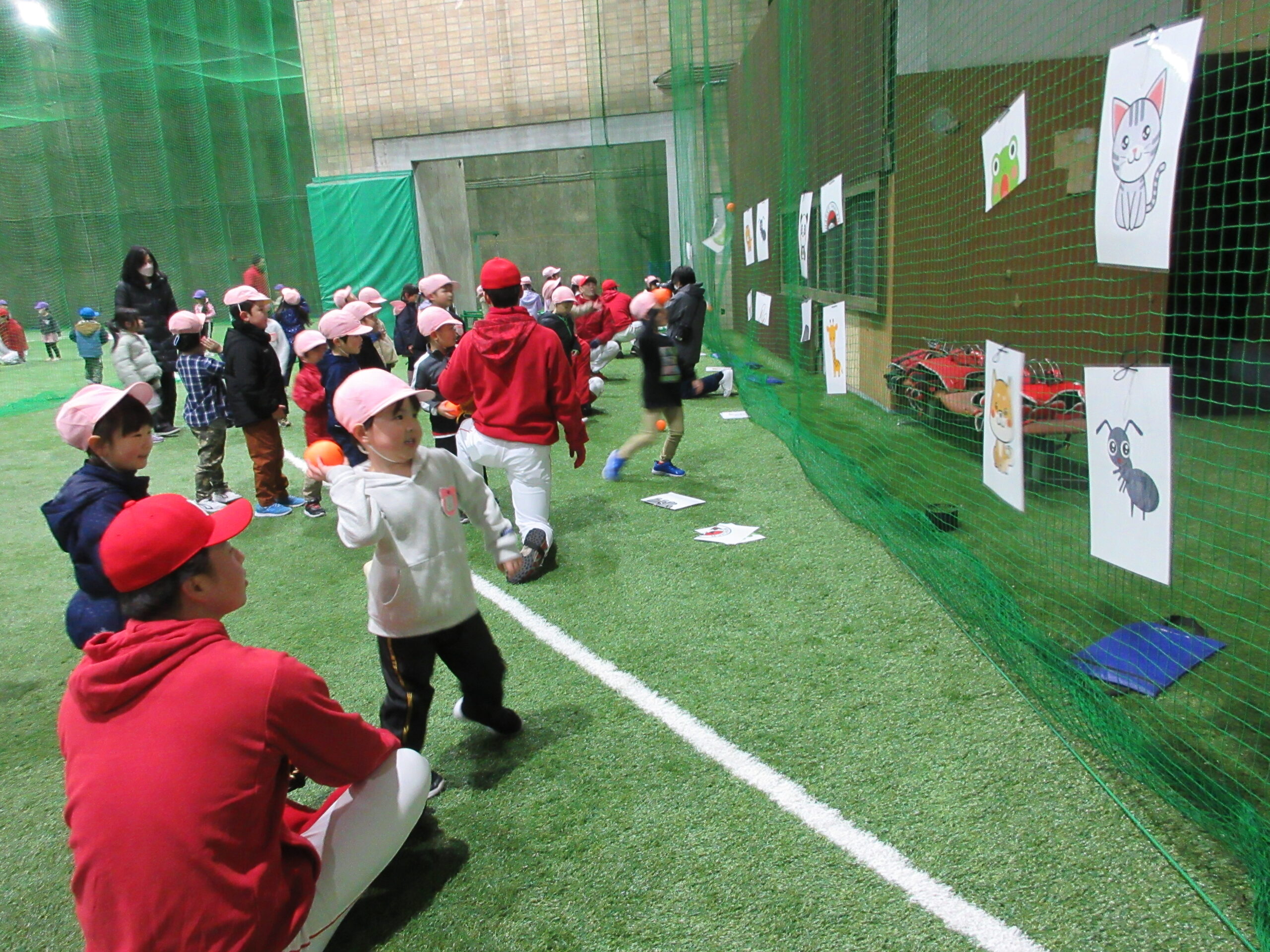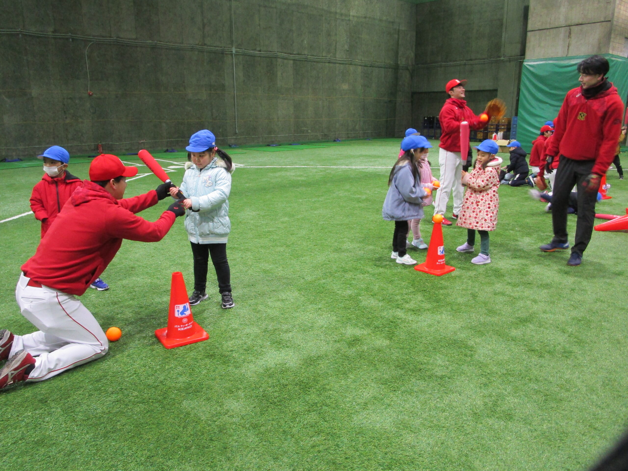 本日1月30日(火)は日本製鉄室蘭シャークス主催におきましての「ティーボール教室」に参加しました。年長学年の子ども達は10時20分頃、体育館に到着し、人工芝の体育館を見た子ども達は「わー!すごい!」という声が上がっていました。全員で準備体操をし、その後クラス毎に分かれて選手(指導者)の指示でバッドを持ちポールの上のオレンジボールを打ったり、様々な絵表示を目指してボールを投げたり、そしてミニ野球ゲームをし数々の体験を沢山楽しむことが出来ました。ボールを追いかける子ども達は活き活きしており、そして成功体験を通じて自信に繋がる姿が見られとても良い経験になりました。ご指導頂きました、シャークスの皆様方、お忙しい中ありがとうございました。