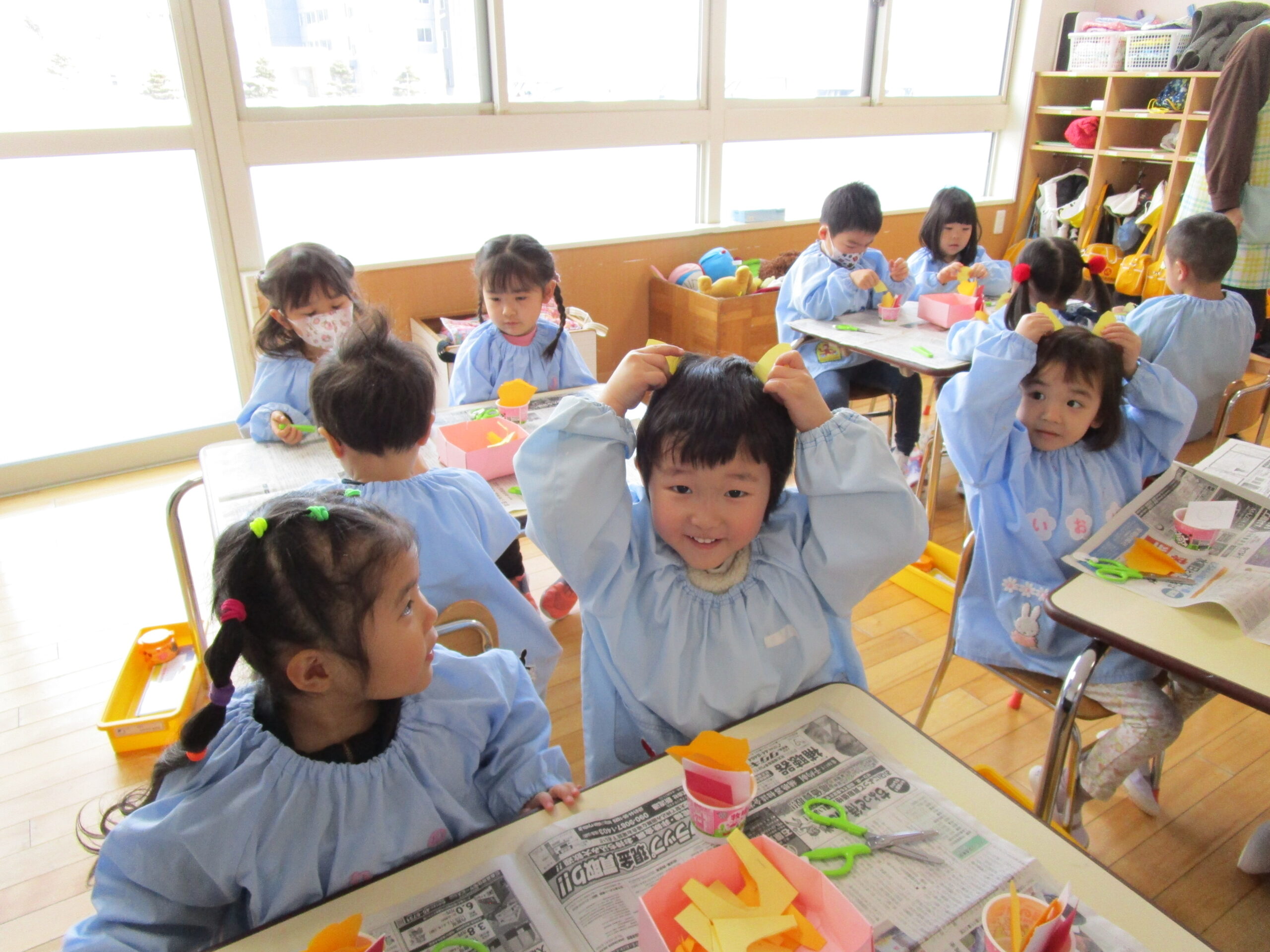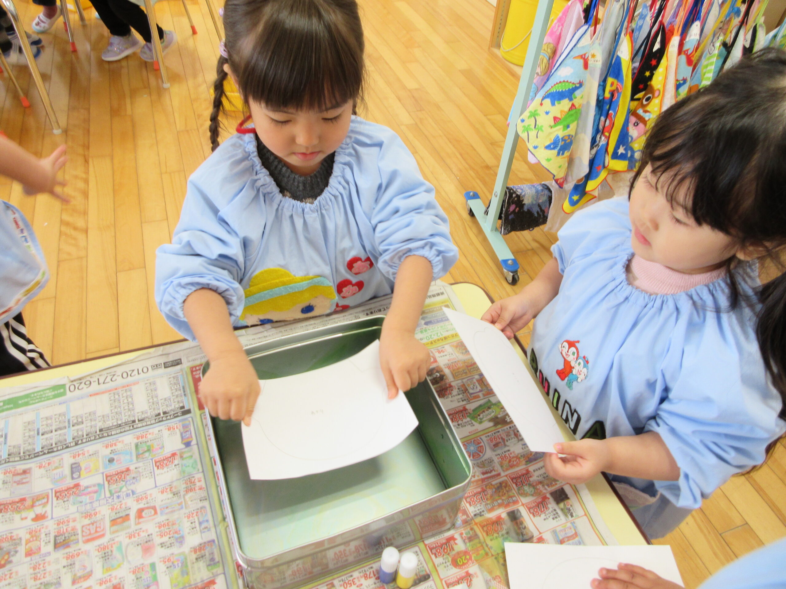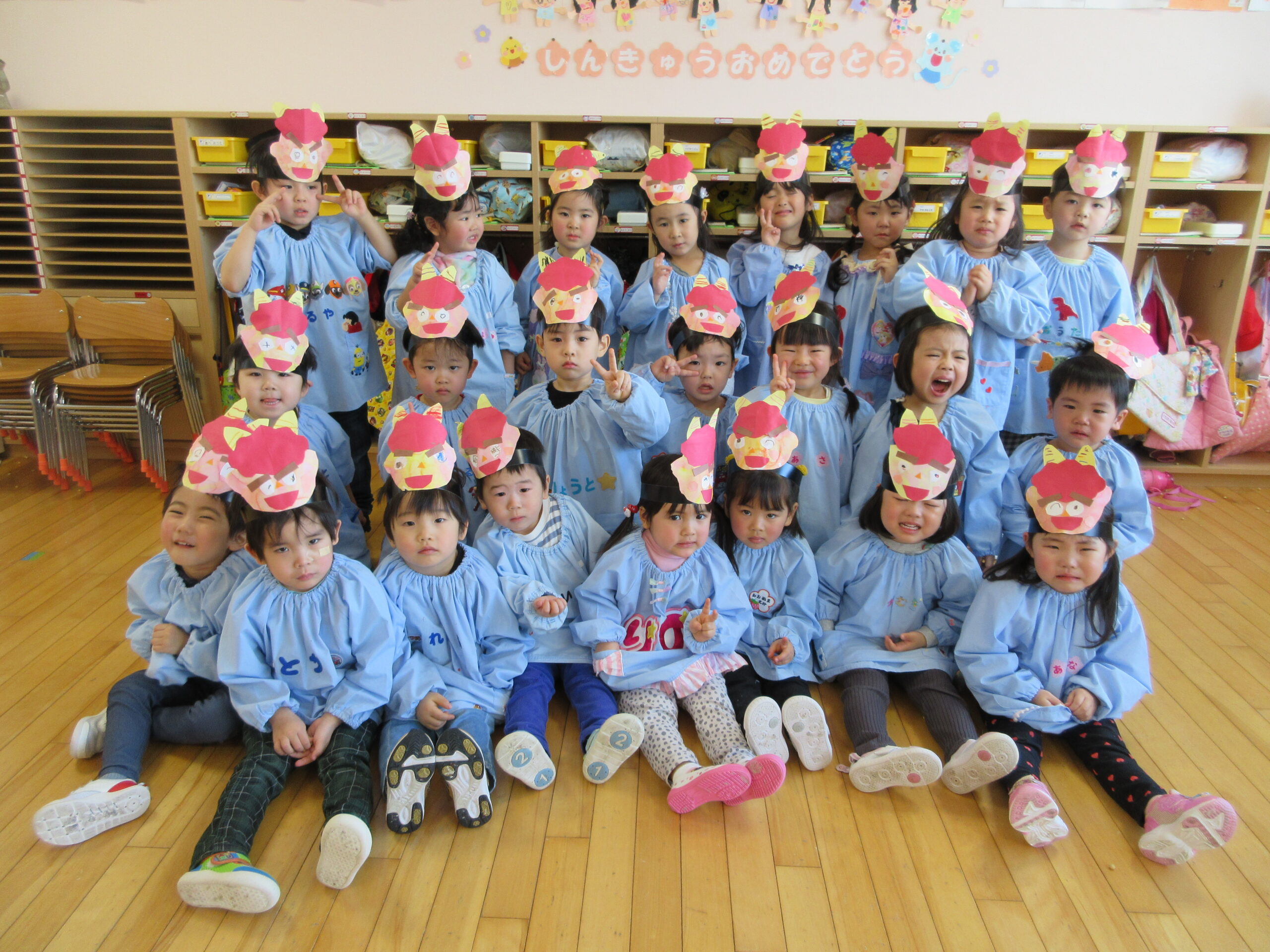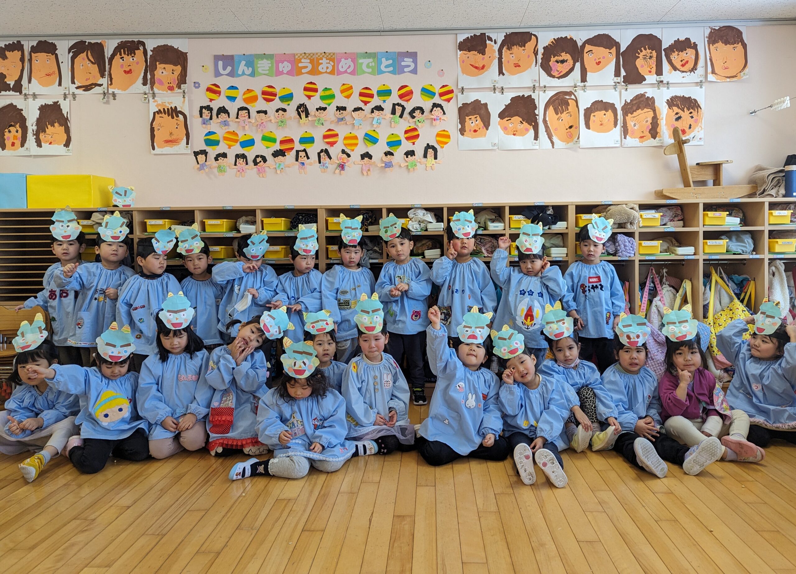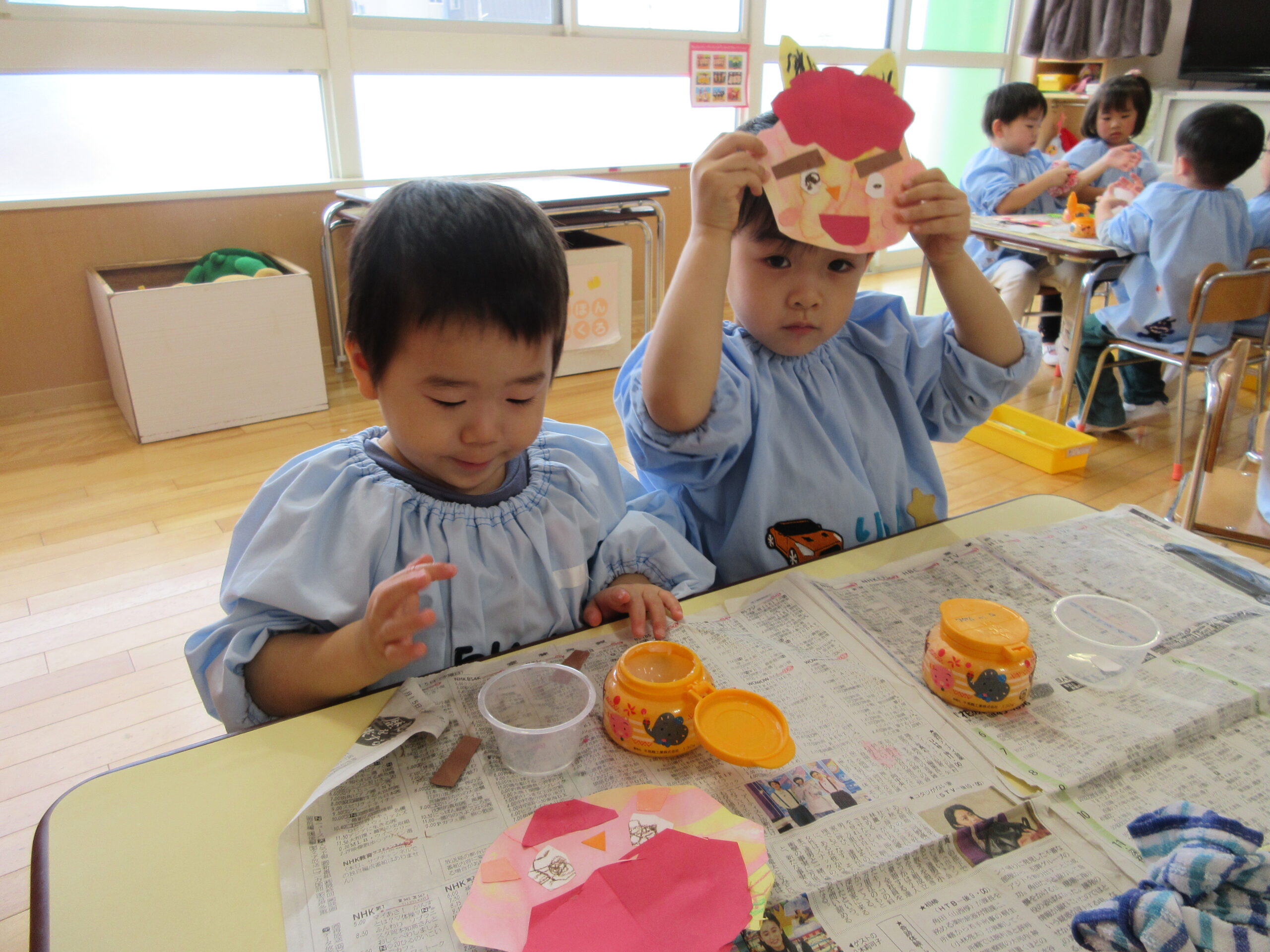 1月23日、26日に節分製作をしました。マーブリングという技法に挑戦し、意欲的に取り組んでくれていました。様々な表情をした鬼のお面ができあがり、当日はそれを被って、みんなで鬼をやっつけるぞ!と意気込んで臨みました。中には不安そうな表情を見せる子もいましたが、泣きながらも一生懸命豆を投げることができていて、それぞれの心の中にいる泣き虫鬼さんや怒りん坊鬼さんも一緒にやっつけることができたと思います。
