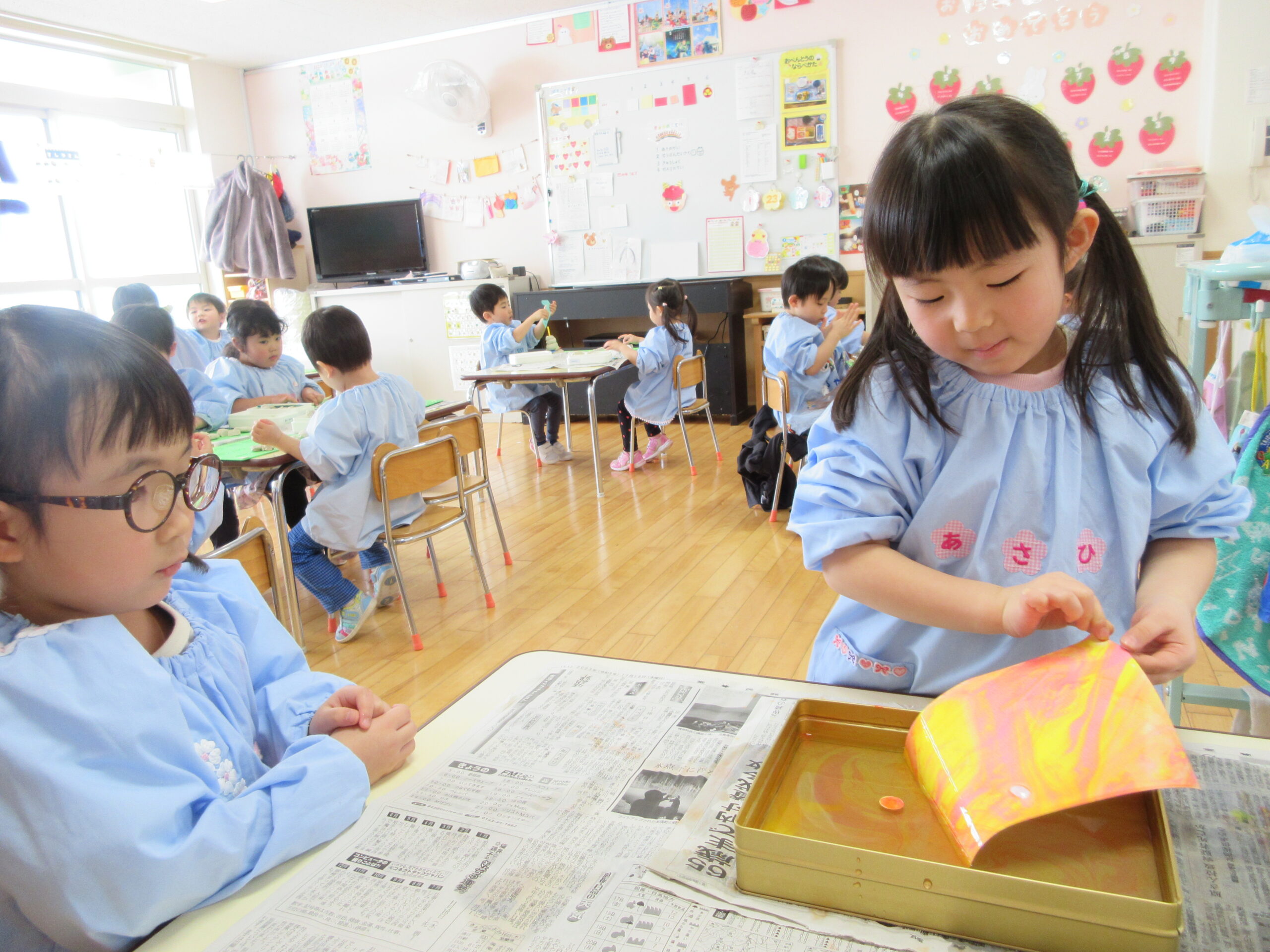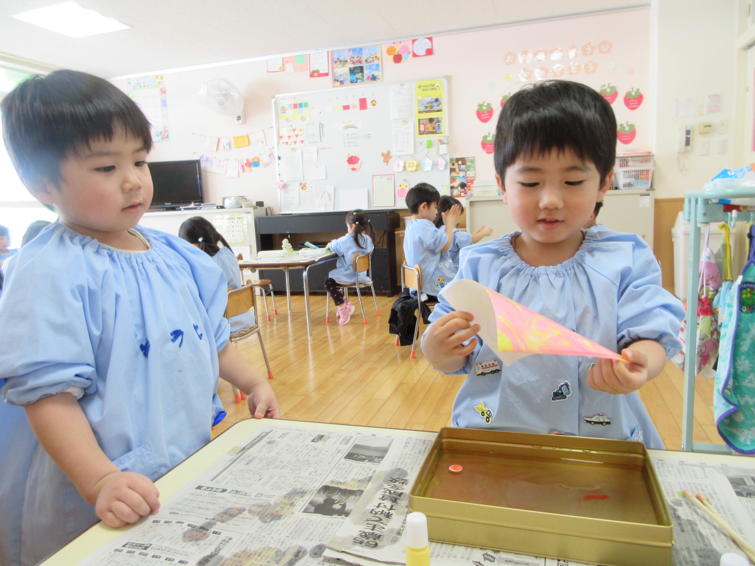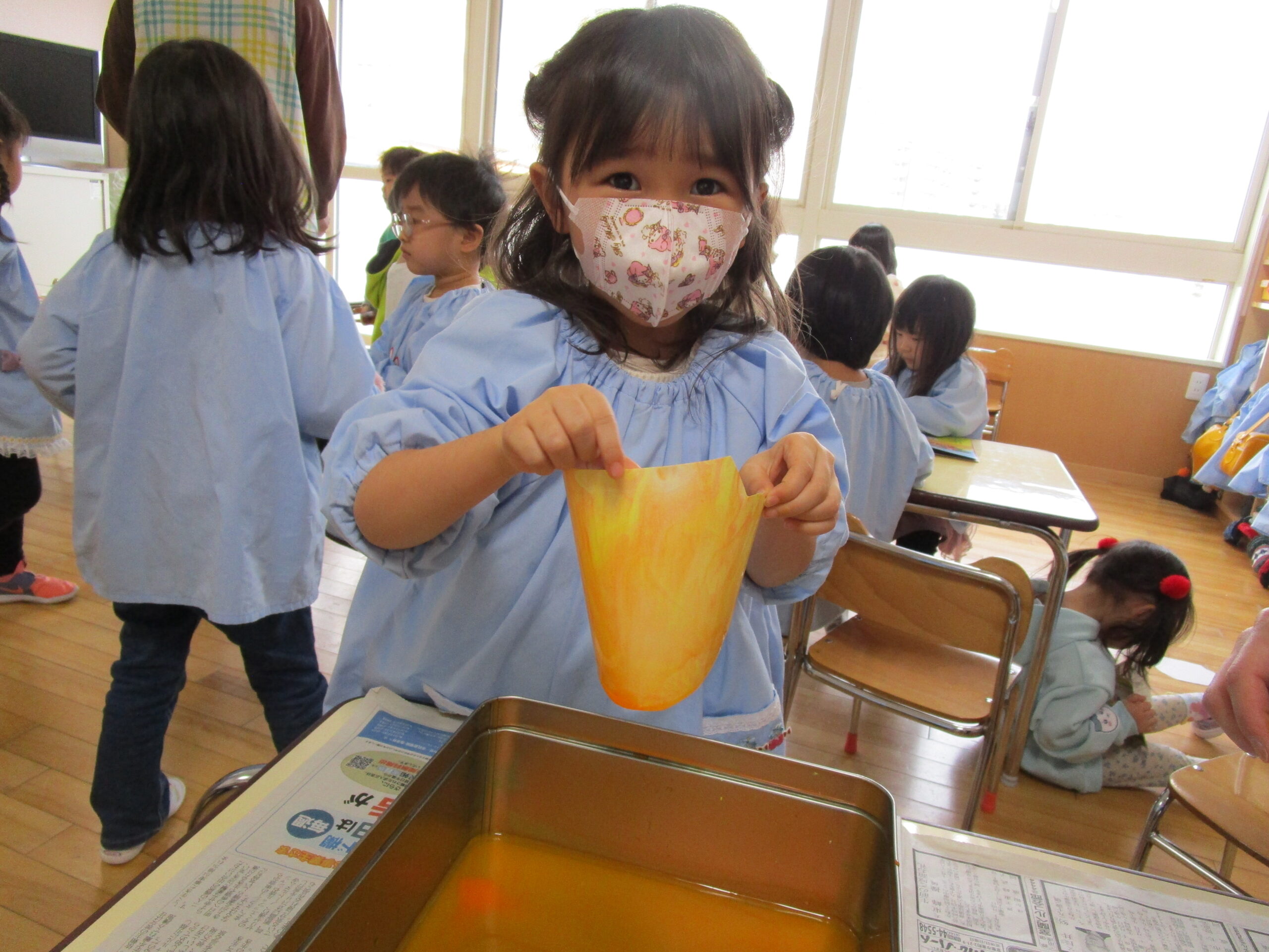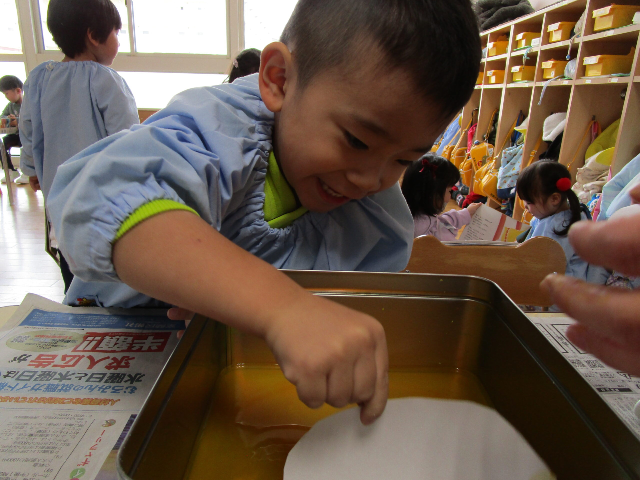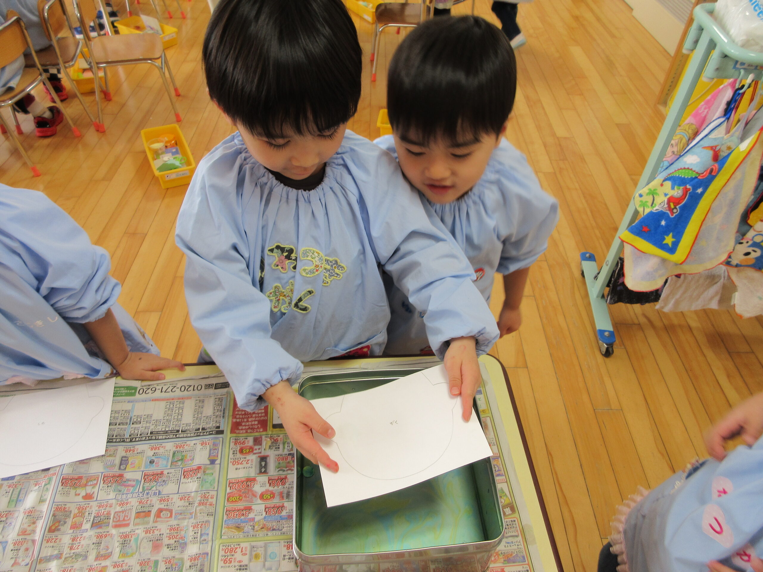 1月23日、26日に節分製作をしました。マーブリングという技法に挑戦し、意欲的に取り組んでくれていました。様々な表情をした鬼のお面ができあがり、当日はそれを被って、みんなで鬼をやっつけるぞ!と意気込んで臨みました。中には不安そうな表情を見せる子もいましたが、泣きながらも一生懸命豆を投げることができていて、それぞれの心の中にいる泣き虫鬼さんや怒りん坊鬼さんも一緒にやっつけることができたと思います。