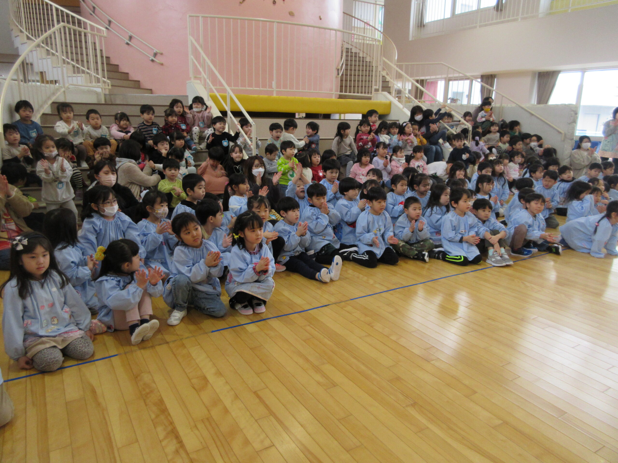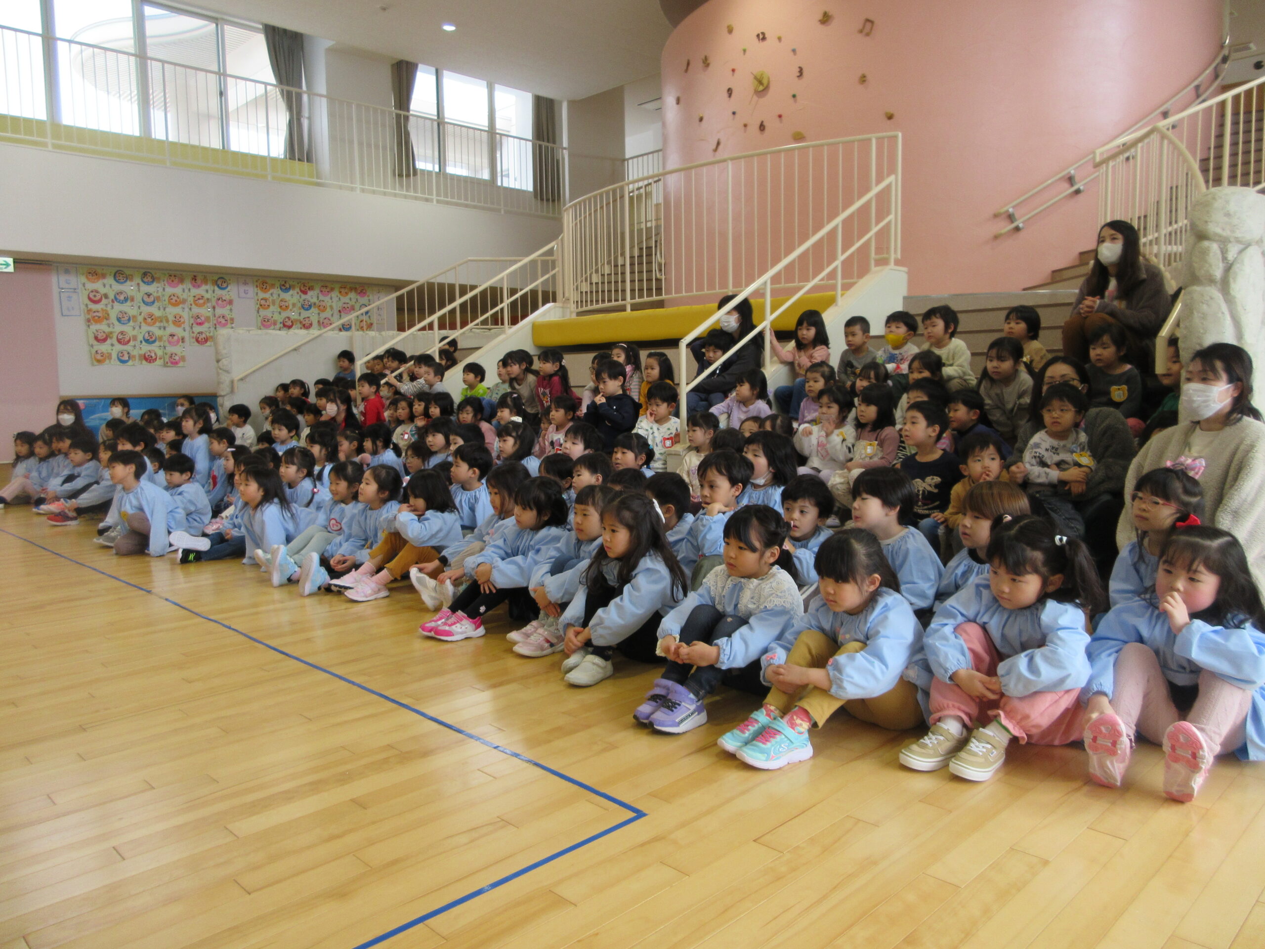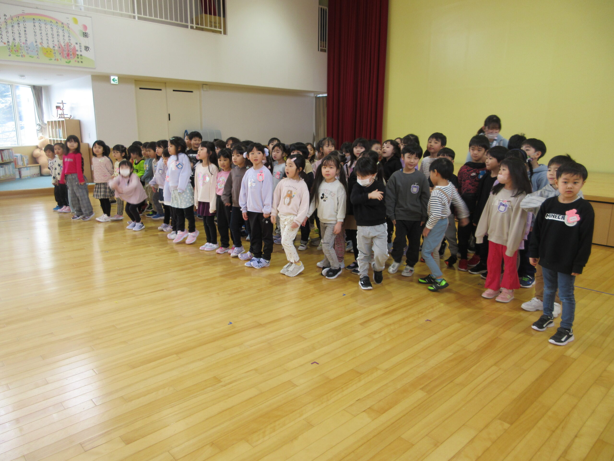 今日は年長学年による運動発表の練習を、年中・年少学年が見学しました。参観日に向けて一生懸命練習している年長さんでしたが、お客さんがいる中での練習は初めてだったので、とても緊張したようです。それでもかっこよく発表する年長さんを見て、見学しているお客さんからは自然と大きな拍手や「頑張れー!」と、励ましの声が多く出ていました。 最後には素敵な姿を見せてくれてありがとう、応援してくれてありがとう、とお互いに声を掛け合って終わりました。素敵なお兄さんお姉さんの姿を見て、自分も挑戦してみたい!という気持ちがより強くなってくれたら嬉しいです。年長さん、参観日も頑張ってくださいね♪