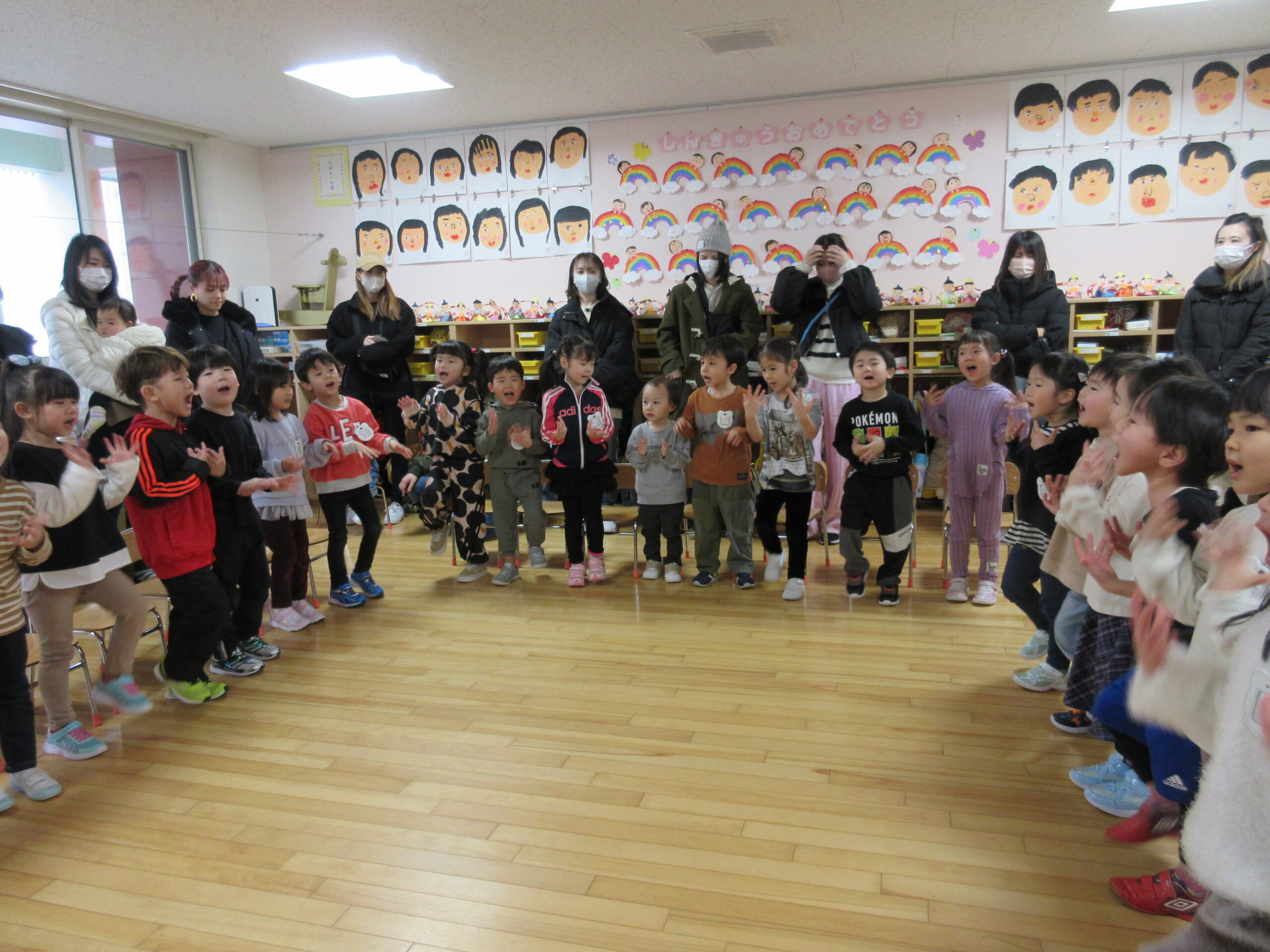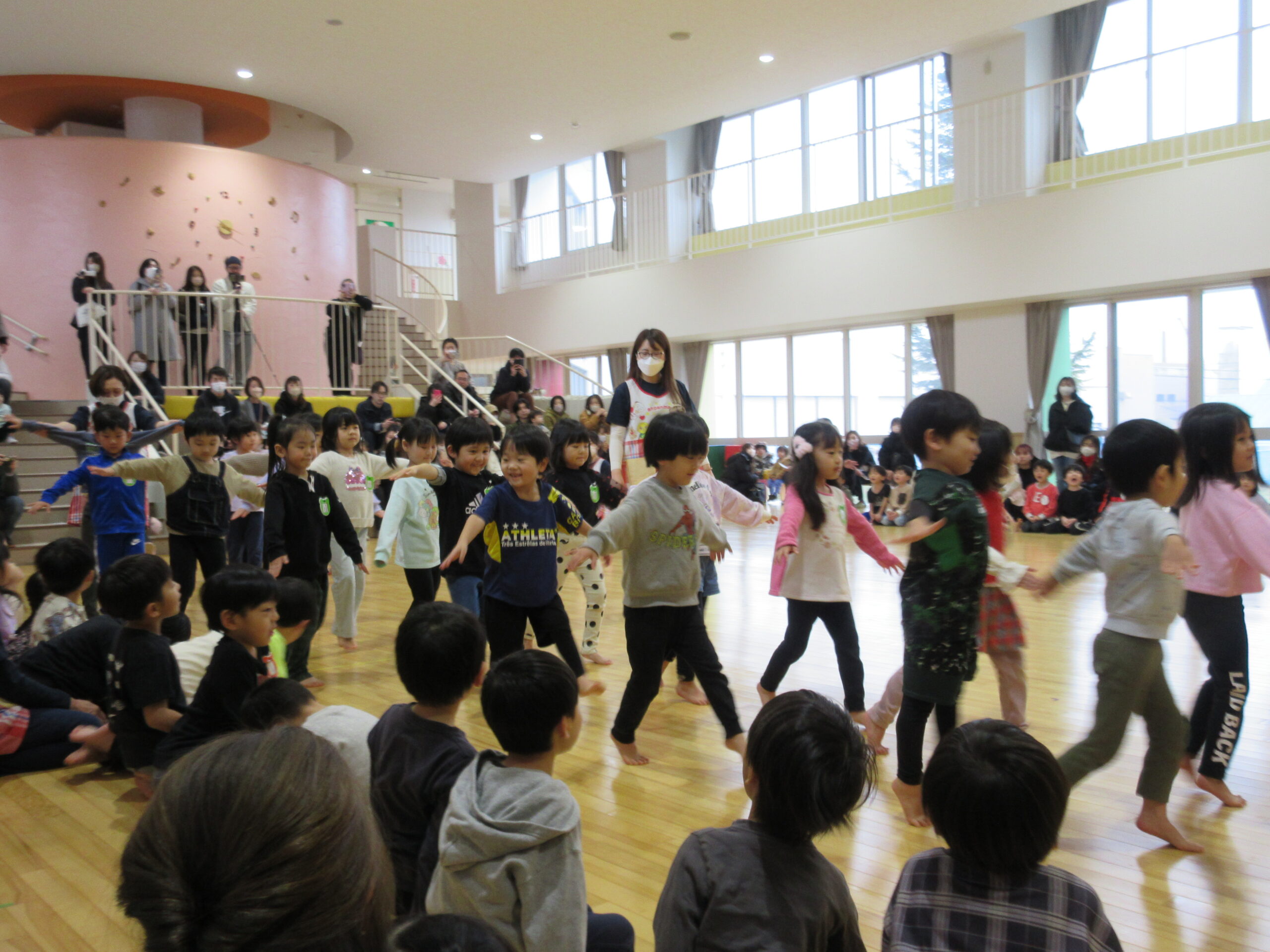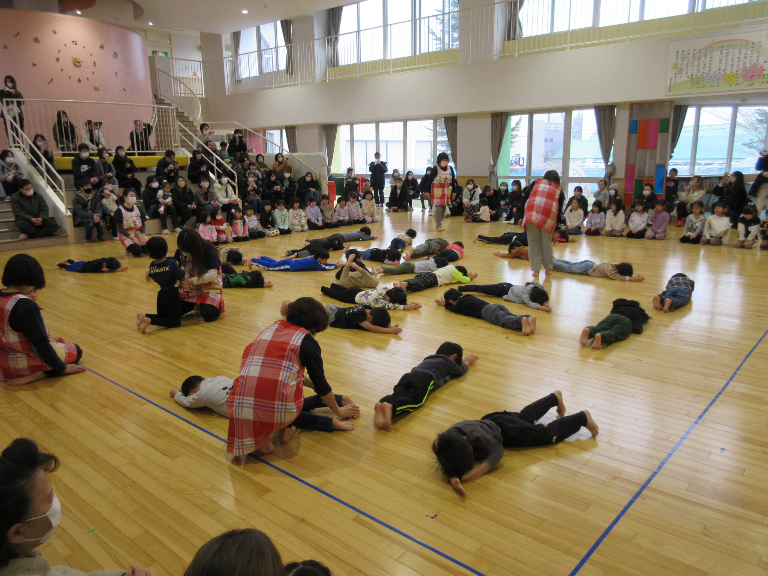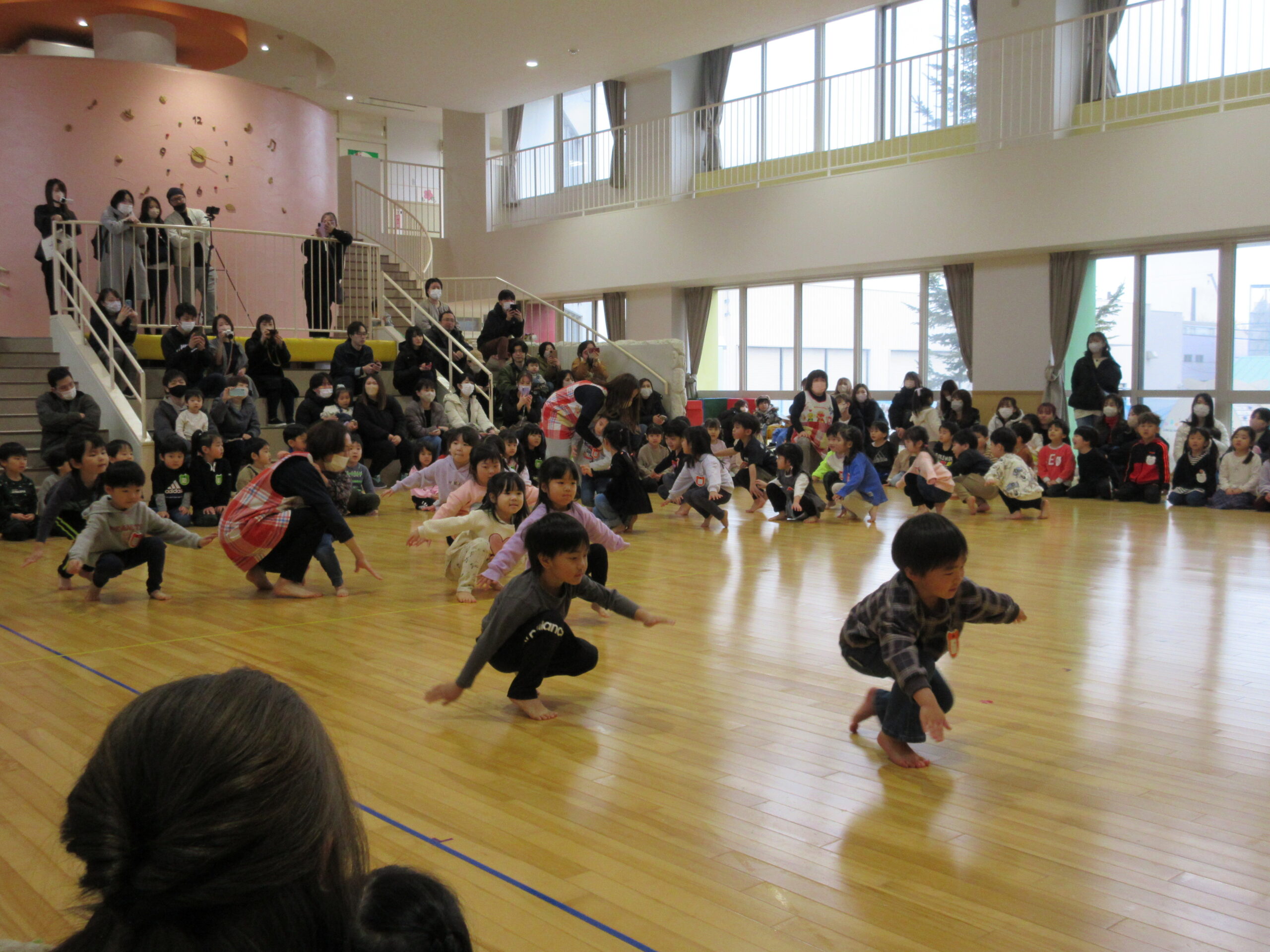 昨日に続きまして今日2月15日(木)年中学年の参観日でした。各お部屋で通常の朝の会を見て頂きホールで学年でのリズム体操を披露しました。年少から取り組んできたリズム体操はピアノの音に合わせながら子ども達の筋力を鍛え、想像力を高めて機敏な動きでスムーズに取り組むことができました。その後は親子で新聞紙ゲームや玉入れ等で楽しみました。保護者の皆様有難うございました。