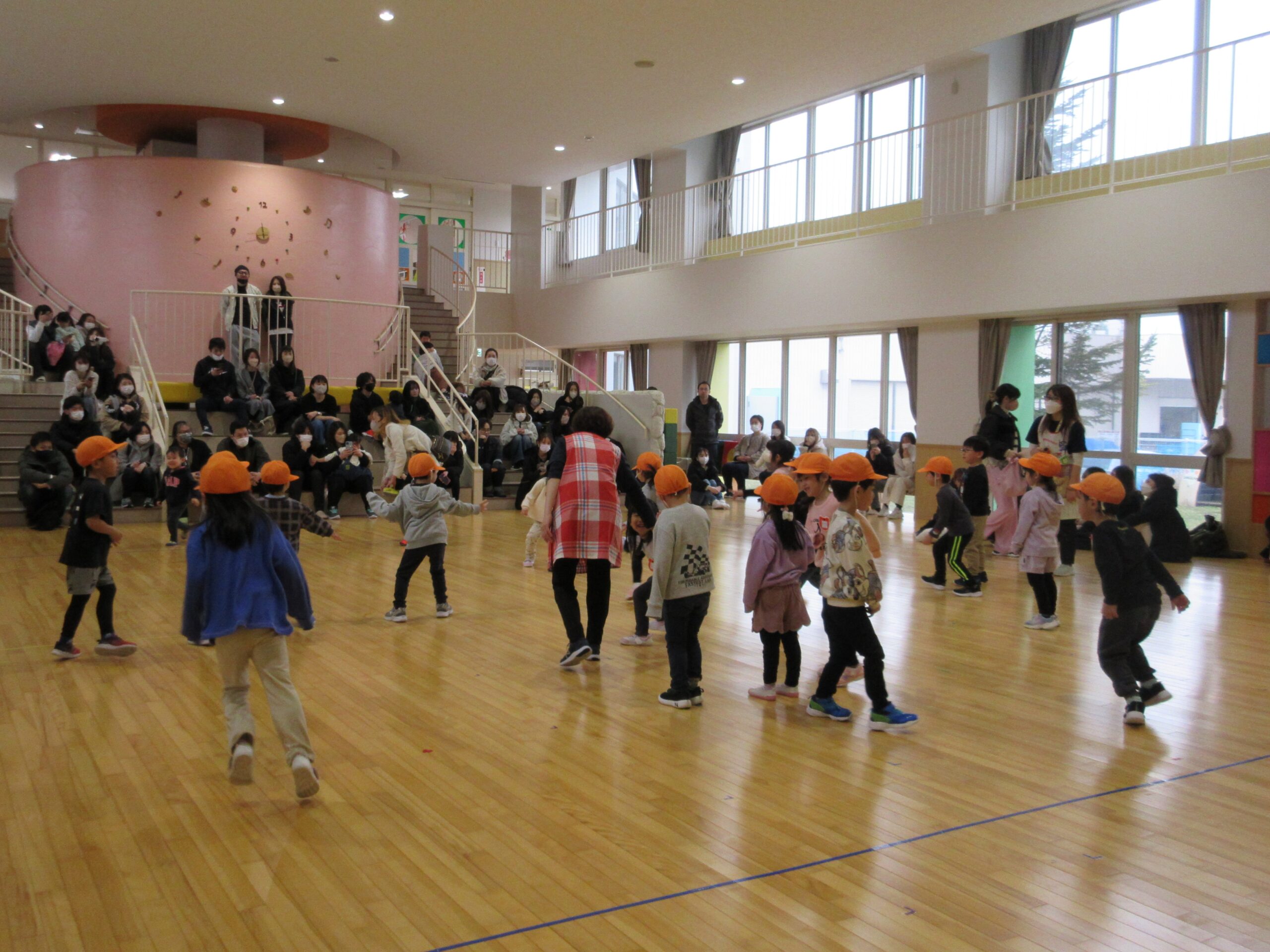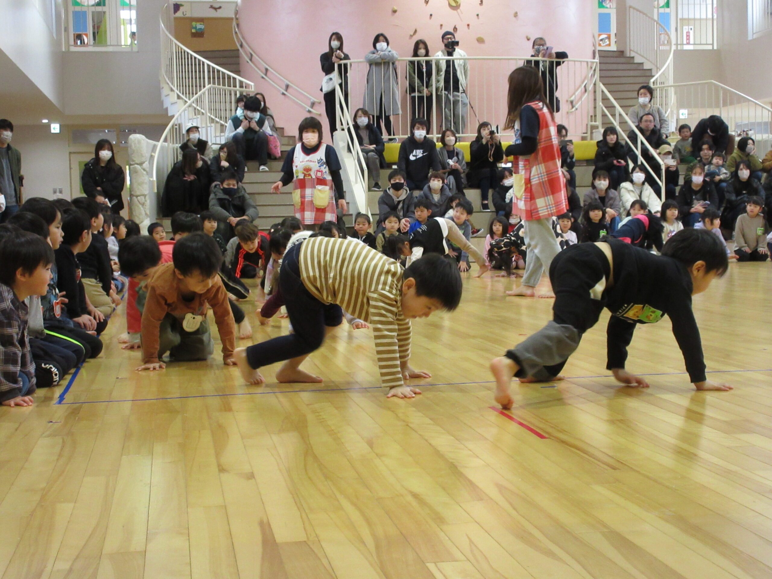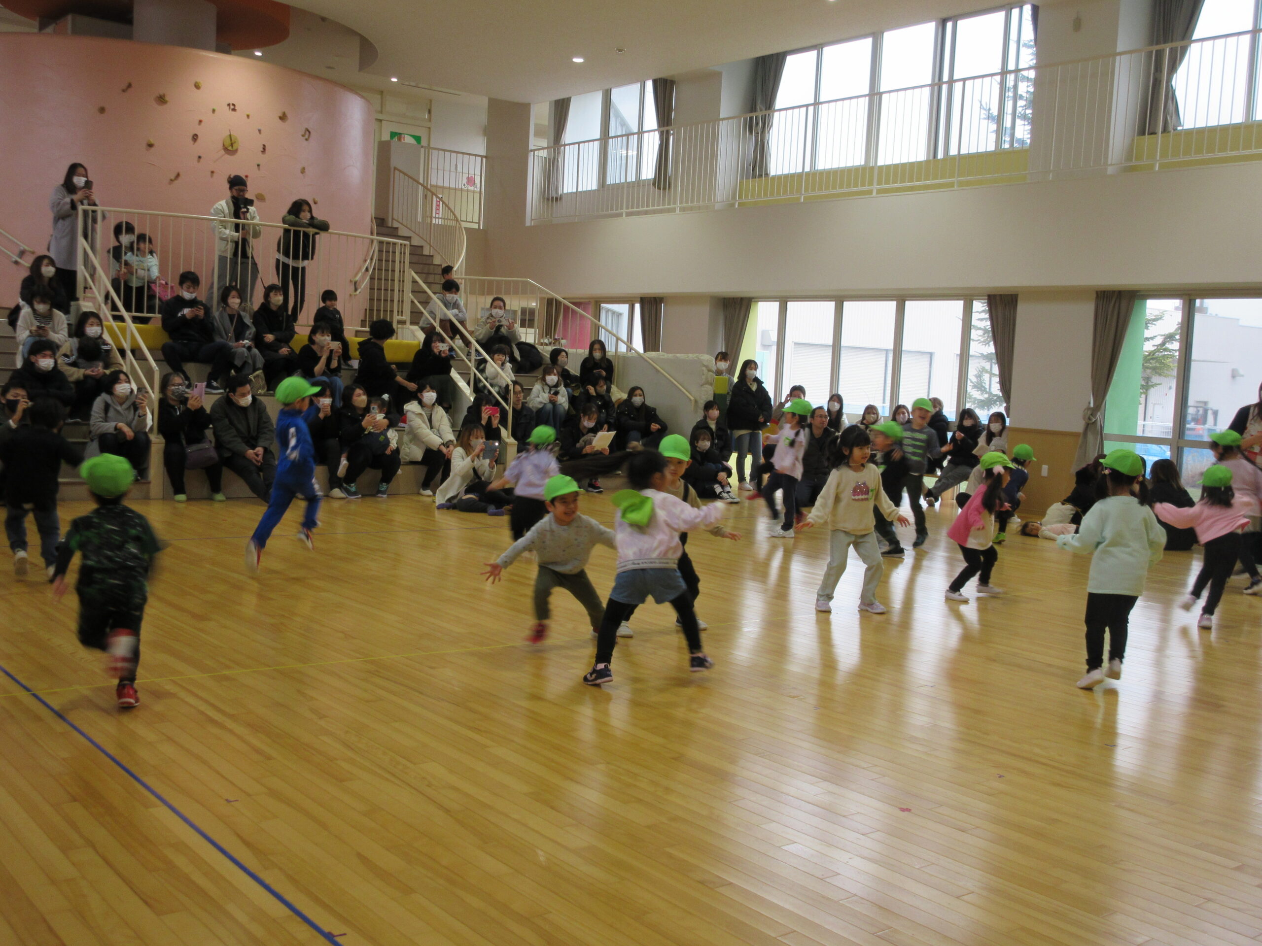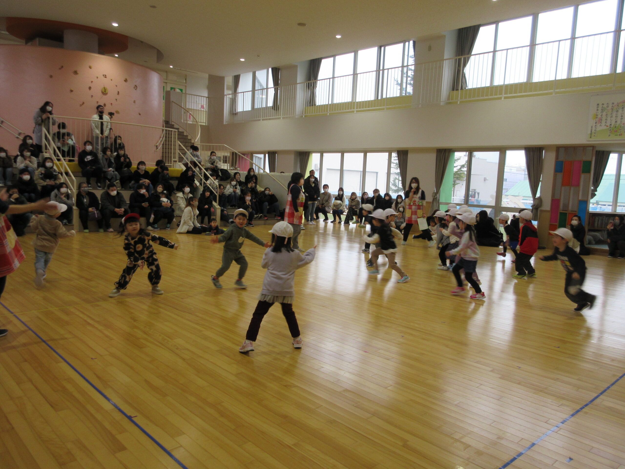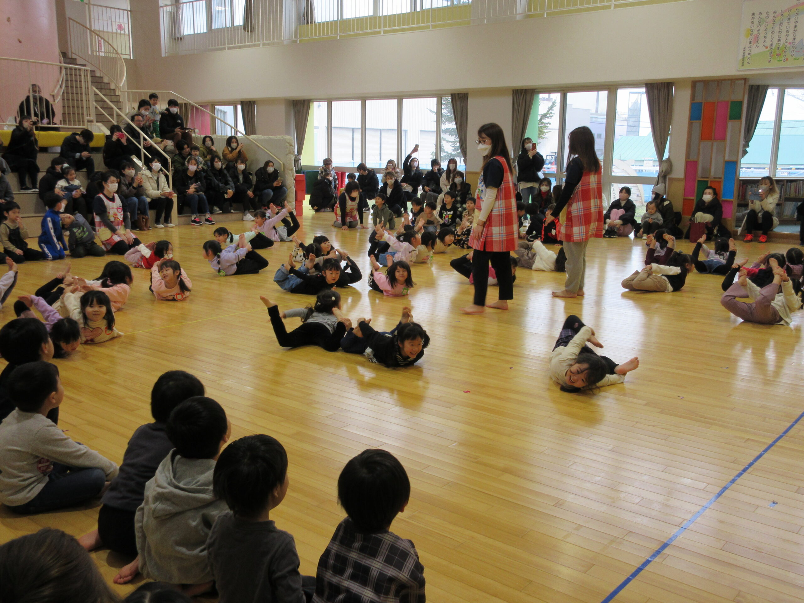 昨日に続きまして今日2月15日(木)年中学年の参観日でした。各お部屋で通常の朝の会を見て頂きホールで学年でのリズム体操を披露しました。年少から取り組んできたリズム体操はピアノの音に合わせながら子ども達の筋力を鍛え、想像力を高めて機敏な動きでスムーズに取り組むことができました。その後は親子で新聞紙ゲームや玉入れ等で楽しみました。保護者の皆様有難うございました。