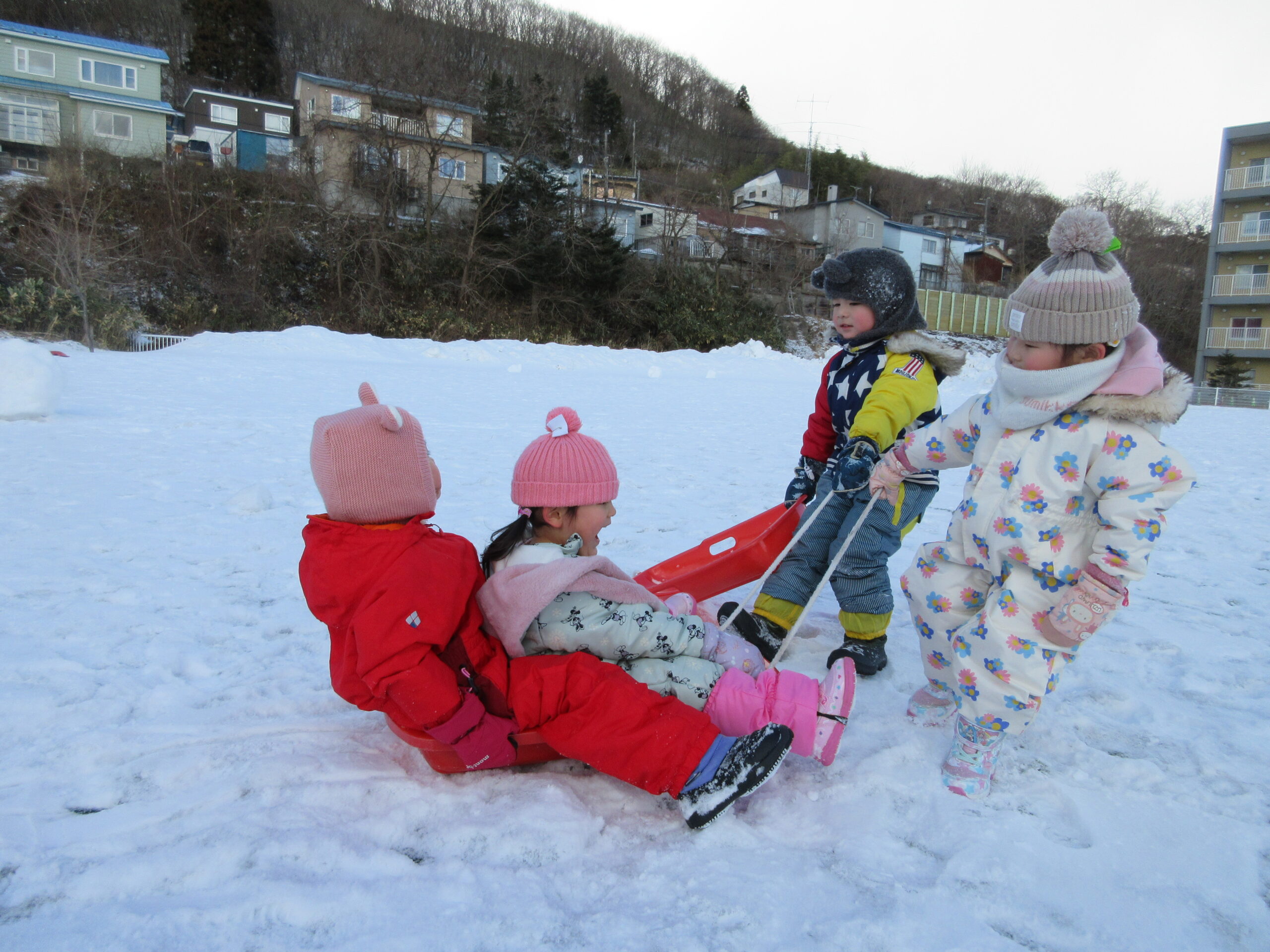 雪がたくさん降った時には寒さにも負けず雪遊びを楽しみました。そり遊びや雪合戦をする子もいますが、意外にも遊具で遊ぶ姿が多く見られました。来週のウィンタースポーツデーも楽しみですね♪