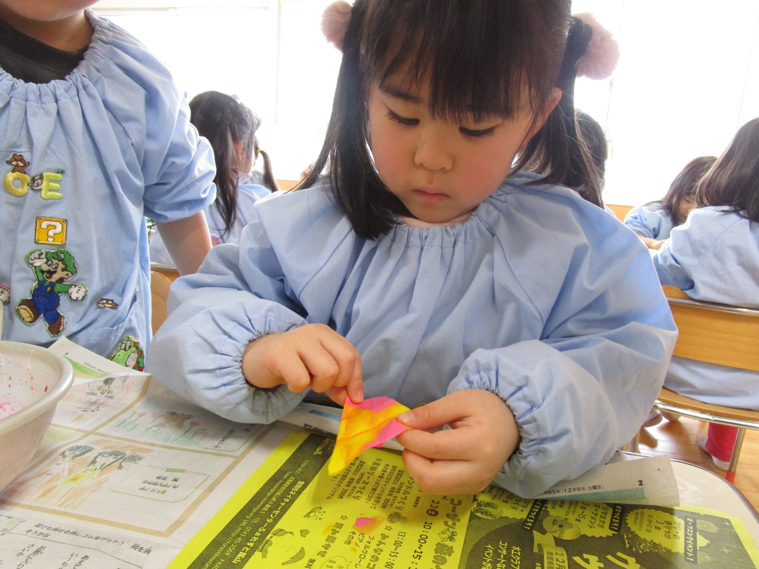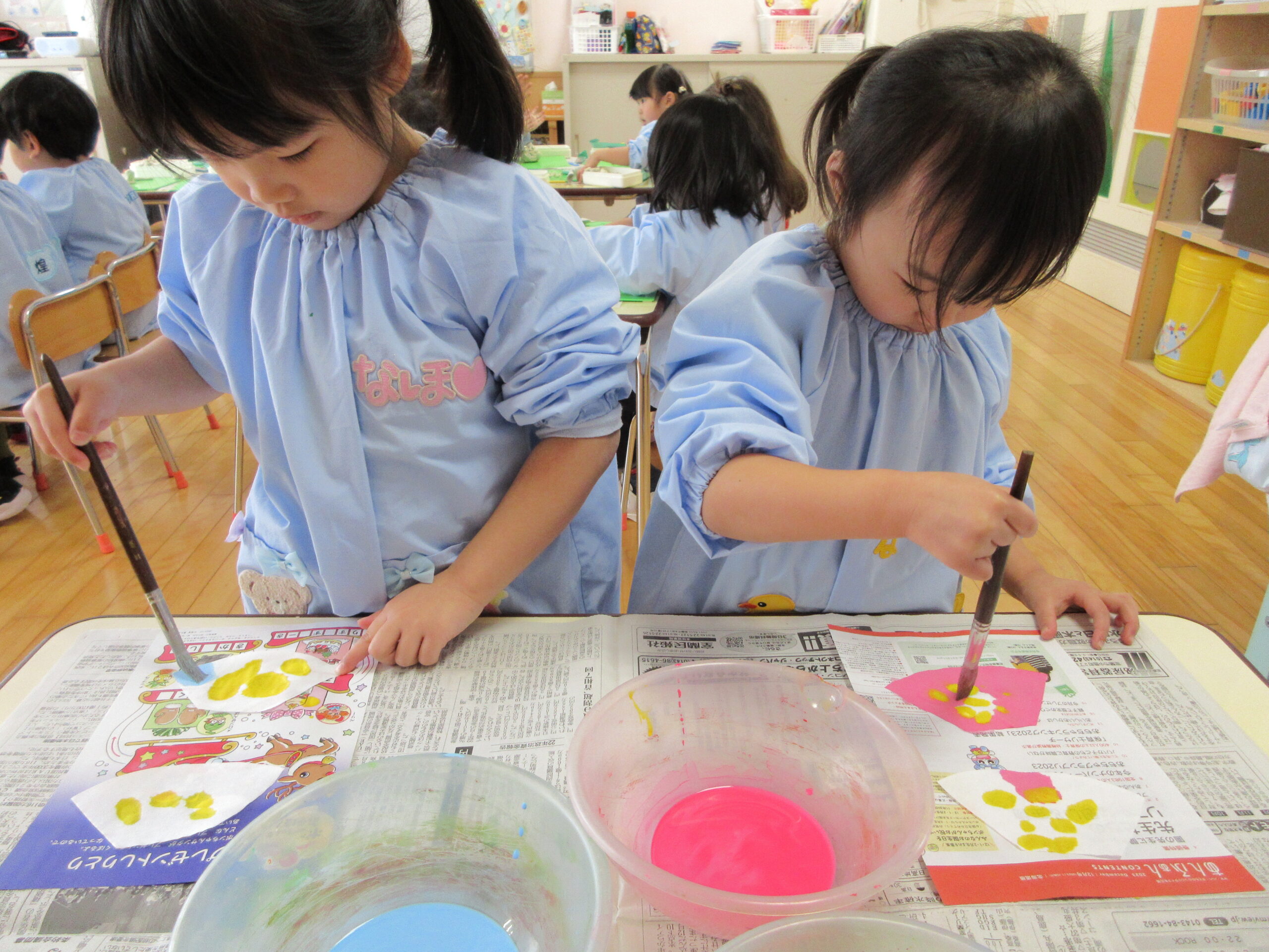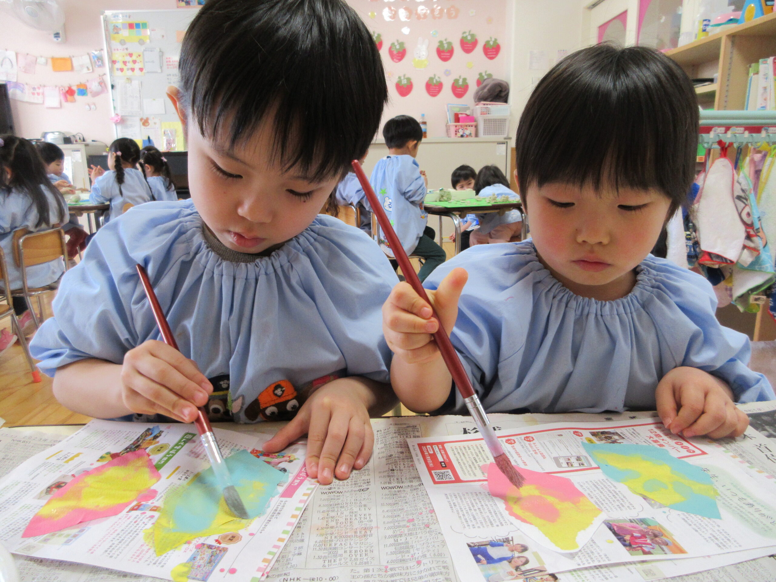 ひなまつり製作でも絵の具をコーヒーフィルターににじませて、色の広がりを楽しんでいました。