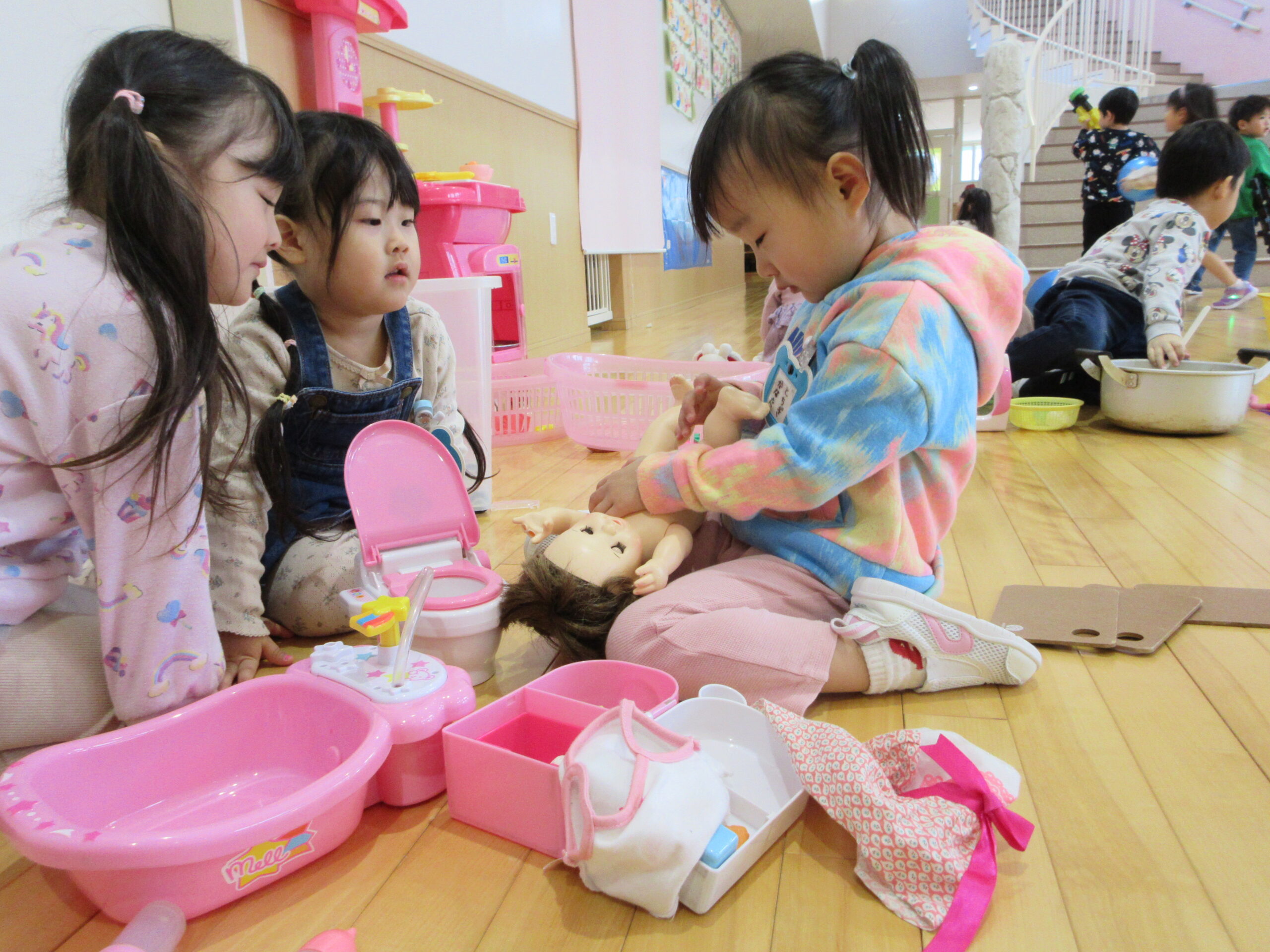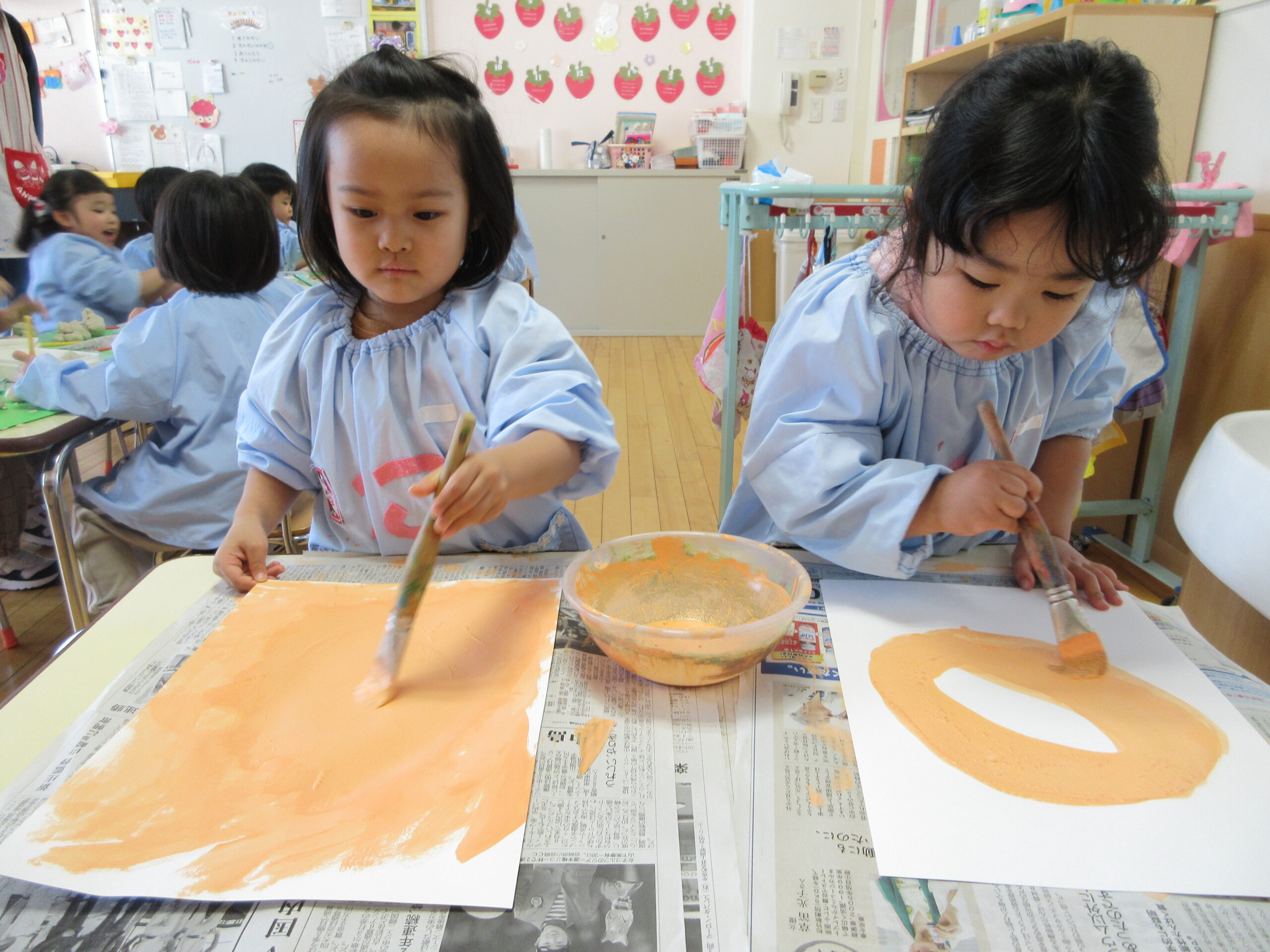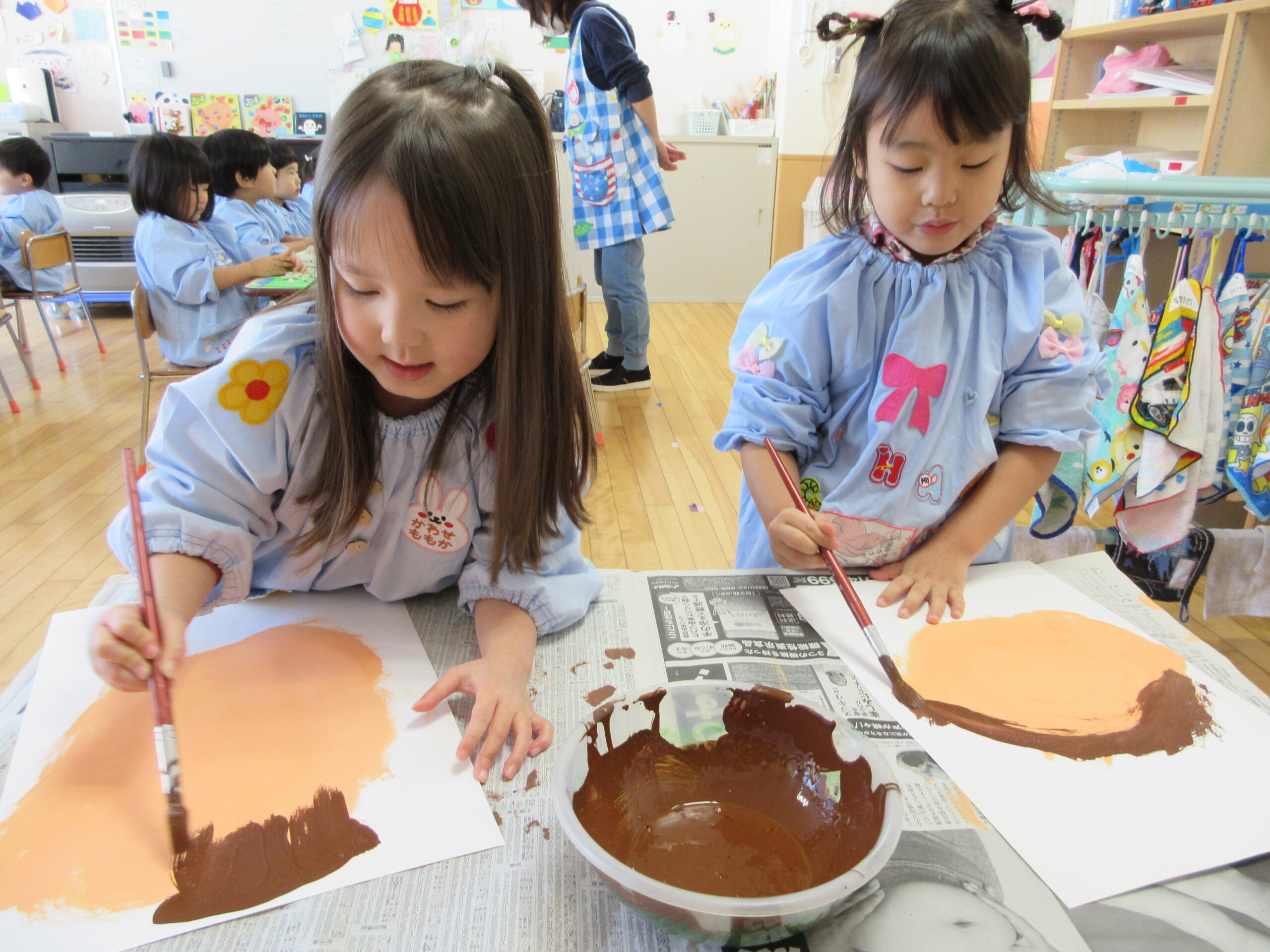 ひなまつり製作でも絵の具をコーヒーフィルターににじませて、色の広がりを楽しんでいました。
