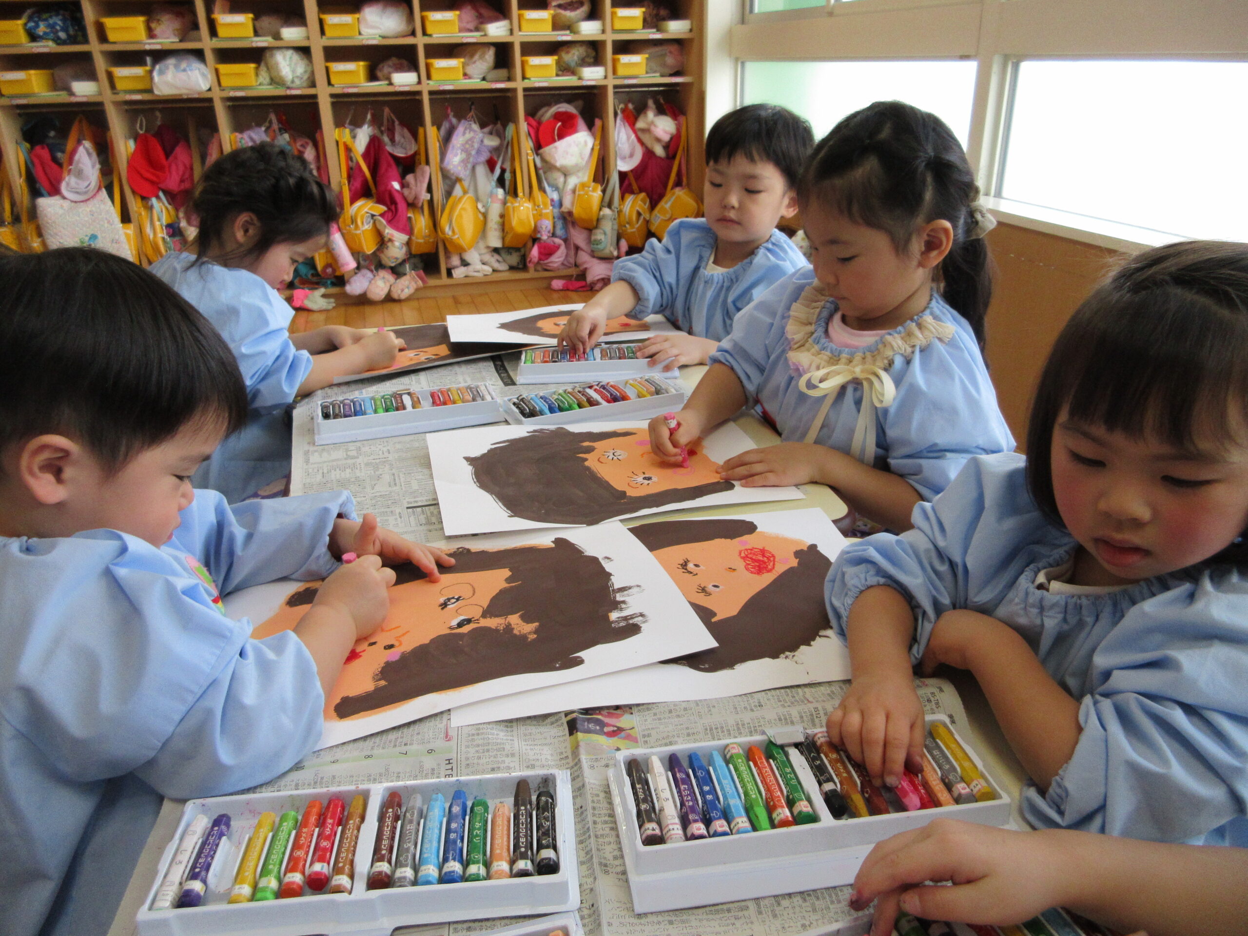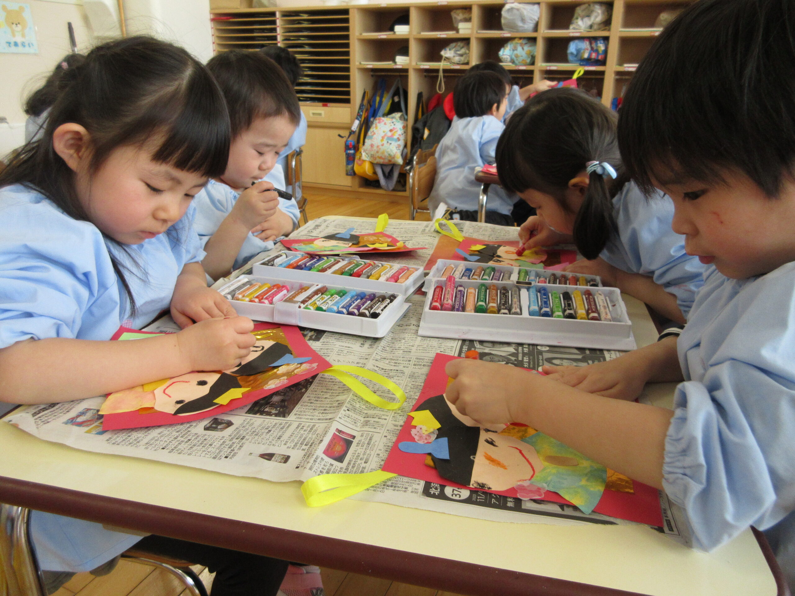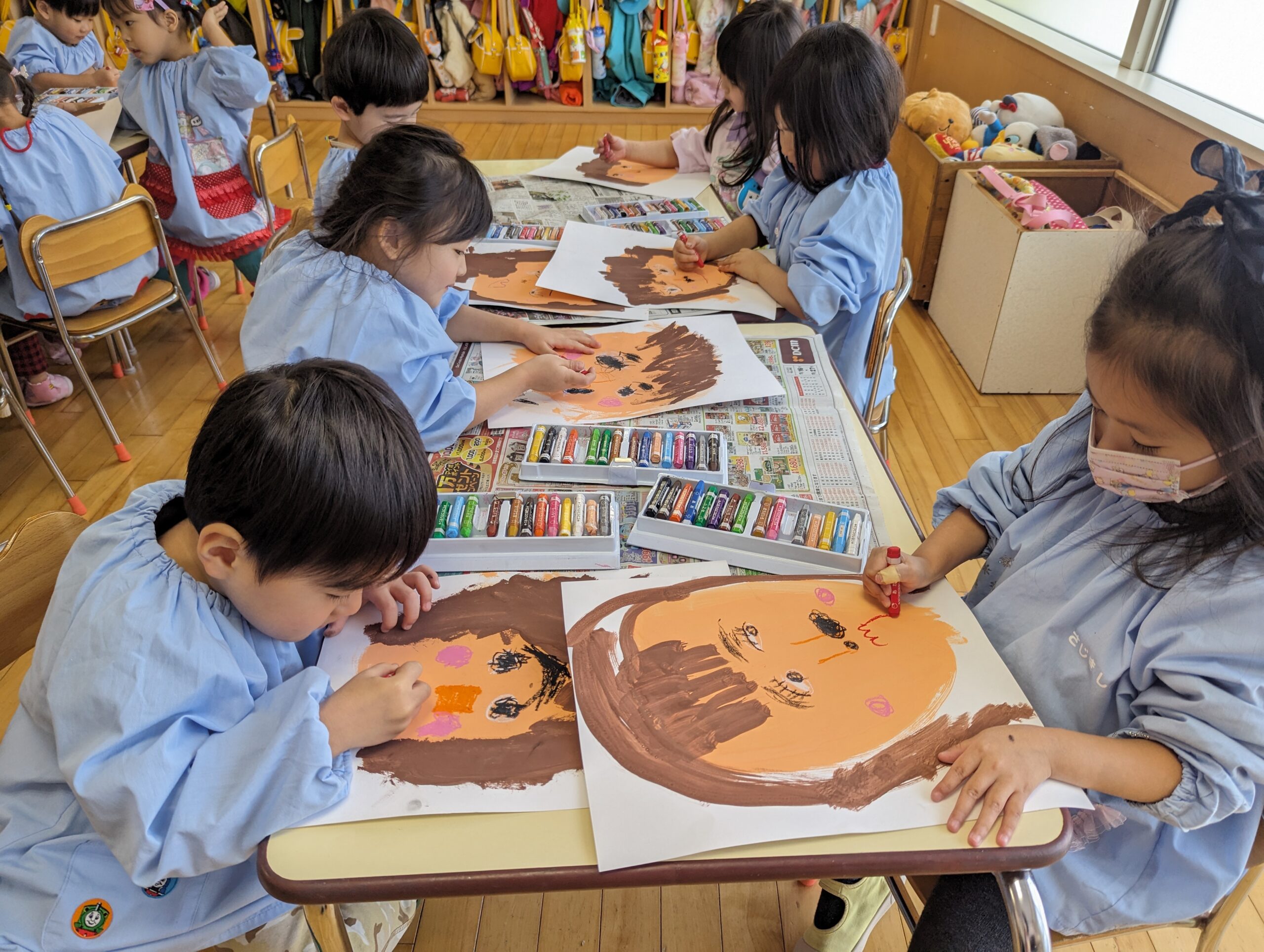 「先生の顔」は顔と髪の毛に絵の具を使い、顔のパーツはクレヨンを使ってちょっとリアルに描いてみました。「まゆげもちょっと茶色い」と先生の顔を観察しながら、個性溢れるいろんなお顔が仕上がりました♪